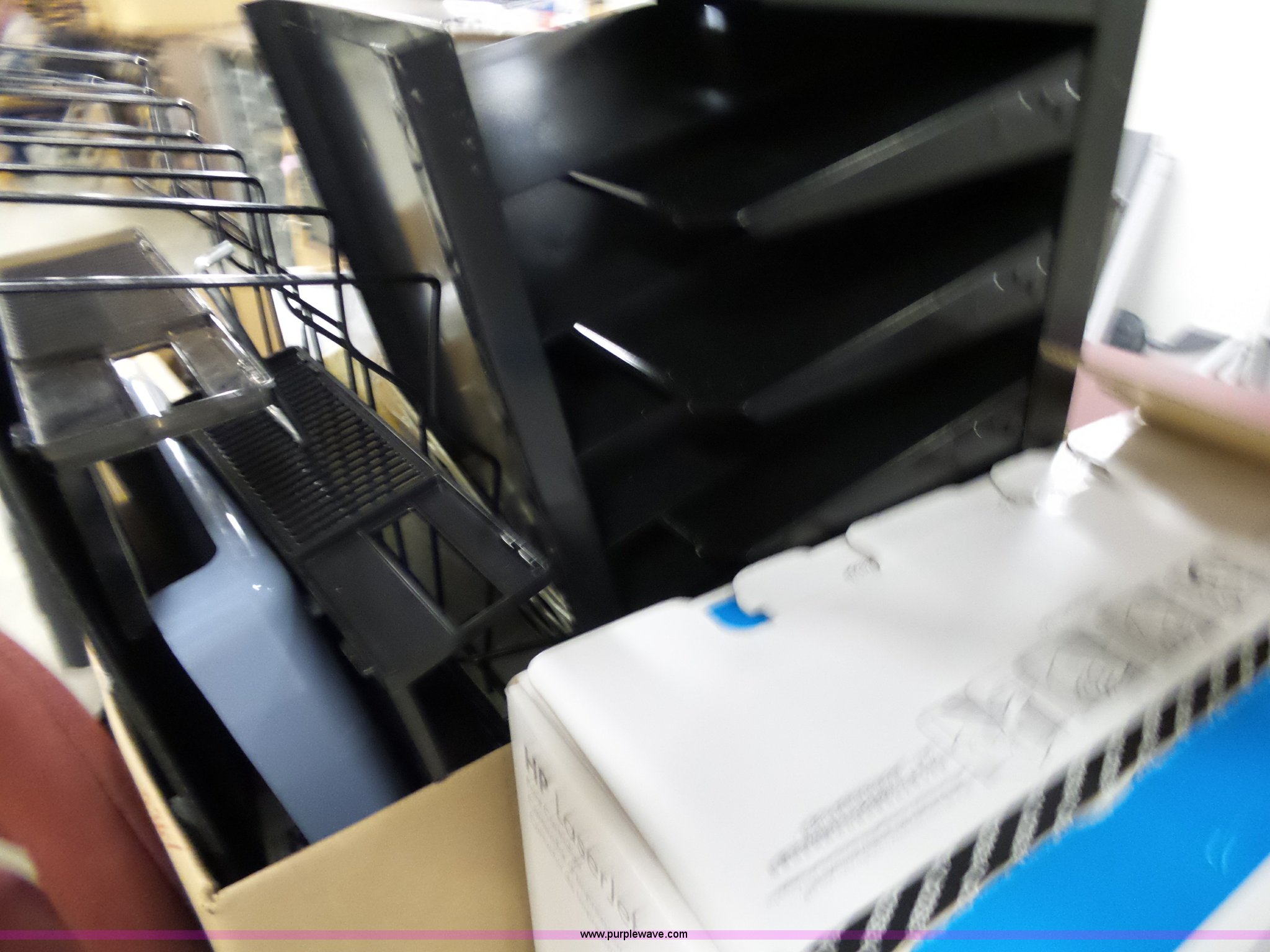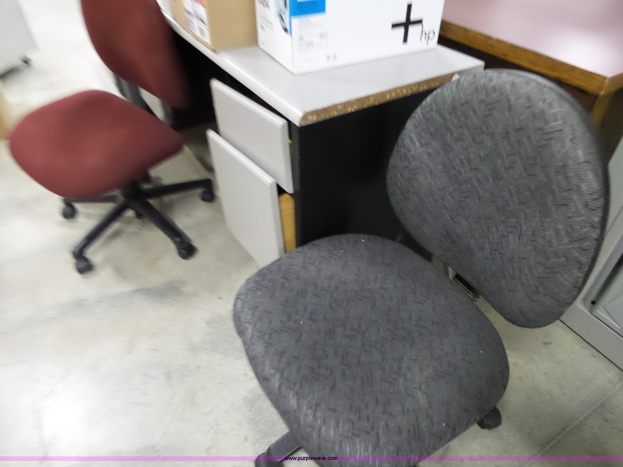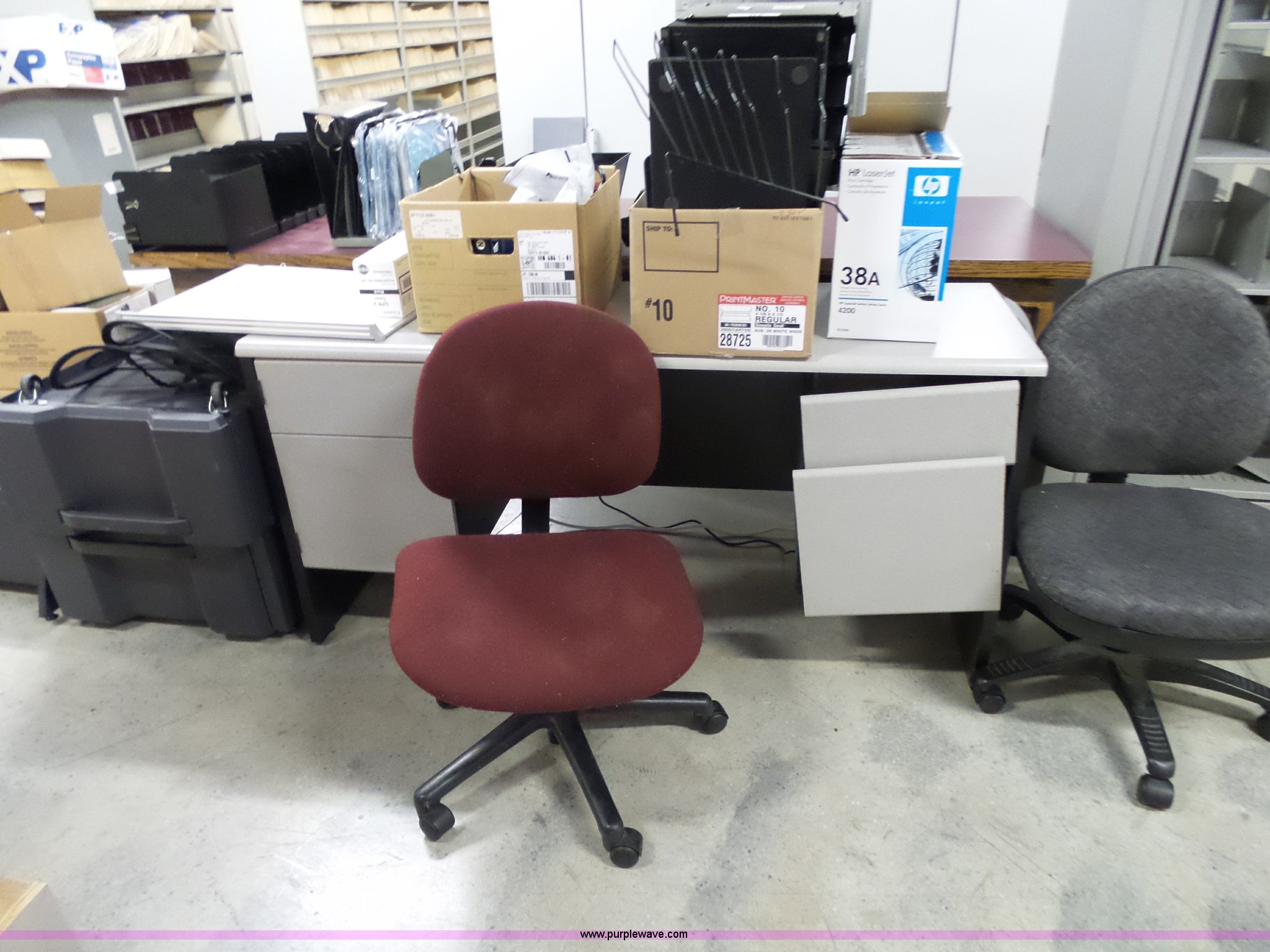 Purple Wave is selling a used Furniture in Missouri. This item is a Office furniture with the following: (2) desks, (2) chairs, (3) stands, Assorted hole punchers, Assorted file holders, Assorted ink cartridges