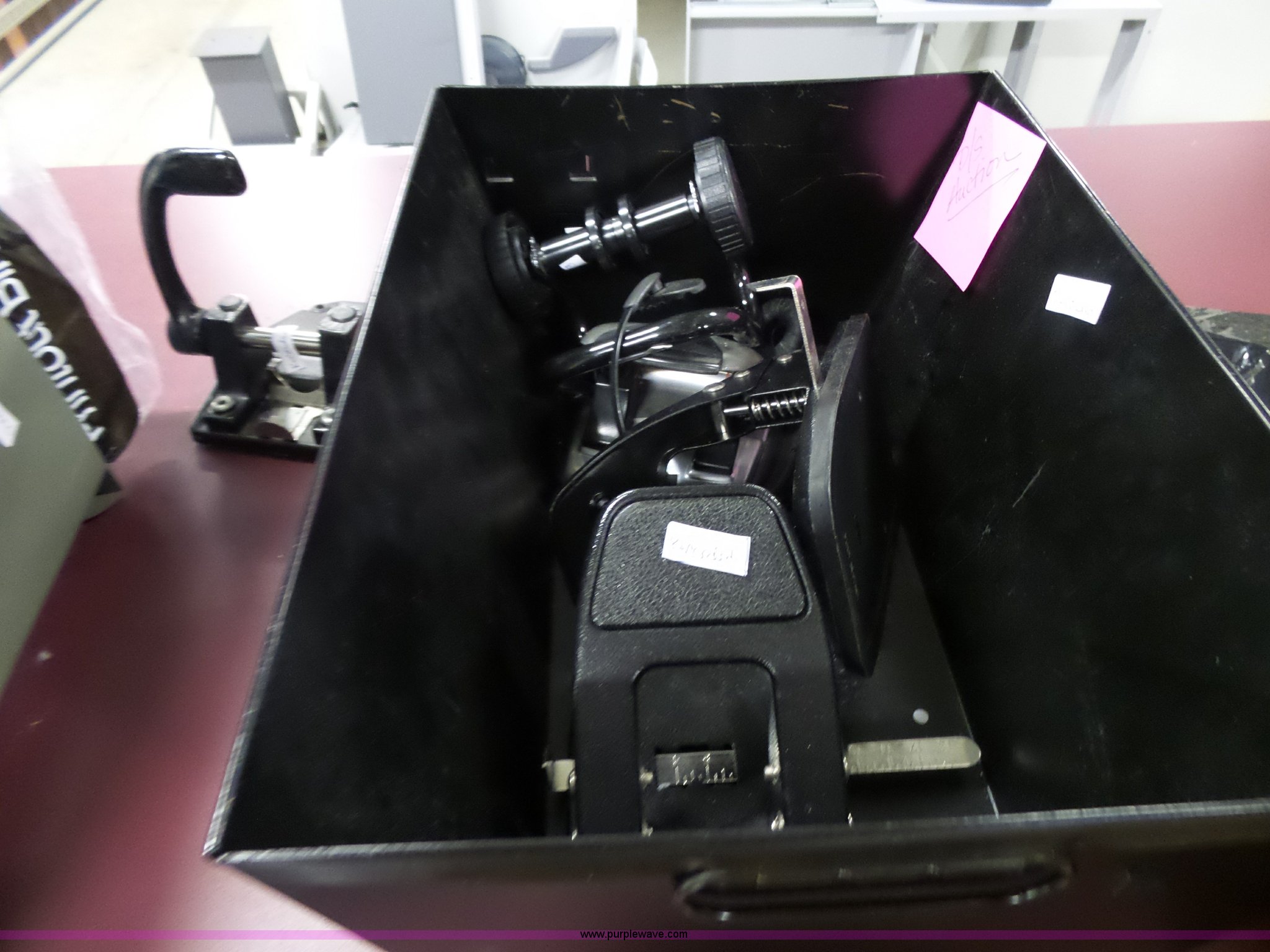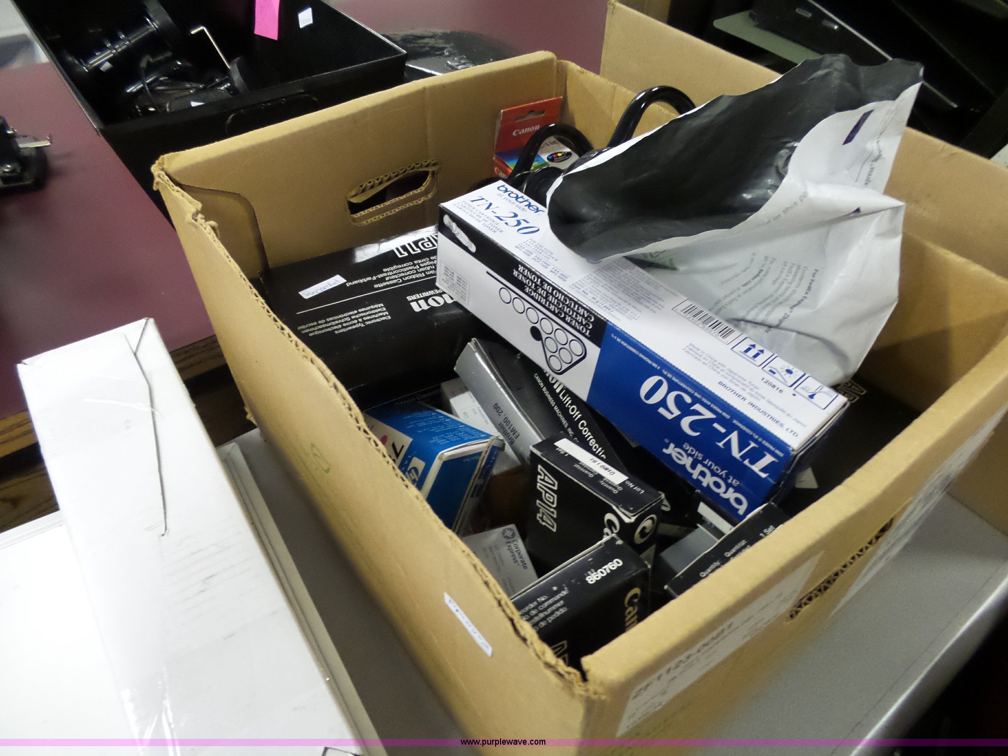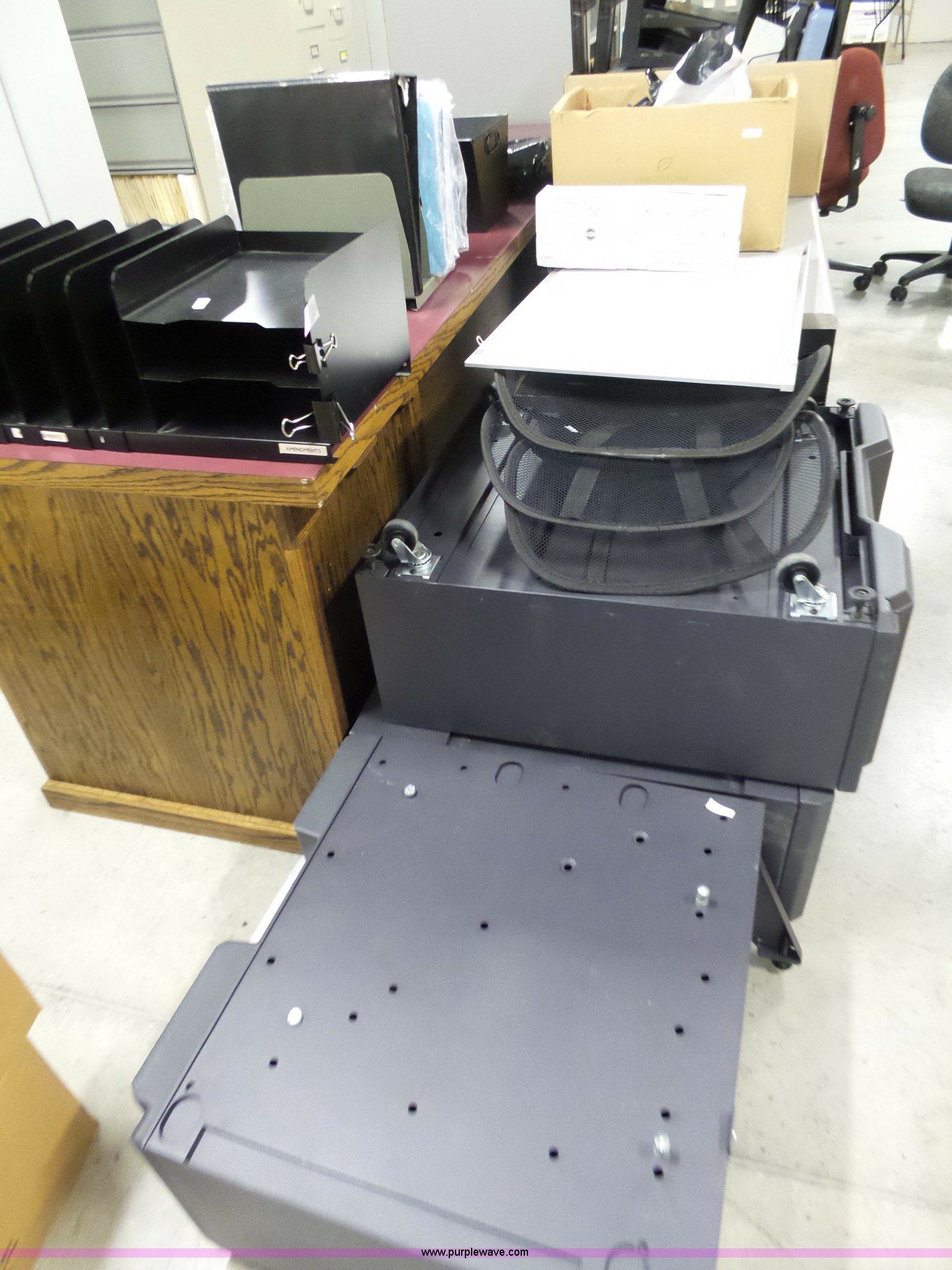 Purple Wave is selling a used Furniture in Missouri. This item is a Office furniture with the following: (2) desks, (2) chairs, (3) stands, Assorted hole punchers, Assorted file holders, Assorted ink cartridges