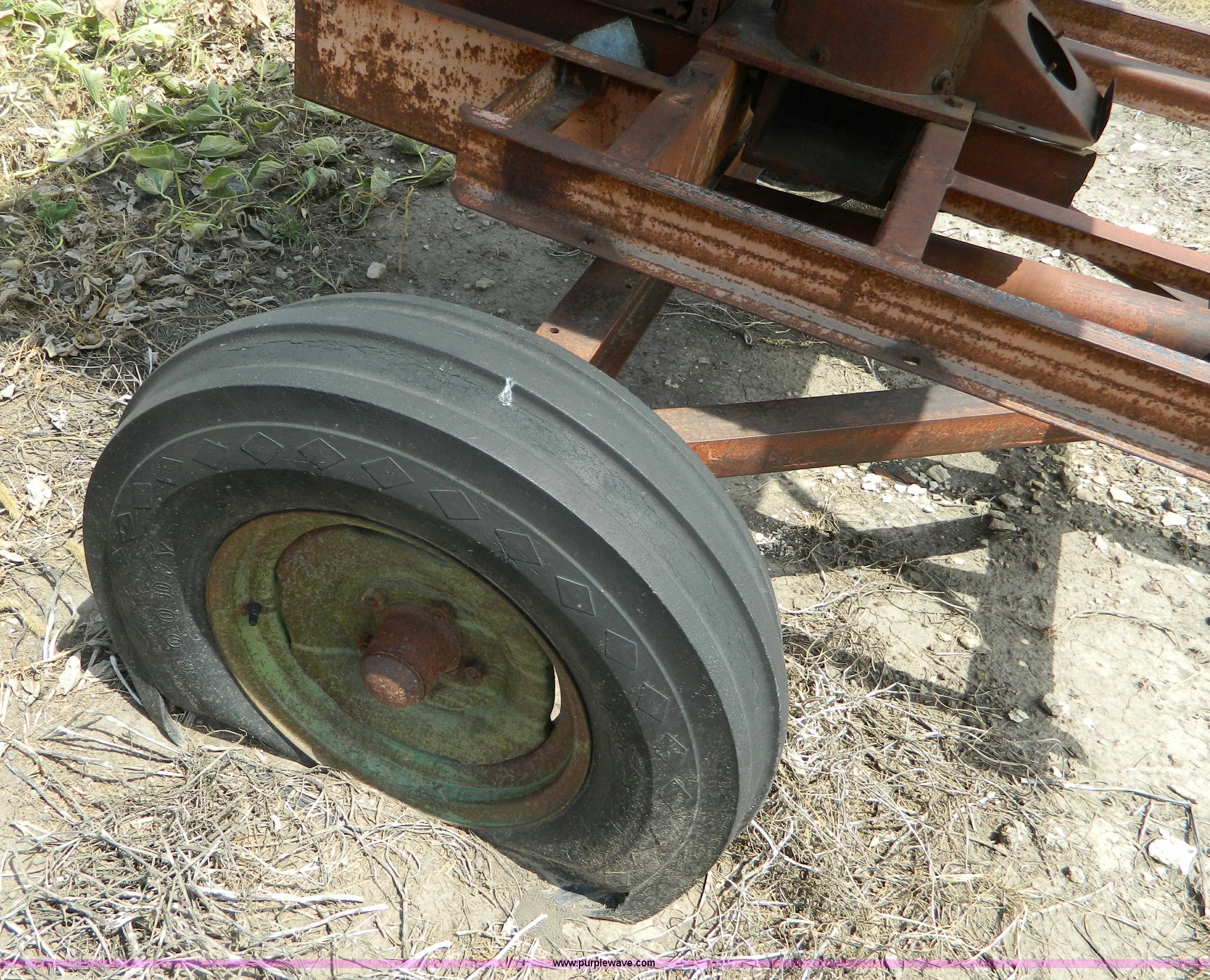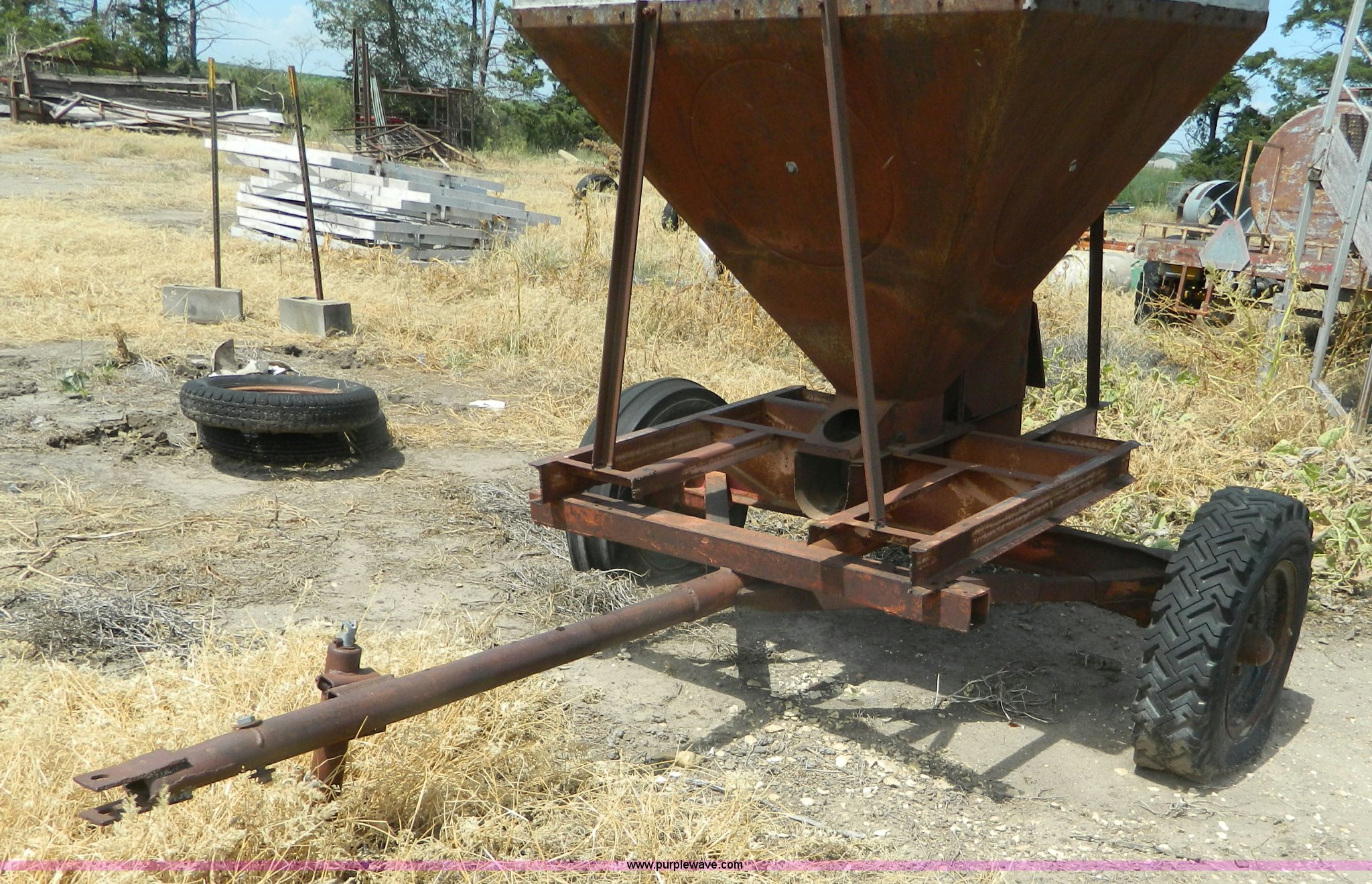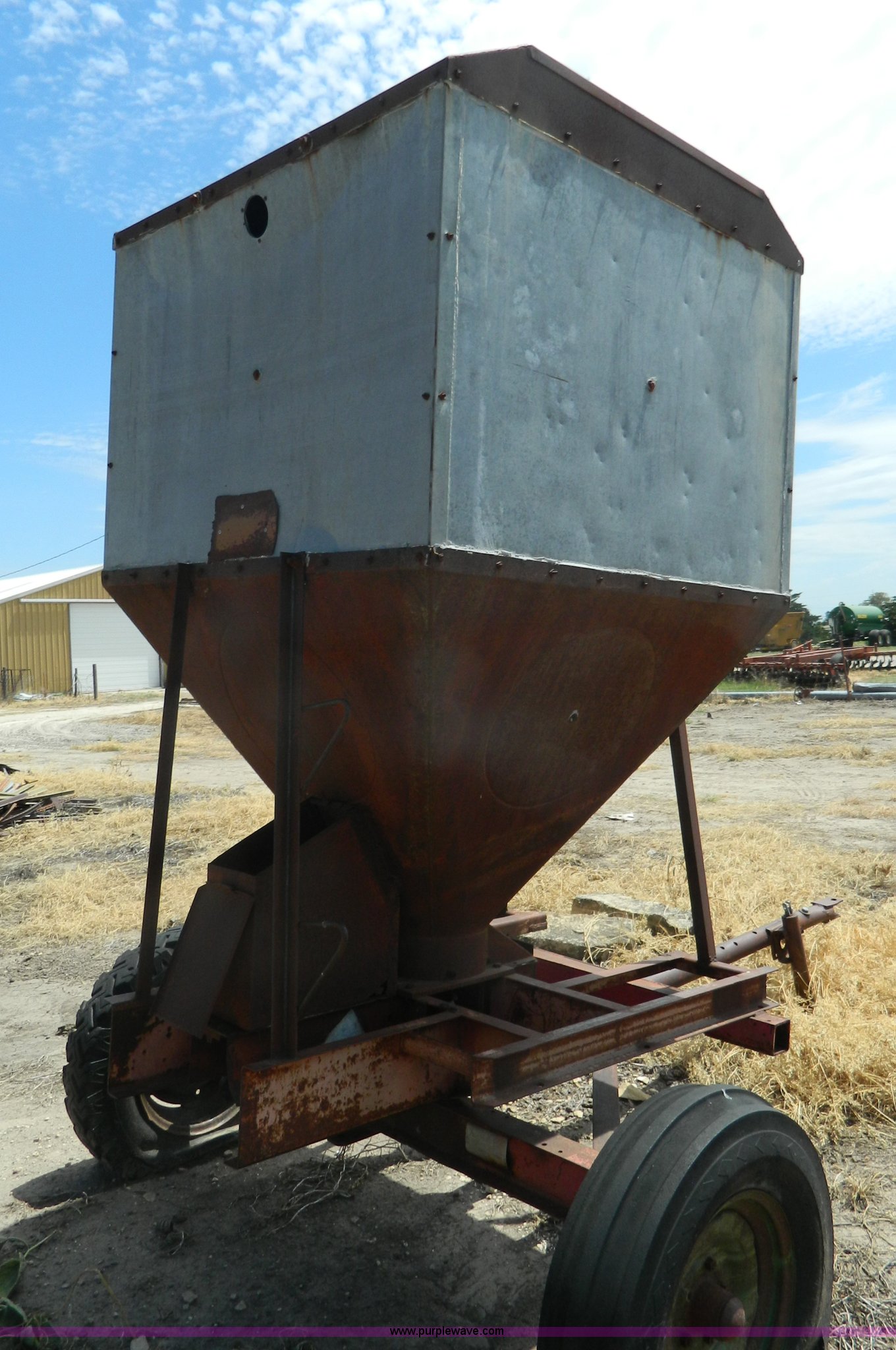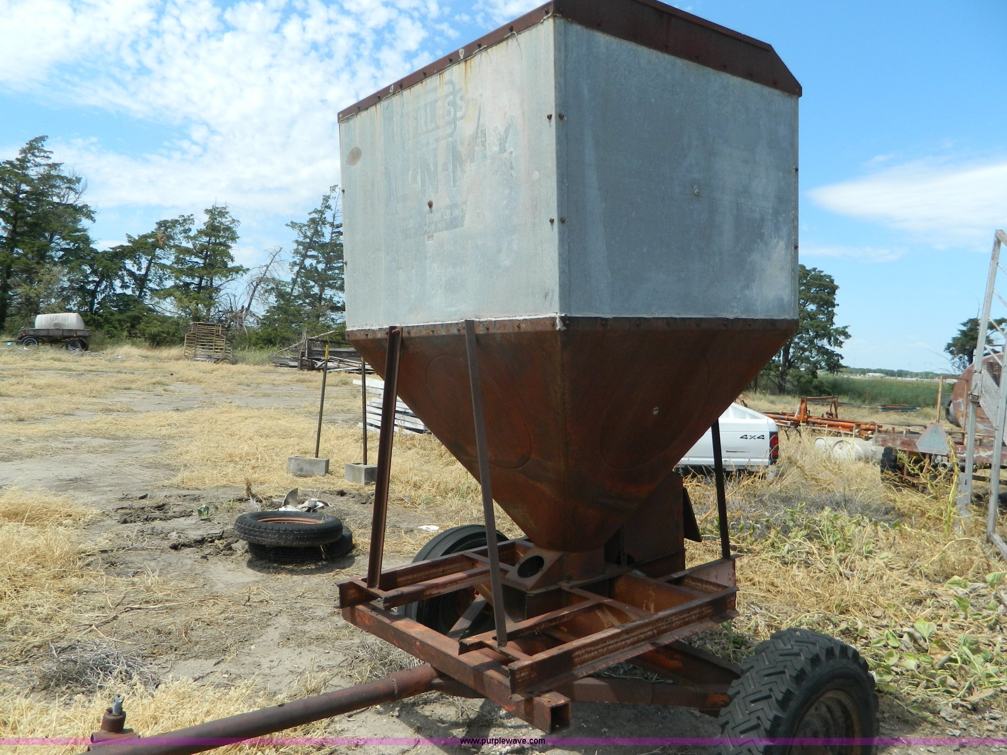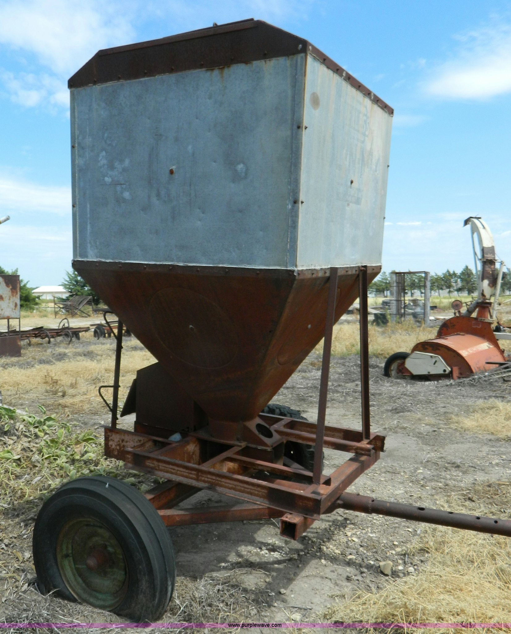 Purple Wave is selling a used Grain Cart or Gravity Wagon in Kansas. This item is a Grain tank with the following: 100 bushel, Pin hitch, Tires bad