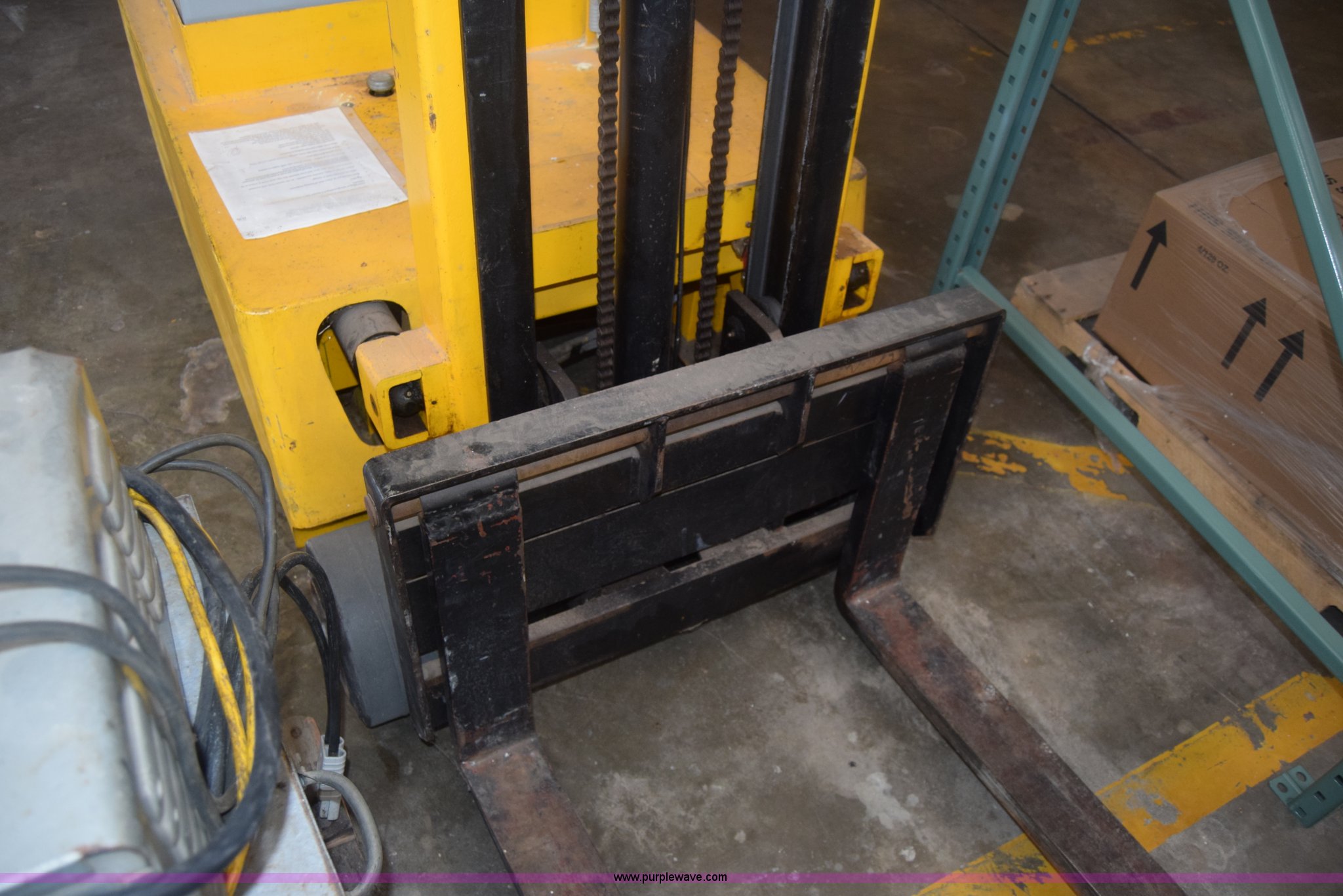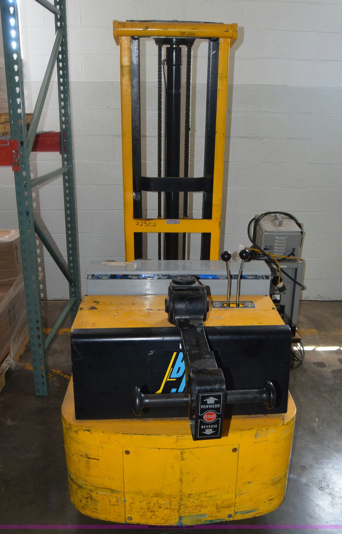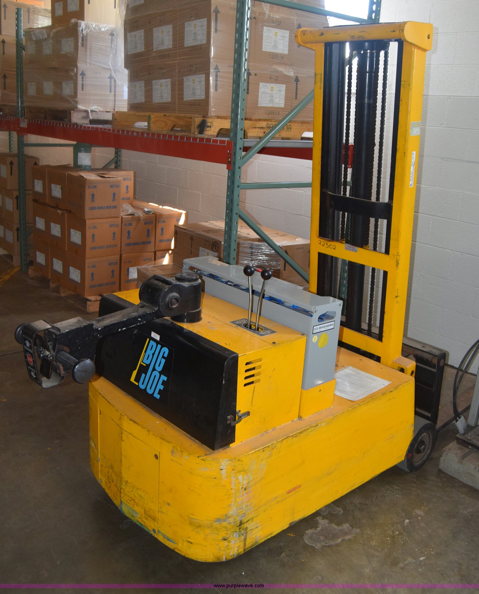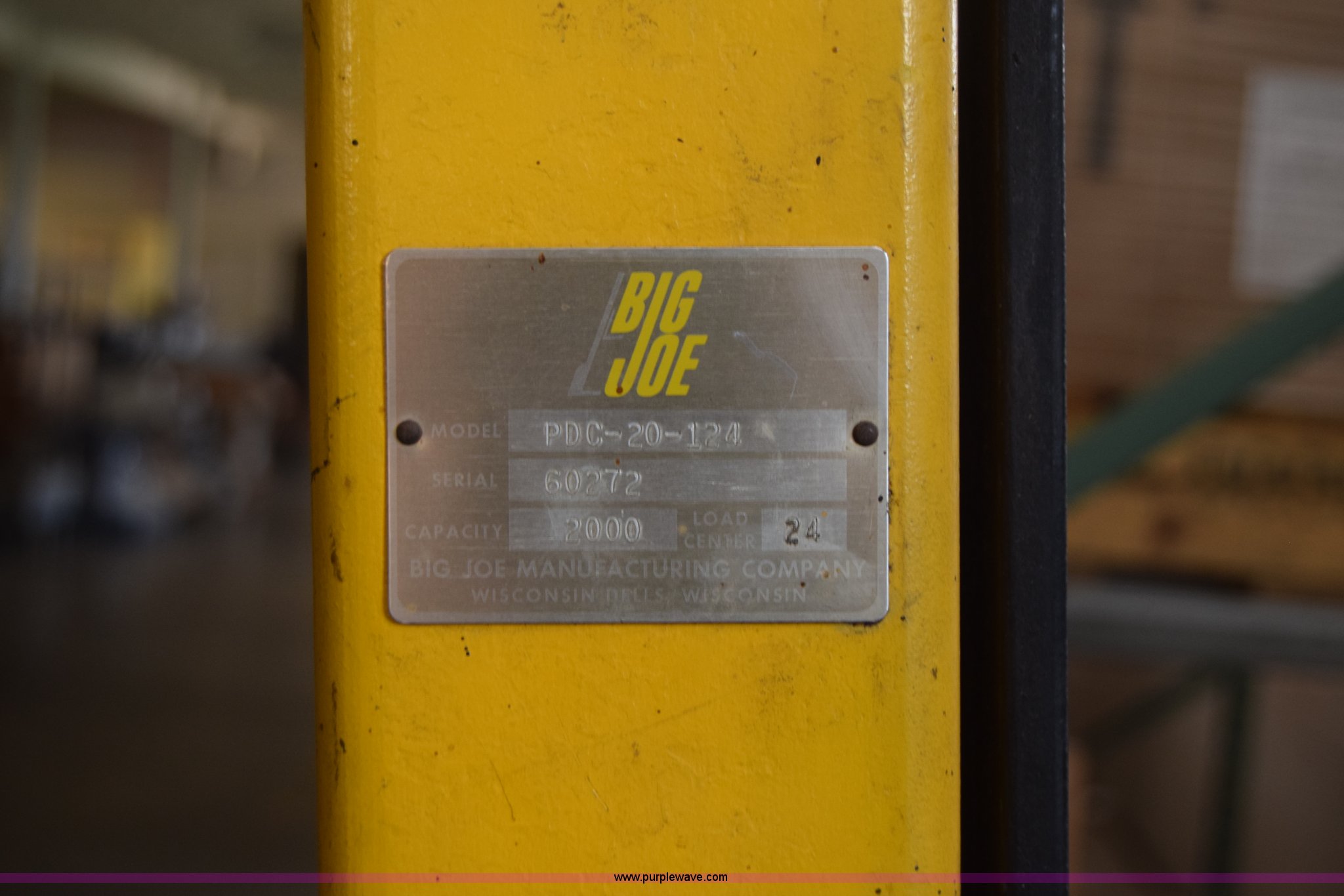 Purple Wave is selling a used Warehouse Forklift in Kansas. This item is a Big Joe forklift with the following: Model PDC-20-124, Electric motor, 2,000 lbs capacity, 36" forks, Charger, Batteries need replaced, Serial 60272