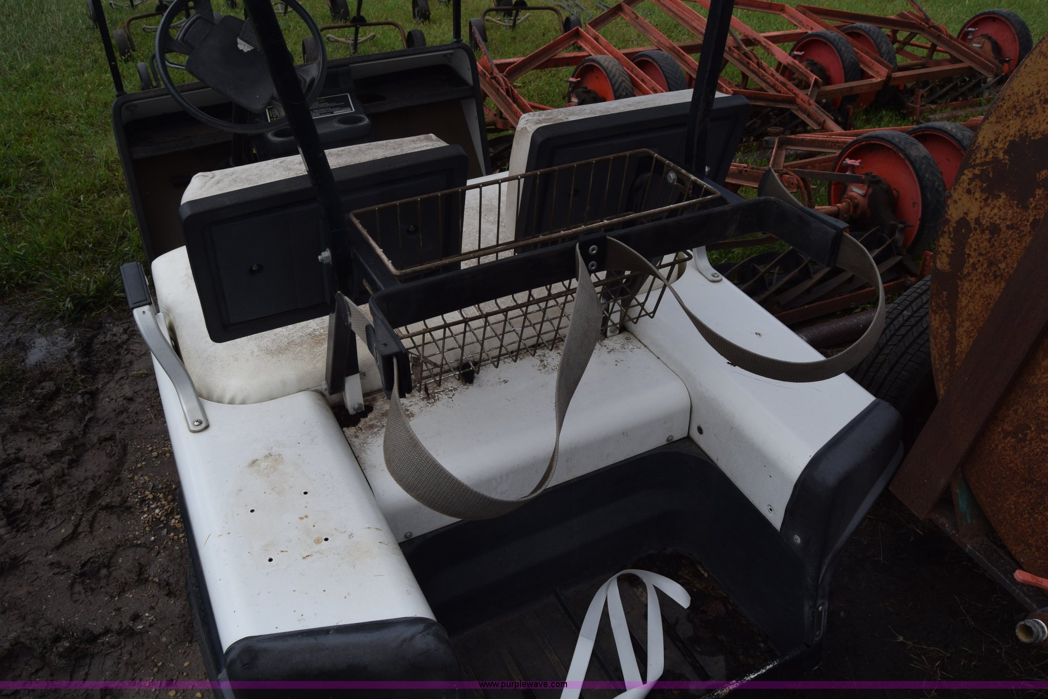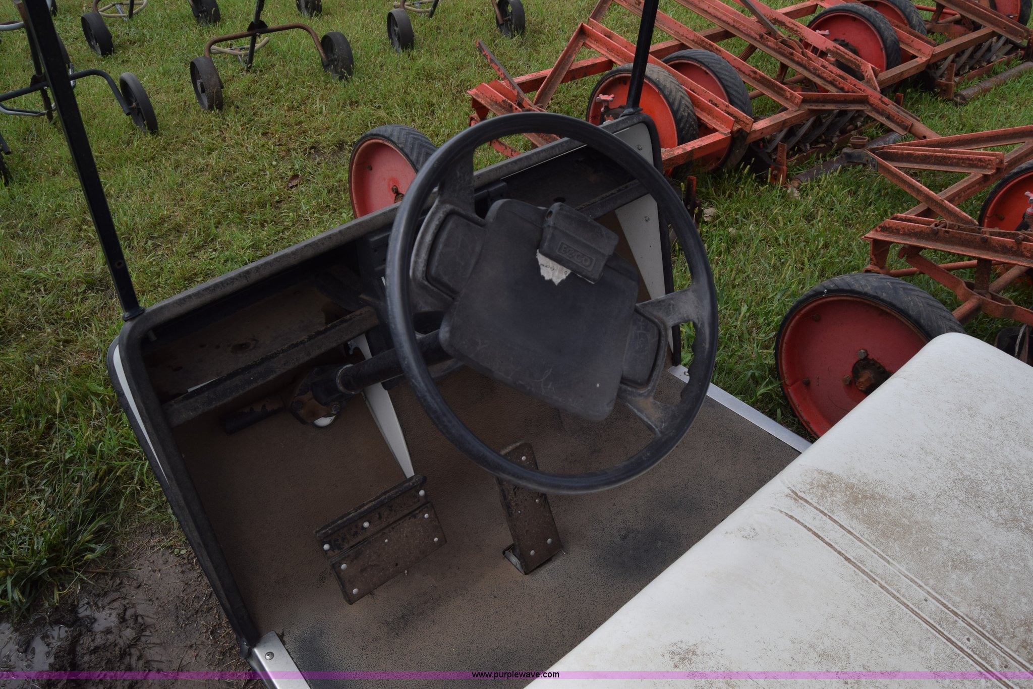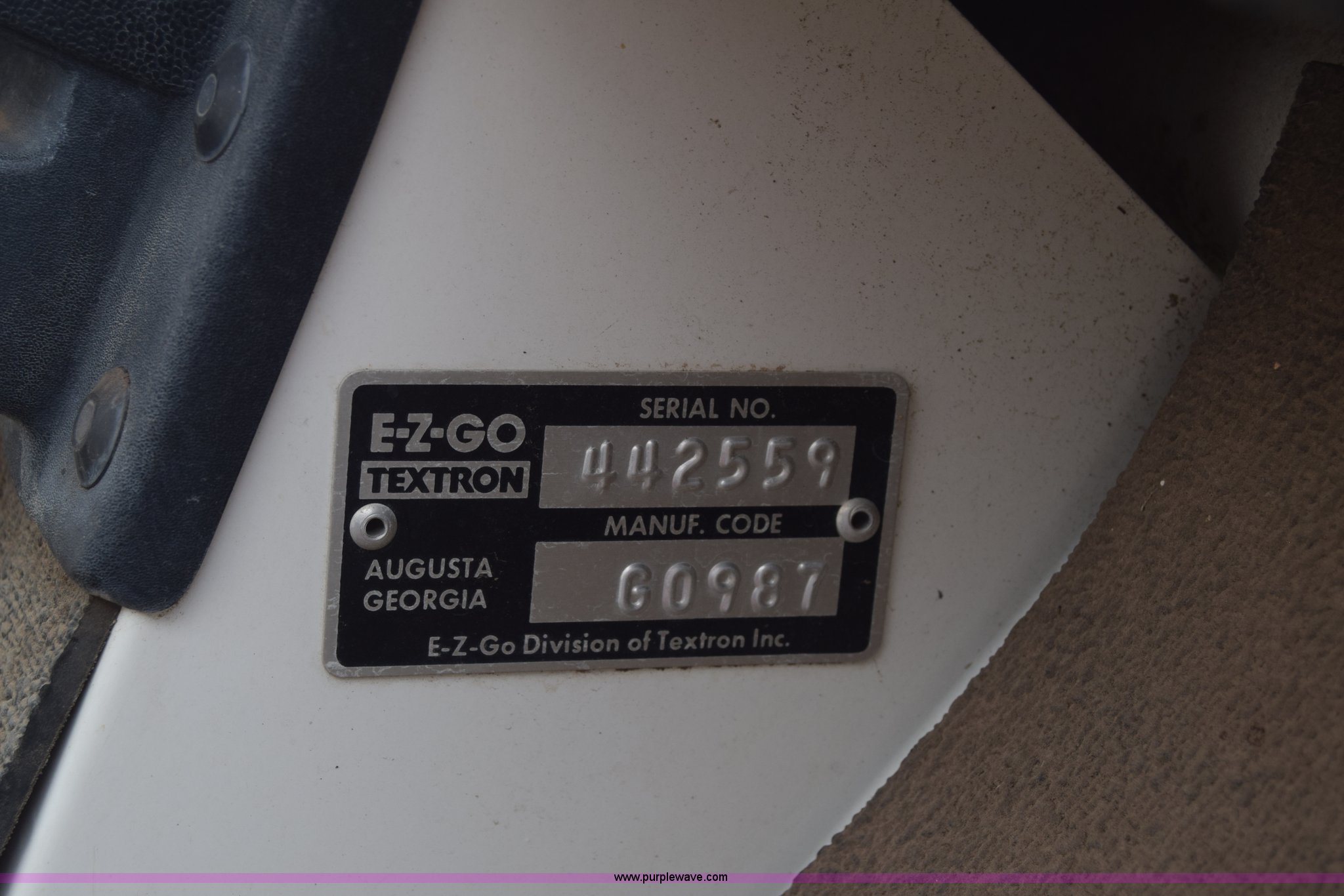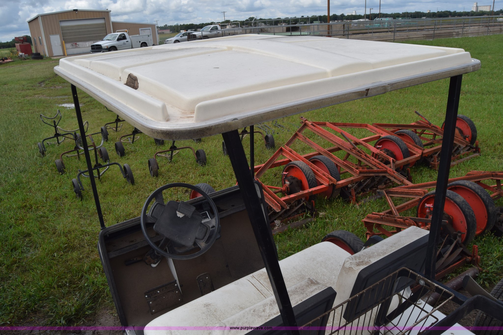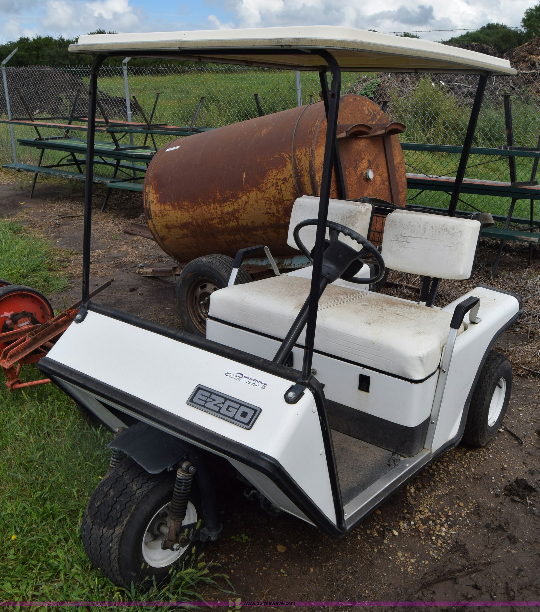 Purple Wave is selling a used Sporting Goods in Kansas. This item is a Ez-go golf cart with the following: Electric operation, Canopy, Bag holders, 18x8.50-8 tires, Dead batteries, Unknown operating condition, Serial 442559