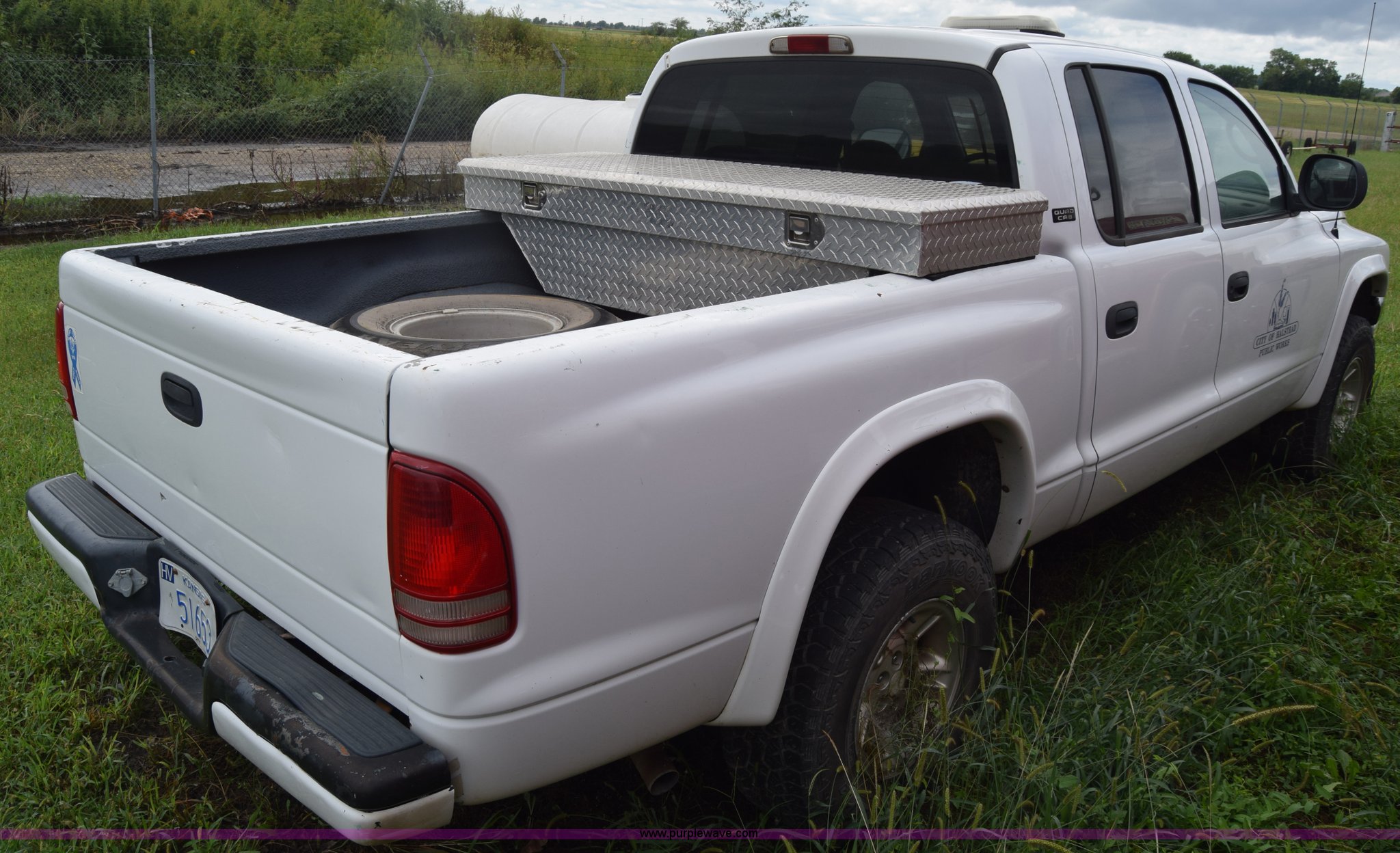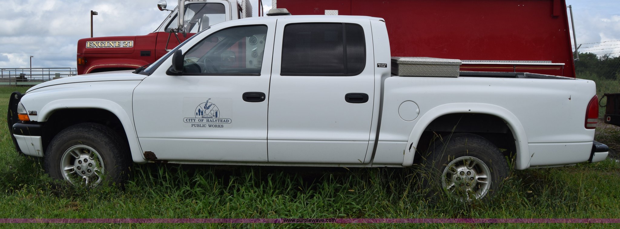 2000 Dodge Dakota Quad Cab pickup truck. 158,647 miles on odometer, 5.9L V8 OHV gas engine, Automatic transmission, Four wheel drive, AC and heat, Tilt, Cruise, AM/FM/cassette, Power windows, locks, and mirrors, Cloth interior, Fog lights, Beacon light, Toolbox, Receiver hitch, Trailer wiring, 31x10.50R15 tires, Dead battery, Rust. Kansas title. Title distribution may be delayed up to 14 days from verification of funds. 1B7HG2AZ2YS724179. City of Halstead. 1400 S Hartzler. Halstead, KS 67056