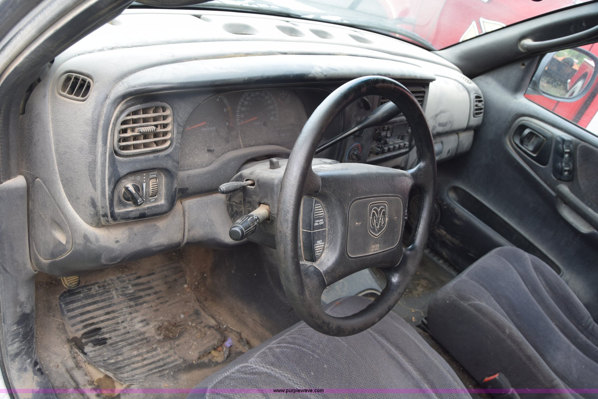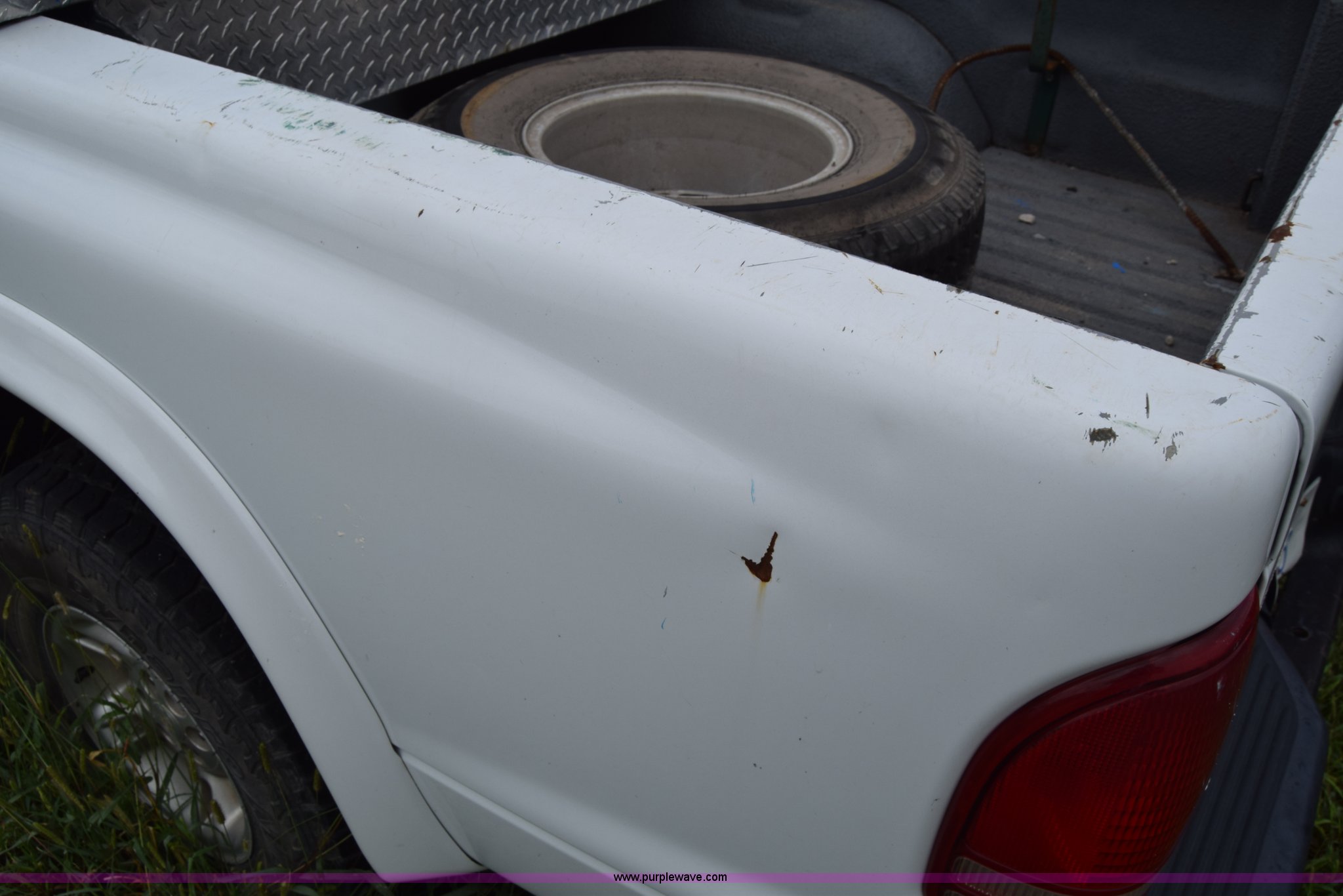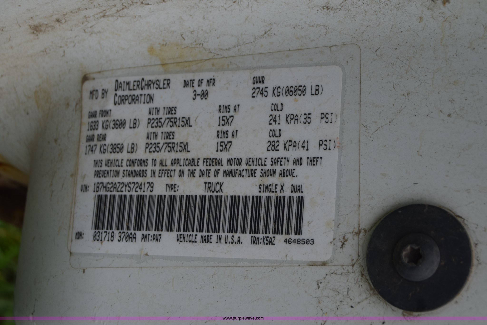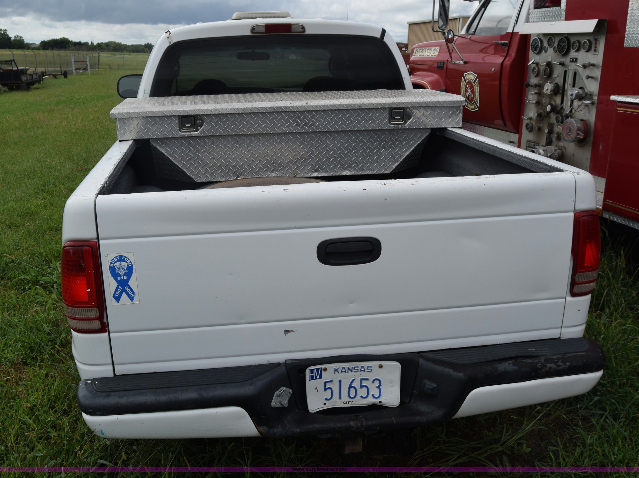 Purple Wave is selling a used Compact Pickup or Van in Kansas. This item is a 2000 Dodge Dakota Quad Cab pickup truck with the following: 158,647 miles on odometer, 5.9L V8 OHV gas engine, Automatic transmission, Four wheel drive, AC and heat, Tilt, Cruise, AM/FM/cassette, Power windows, locks, and mirrors, Cloth interior, Fog lights, Beacon light, Toolbox, Receiver hitch, Trailer wiring, 31x10.50R15 tires, Dead battery, Rust