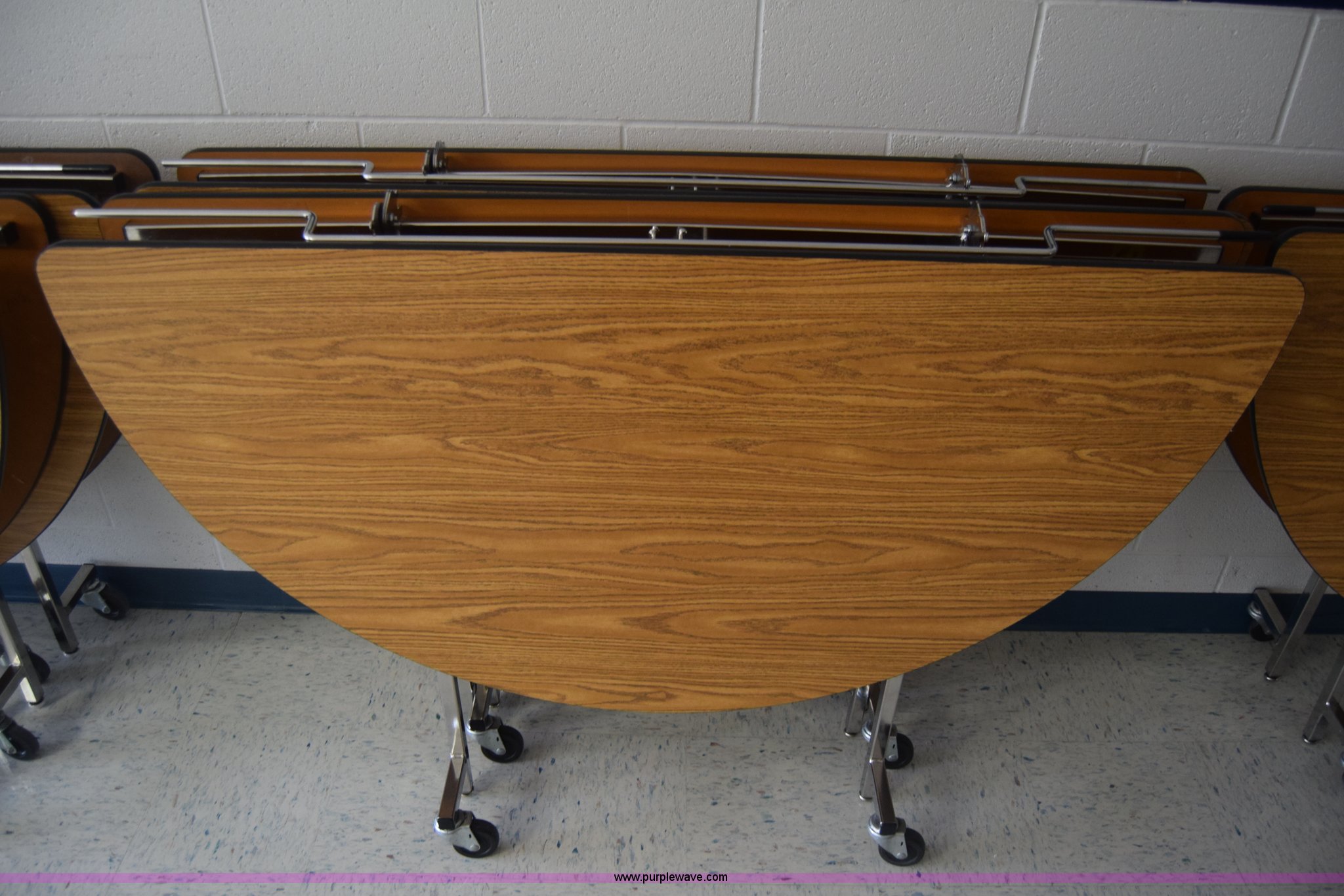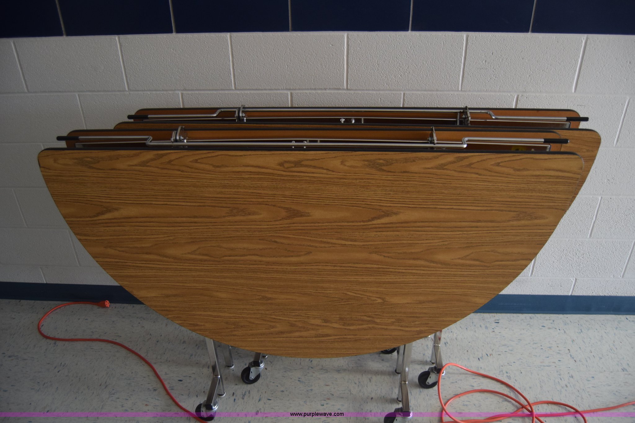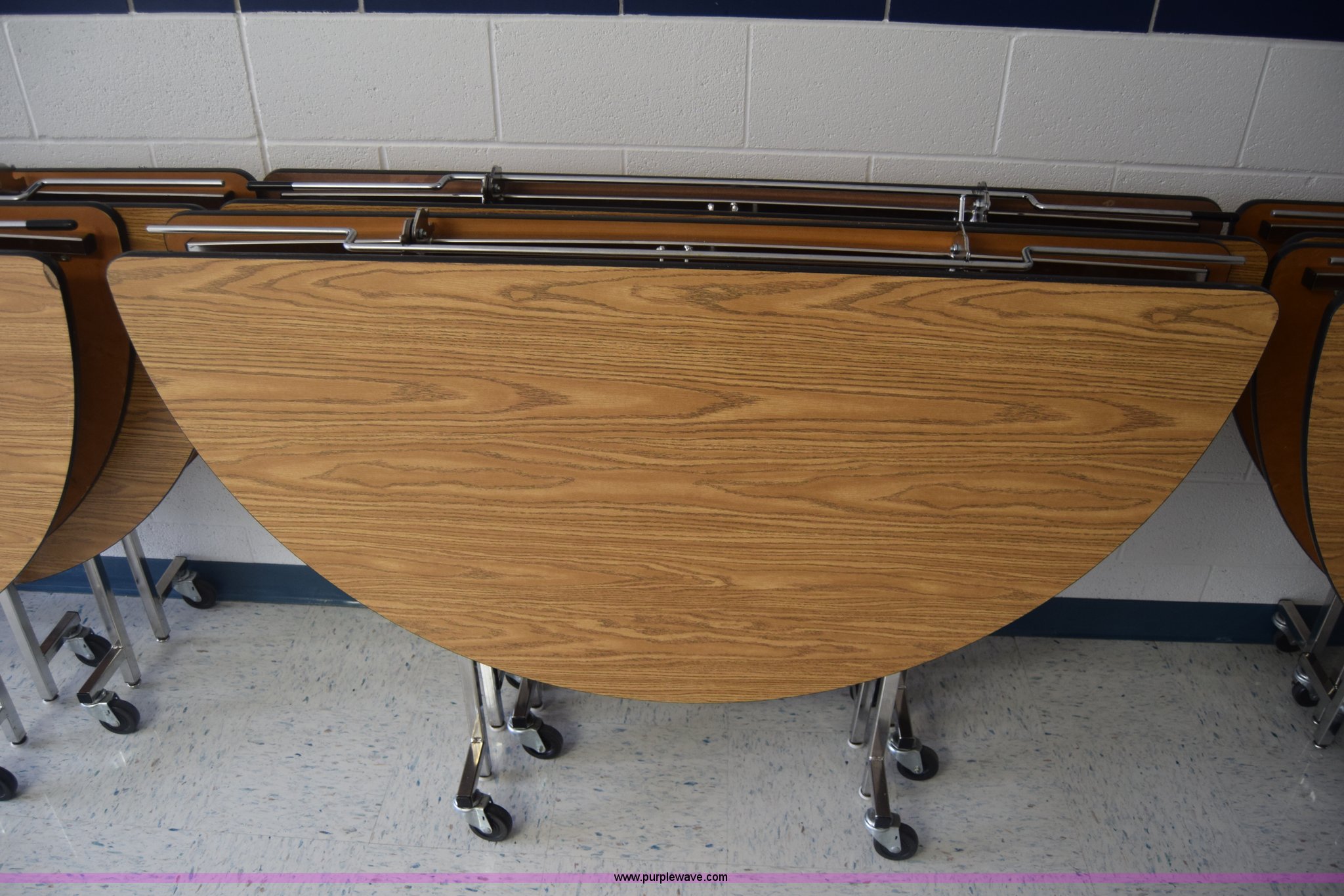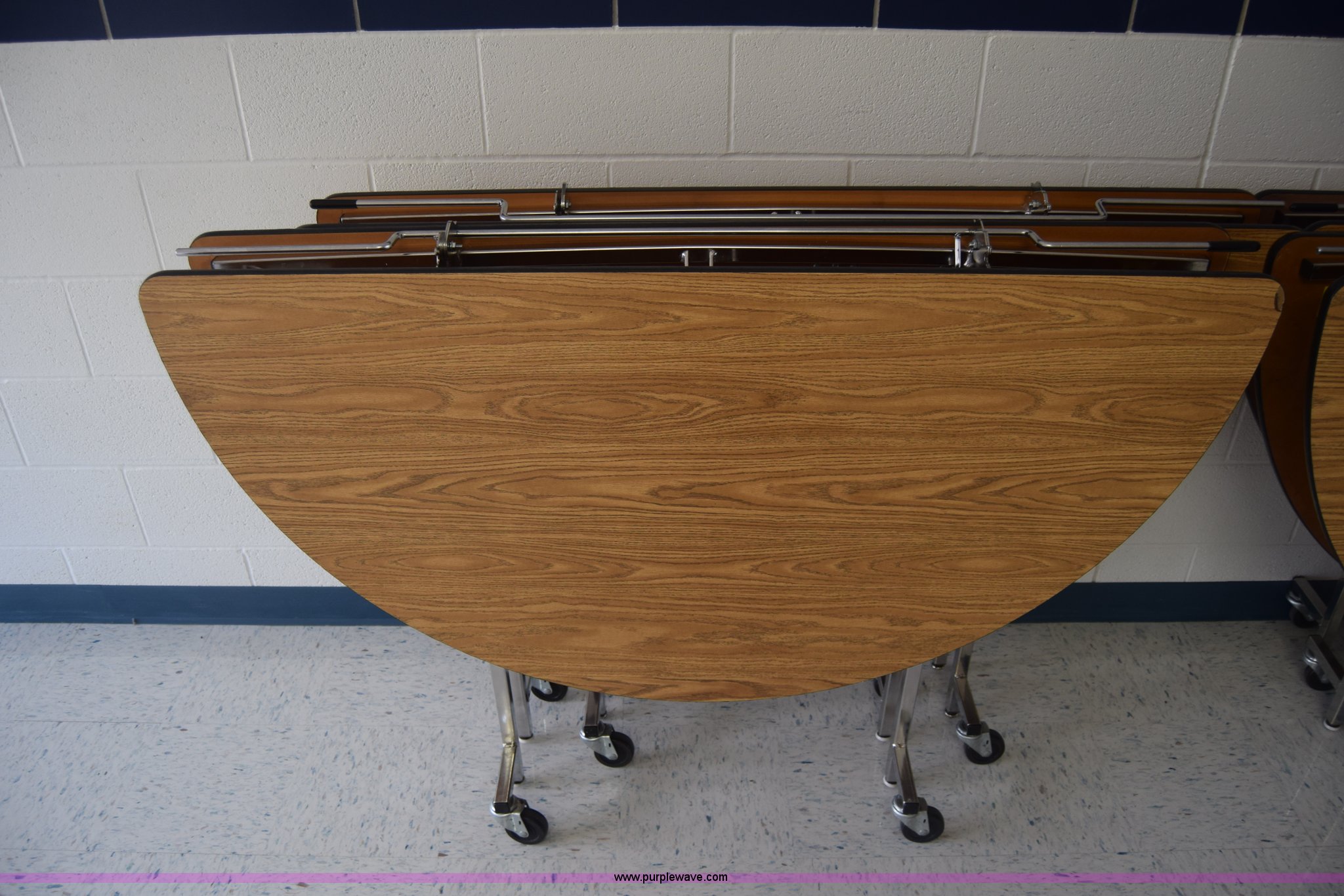 Purple Wave is selling a used Furniture in Kansas. This item is a (10) folding round tables with the following: 29"H x 60" diameter, Wood tops, Steel legs, Wheels