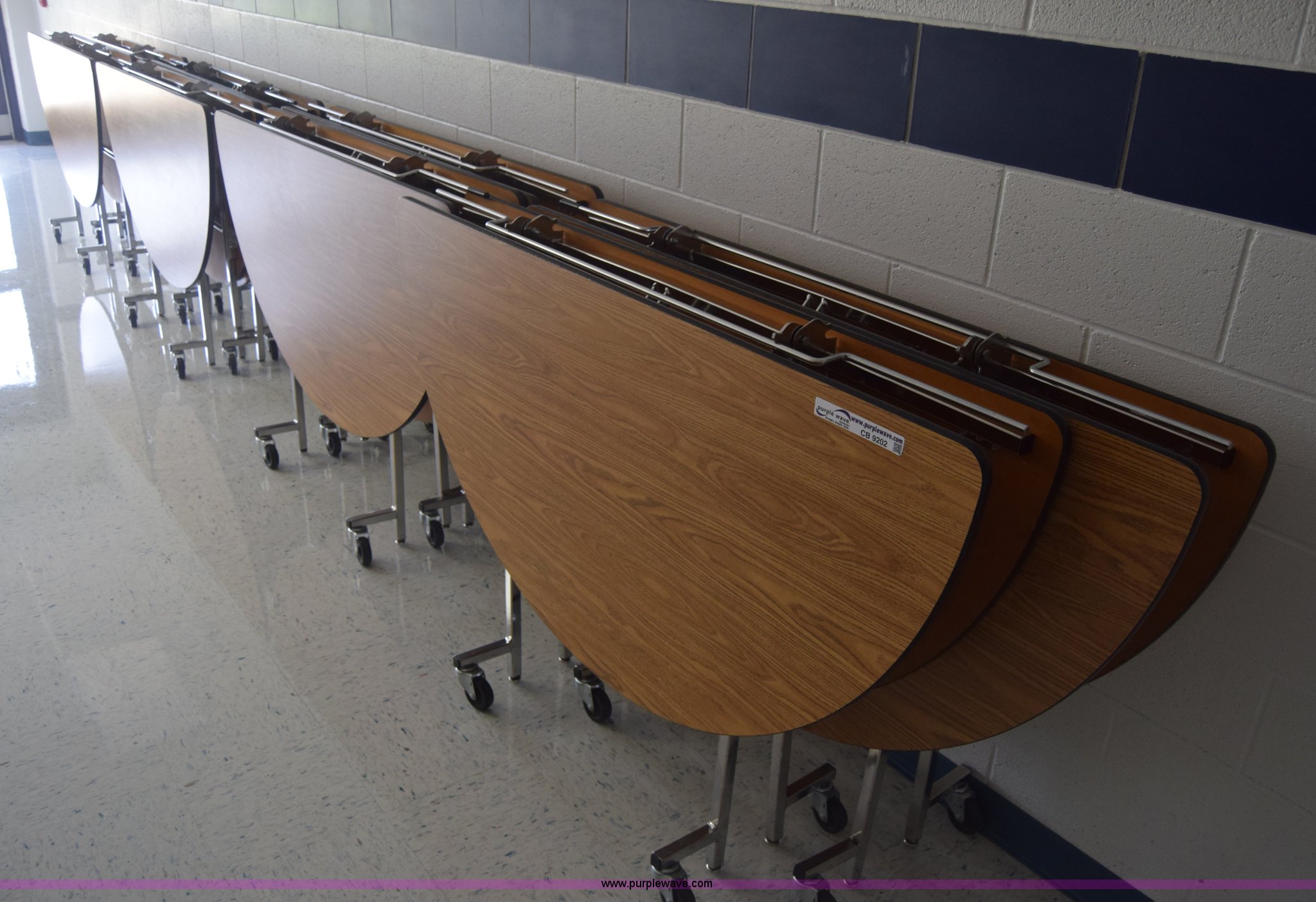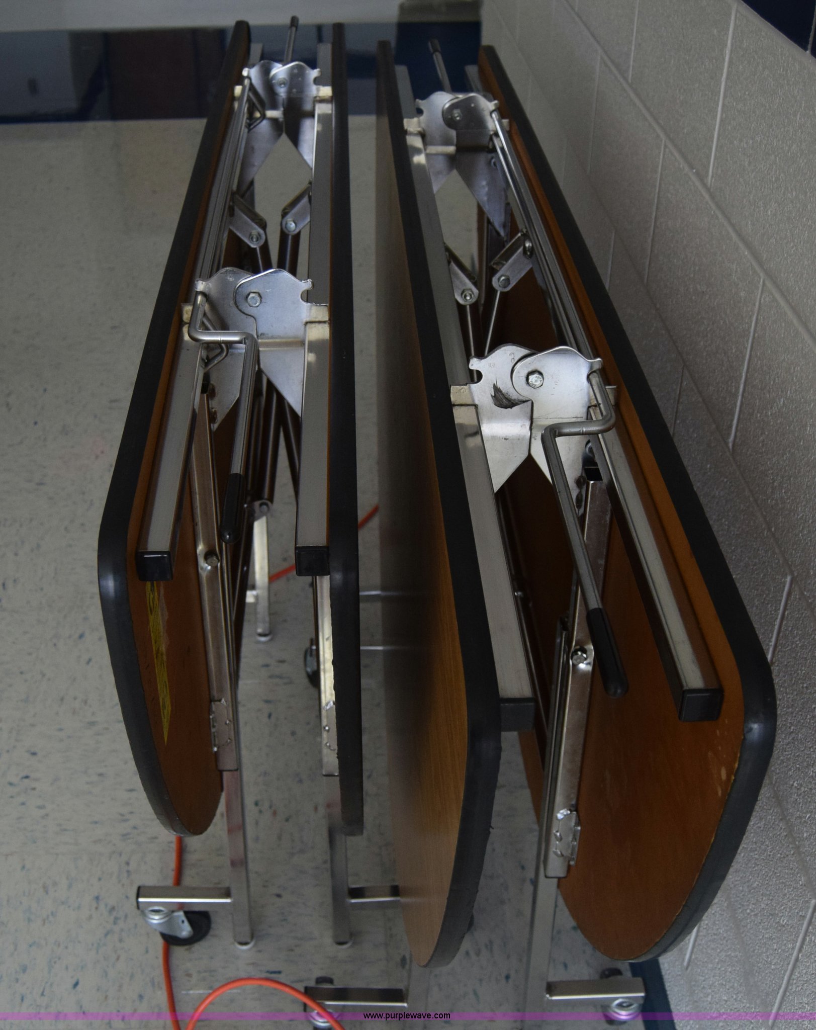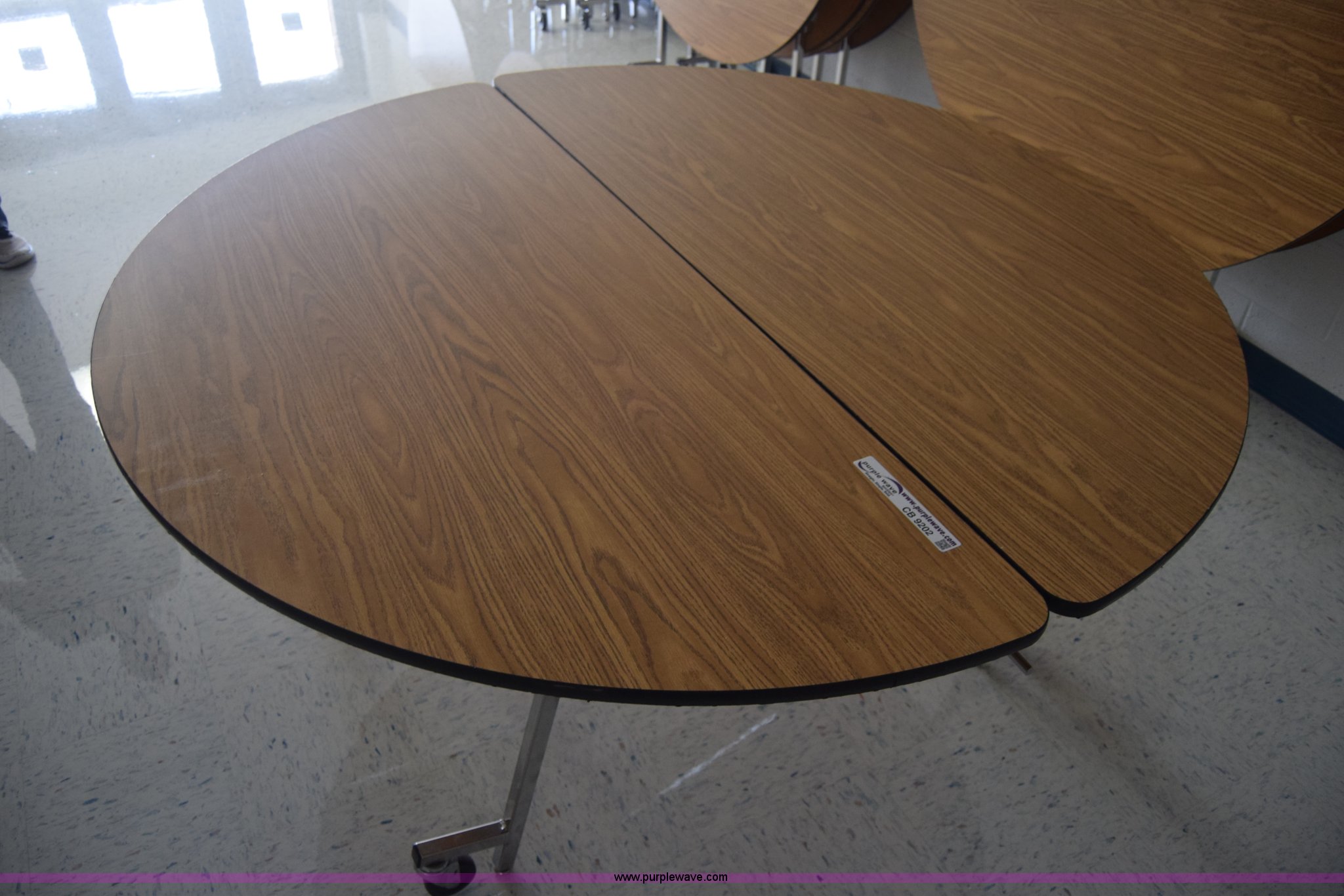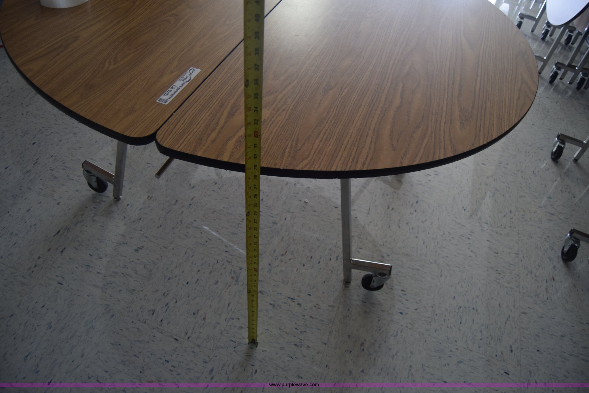 Purple Wave is selling a used Furniture in Kansas. This item is a (10) folding round tables with the following: 29"H x 60" diameter, Wood tops, Steel legs, Wheels