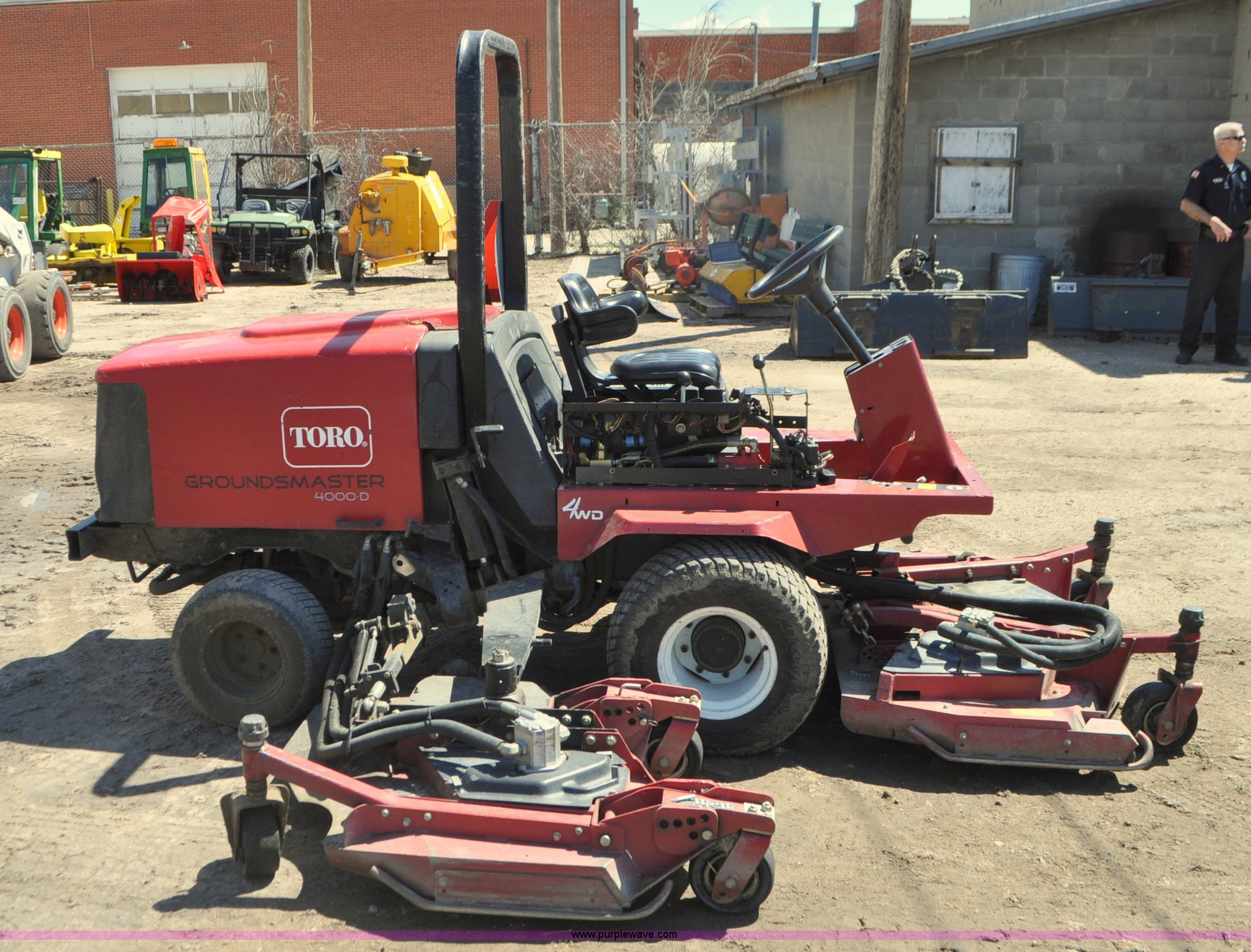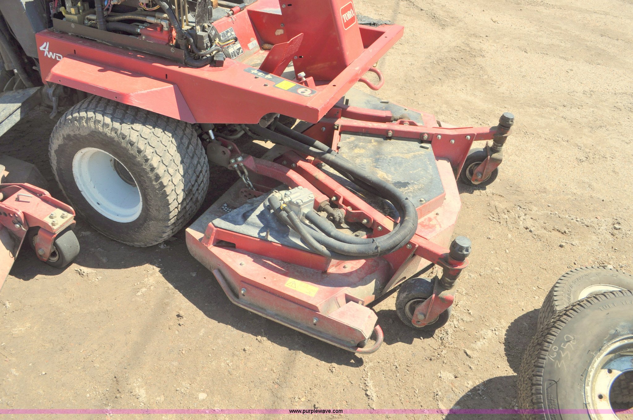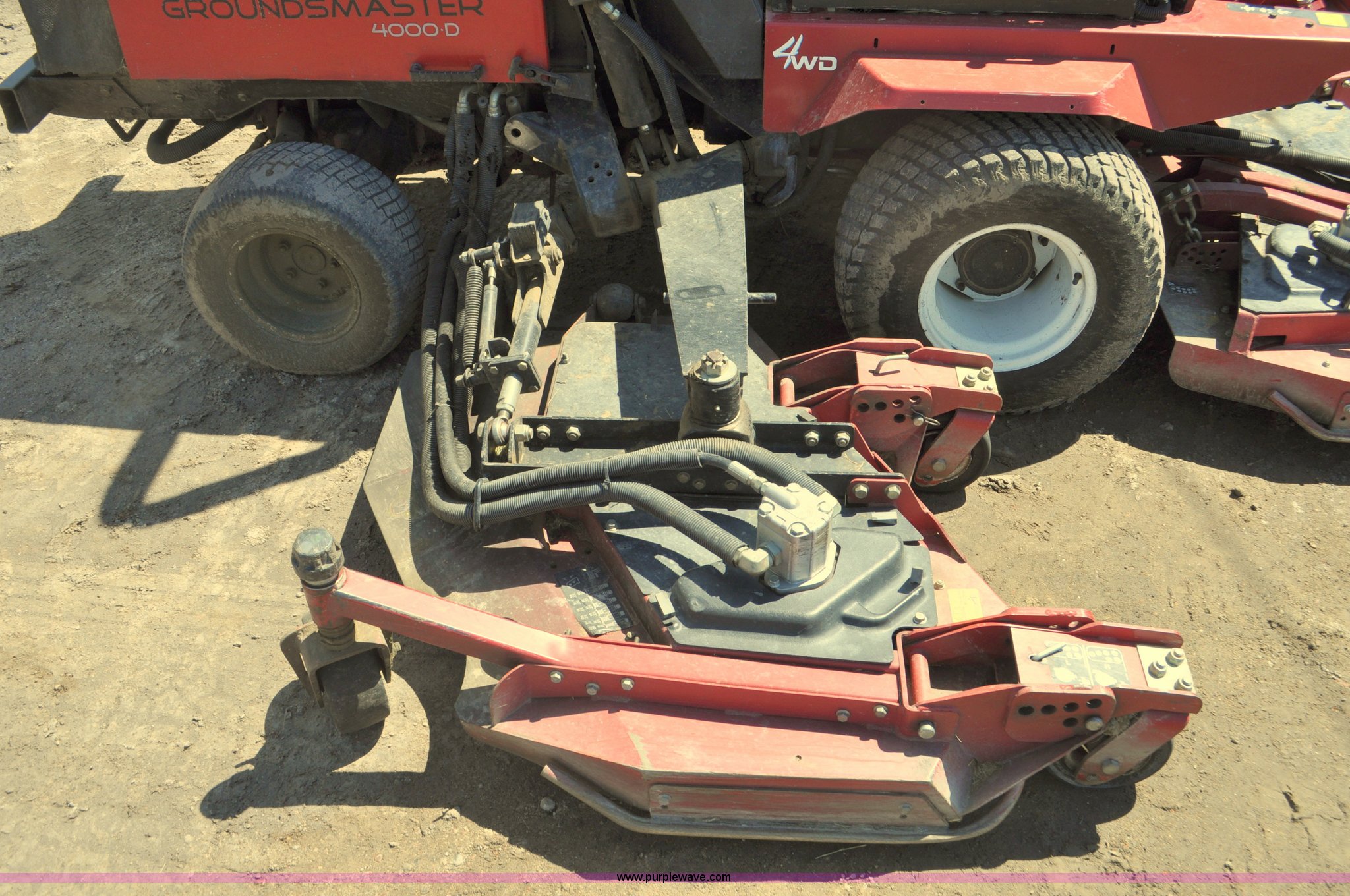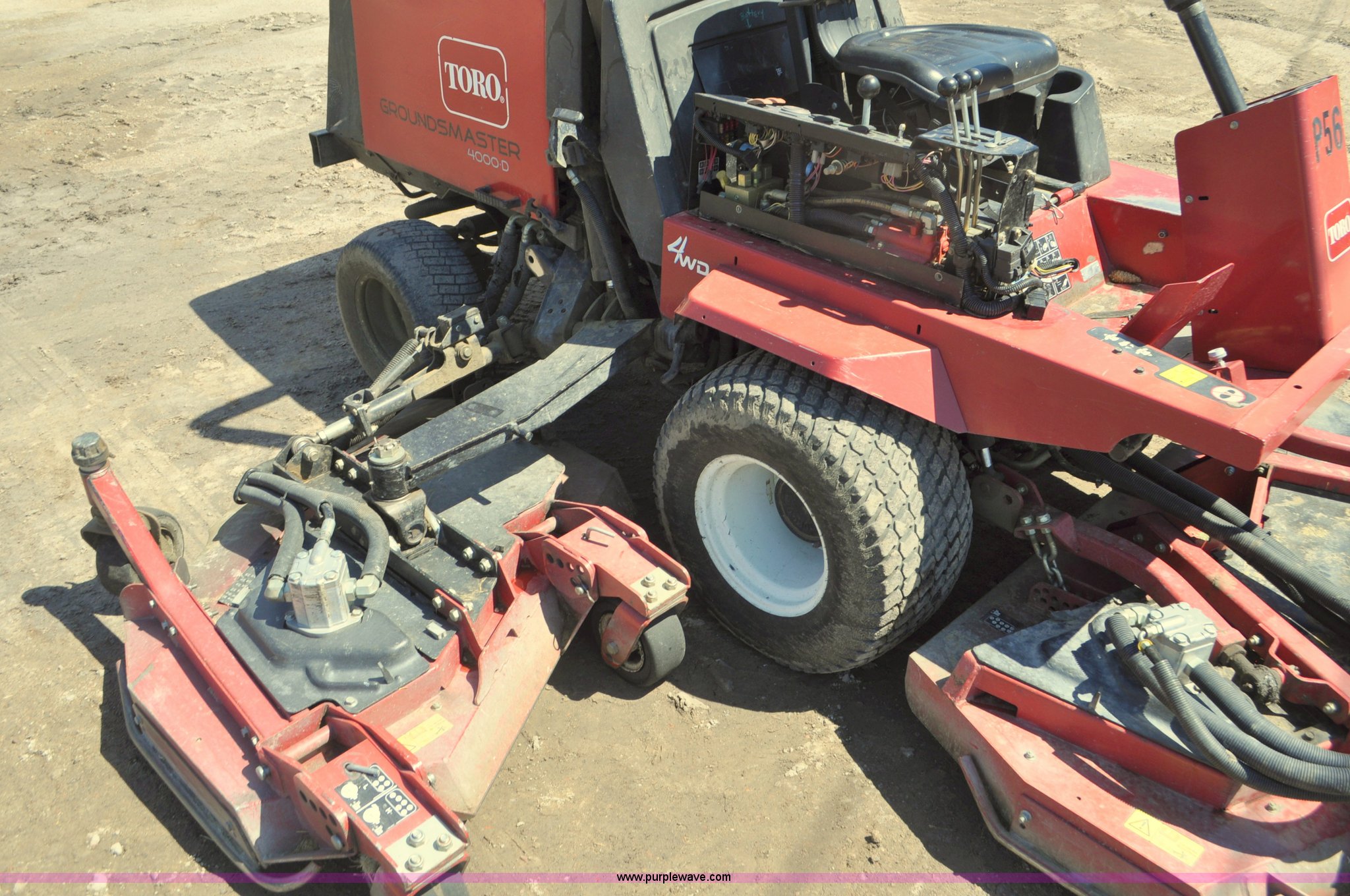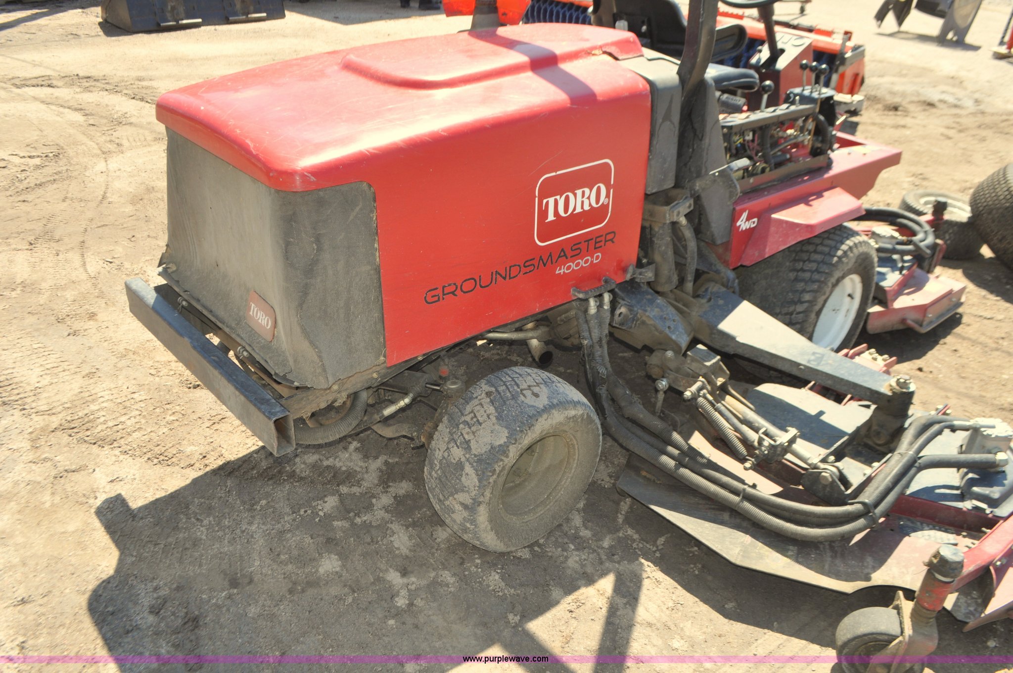 Purple Wave is selling a used Commercial Turf Mower in Nebraska. This item is a Toro Groundsmaster 4000D lawn mower with the following: 5,101 hours on meter, 11' cut, Kubota 2.0L diesel engine, Hydrostatic transmission, Four wheel drive, Roll bar, Hydraulic wing fold side decks, 26x12.00-12 front tires, 20x10.00-10 rear tires, Additional tires, Non-operational neutral start switch