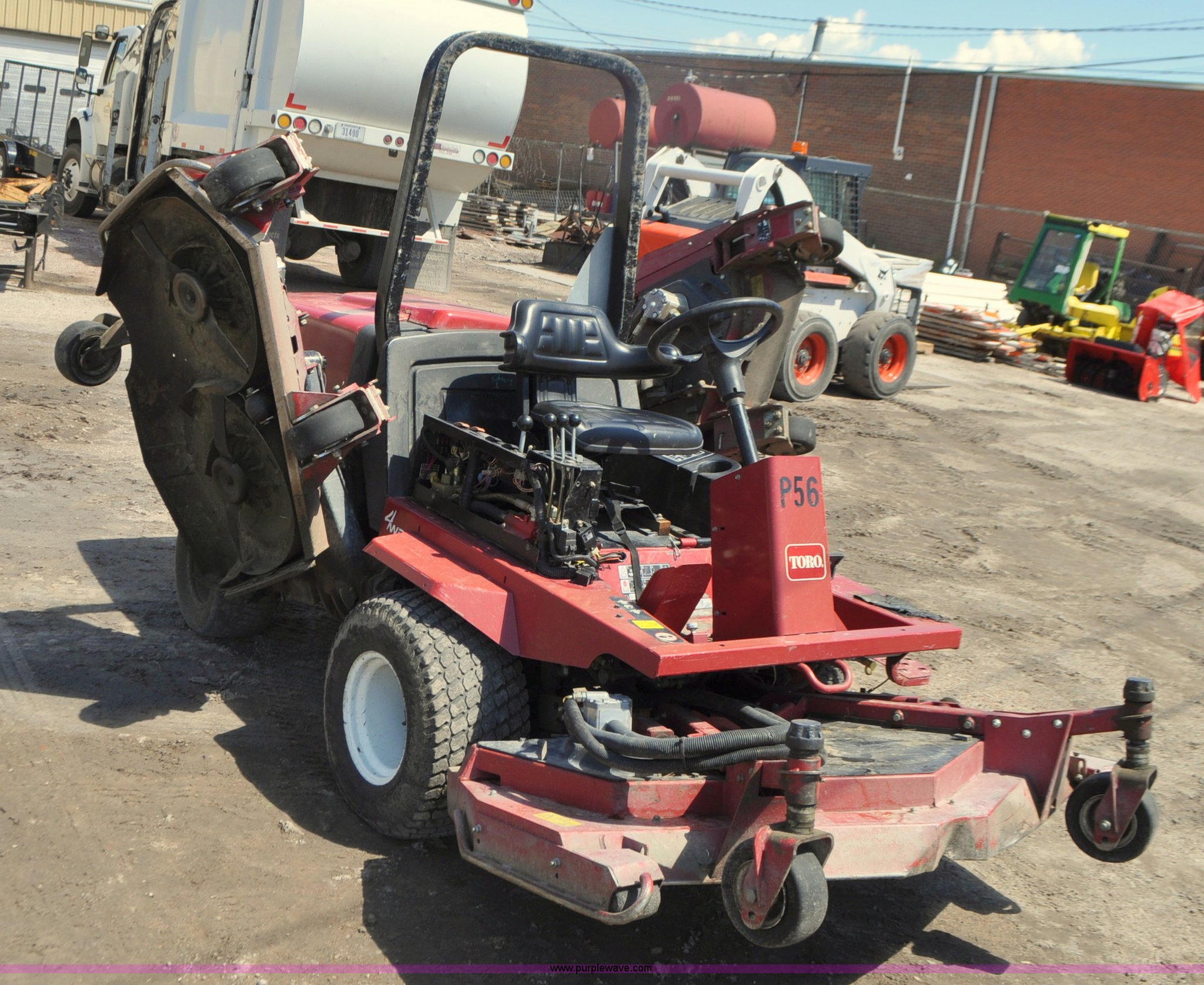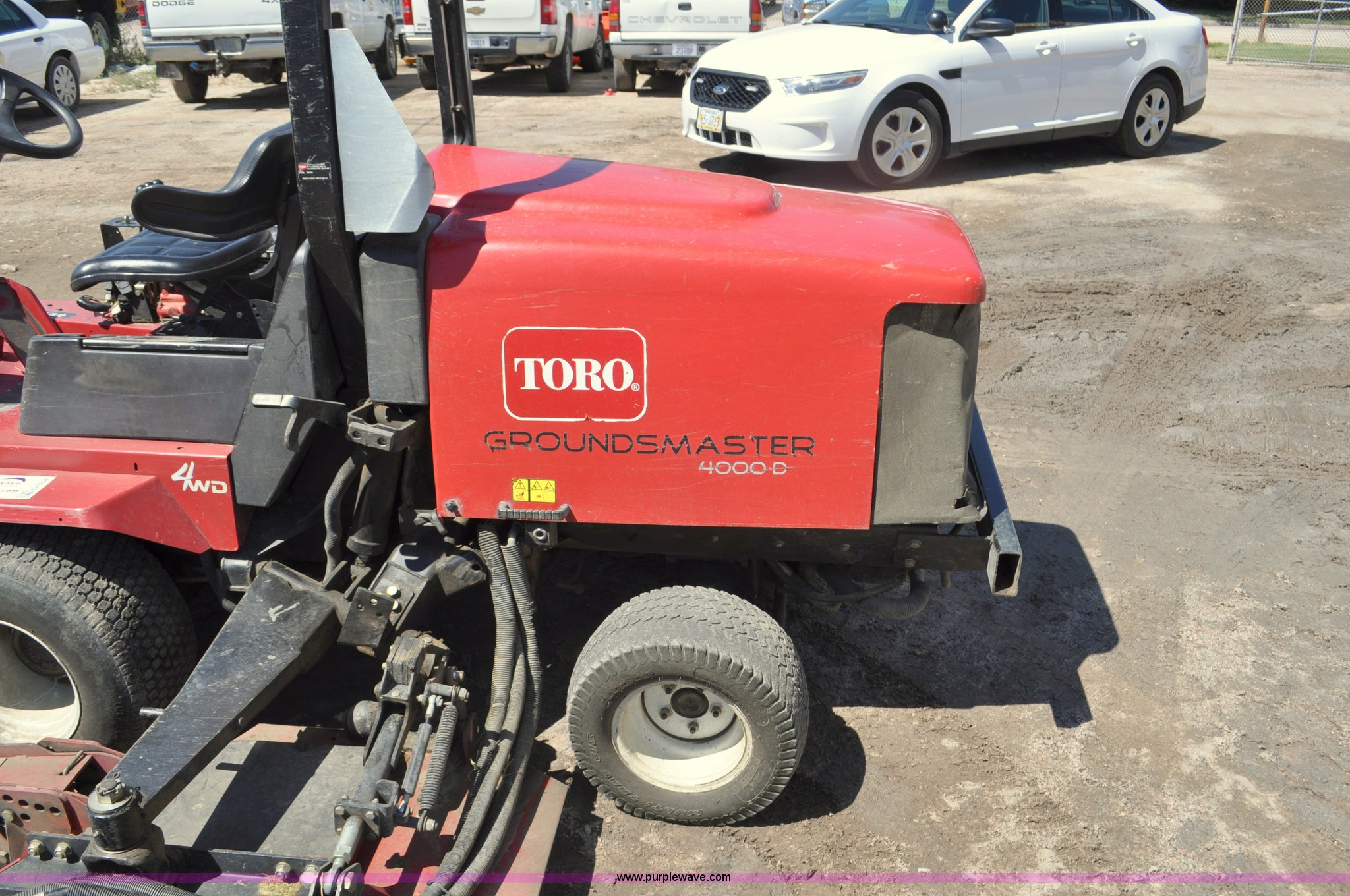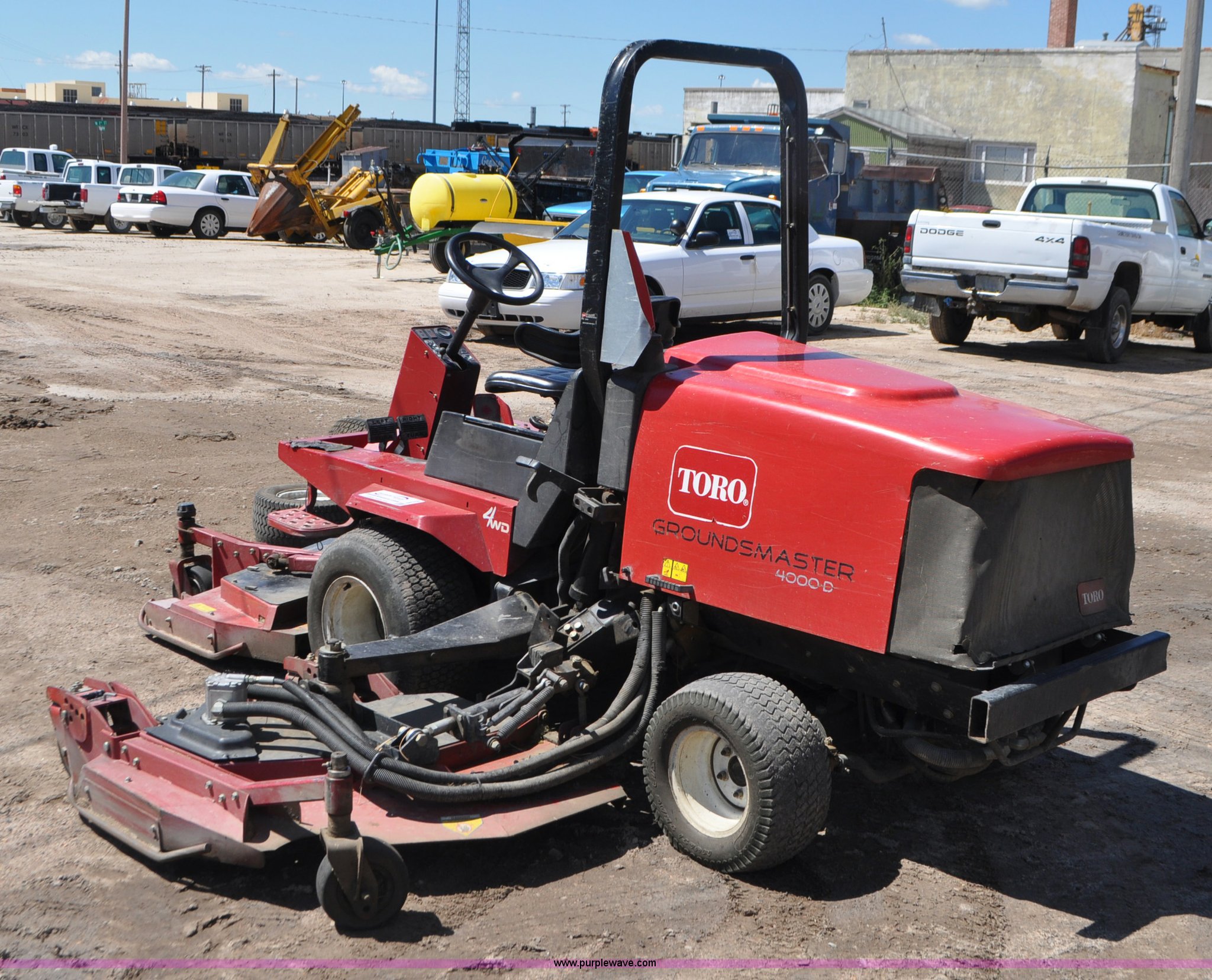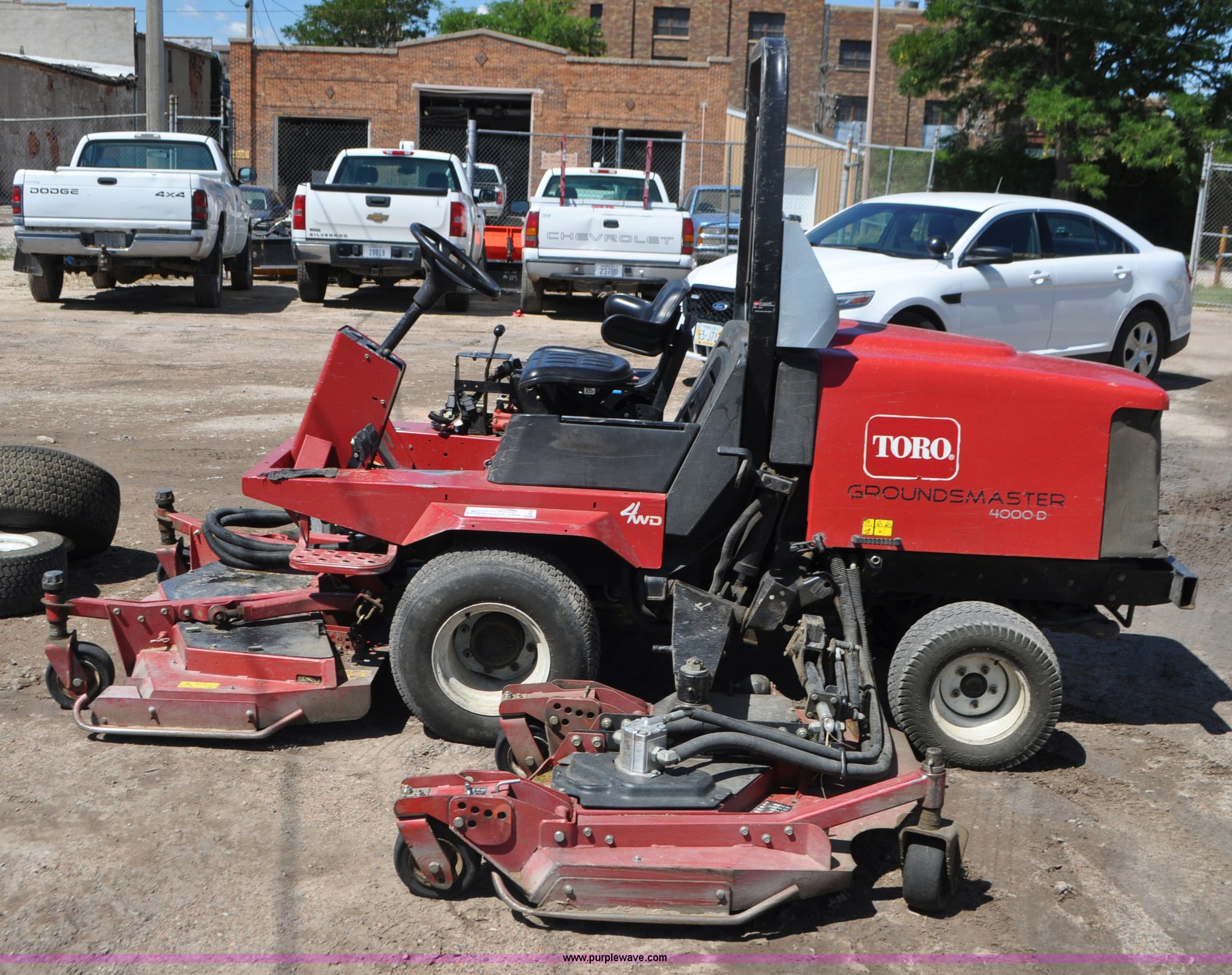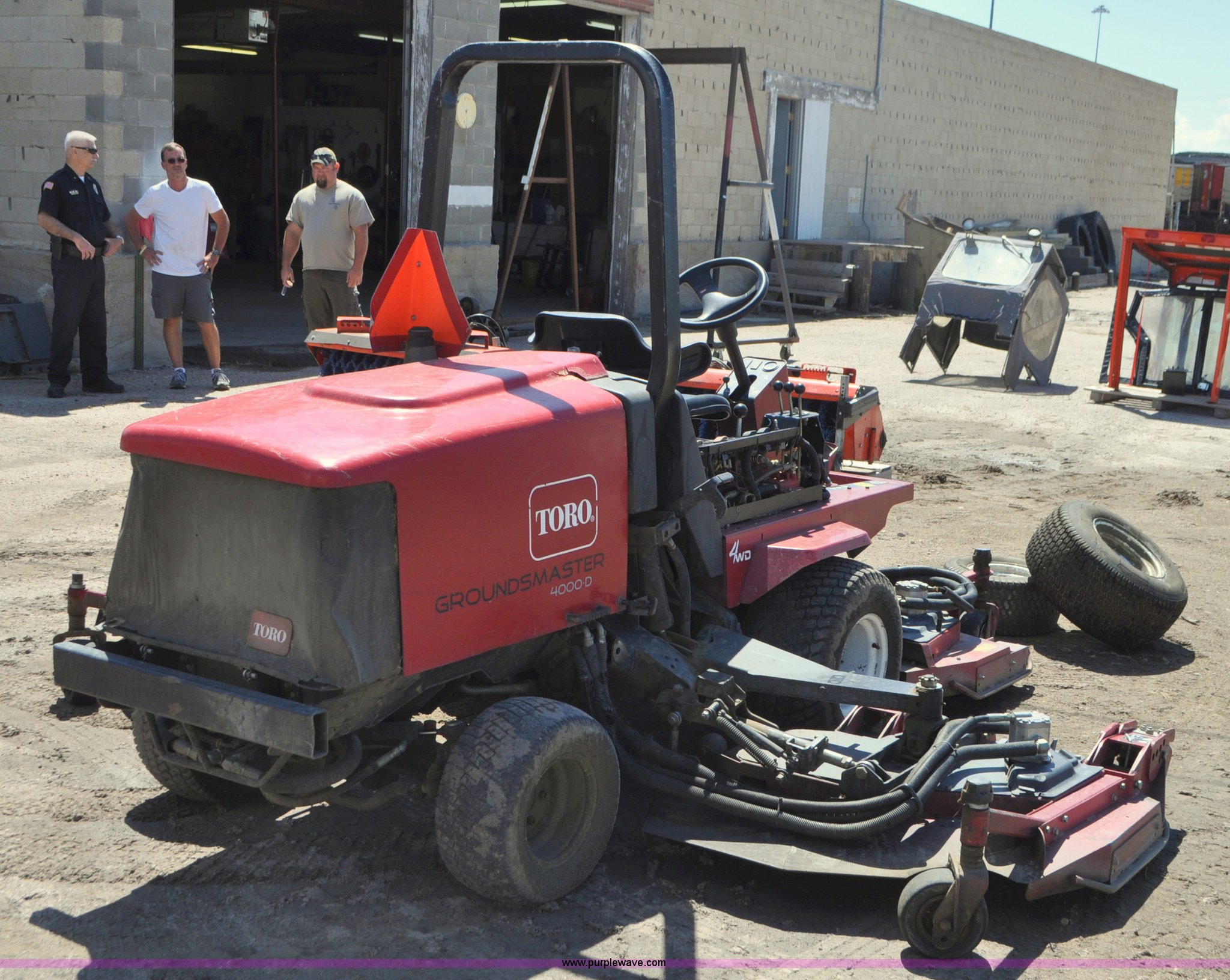 Purple Wave is selling a used Commercial Turf Mower in Nebraska. This item is a Toro Groundsmaster 4000D lawn mower with the following: 5,101 hours on meter, 11' cut, Kubota 2.0L diesel engine, Hydrostatic transmission, Four wheel drive, Roll bar, Hydraulic wing fold side decks, 26x12.00-12 front tires, 20x10.00-10 rear tires, Additional tires, Non-operational neutral start switch