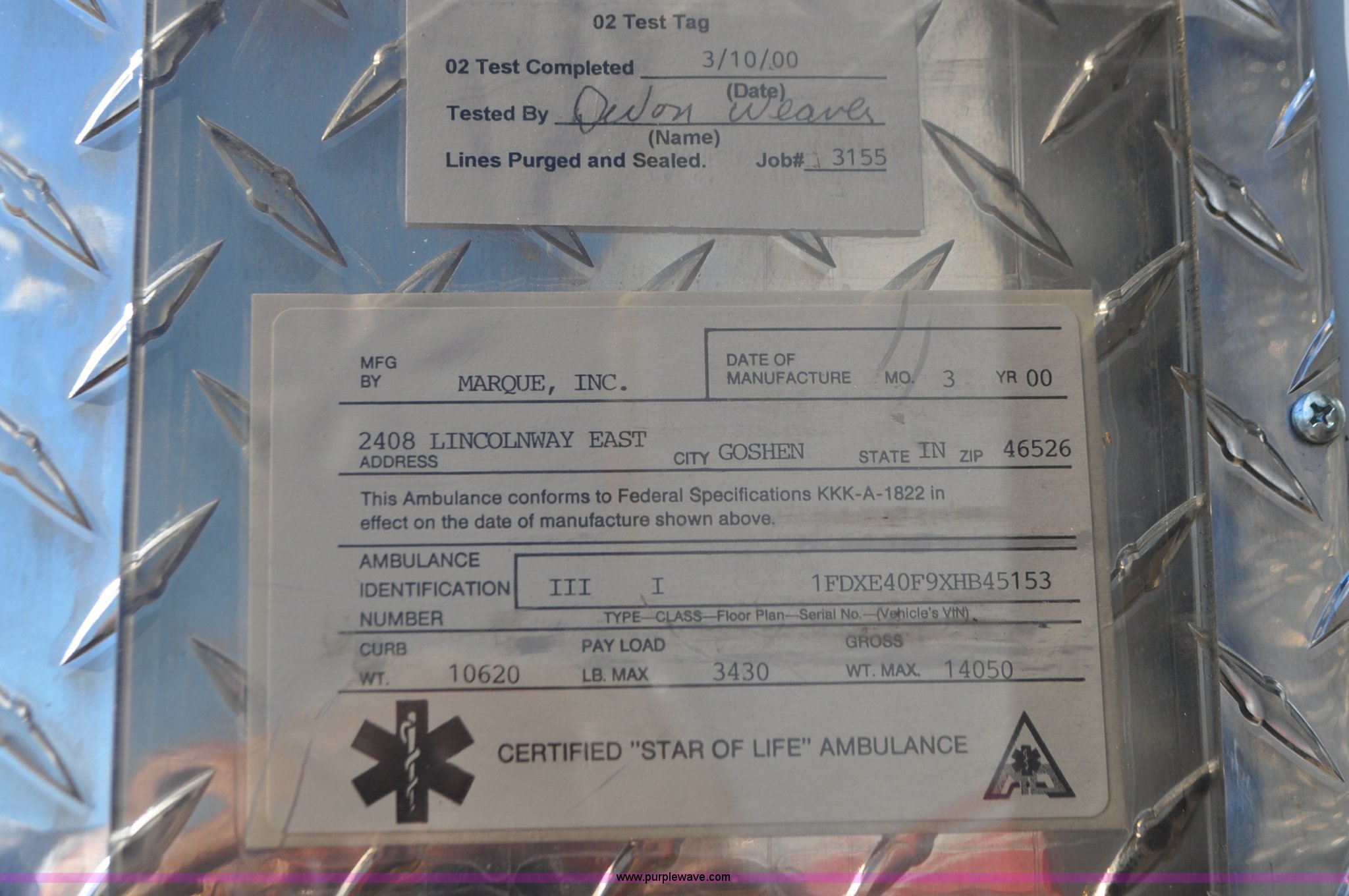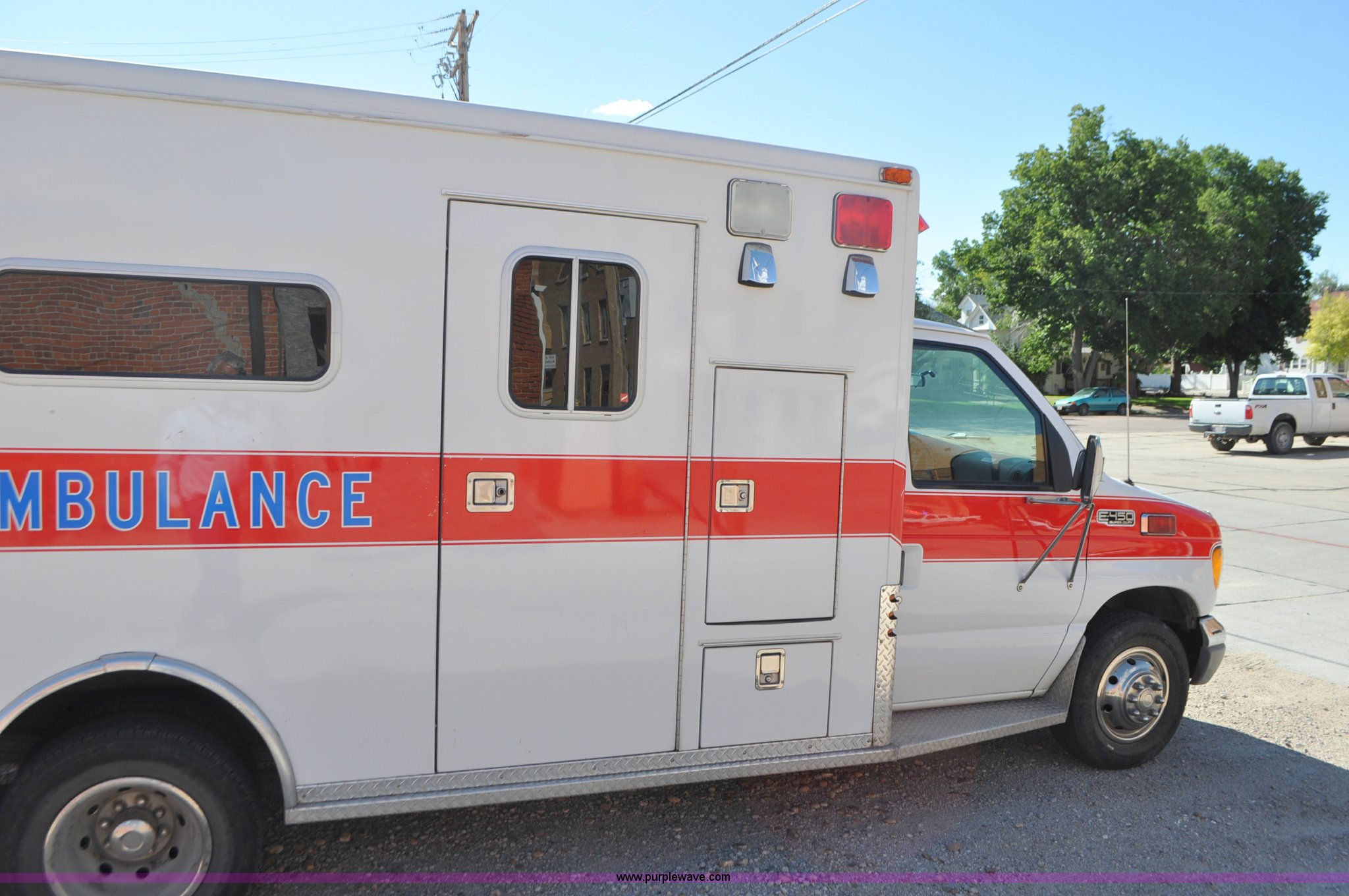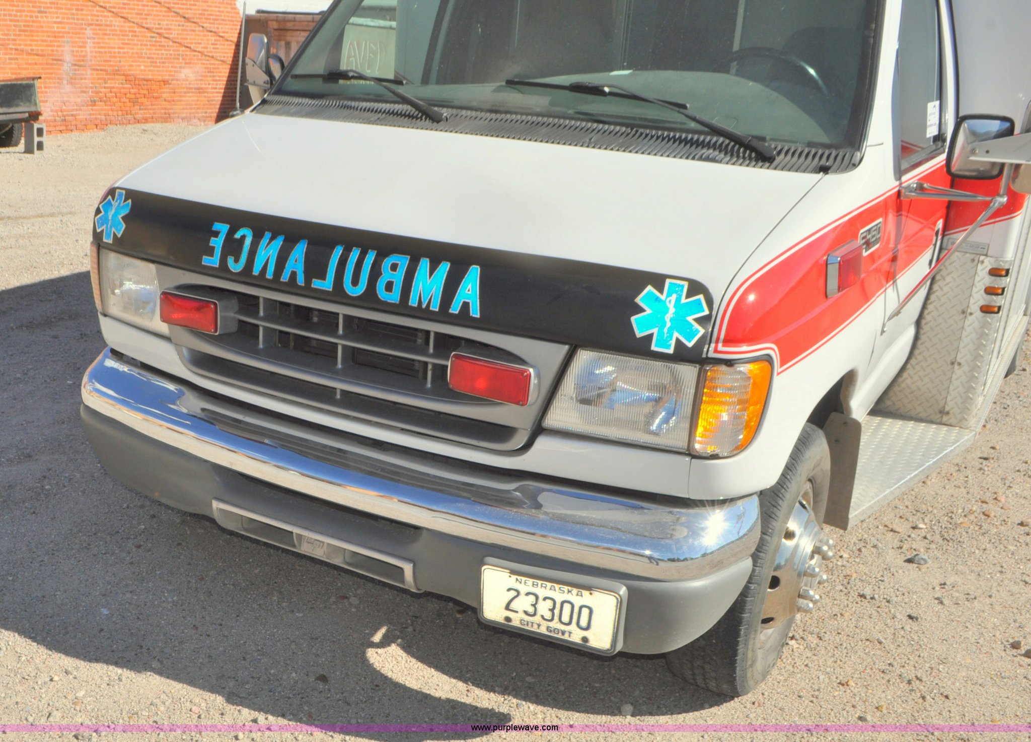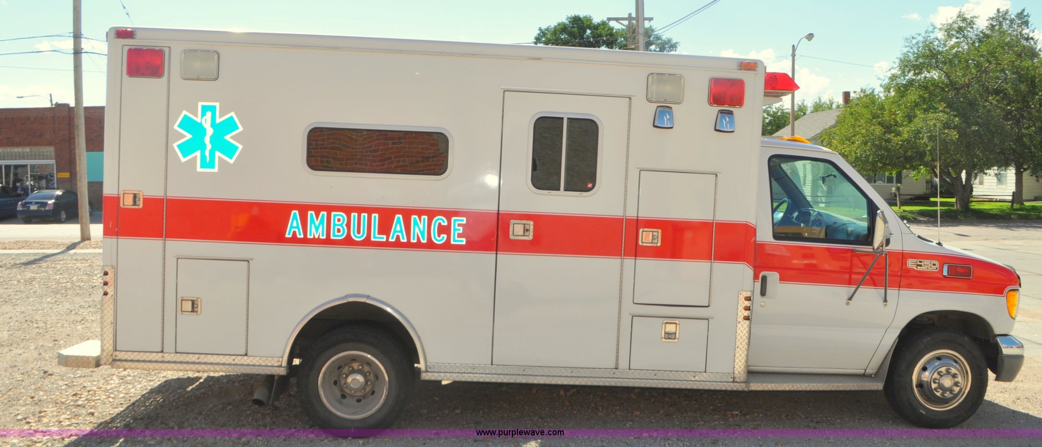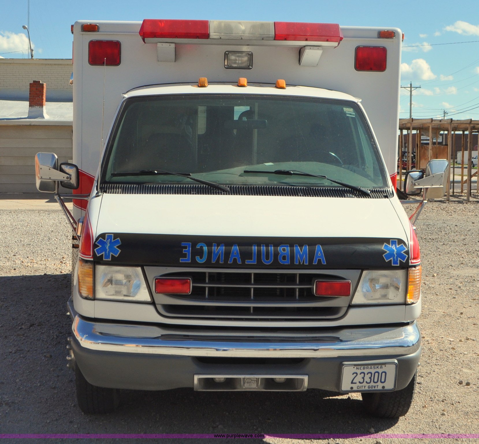 Purple Wave is selling a used Fire Truck or Emergency Vehicle in Nebraska. This item is a 1999 Ford Econoline E450 ambulance with the following: 52,807 miles on odometer, 7,501 hours on meter, 7.3L V8 OHV 16V turbo diesel engine, Automatic transmission, Single axle, AC and heat, AM/FM, Power windows and locks, Marque ambulance body, Emergency lights and sirens, Whelen PA/siren controls, Emergency lights, (3) oxygen hookups, Vacuum hookups, Michelin 225/75R16 tires, GVWR 14,050 lbs