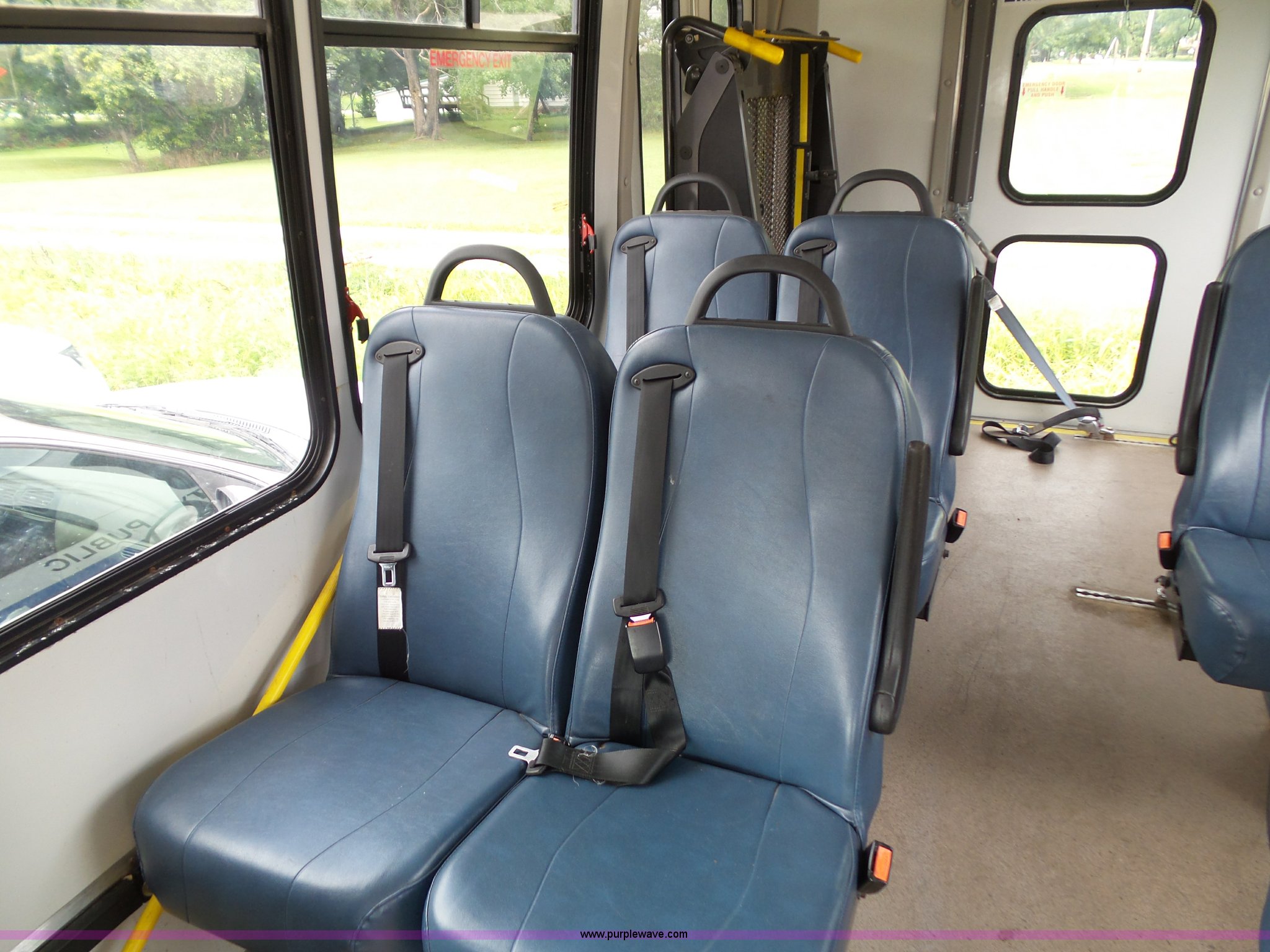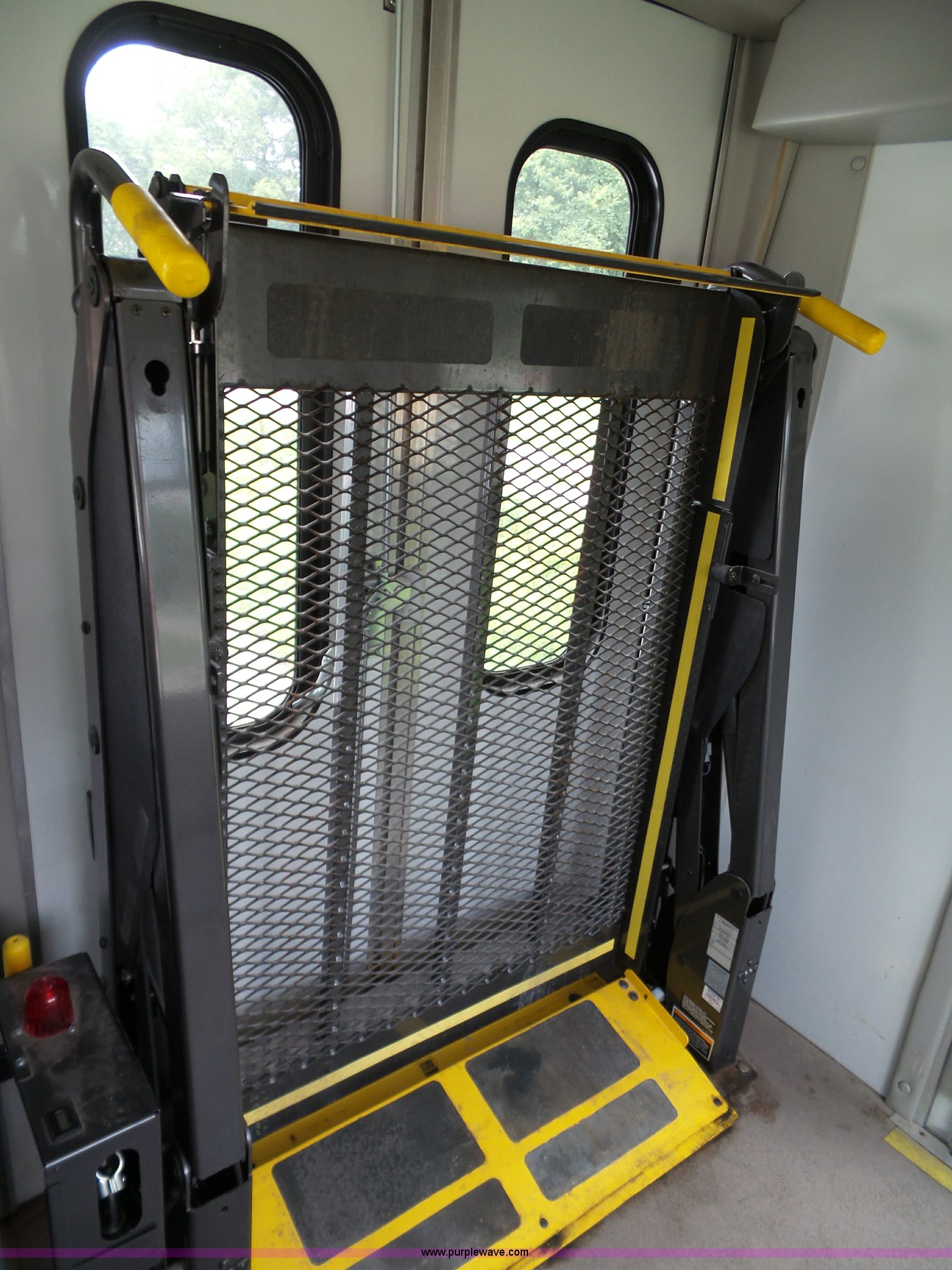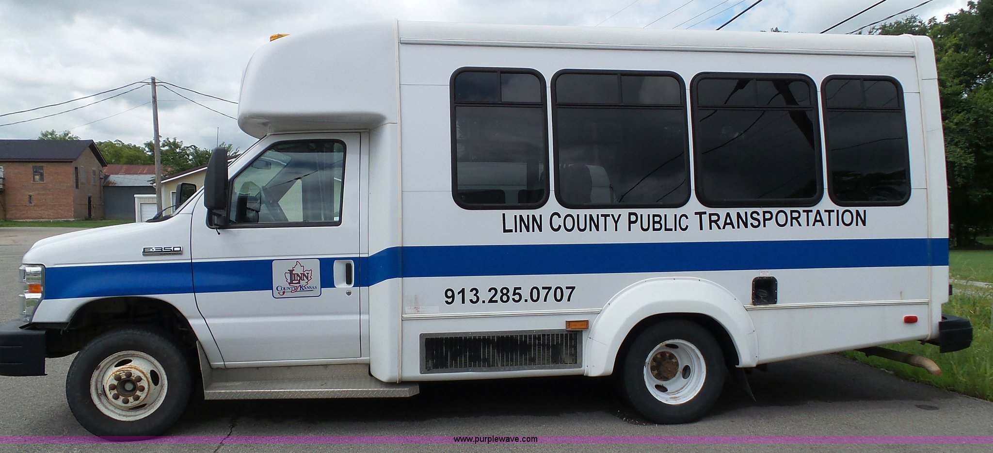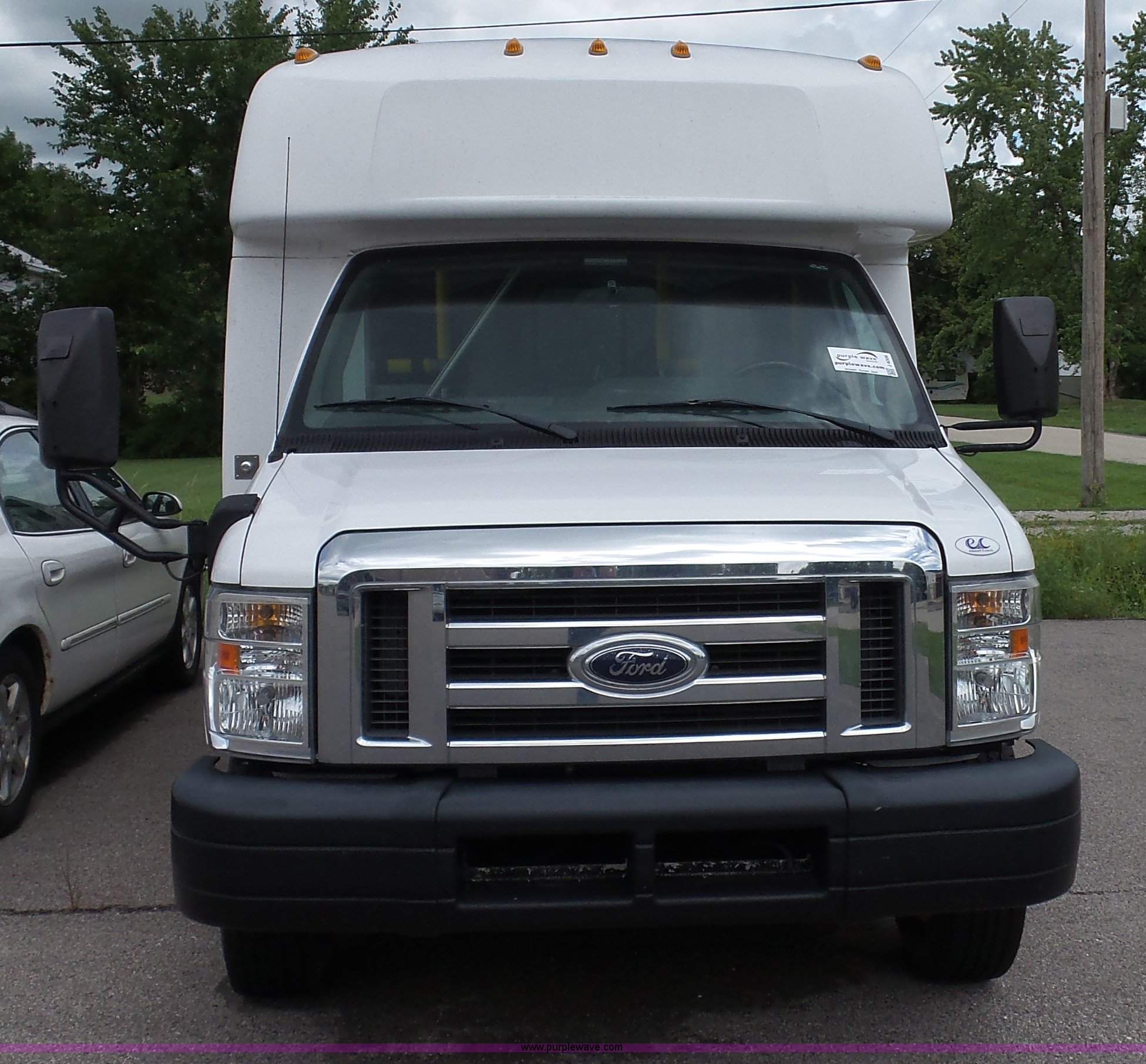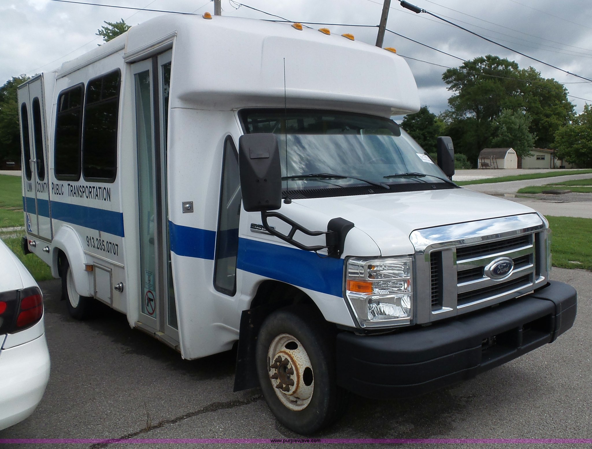Purple Wave is selling a used Bus in Kansas. This item is a 2010 Ford Econoline E350 shuttle bus with the following: 129,623 miles on odometer, 6.8L V10 SOHC 20V gas engine, Automatic transmission, Single axle, AC and heat, Tilt, Cruise, AM/FM/CD, Manual windows and locks, Power mirrors and seat, Cloth driver seat, Vinyl passenger seat, Nine passenger capacity, Seat belts, 2010 Braun NCL919FIB-2 wheelchair lift, Serial DA-03858, Wheelchair tie down area, Ceiling, rear, and side emergency egress, Acc Climate Control AC roof unit, Spring suspension, Hydraulic brakes, 138" wheelbase, Firestone 225/75R16 tires, Decals will be removed prior to auction, Non-operational engine, Unit must be towed or hauled