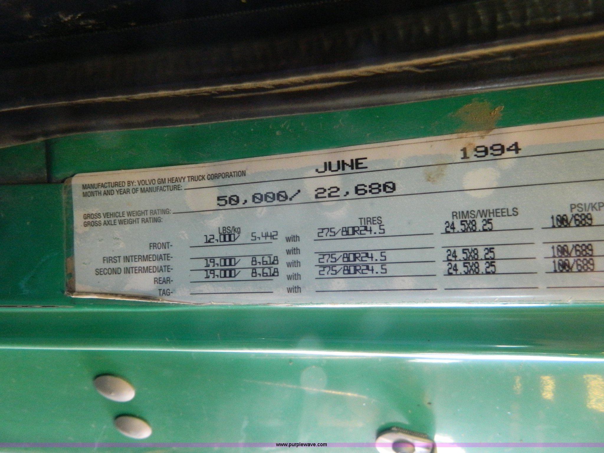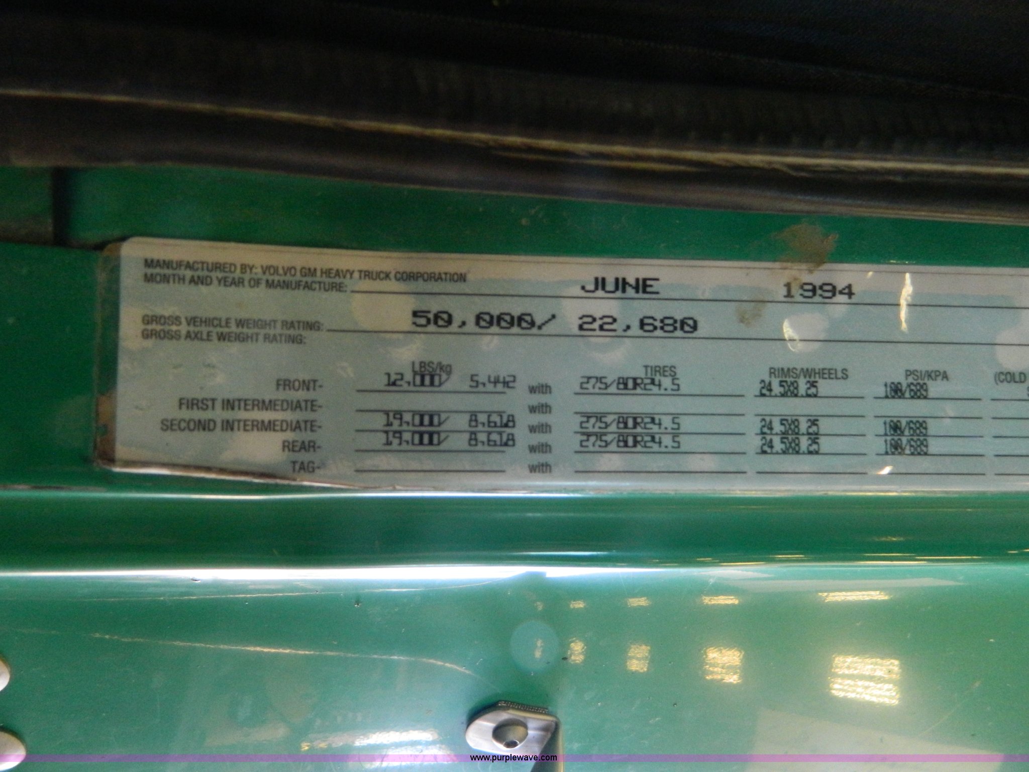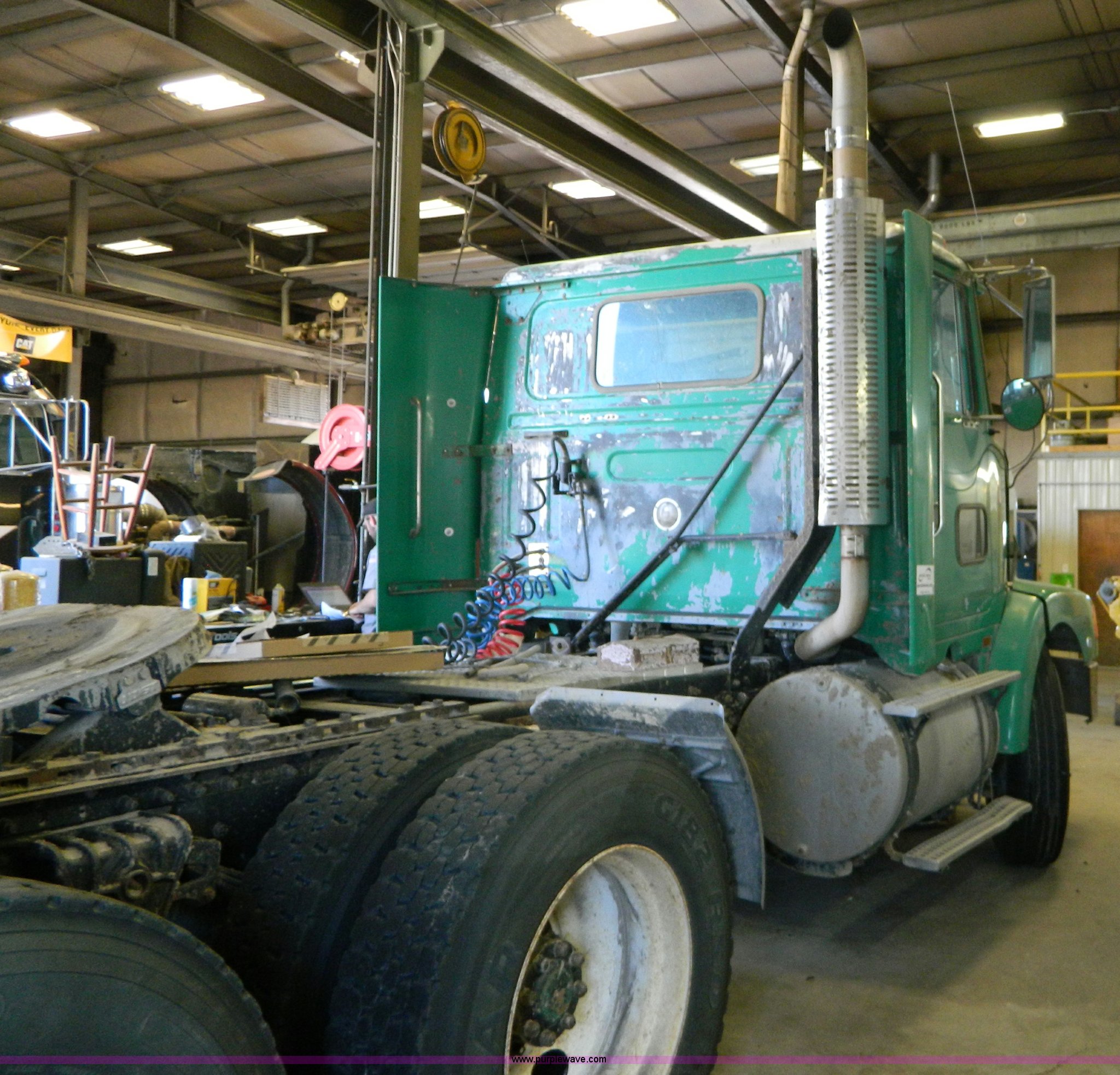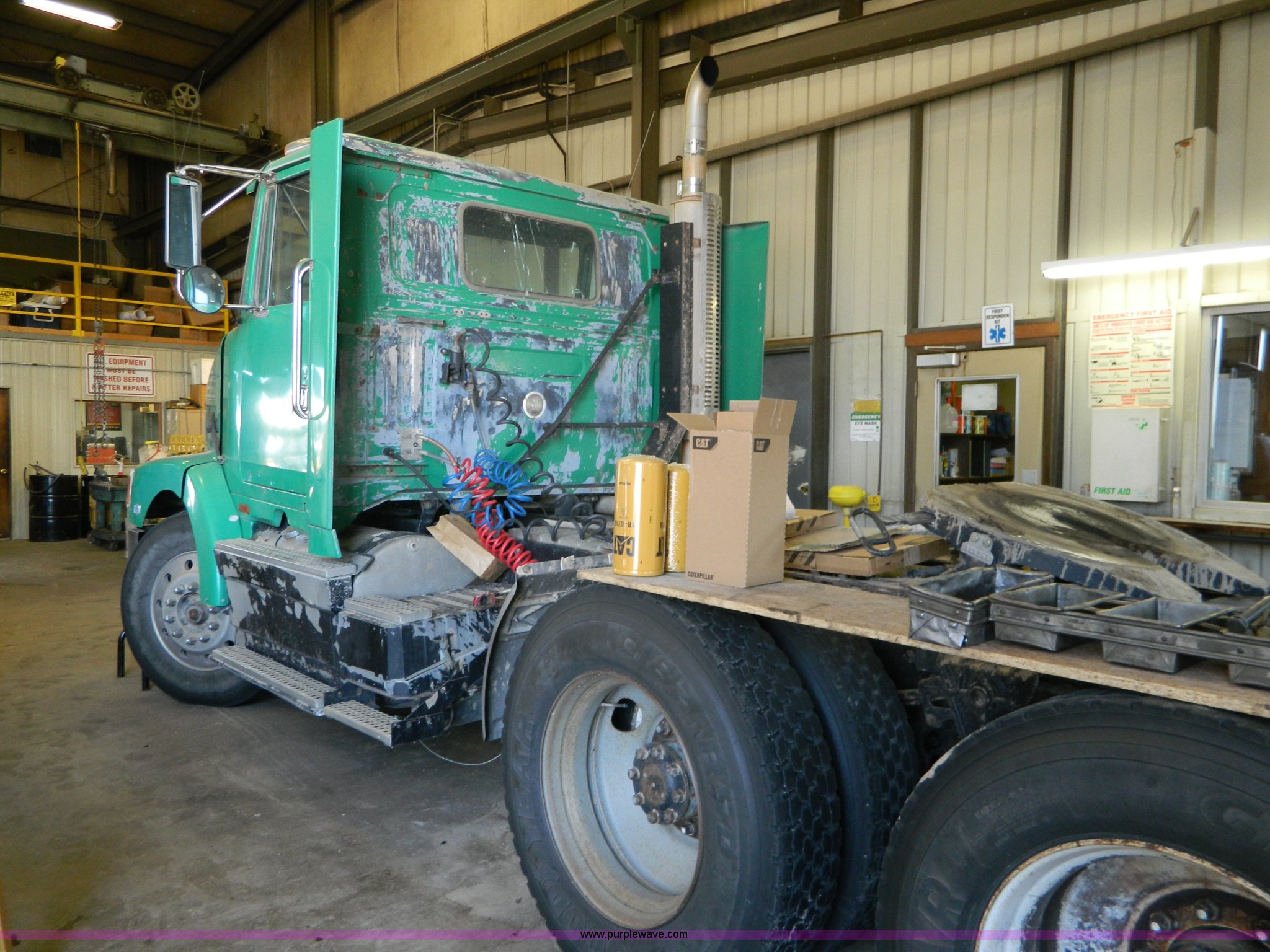 Purple Wave is selling a used Truck Tractor in Kansas. This item is a 1995 Volvo WCA64T semi truck with the following: 113,079 miles on odometer, Odometer replaced at 653,736 miles, Approx 766,815 miles, Caterpillar 3176B 10.3L L6 turbo diesel engine, 325 HP, Eaton Fuller nine speed manual transmission, Tandem axle, Inter-axle differential lock, AC and heat, Cruise, AM/FM/CD, Power and heated mirrors, Air suspension seat, Exterior visor, Single exhaust stack, Aluminum deck plate, Air operated sliding fifth wheel plate, Dual fuel tanks, Quarter fenders, Mud flaps, Spring suspension, Air brakes, 11R24.5 tires, GVWR 50,000 lbs, FAWR 12,000 lbs, IAWR 19,000 lbs, RAWR 19,000 lbs, Cracked windshield, Holes in rear glass, Hood and fifth wheel hitch replaced in 2015, Non-operational unit, Engine disassembled, may need to be overhauled