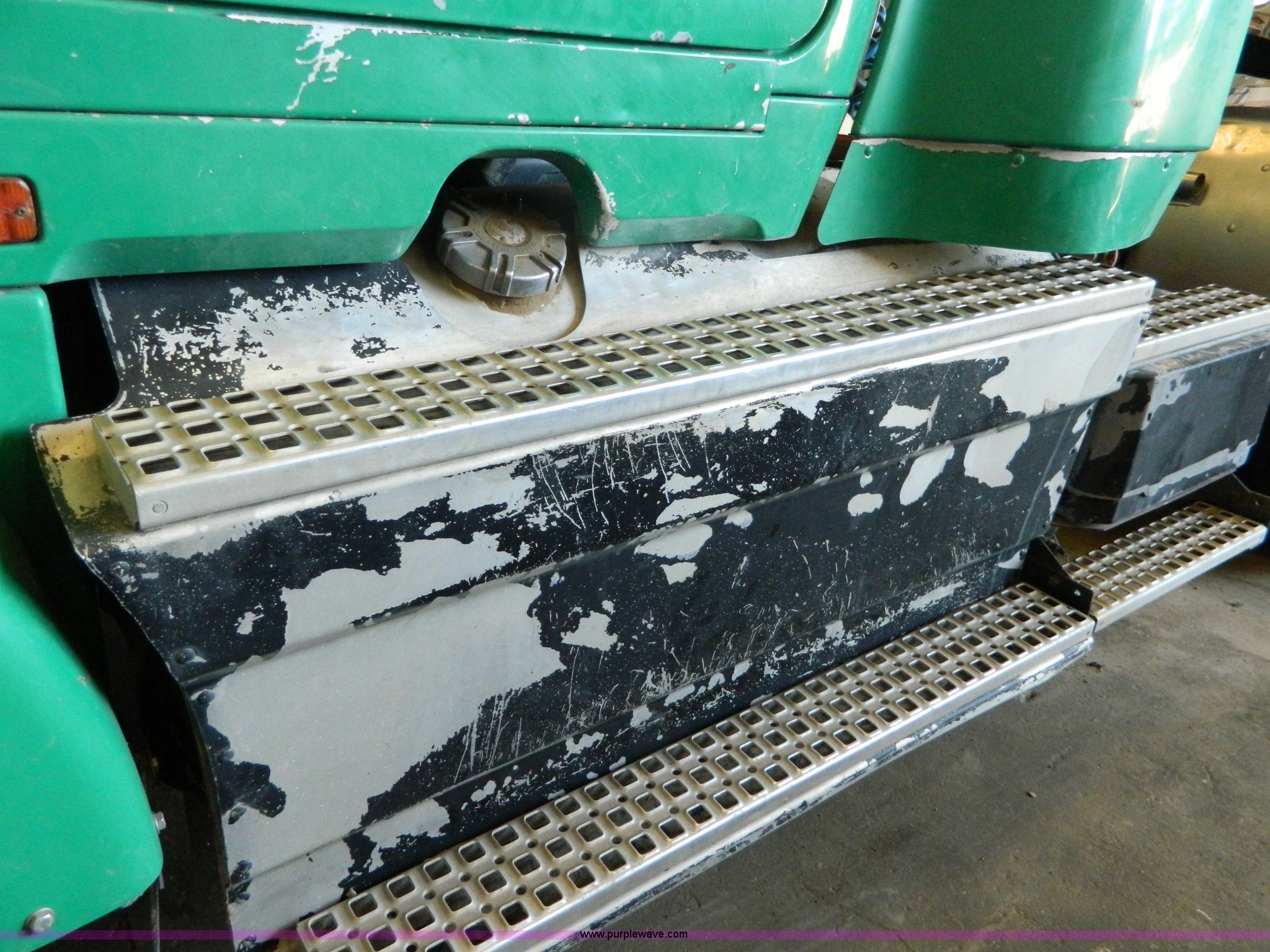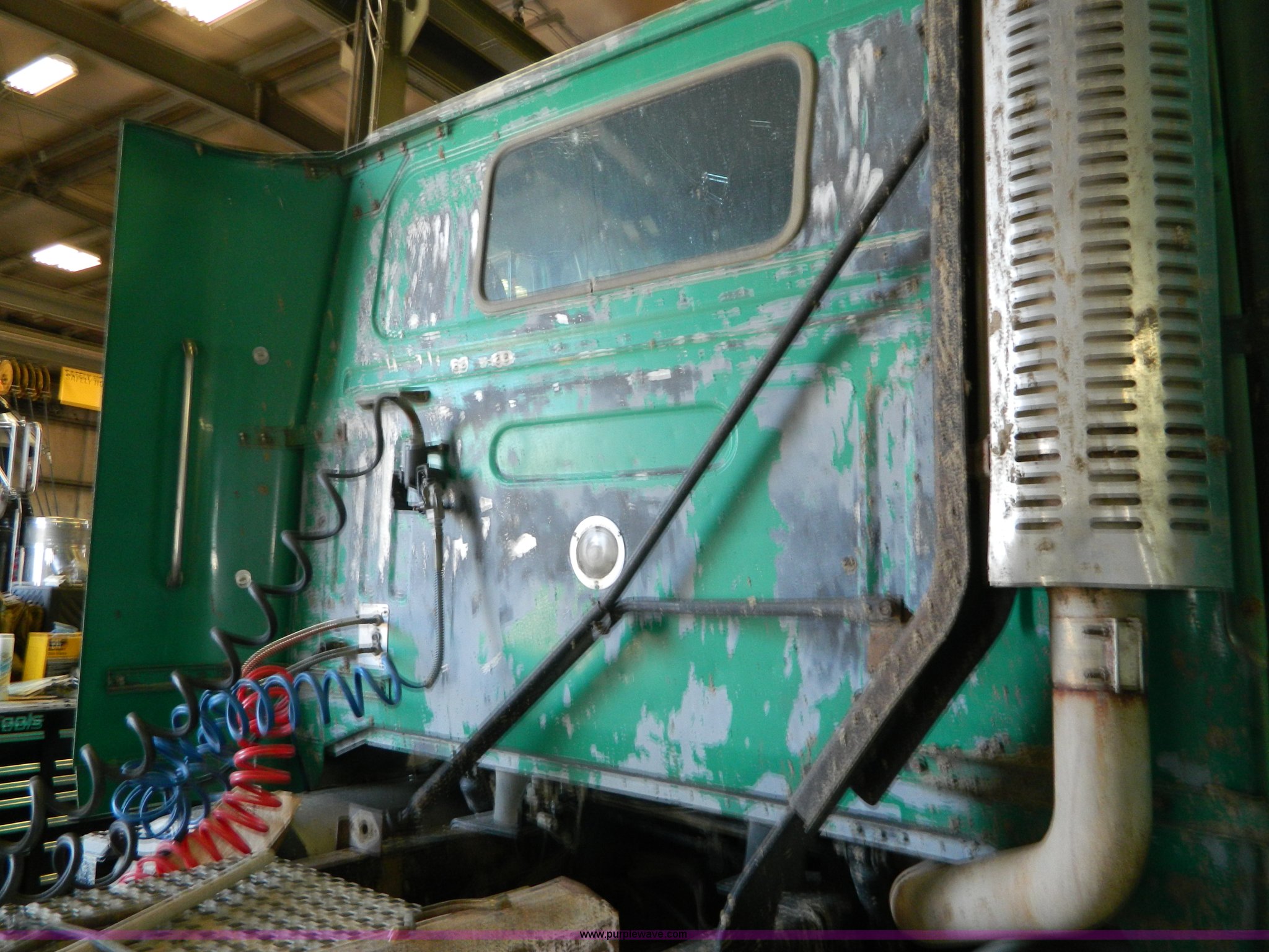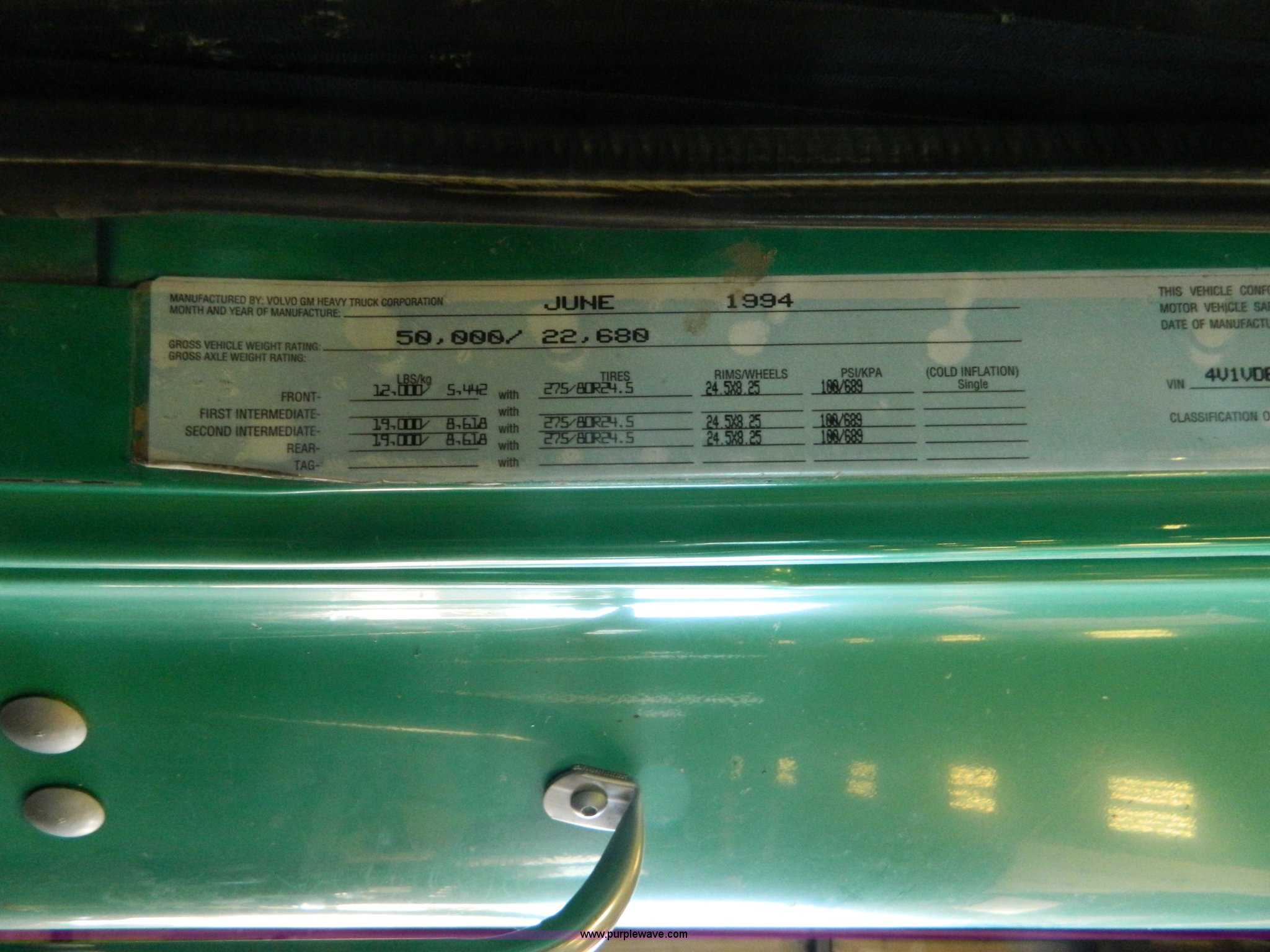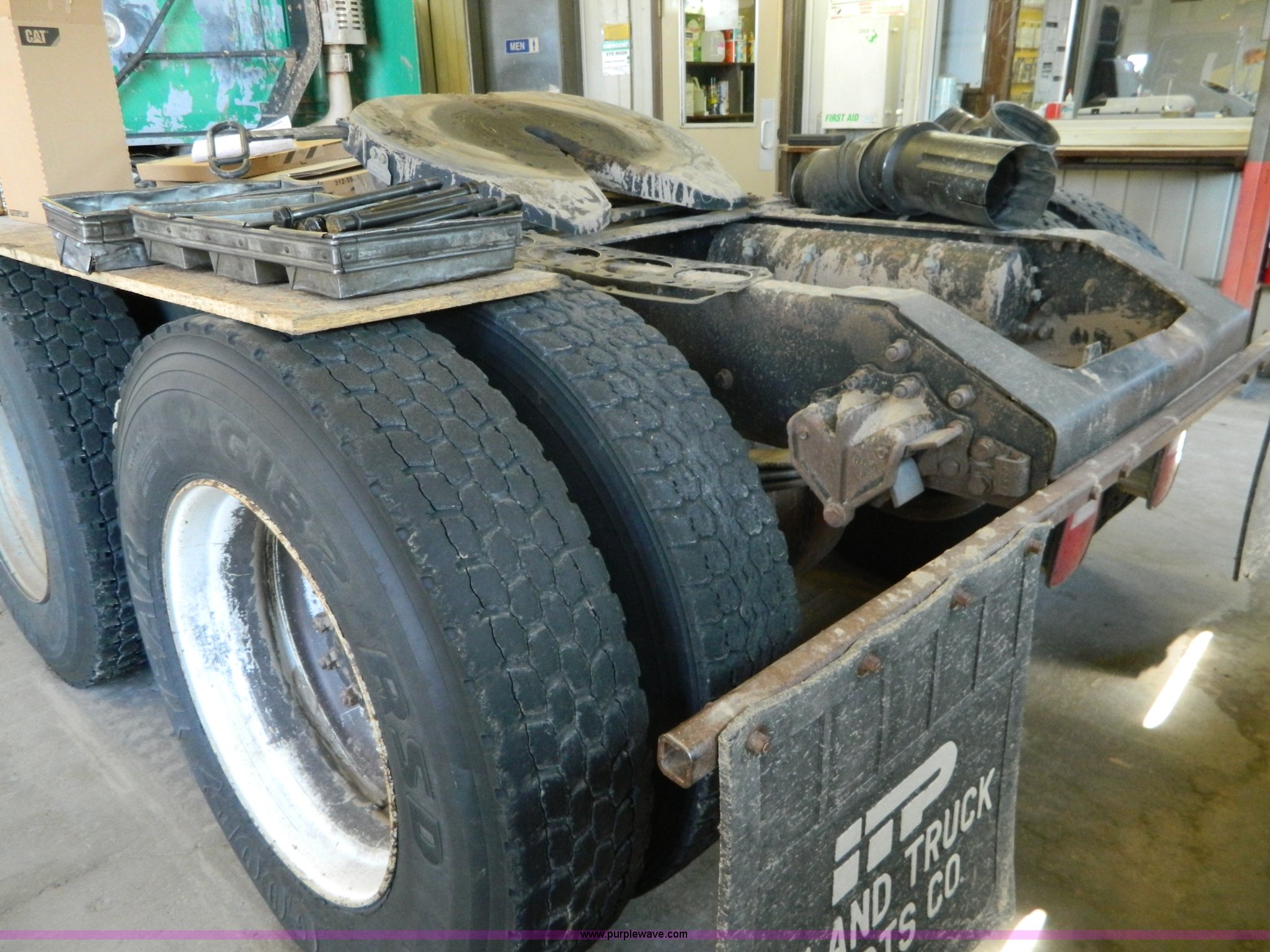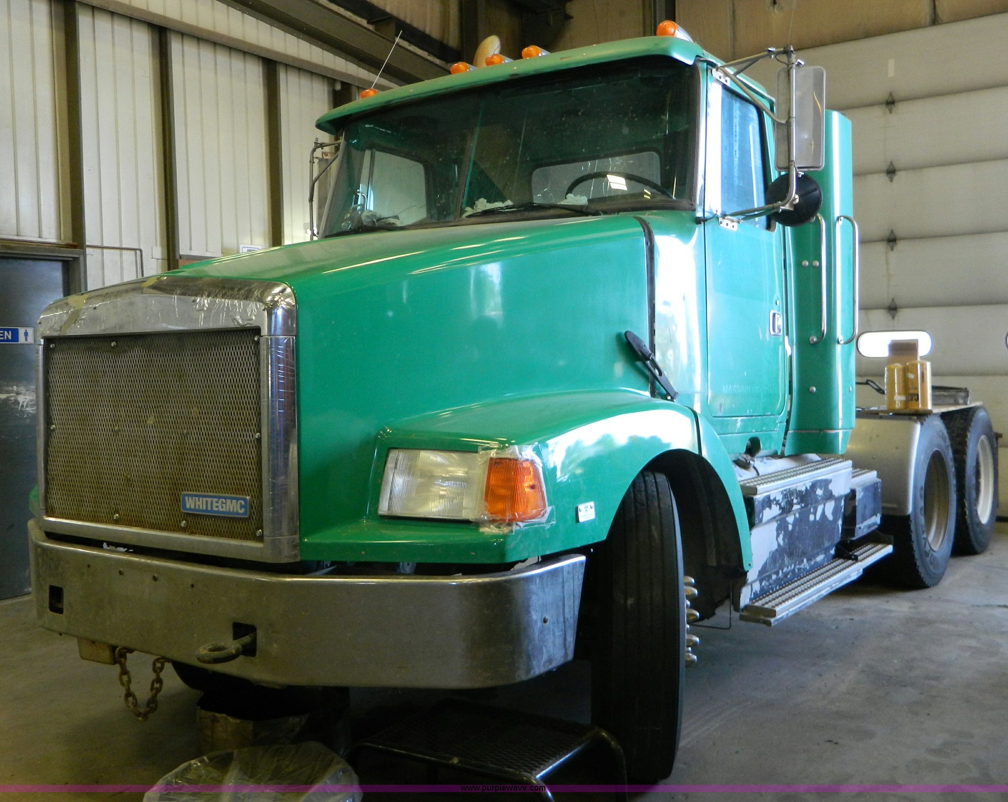 Purple Wave is selling a used Truck Tractor in Kansas. This item is a 1995 Volvo WCA64T semi truck with the following: 113,079 miles on odometer, Odometer replaced at 653,736 miles, Approx 766,815 miles, Caterpillar 3176B 10.3L L6 turbo diesel engine, 325 HP, Eaton Fuller nine speed manual transmission, Tandem axle, Inter-axle differential lock, AC and heat, Cruise, AM/FM/CD, Power and heated mirrors, Air suspension seat, Exterior visor, Single exhaust stack, Aluminum deck plate, Air operated sliding fifth wheel plate, Dual fuel tanks, Quarter fenders, Mud flaps, Spring suspension, Air brakes, 11R24.5 tires, GVWR 50,000 lbs, FAWR 12,000 lbs, IAWR 19,000 lbs, RAWR 19,000 lbs, Cracked windshield, Holes in rear glass, Hood and fifth wheel hitch replaced in 2015, Non-operational unit, Engine disassembled, may need to be overhauled