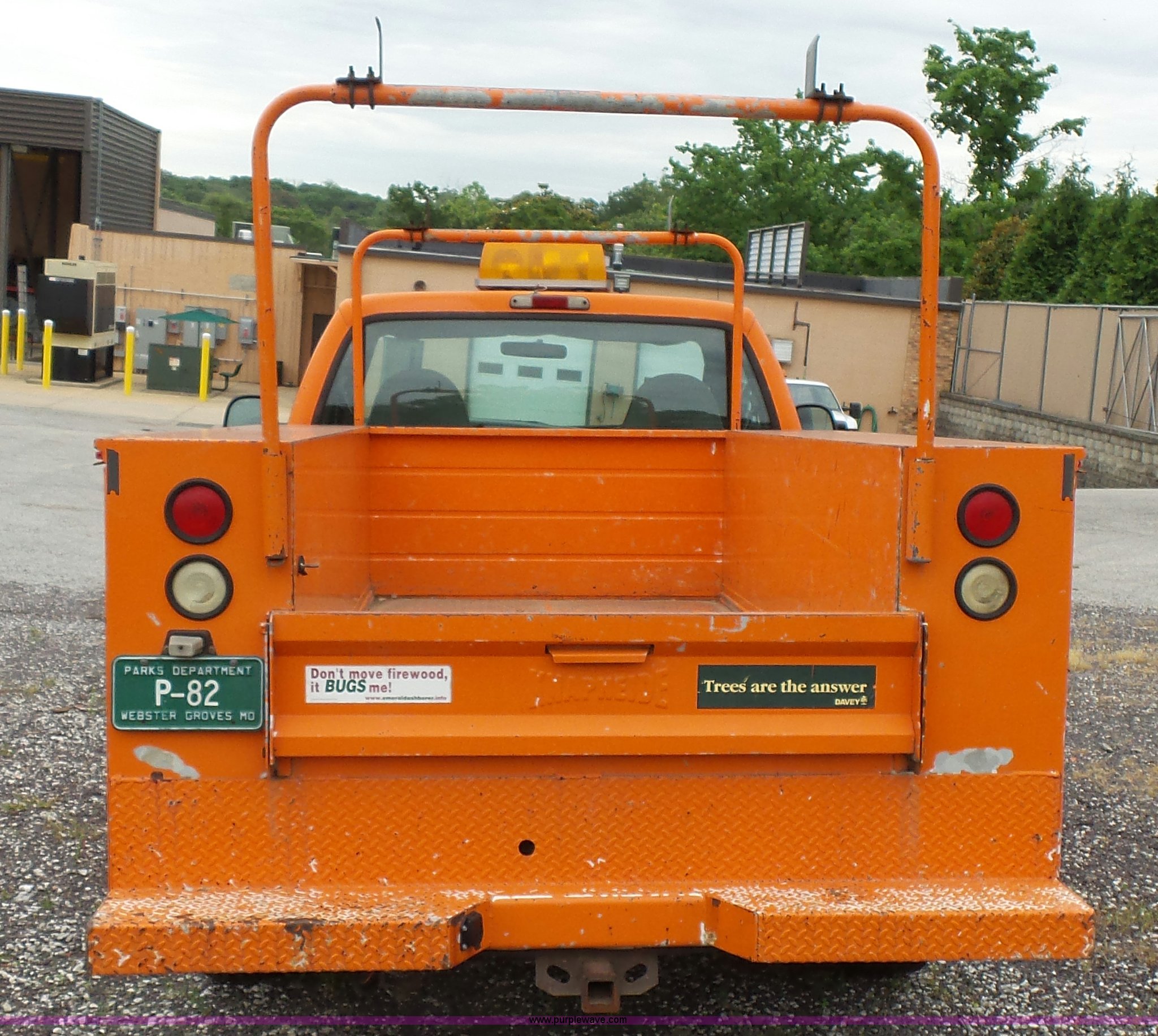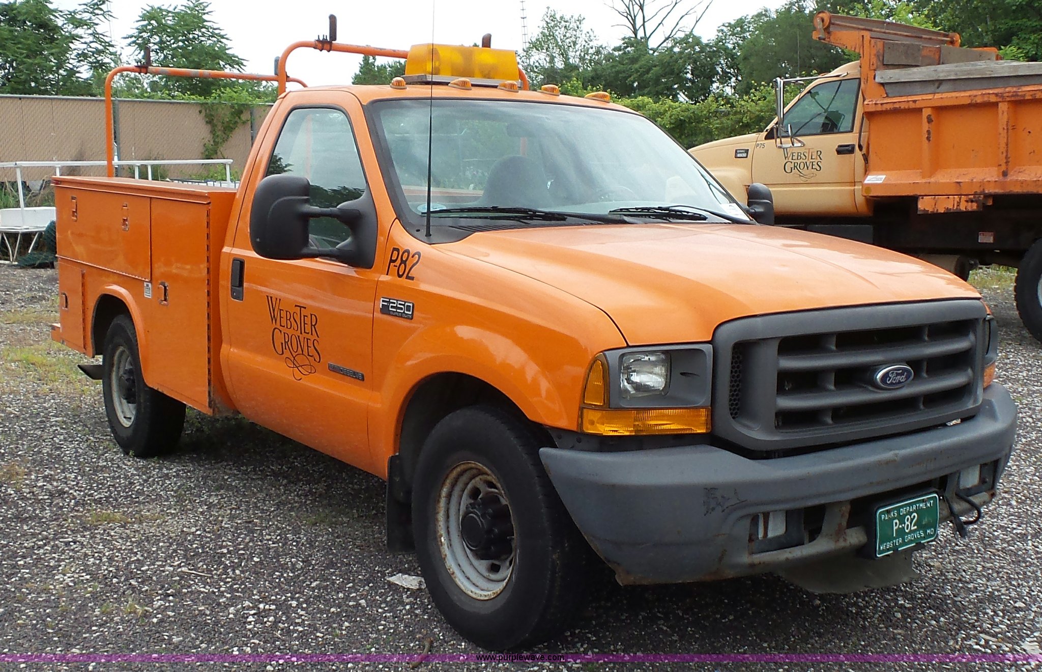 1999 Ford F250 Super Duty utility truck. 65,141 miles on odometer, 7.3L V8 OHV 16V diesel engine, Automatic transmission, AC and heat, AM/FM, Manual windows and locks, Cloth interior, Trailer brake controller, Knapheide utility bed 8.5'L, Ladder rack, Receiver hitch, Trailer wiring, LT235/85R16 tires, Seat torn, Unit# P82. Missouri title. 1FTNF20F7XED38500. City of Webster Groves. 145 Waymire. Webster Groves, MO 63119