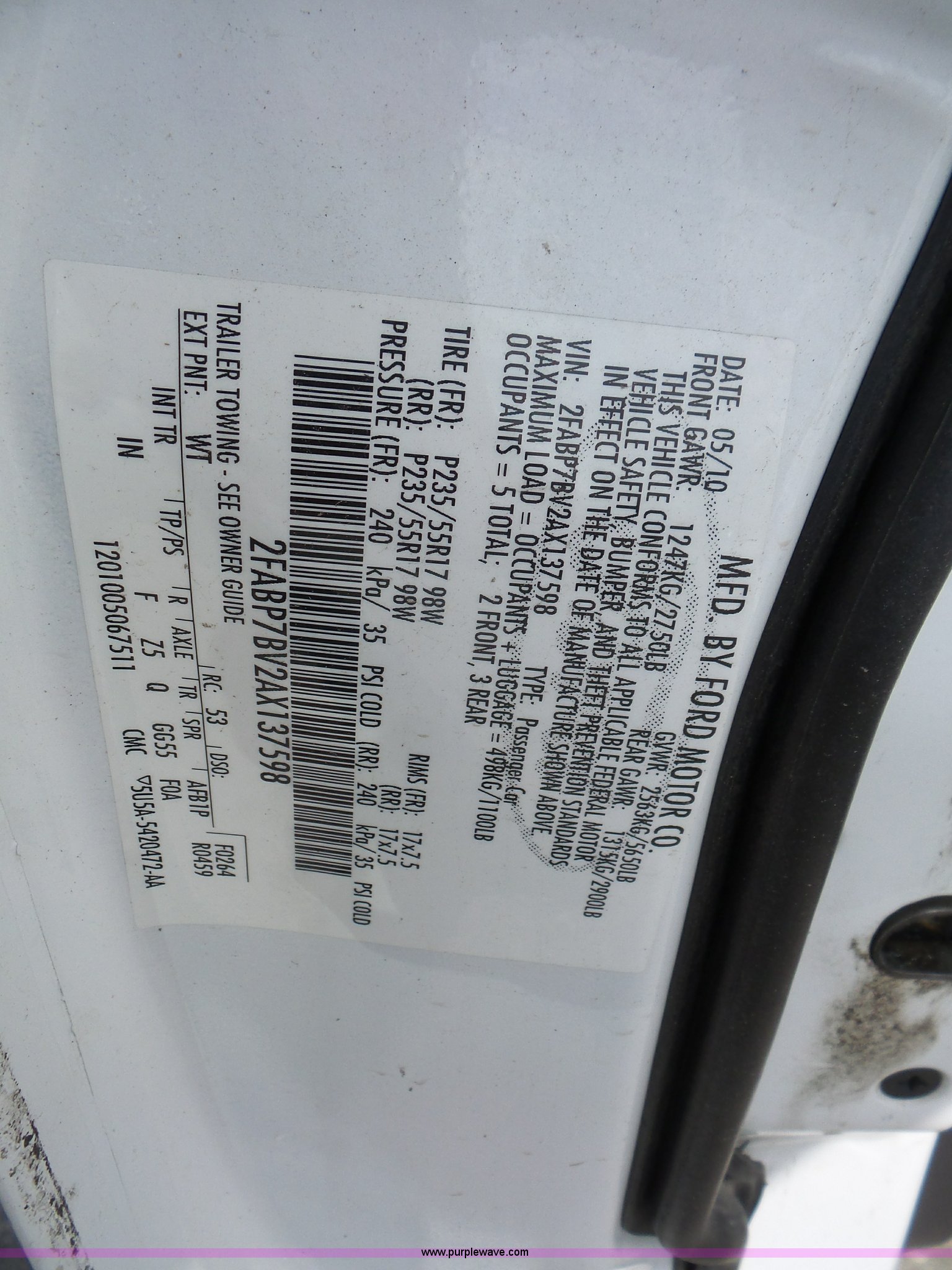 2010 Ford Crown Victoria Police Interceptor. 92,786 miles on odometer, 4.6L V8 SOHC 16V FFV gas engine, Automatic transmission, AC and heat, Tilt, Cruise, AM/FM, Power windows, locks, mirrors, and seat, Cloth interior, 235/55R17 tires, Unit# 074. Kansas title. Seller is a government entity who will be assigning and distributing the title. Please contact the seller for distribution questions. 2FABP7BV2AX137598. City of Lawrence. 1141 Haskell Ave. Lawrence, KS 66044