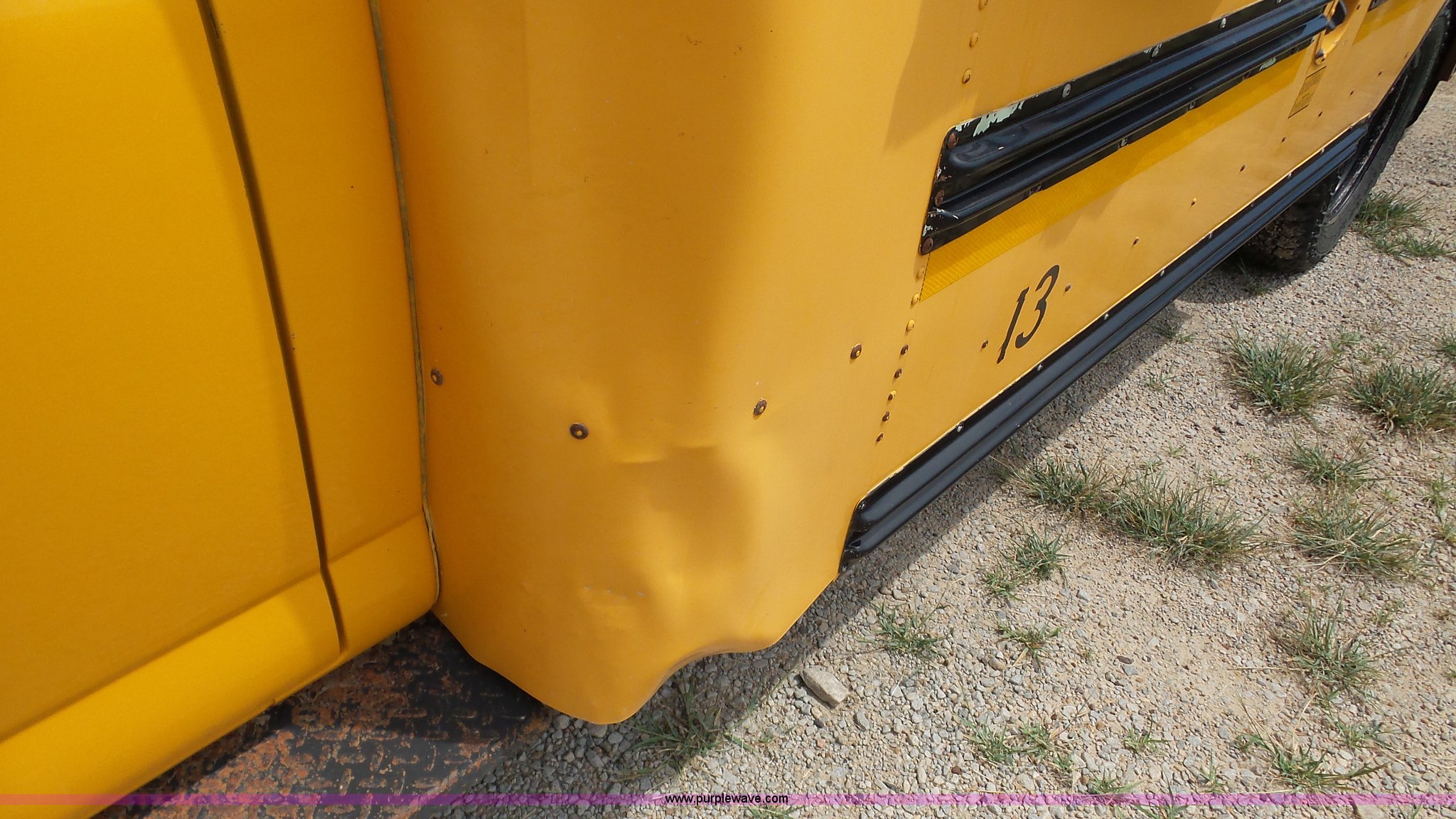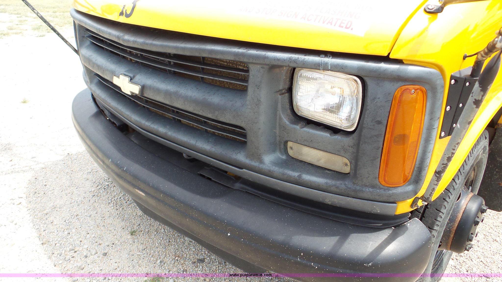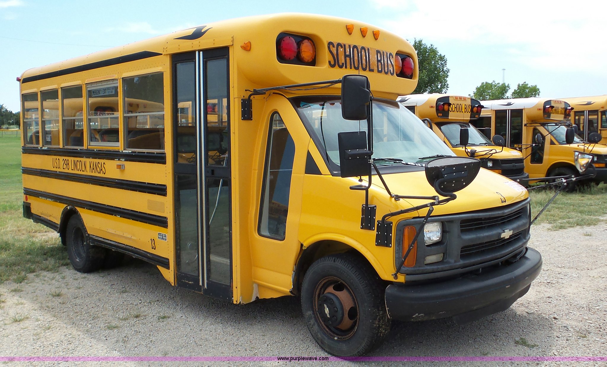 Purple Wave is selling a used Bus in Kansas. This item is a 2000 Chevrolet Express G3500 school bus with the following: 232,494 miles on odometer, 5.7L V8 OHV 16V gas engine, Automatic transmission, Single axle, AC and heat, Non-operational AC, AM/FM, 29 passenger capacity, Ceiling, rear, and side emergency egress, Lighted stop sign, Spring suspension, Hydraulic brakes, 225/75R16 tires, Dead battery, Uses oil, Unit# 13