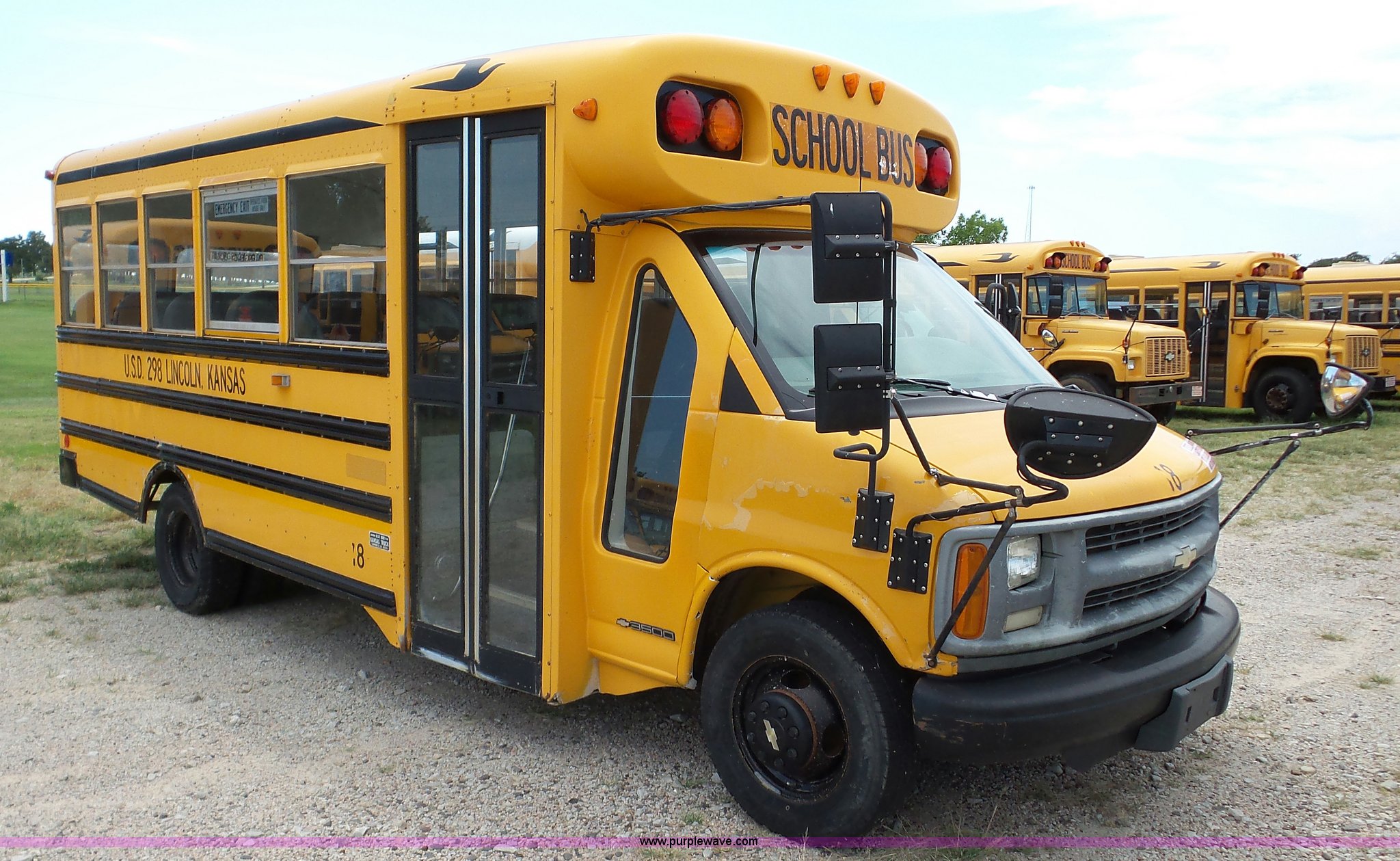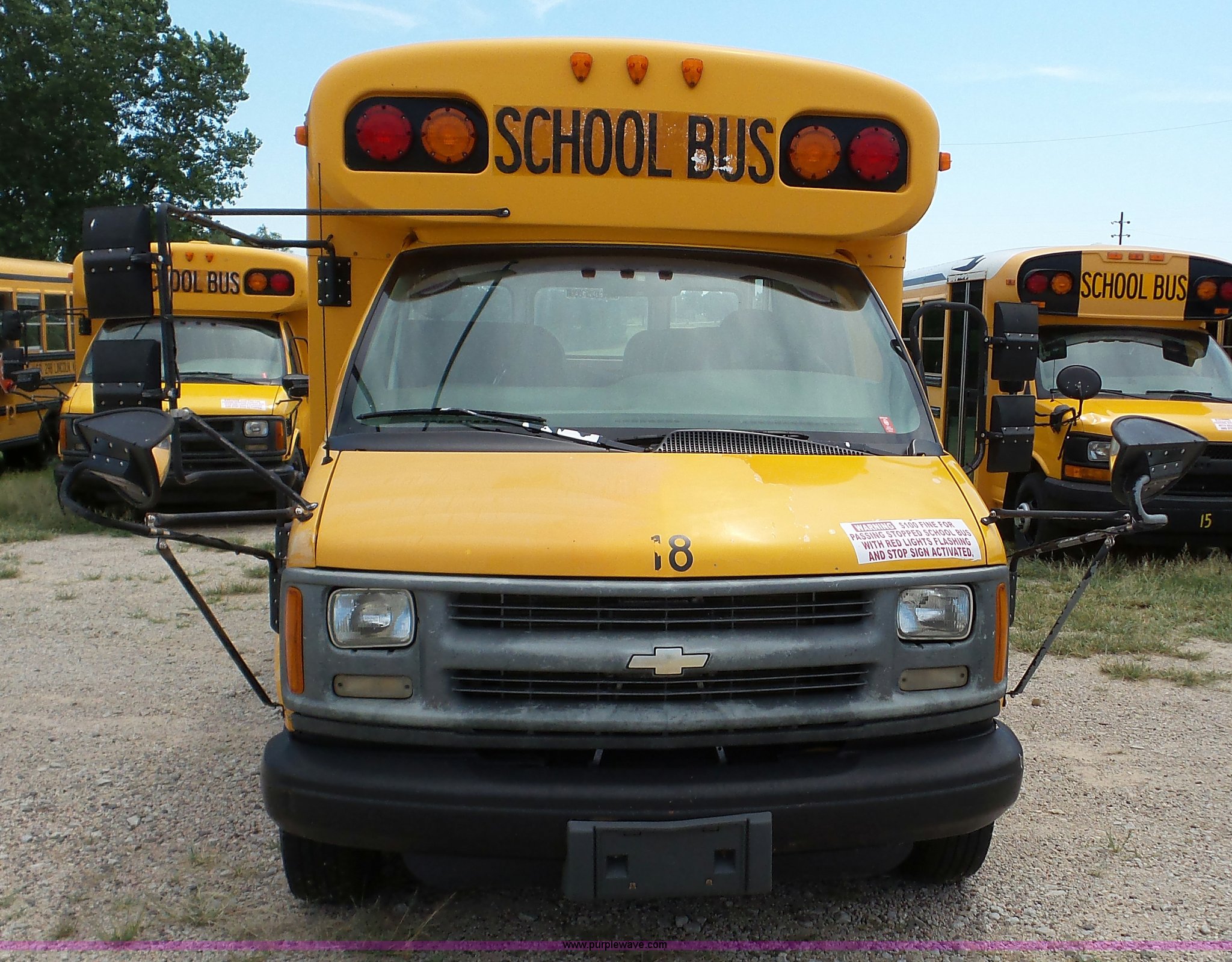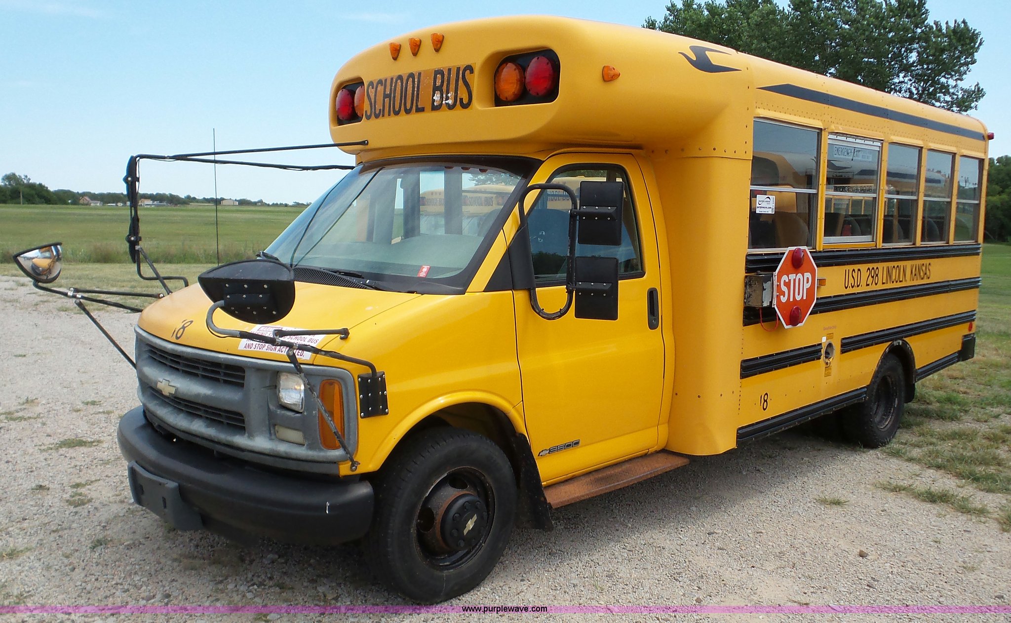 Purple Wave is selling a used Bus in Kansas. This item is a 2000 Chevrolet Express G3500 school bus with the following: 268,276 miles on odometer, 5.7L V8 OHV 16V gas engine, Automatic transmission, Single axle, AC and heat, Non-operational AC, AM/FM, 29 passenger capacity, Lighted stop sign, Spring suspension, Hydraulic brakes, 225/75R16 tires, Weak battery, Unit# 18
