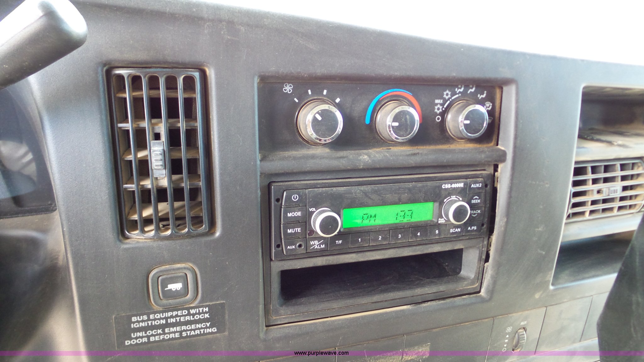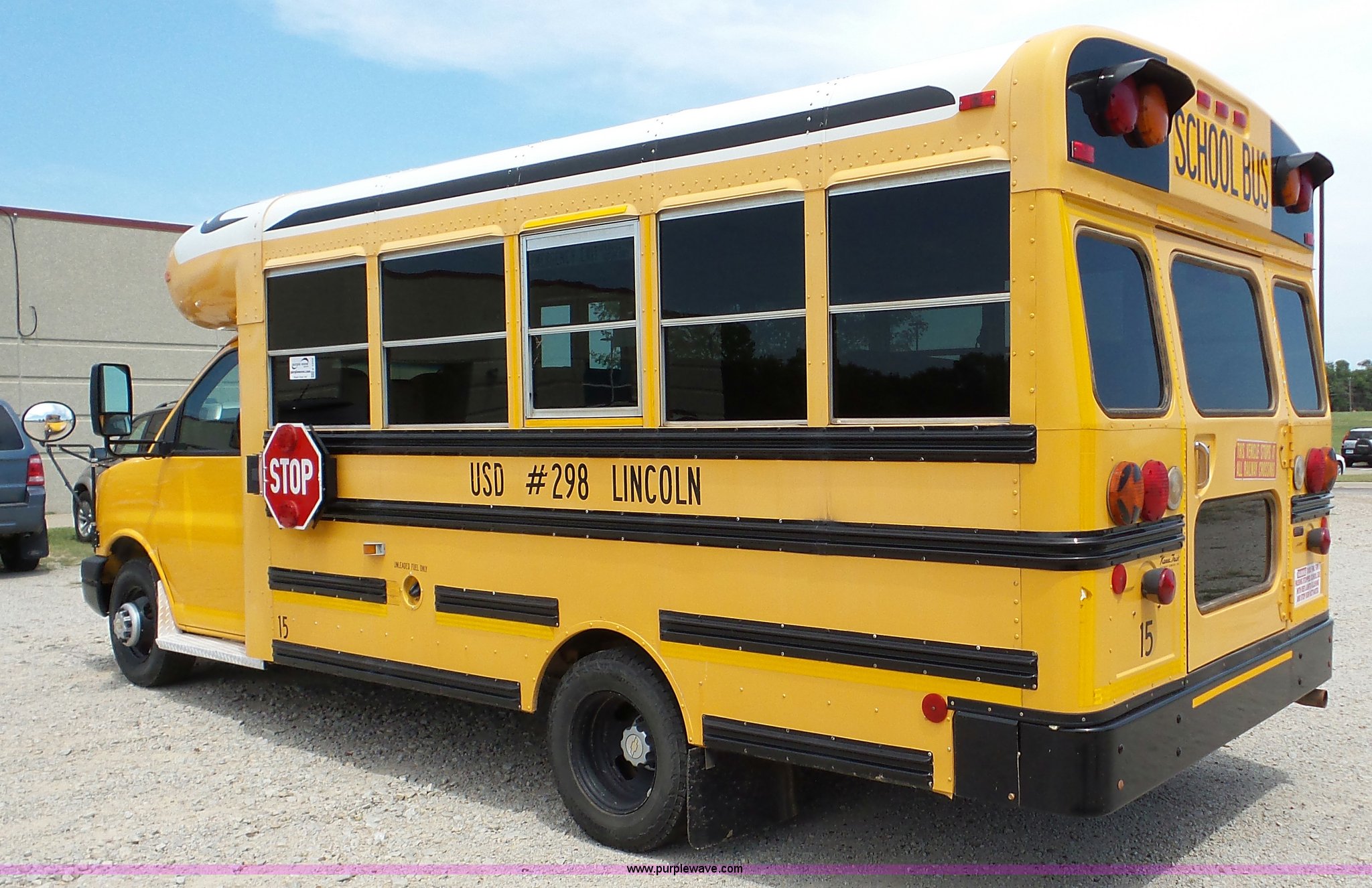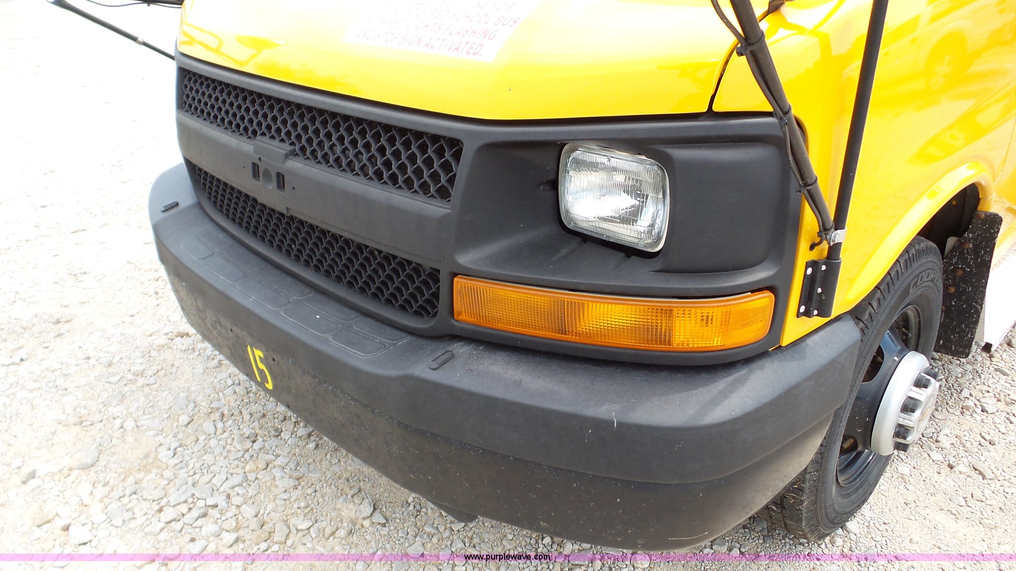 Purple Wave is selling a used Bus in Kansas. This item is a 2009 Chevrolet Express 3500 Cargo school bus with the following: 148,046 miles on odometer, 6.0L V8 OHV 16V gas engine, Automatic transmission, Single axle, AC and heat, AM/FM, 29 passenger capacity, Lighted stop sign, Spring suspension, Hydraulic brakes, 225/75R16 tires, Rust, Weak battery, Unit# 15