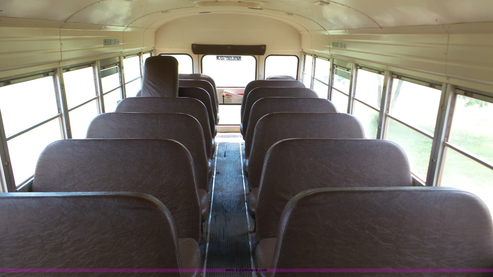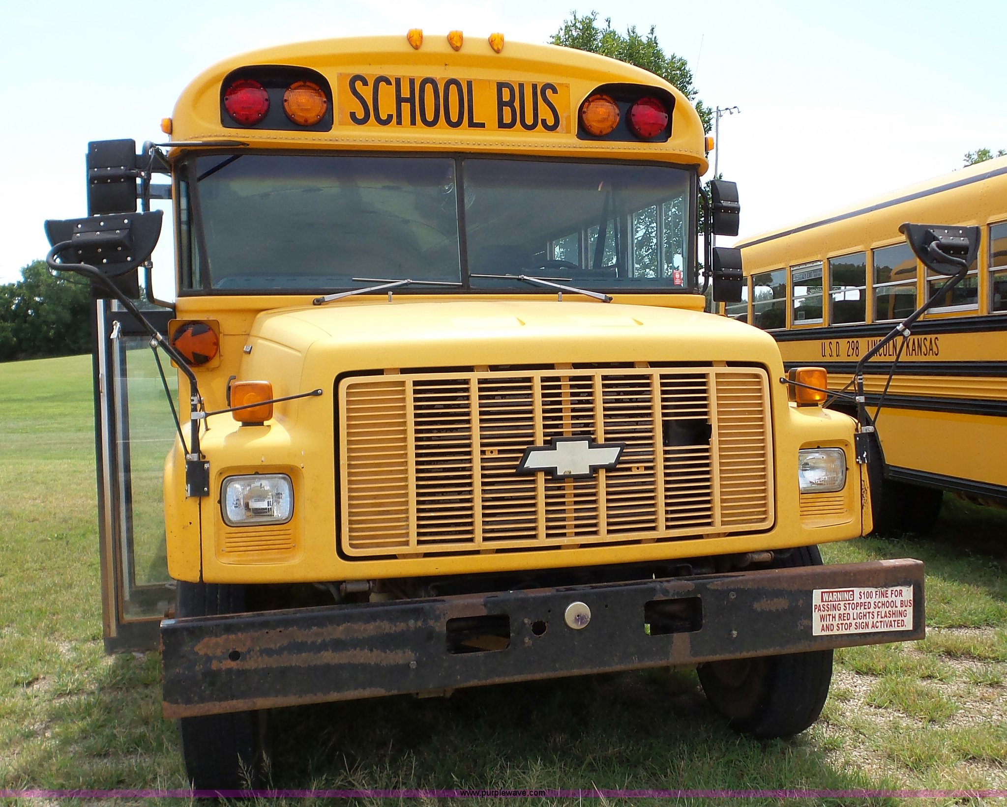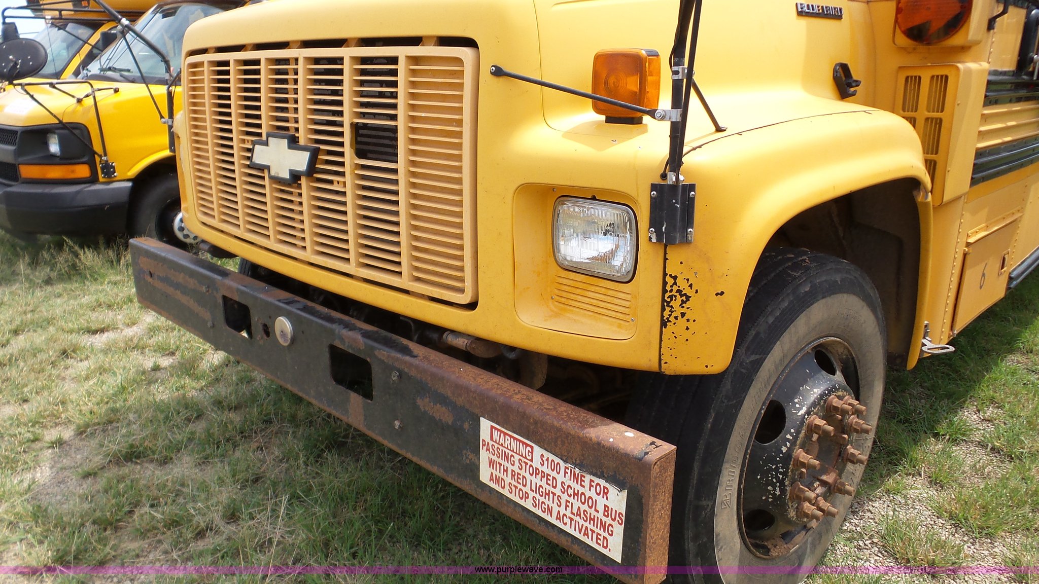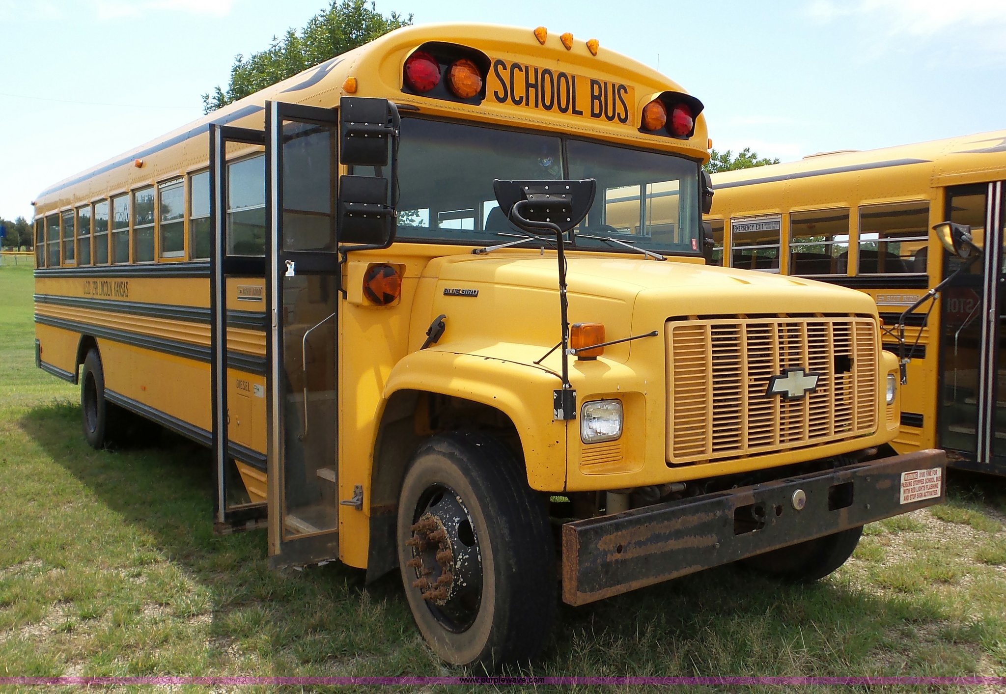 Purple Wave is selling a used Bus in Kansas. This item is a 1998 Chevrolet B7 school bus with the following: 119,769 miles on odometer, Caterpillar 3116 6.6L six cylinder diesel engine, Automatic transmission, Single axle, Heat, AM/FM, 59 passenger capacity, Ceiling, rear, and side emergency egress, Lighted stop sign, Spring suspension, Hydraulic brakes, 242" wheelbase, 10R22.5 tires, GVWR 27,060 lbs, Weak battery, Soft spots in floor, Front and rear door seals may need replaced, Unit# 6