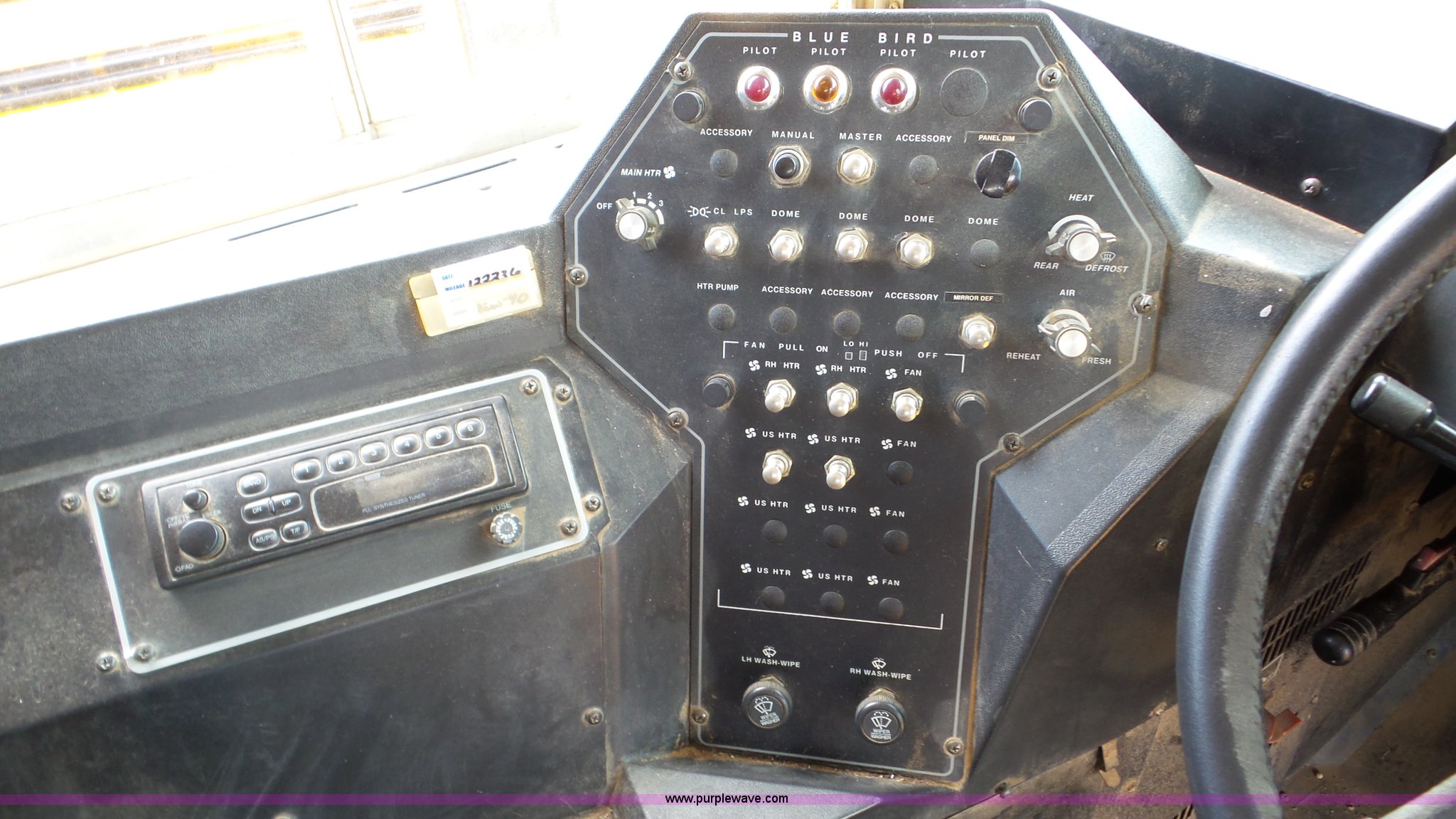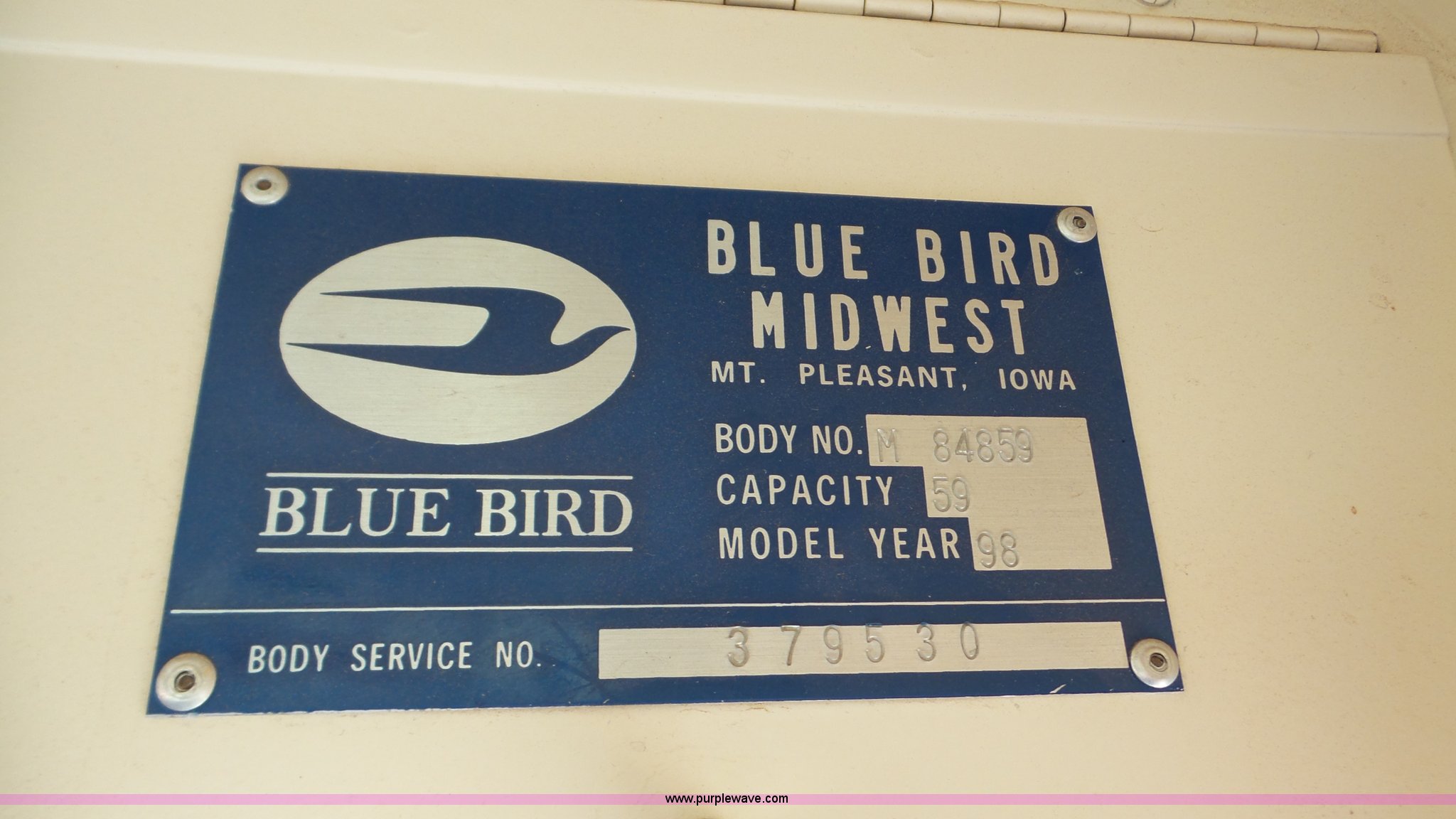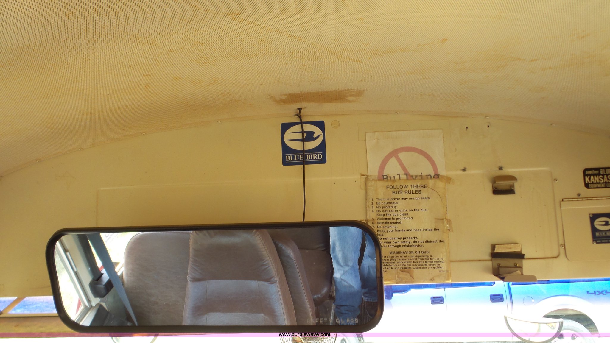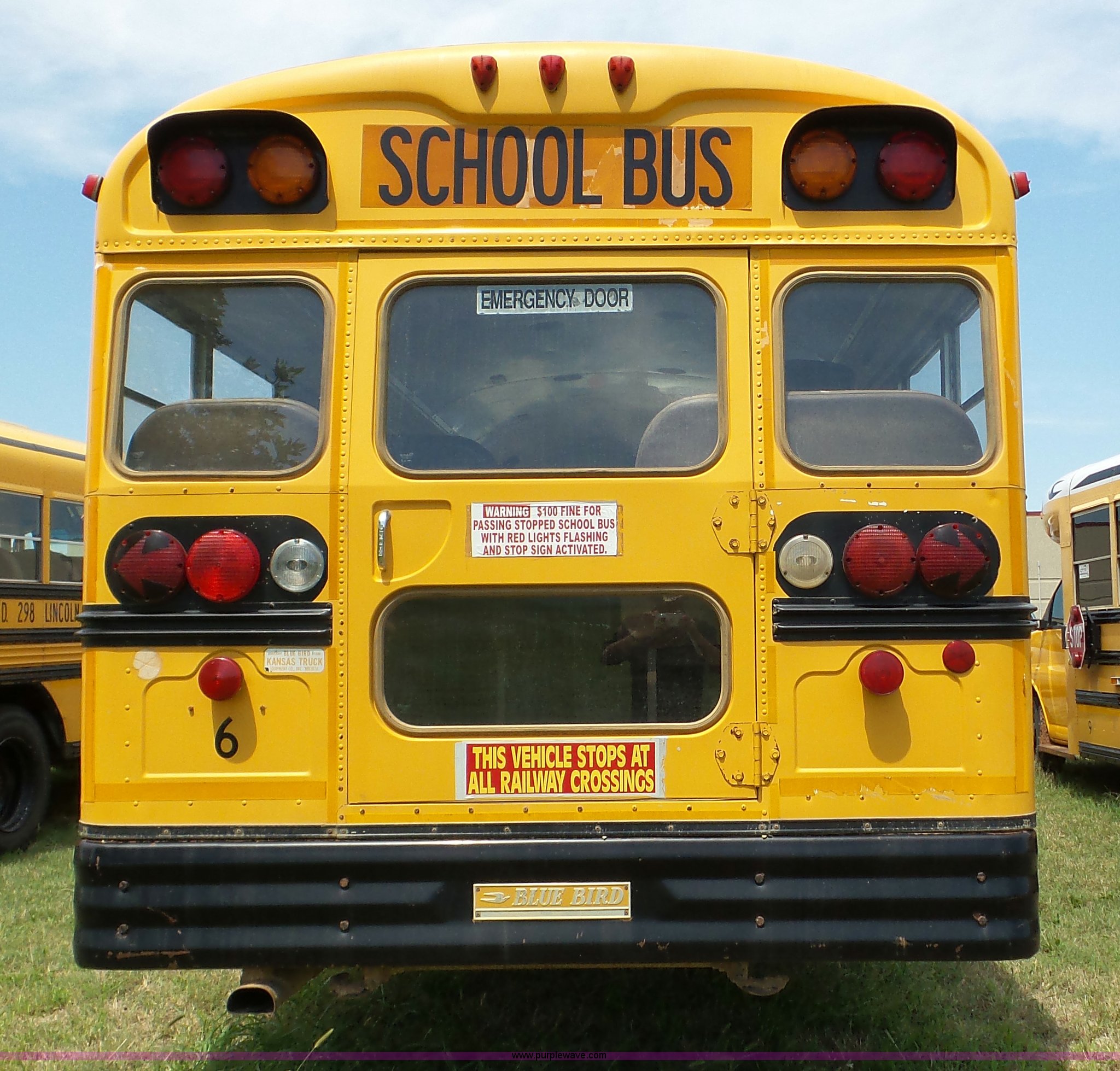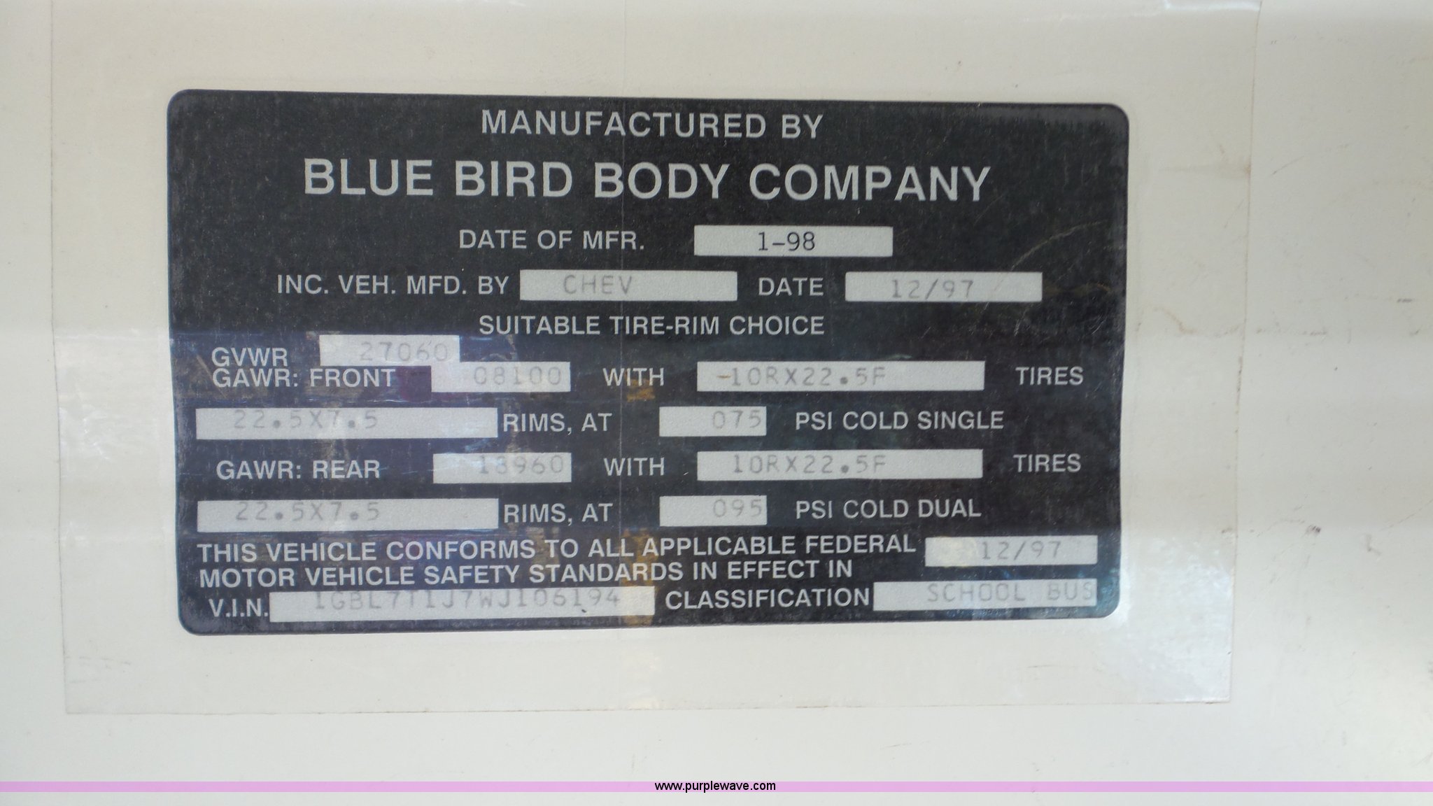 Purple Wave is selling a used Bus in Kansas. This item is a 1998 Chevrolet B7 school bus with the following: 119,769 miles on odometer, Caterpillar 3116 6.6L six cylinder diesel engine, Automatic transmission, Single axle, Heat, AM/FM, 59 passenger capacity, Ceiling, rear, and side emergency egress, Lighted stop sign, Spring suspension, Hydraulic brakes, 242" wheelbase, 10R22.5 tires, GVWR 27,060 lbs, Weak battery, Soft spots in floor, Front and rear door seals may need replaced, Unit# 6