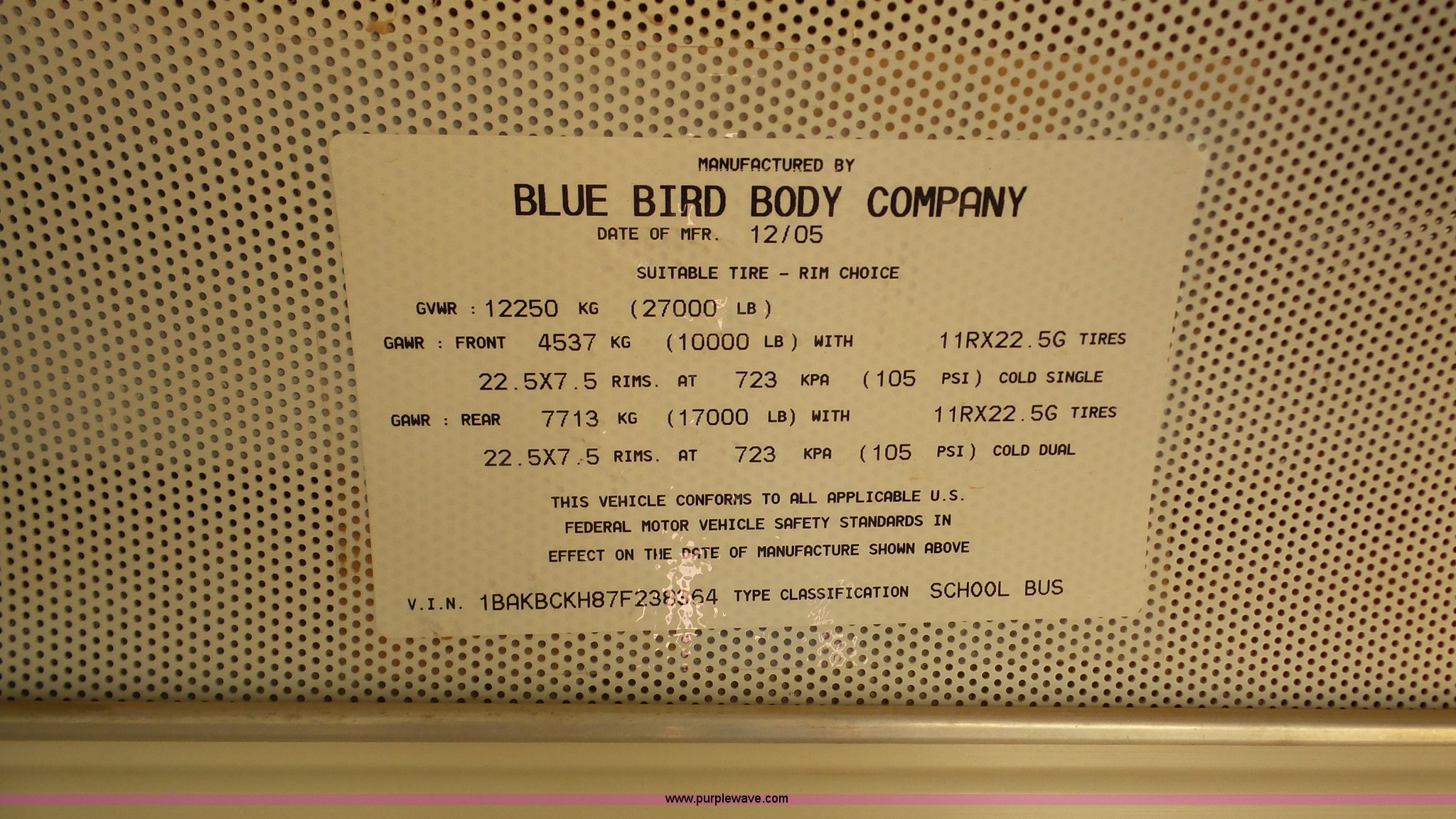 Purple Wave is selling a used Bus in Kansas. This item is a 2007 Blue Bird Vision school bus with the following: 179,237 miles on odometer, 6,625 hours on meter, Caterpillar C7 7.2L L6 diesel engine, Automatic transmission, Single axle, Heat, AM/FM, Air suspension seat, 42 passenger capacity, Ceiling, rear, and side emergency egress, Spring suspension, Hydraulic brakes, 192" wheelbase, 11R22.5 tires, GVWR 12,250 lbs, Weak battery, Unit# 5