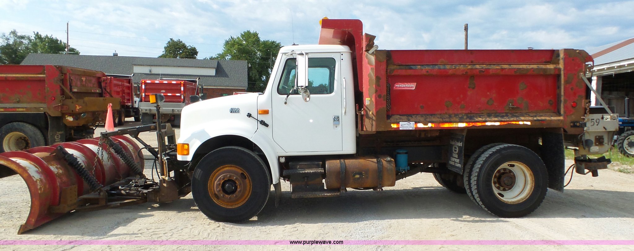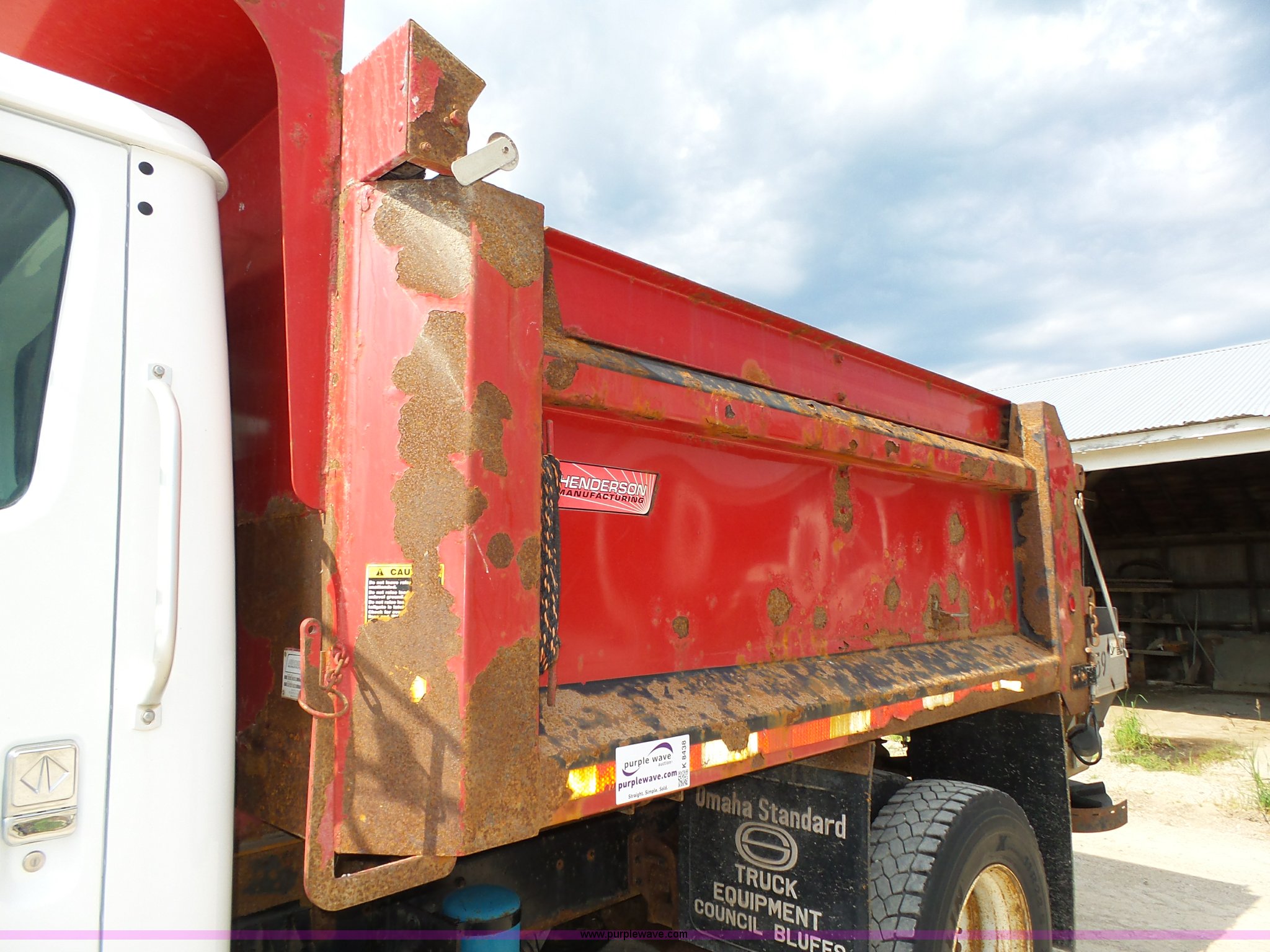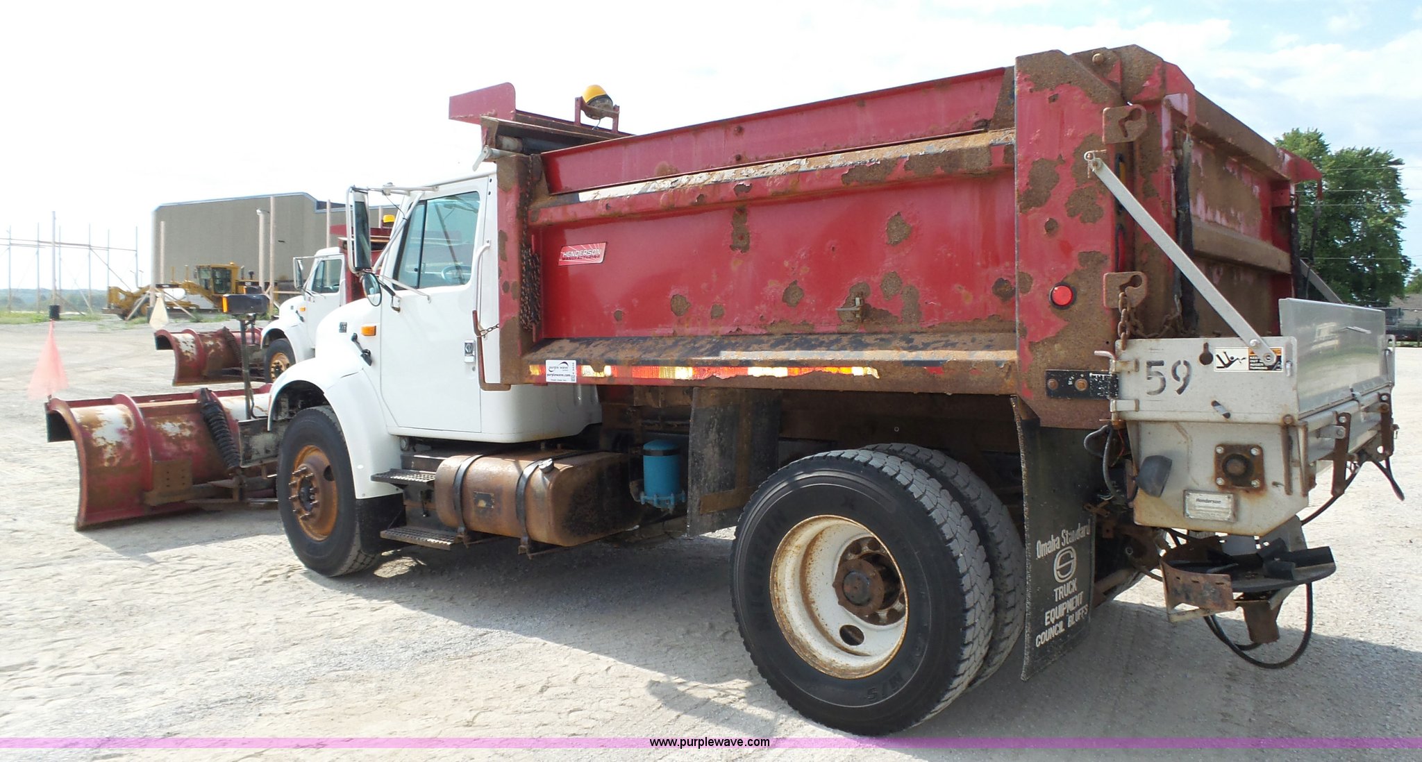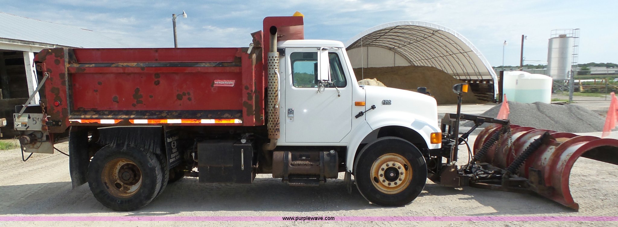 Purple Wave is selling a used Construction Dump Truck in Iowa. This item is a 2001 International 4700 dump truck with the following: 96,509 miles on odometer, International T444E 7.3L V8 turbo diesel engine, Automatic transmission, Single axle, AC and heat, Cruise, AM/FM/weatherband, Heated mirrors, Air suspension seat, Vinyl seats, Block heater, Beacon lights, Component Technology MS203 control panel, Plow and spreader controls, Single rear exhaust stack, Hydraulic reservoir, PTO, Henderson 10x30xUB steel dump bed, 10'L x 96"W, 30" side height, 8" side board height, Single ram hoist, Manual end gate, Serial HDSA-10765, Henderson plow hitch, Model 82435, Serial HT-00684, Henderson 11x36x15 plow, 11'W, Serial RSP-00873, Henderson 96x9xDDx034SS spreader, Front and rear tow hooks, Dual fuel tanks, Spring suspension, Air brakes, 152" wheelbase, 11R22.5 tires, GVWR 35,000 lbs, FAWR 12,000 lbs, RAWR 23,000 lbs, Engine manual, Unit# 81