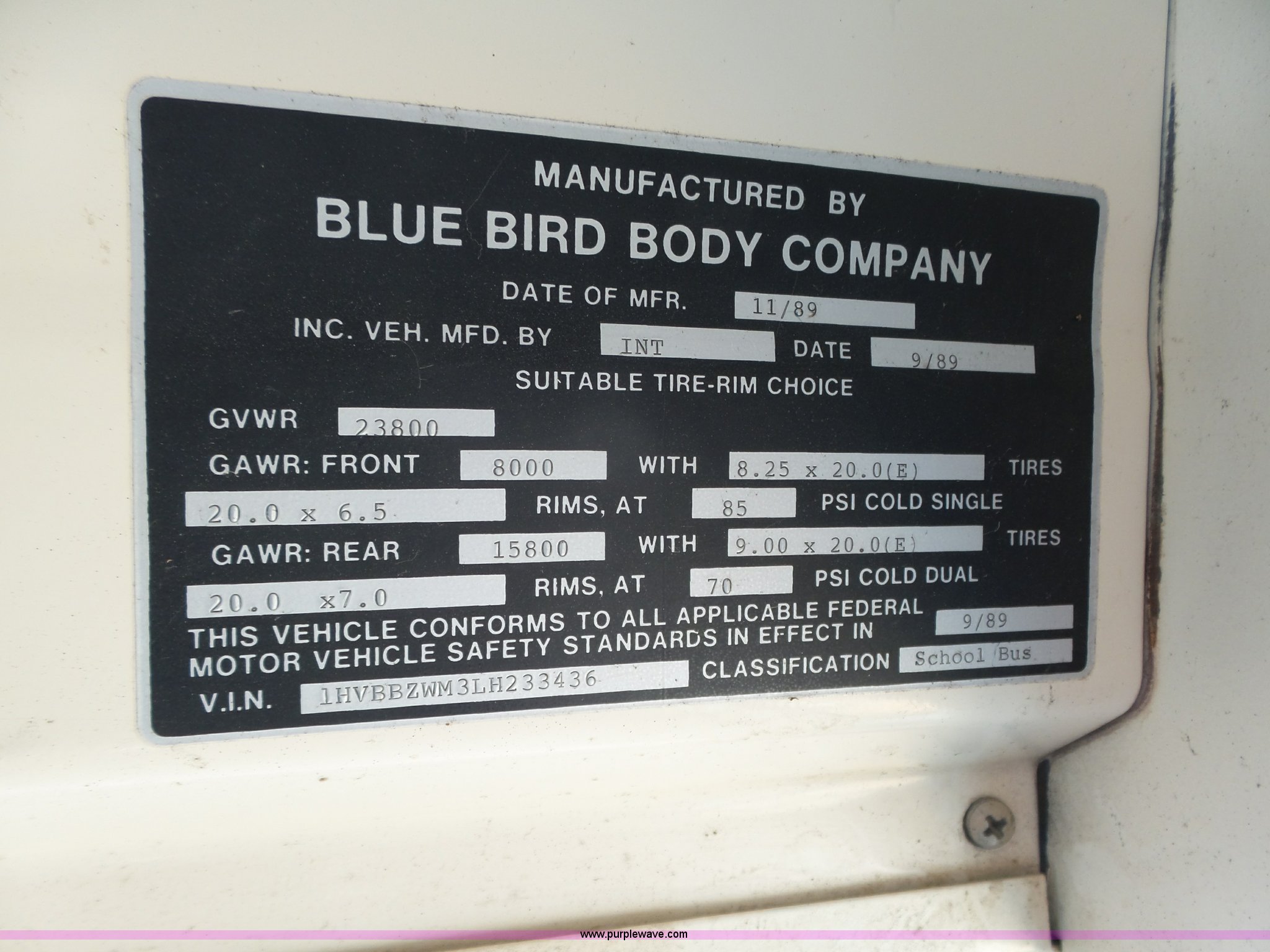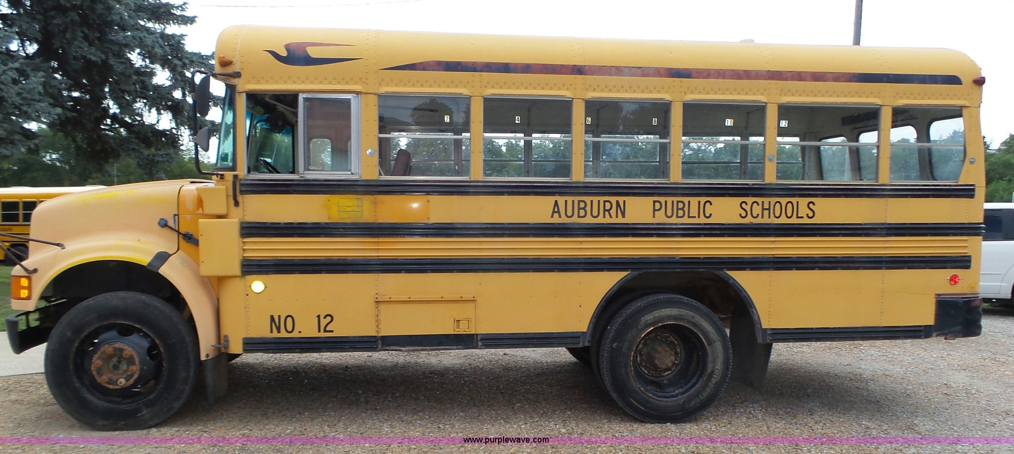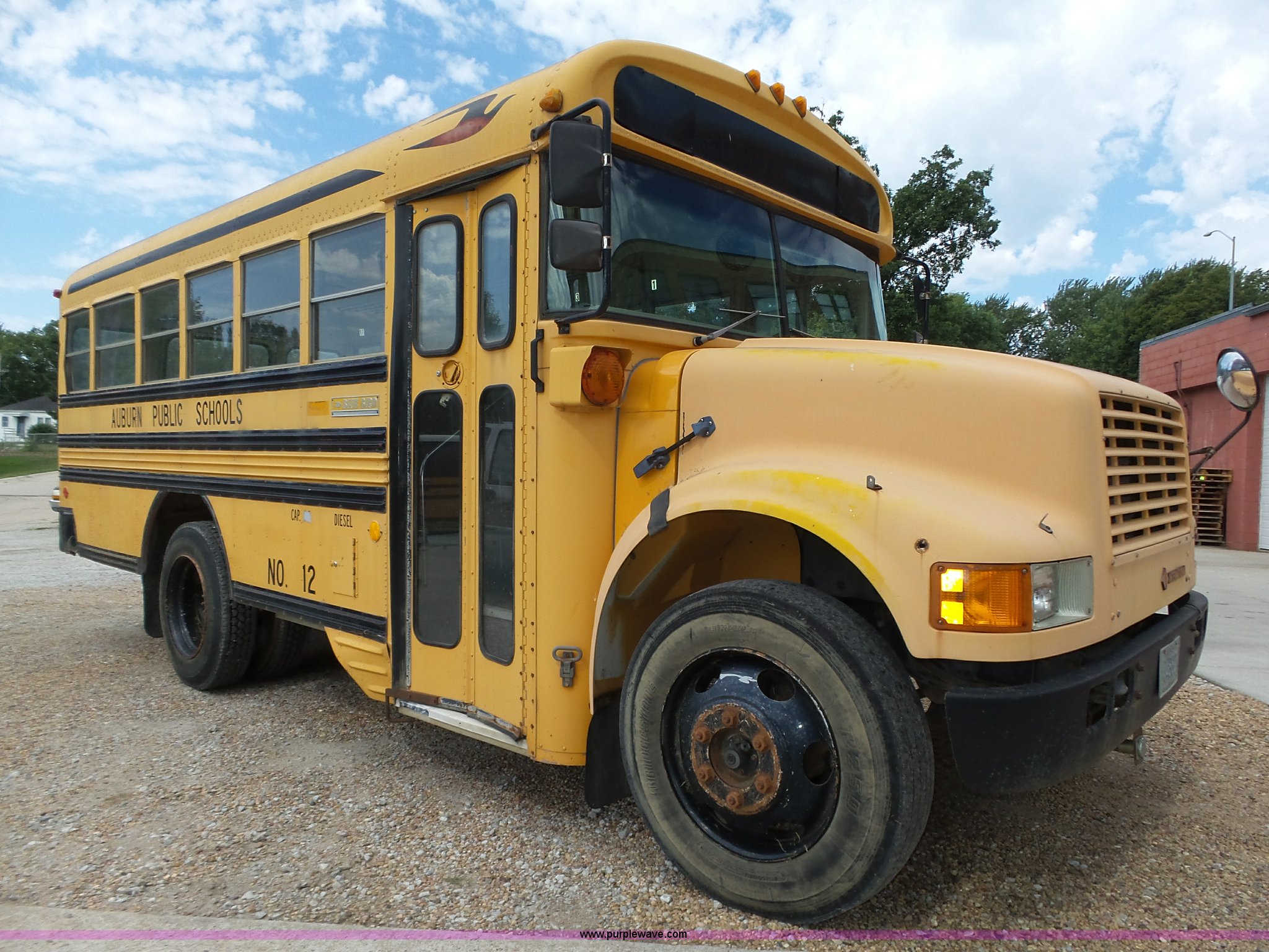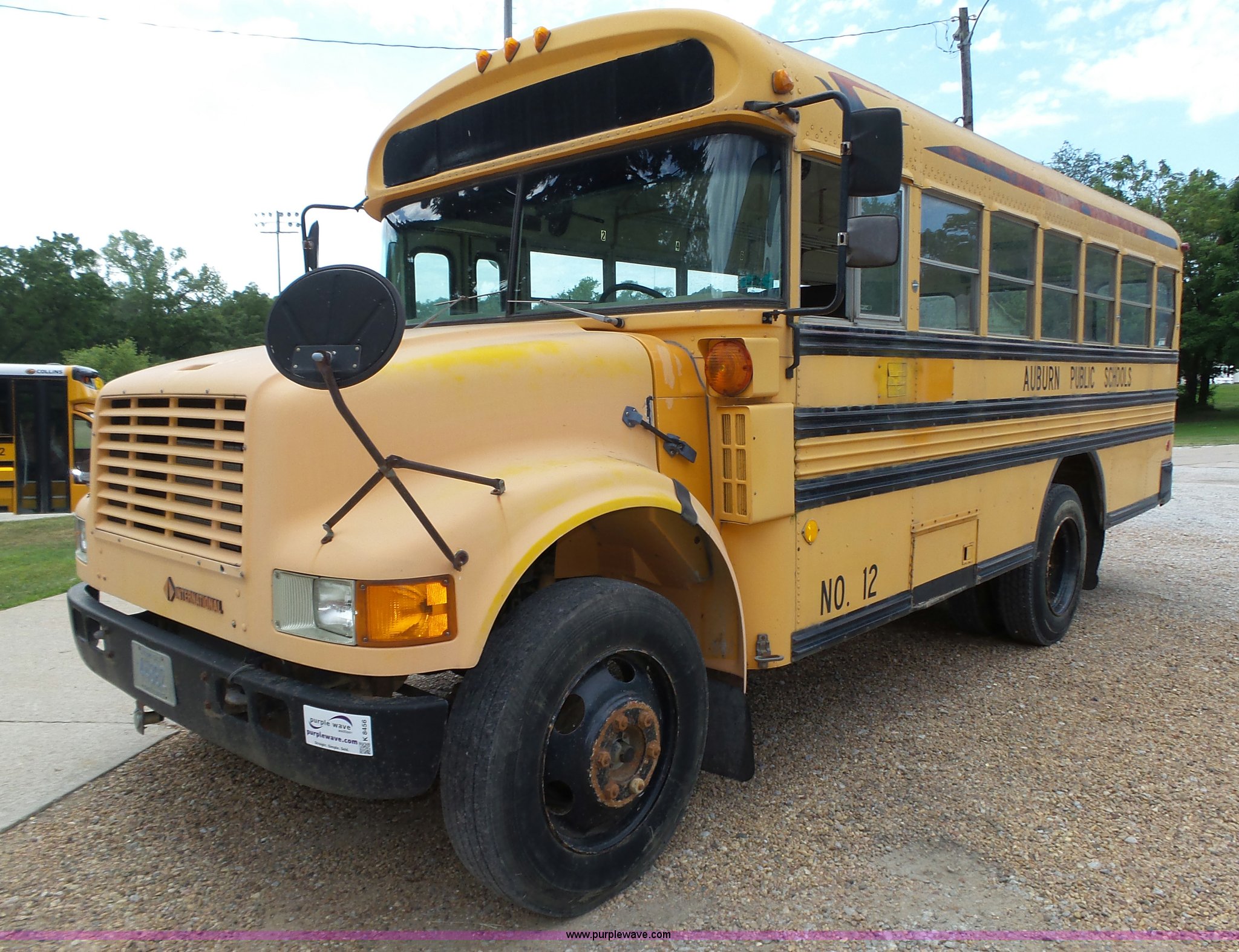 Purple Wave is selling a used Bus in Nebraska. This item is a 1990 International 3800 school bus with the following: 50,275 miles on odometer, International B170F 5.9L L6 turbo diesel engine, Allison A750 automatic transmission, Single axle, Heat, Fan, Suspension seat, Overhead storage, First aid kits, Block heater, Blue Bird body, No. M49075, Service no. 346676, Rear emergency egress, Front and rear tow hooks, Spring suspension, Hydraulic brakes, 152" wheelbase, Bridgestone 9R22.5 tires, GVWR 23,800 lbs, FAWR 8,000 lbs, RAWR 15,800 lbs, One owner, Additional mirrors included, No seats, Unit# 12