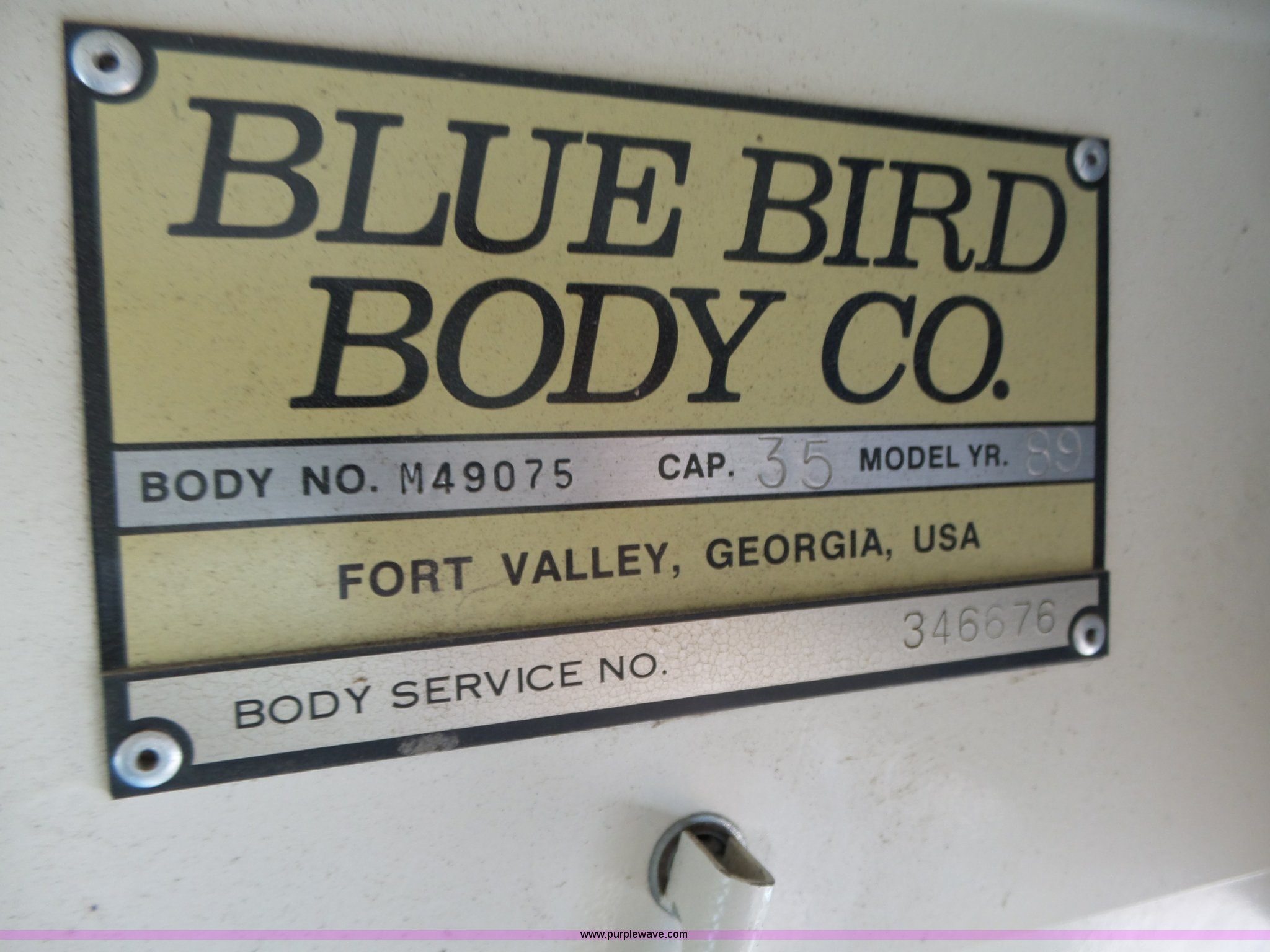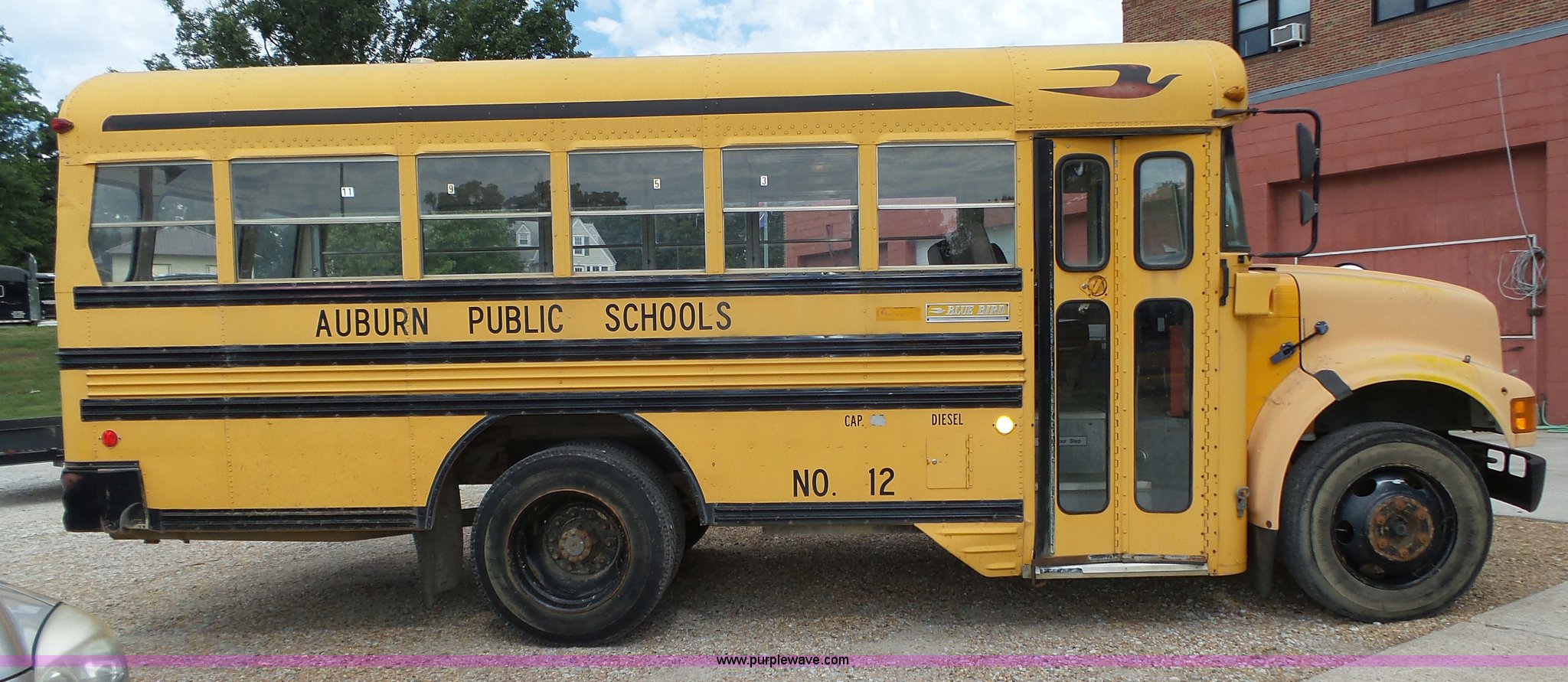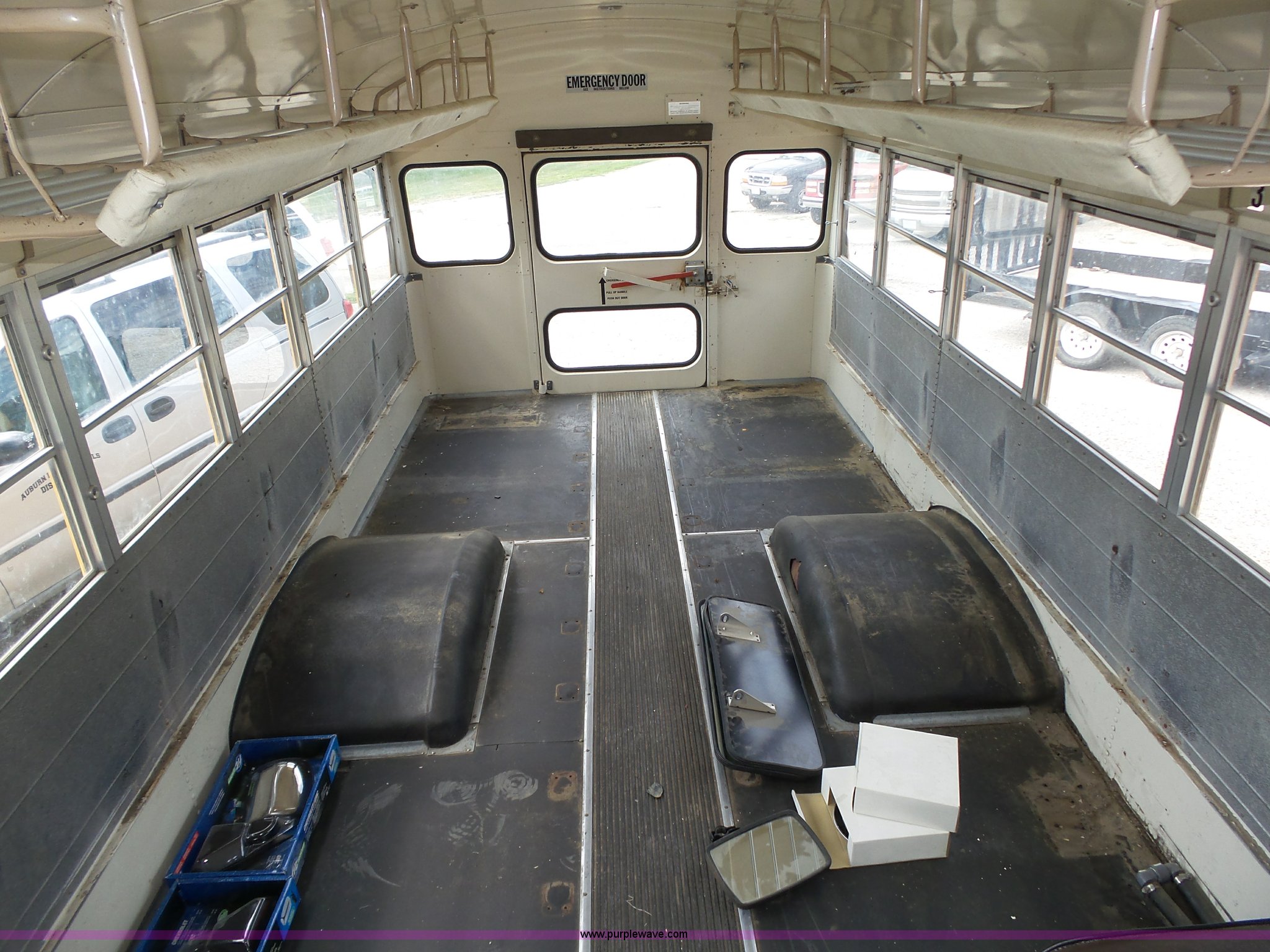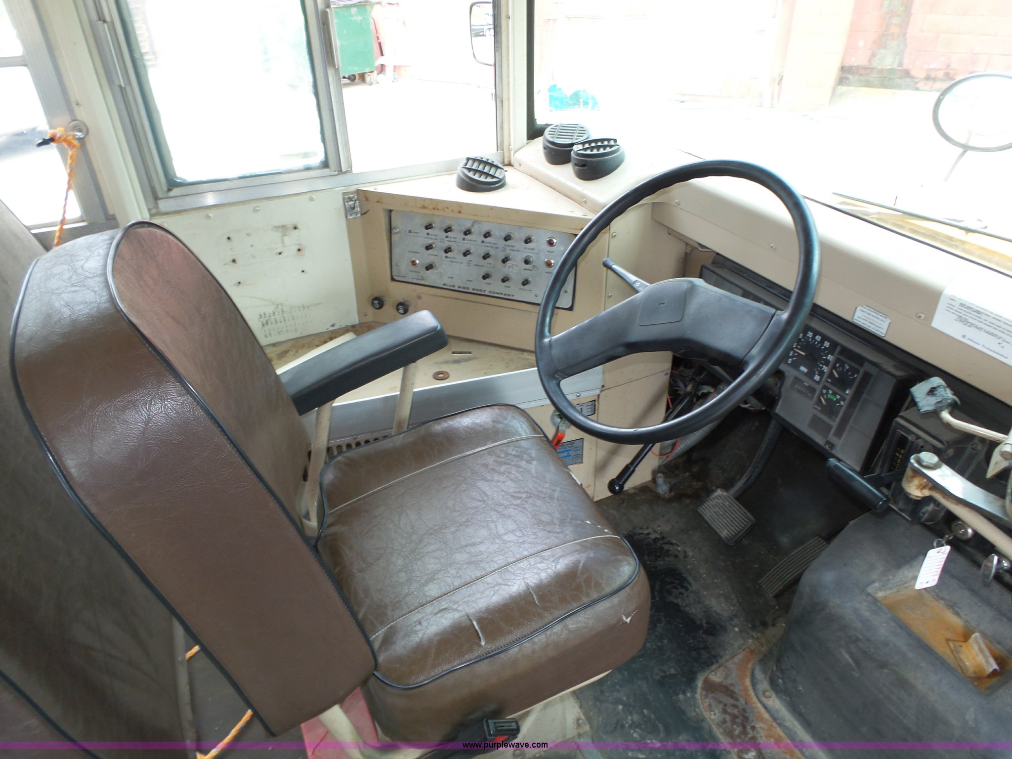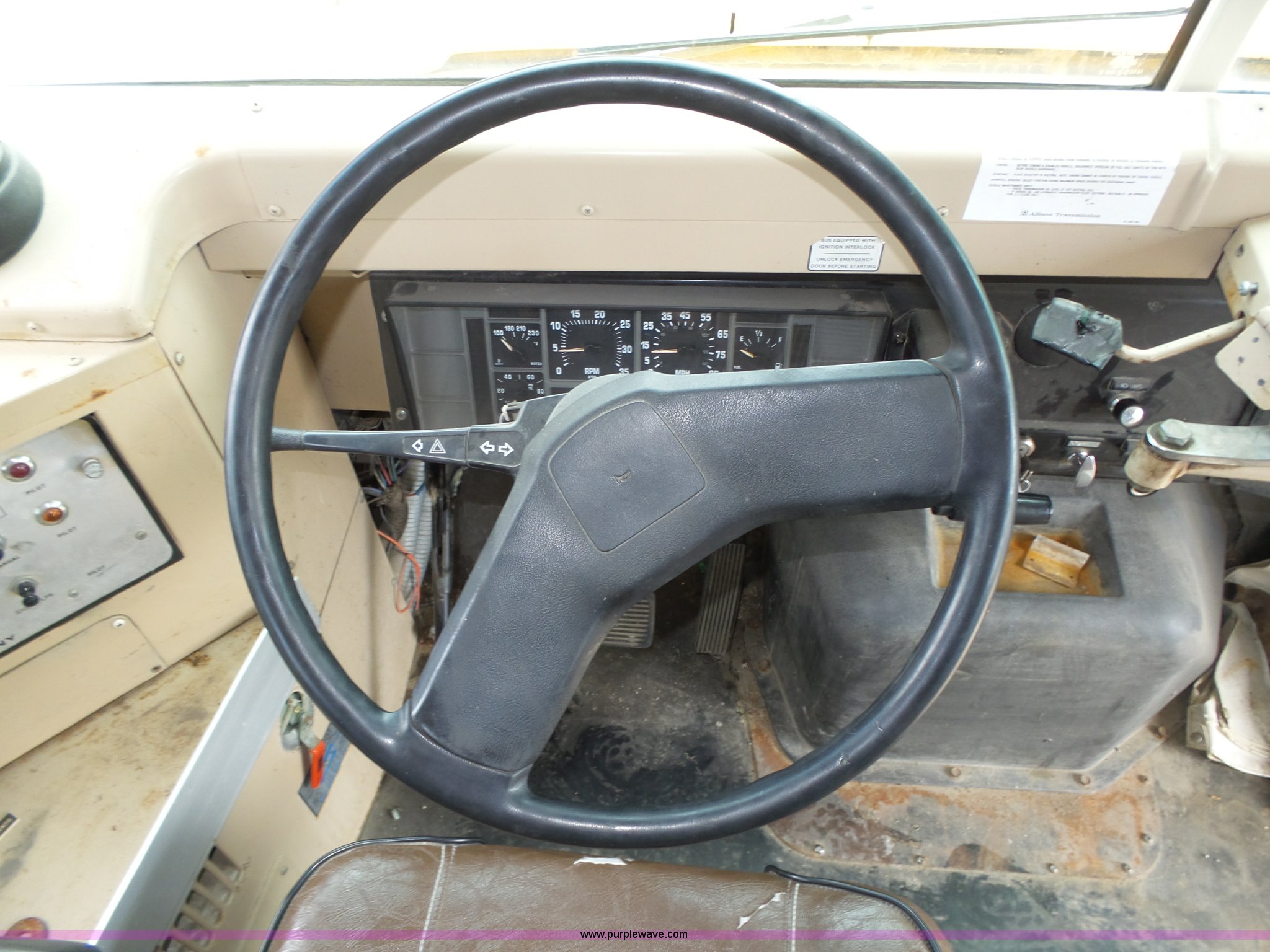 Purple Wave is selling a used Bus in Nebraska. This item is a 1990 International 3800 school bus with the following: 50,275 miles on odometer, International B170F 5.9L L6 turbo diesel engine, Allison A750 automatic transmission, Single axle, Heat, Fan, Suspension seat, Overhead storage, First aid kits, Block heater, Blue Bird body, No. M49075, Service no. 346676, Rear emergency egress, Front and rear tow hooks, Spring suspension, Hydraulic brakes, 152" wheelbase, Bridgestone 9R22.5 tires, GVWR 23,800 lbs, FAWR 8,000 lbs, RAWR 15,800 lbs, One owner, Additional mirrors included, No seats, Unit# 12