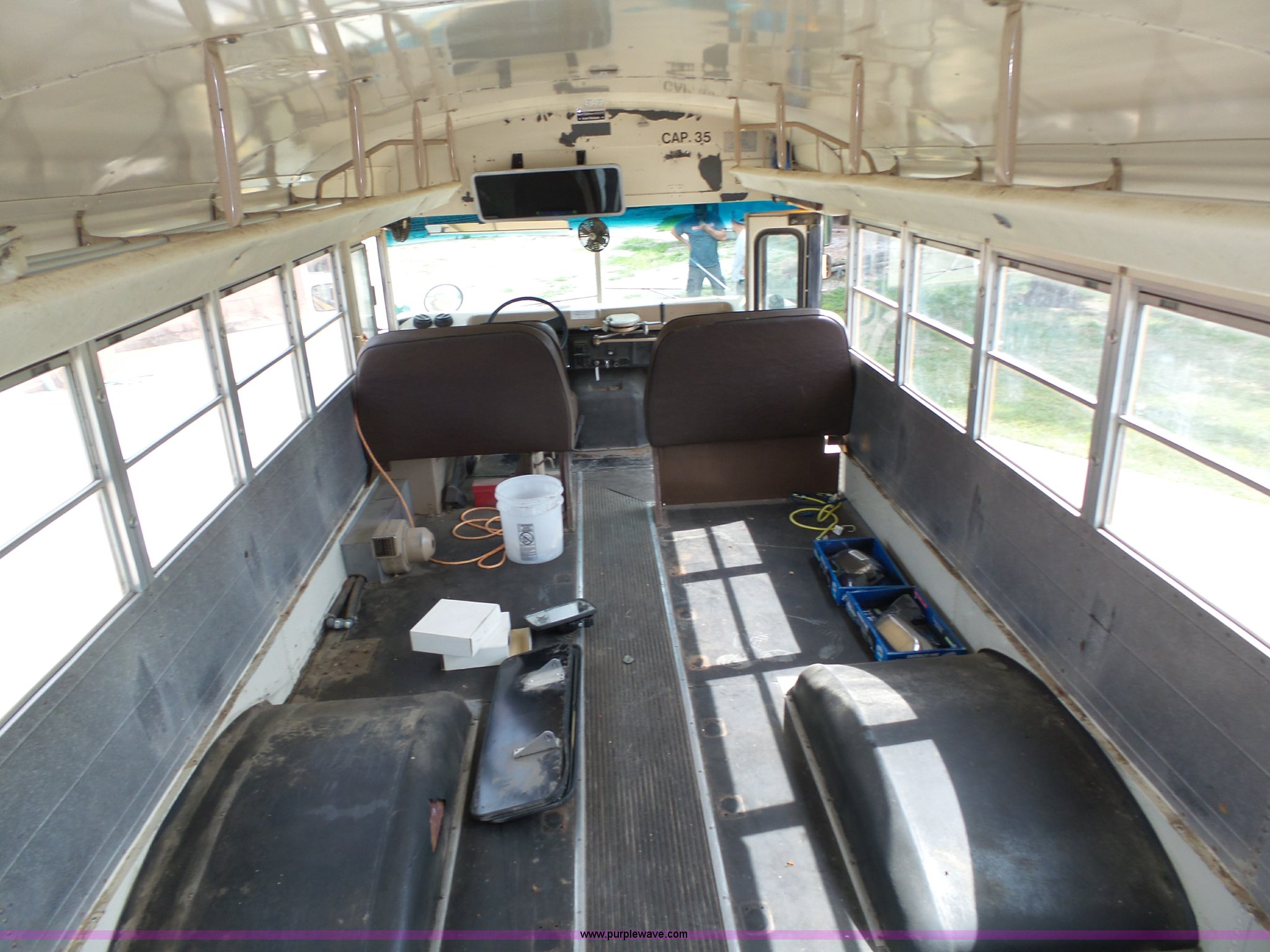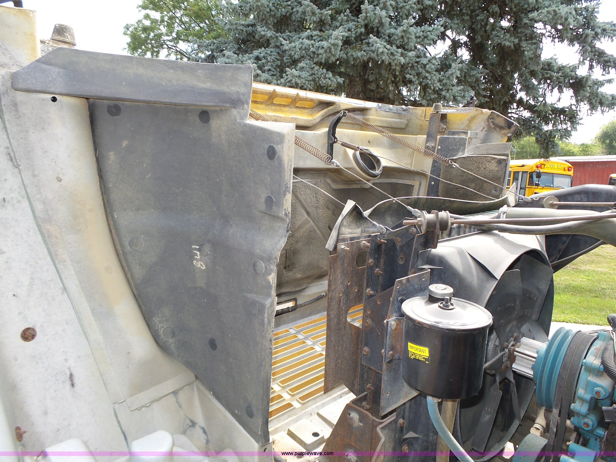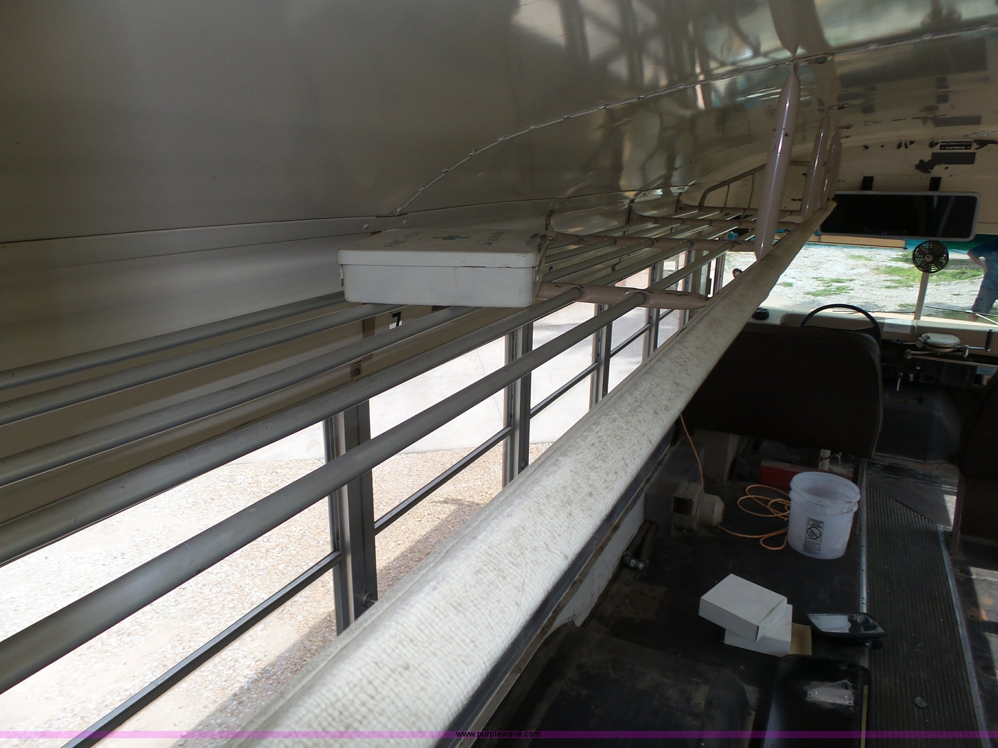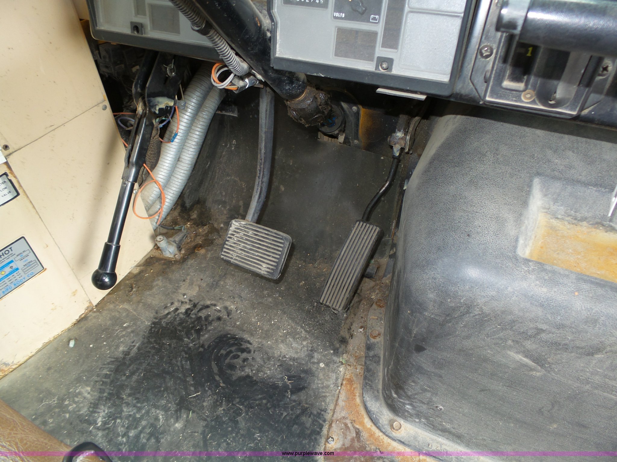 Purple Wave is selling a used Bus in Nebraska. This item is a 1990 International 3800 school bus with the following: 50,275 miles on odometer, International B170F 5.9L L6 turbo diesel engine, Allison A750 automatic transmission, Single axle, Heat, Fan, Suspension seat, Overhead storage, First aid kits, Block heater, Blue Bird body, No. M49075, Service no. 346676, Rear emergency egress, Front and rear tow hooks, Spring suspension, Hydraulic brakes, 152" wheelbase, Bridgestone 9R22.5 tires, GVWR 23,800 lbs, FAWR 8,000 lbs, RAWR 15,800 lbs, One owner, Additional mirrors included, No seats, Unit# 12