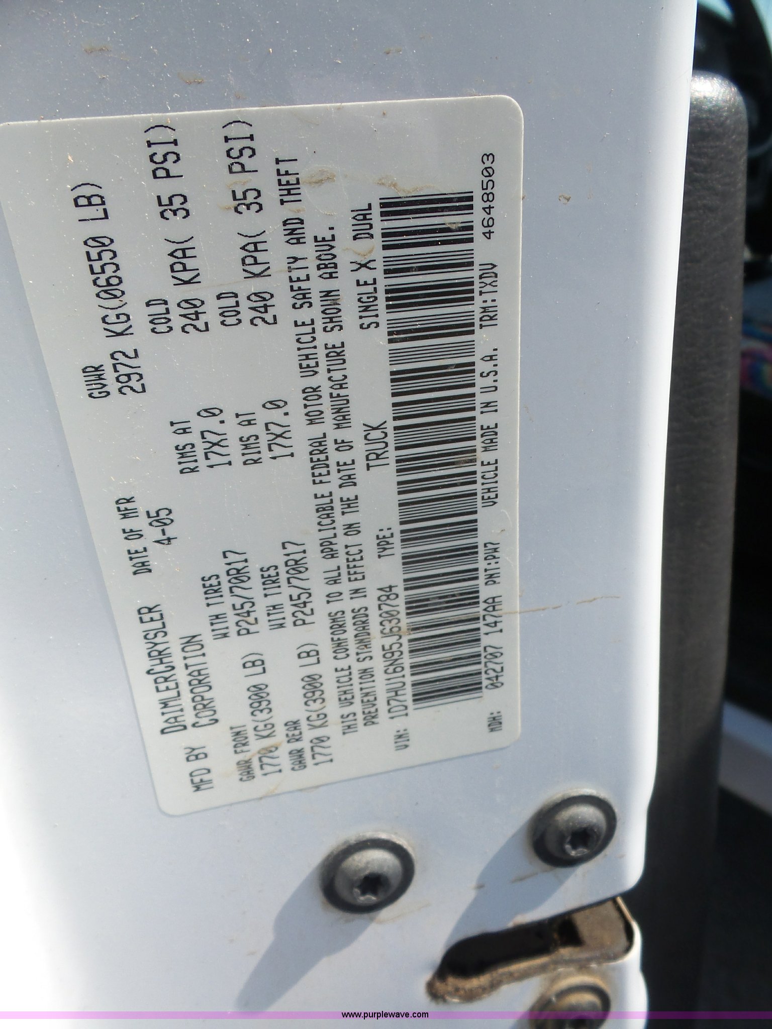 Purple Wave is selling a used 1/2 Ton Pickup or Van in Kansas. This item is a 2005 Dodge Ram 1500 pickup truck with the following: 72,480 miles on odometer, 4.7L V8 SOHC 16V gas engine, Automatic transmission, Four wheel drive, AC and heat, Tilt, AM/FM/cassette, Manual windows and locks, Vinyl interior, Long bed, Receiver hitch, 245/70R17 tires, Seat torn, Hail damage, Unit# 256