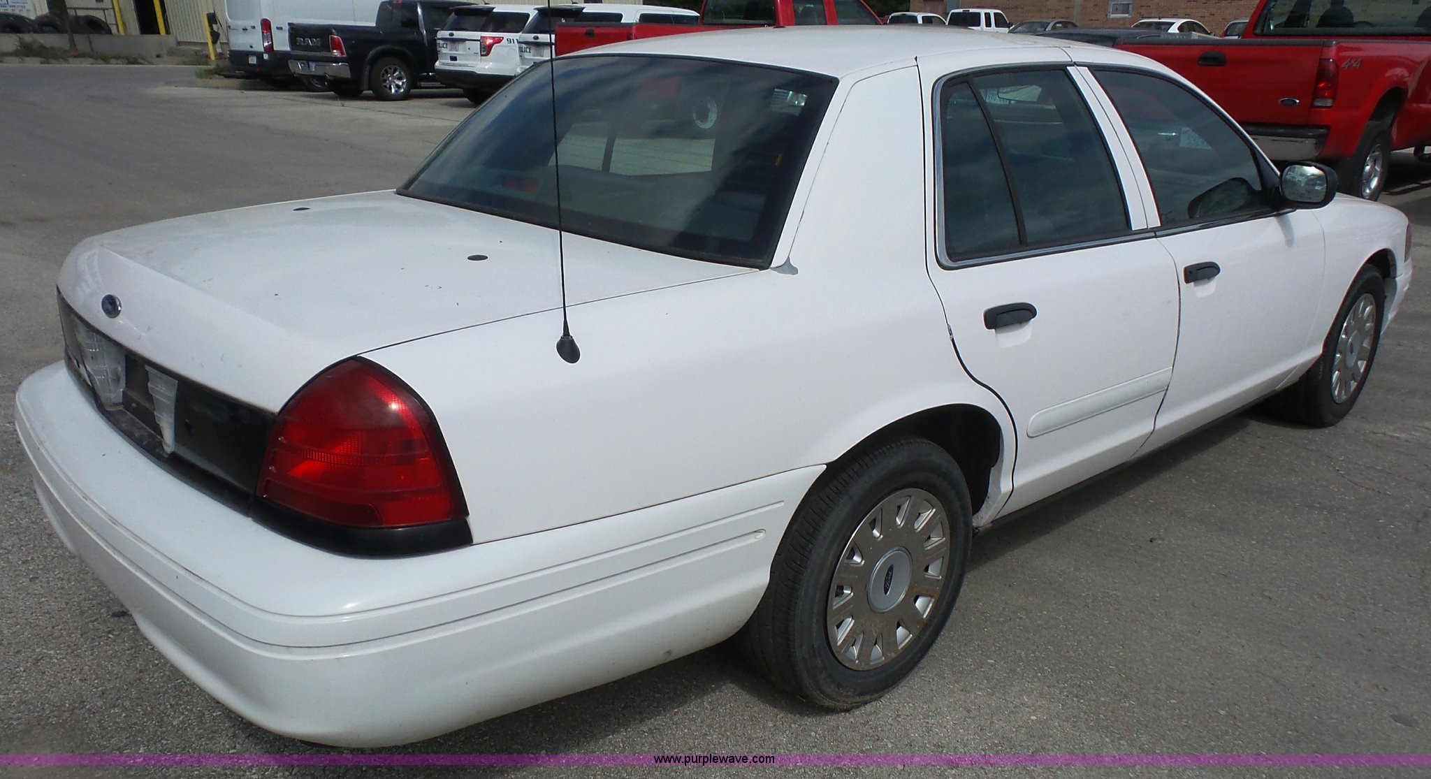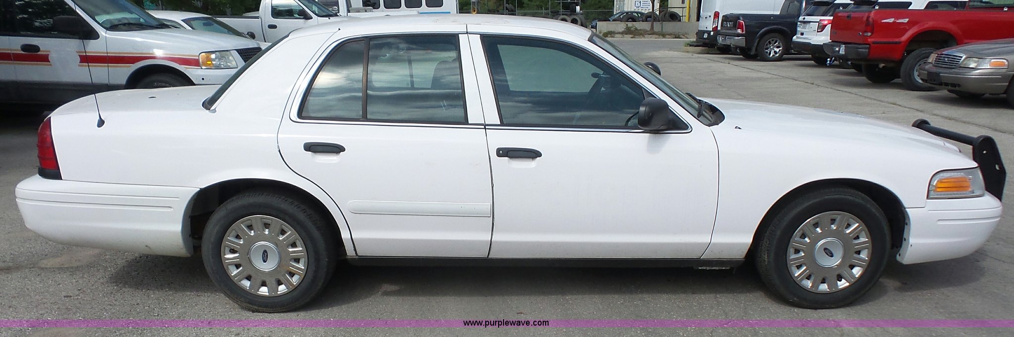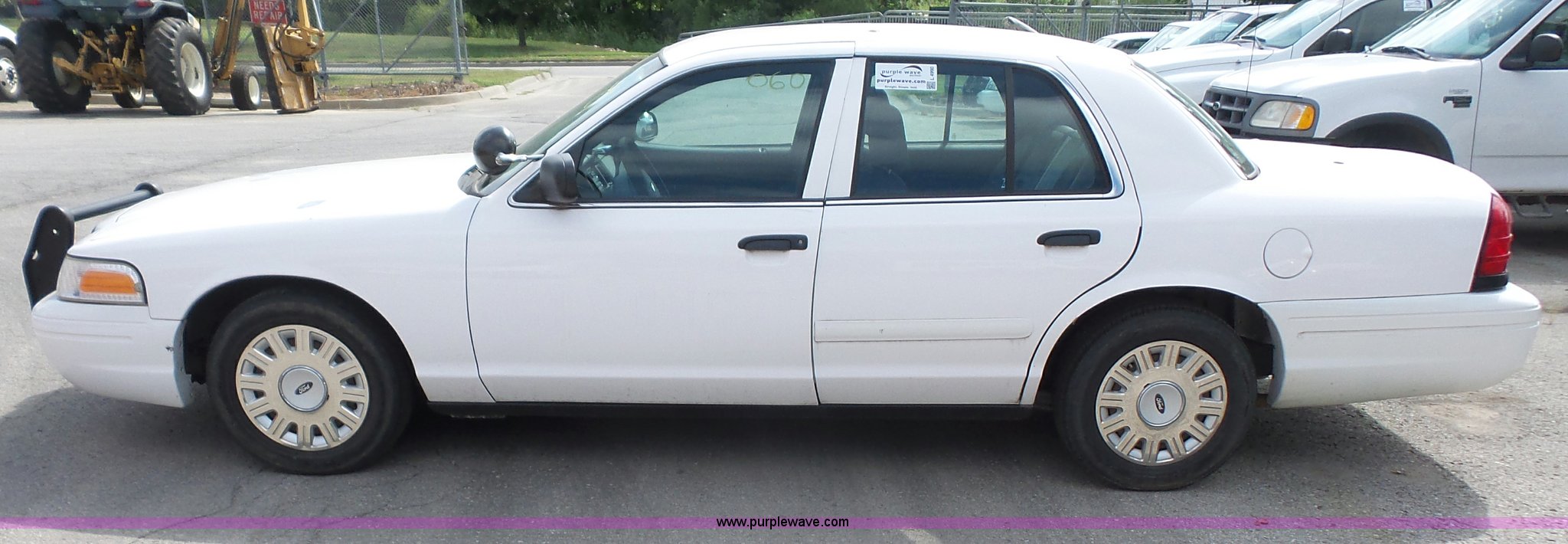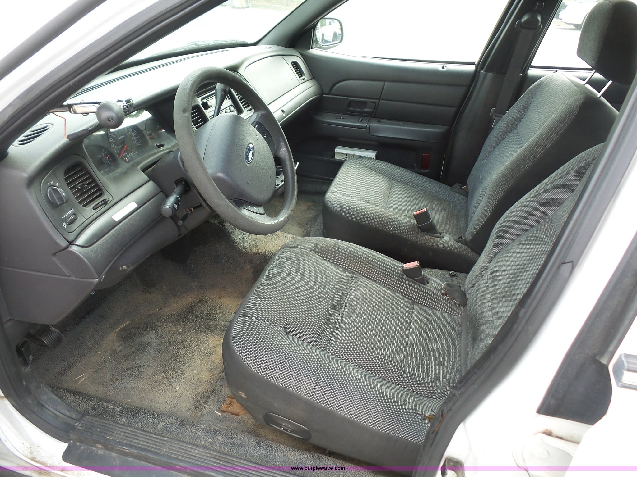 Purple Wave is selling a used Passenger Vehicle in Kansas. This item is a 2005 Ford Crown Victoria Police Interceptor with the following: 94,219 miles on odometer, 4.6L V8 SOHC 16V gas engine, Automatic transmission, AC and heat, Tilt, Cruise, AM/FM, Power windows, locks, mirrors, and seat, Cloth interior, Spotlight, Grill guard, 225/60R16 tires, Unit# 060