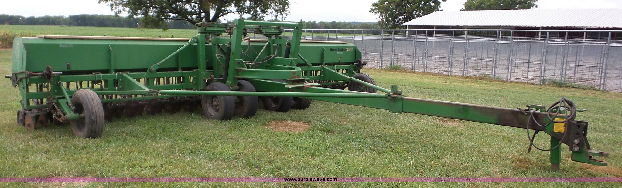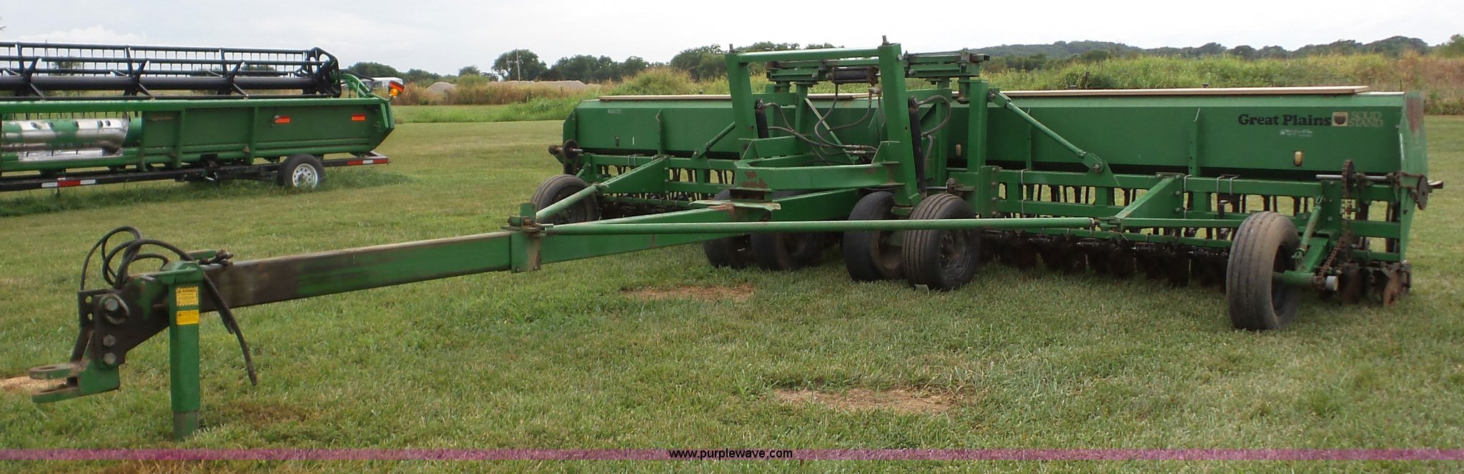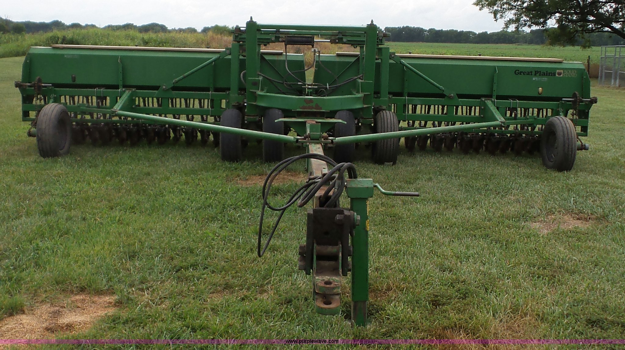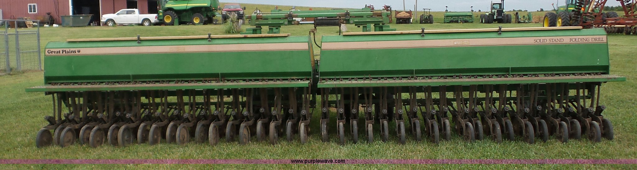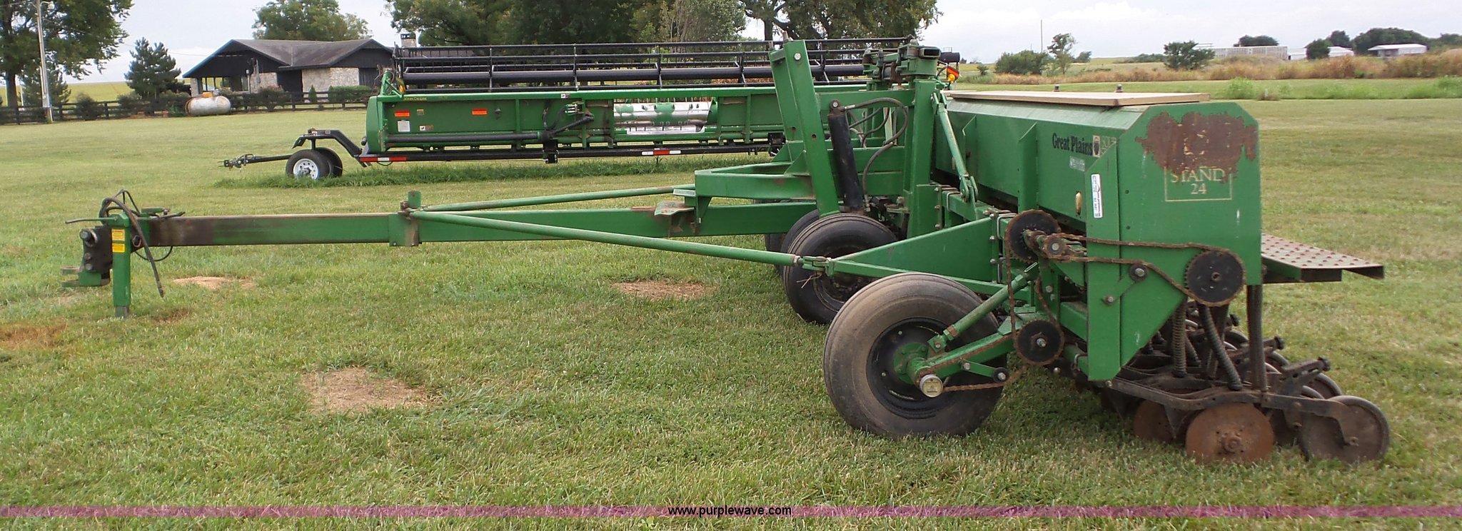 Purple Wave is selling a used Grain Drill or Seeder in Kansas. This item is a Great Plains Solid Stand 24 grain drill with the following: 24'W, 7.5" row spacing, Hydraulic wing fold, Bulk fill system, Ground meter drive, HD spring down pressure, Single disk openers, Single closing system, Pin hitch, Serial GP-25099