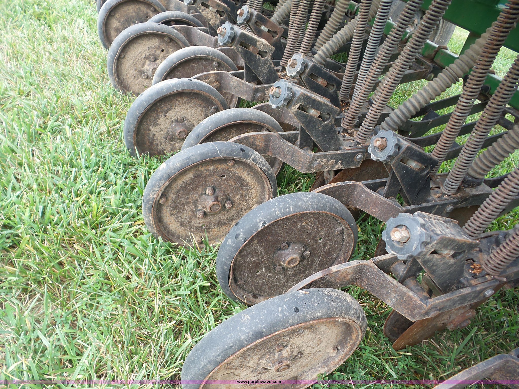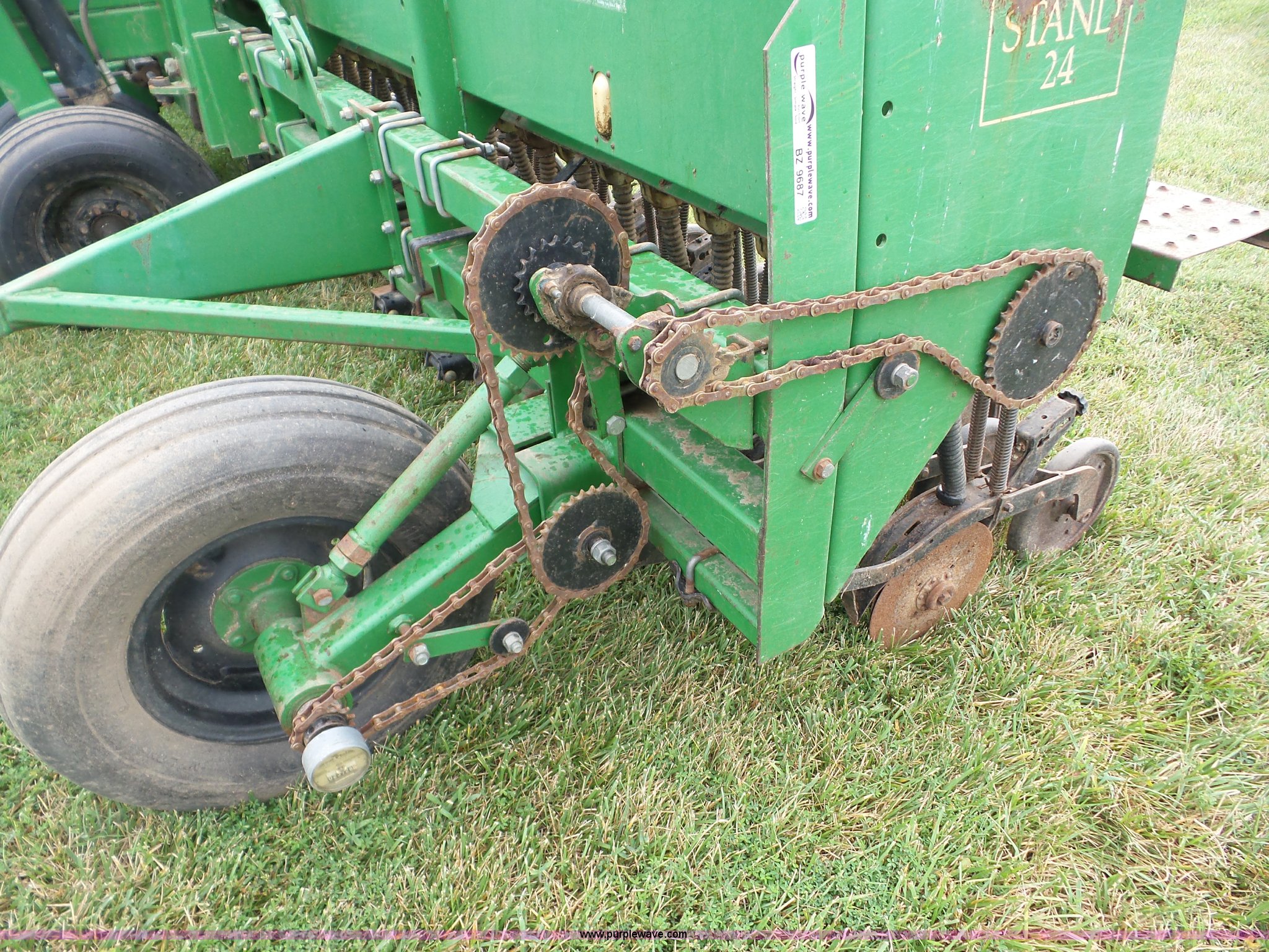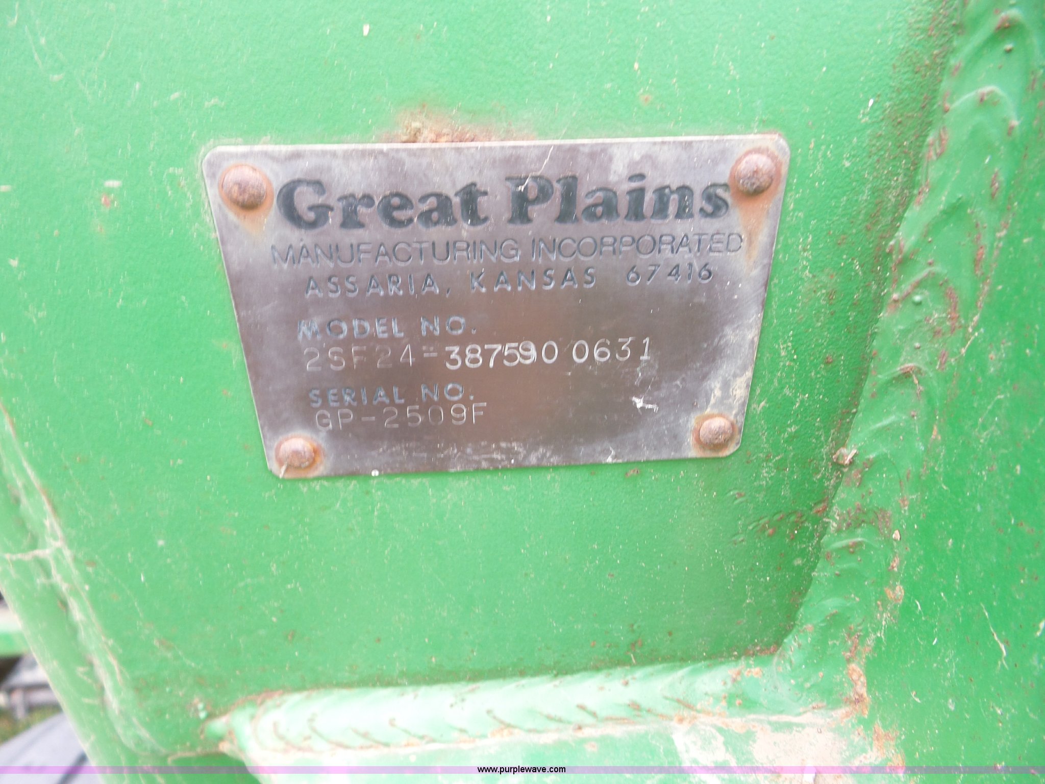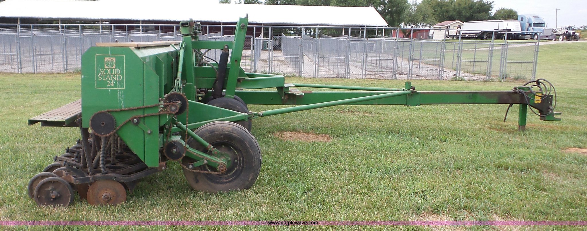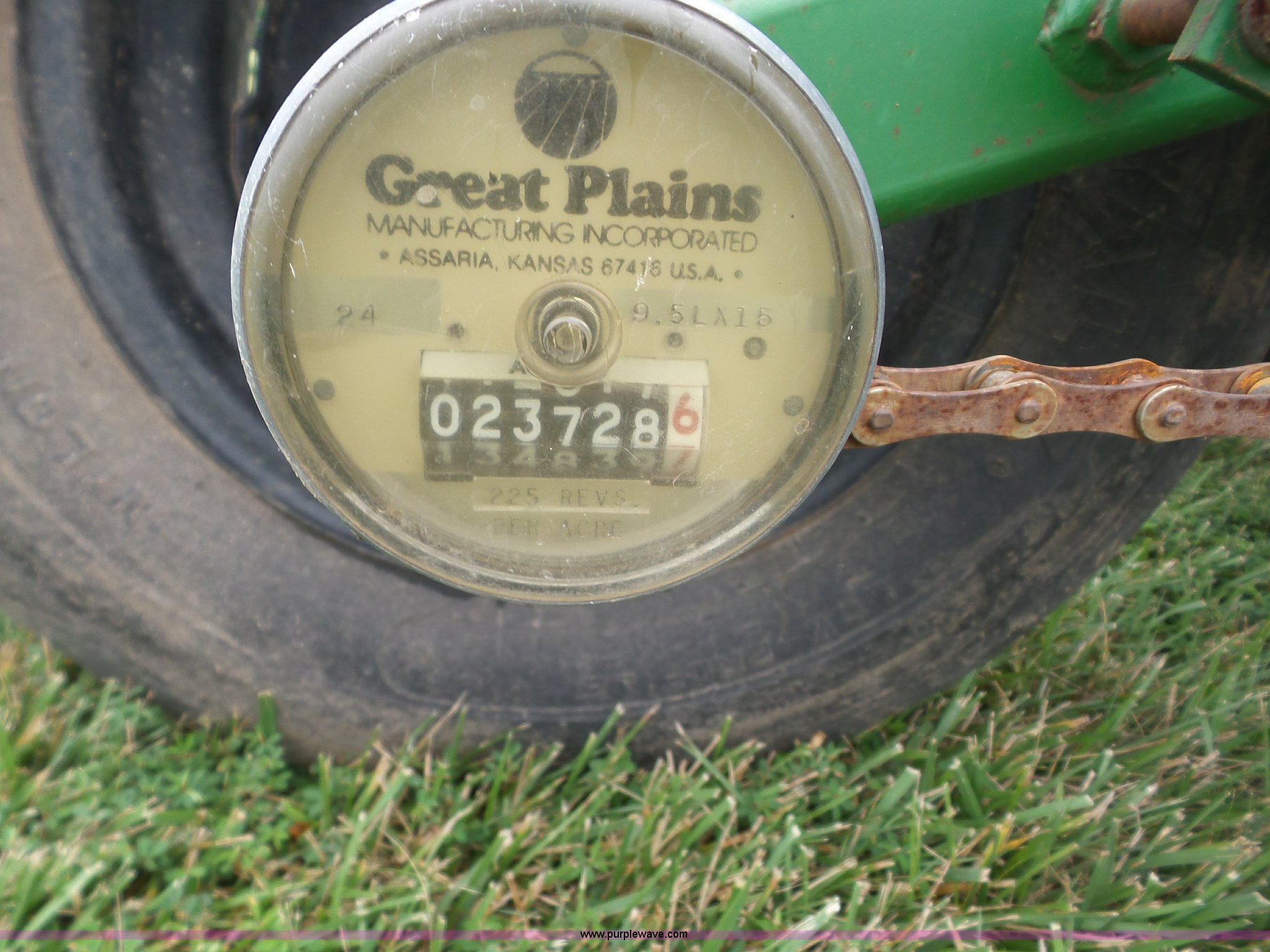 Purple Wave is selling a used Grain Drill or Seeder in Kansas. This item is a Great Plains Solid Stand 24 grain drill with the following: 24'W, 7.5" row spacing, Hydraulic wing fold, Bulk fill system, Ground meter drive, HD spring down pressure, Single disk openers, Single closing system, Pin hitch, Serial GP-25099