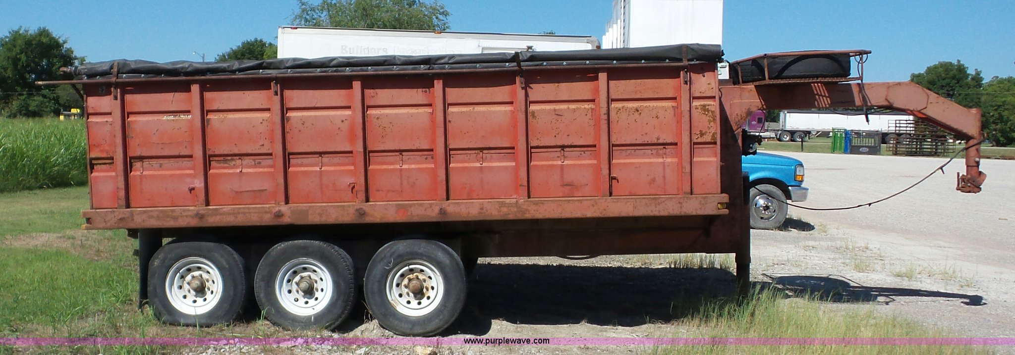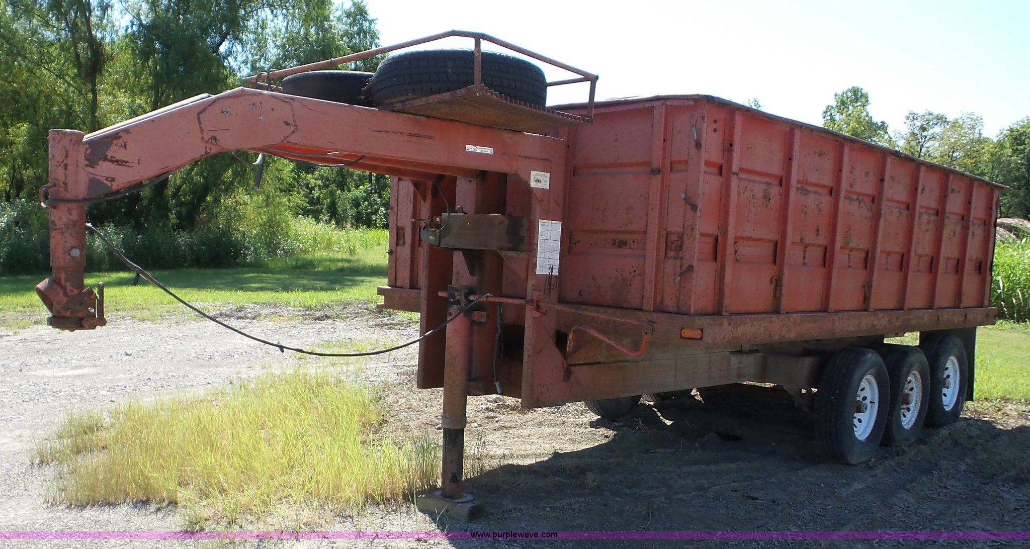Purple Wave is selling a used Grain or Commodity Trailer in Oklahoma. This item is a Dump bed grain trailer with the following: 16'L x 94"W, 40" side height, Rollover tarp, Electric over hydraulic pump, Gooseneck hitch, Single leg landing gear, Spring suspension, Triple axle, 7.50R16LT tires, Spare wheel, One broken four bolt on axle, Hydraulic lift cylinder leaks