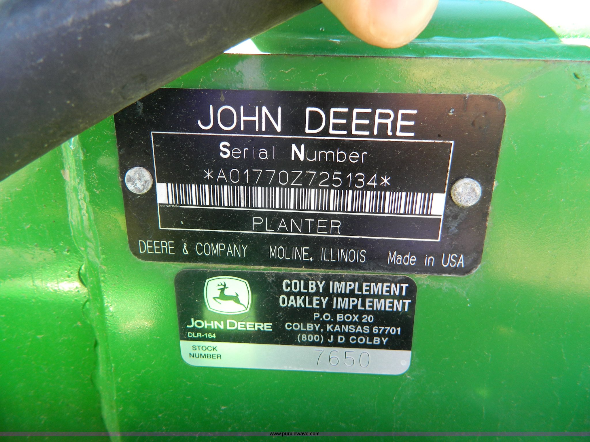 2008 John Deere 1770NT CCS planter. 12 row units, 30" row spacing, Hydraulic front fold, Pro Series row unit, Bulk fill system, Air delivery, Seed boxes, Hydraulic meter drive, Corn seed meters, Pneumatic down pressure, Martin row cleaners, Seed firmers, Double disk openers, Double rubber spiked closing system, 350 gallon liquid fertilizer tank Seed firmer application Insecticide boxes, Three point, 10.00-15 transport tires, Operator's manual, Additional parts included Unused seed firmers, TruCount air clutch system will be removed and replaced with factory standard parts, No additional seed boxes included, Serial A01770Z725134. Ross B Sloan Trust. Colby, KS 67701