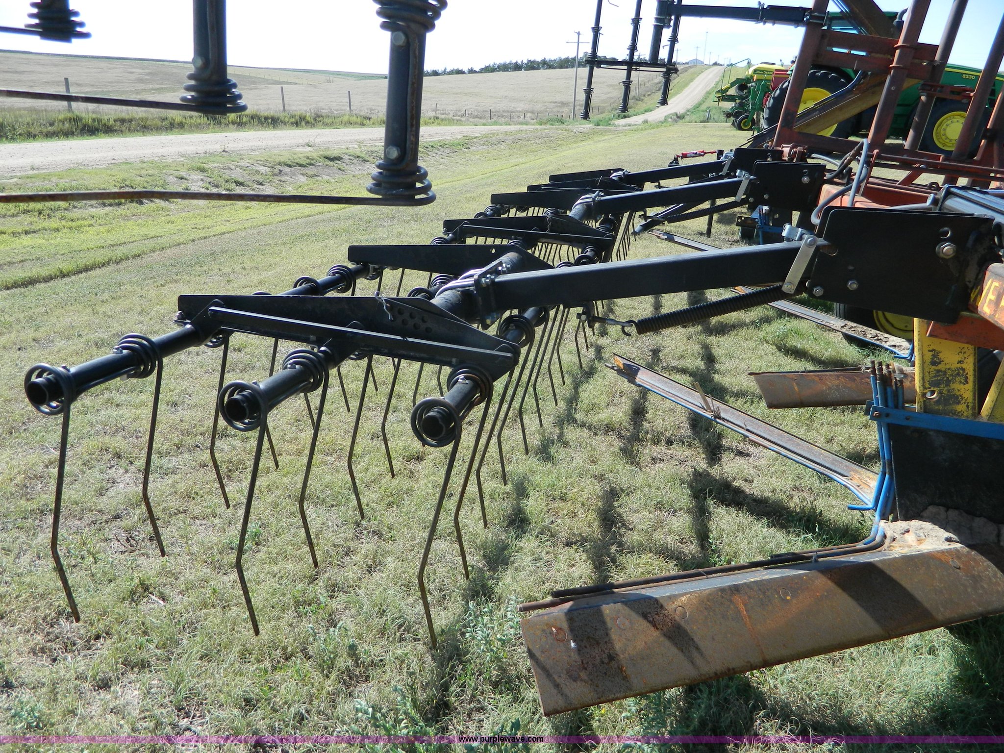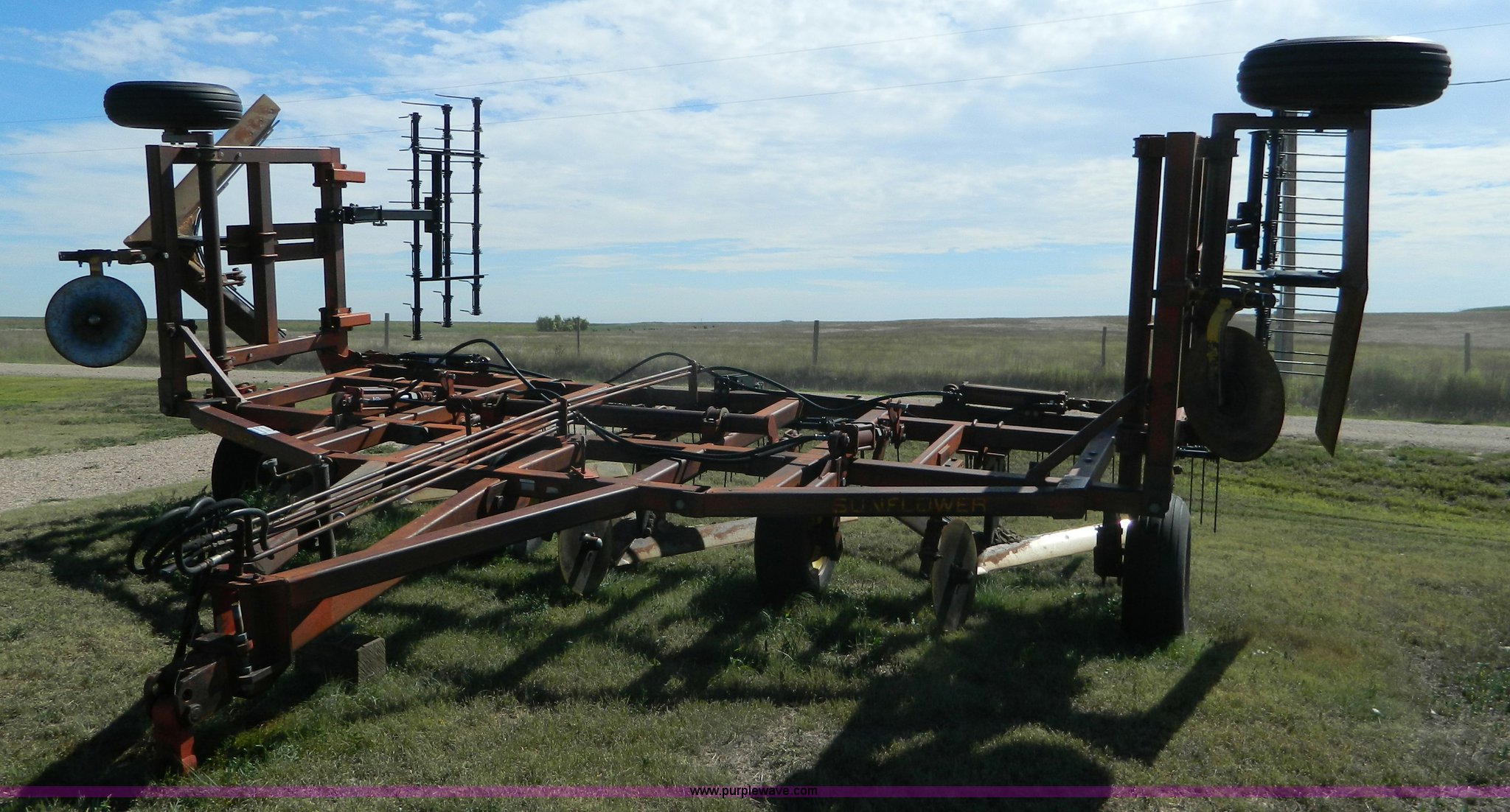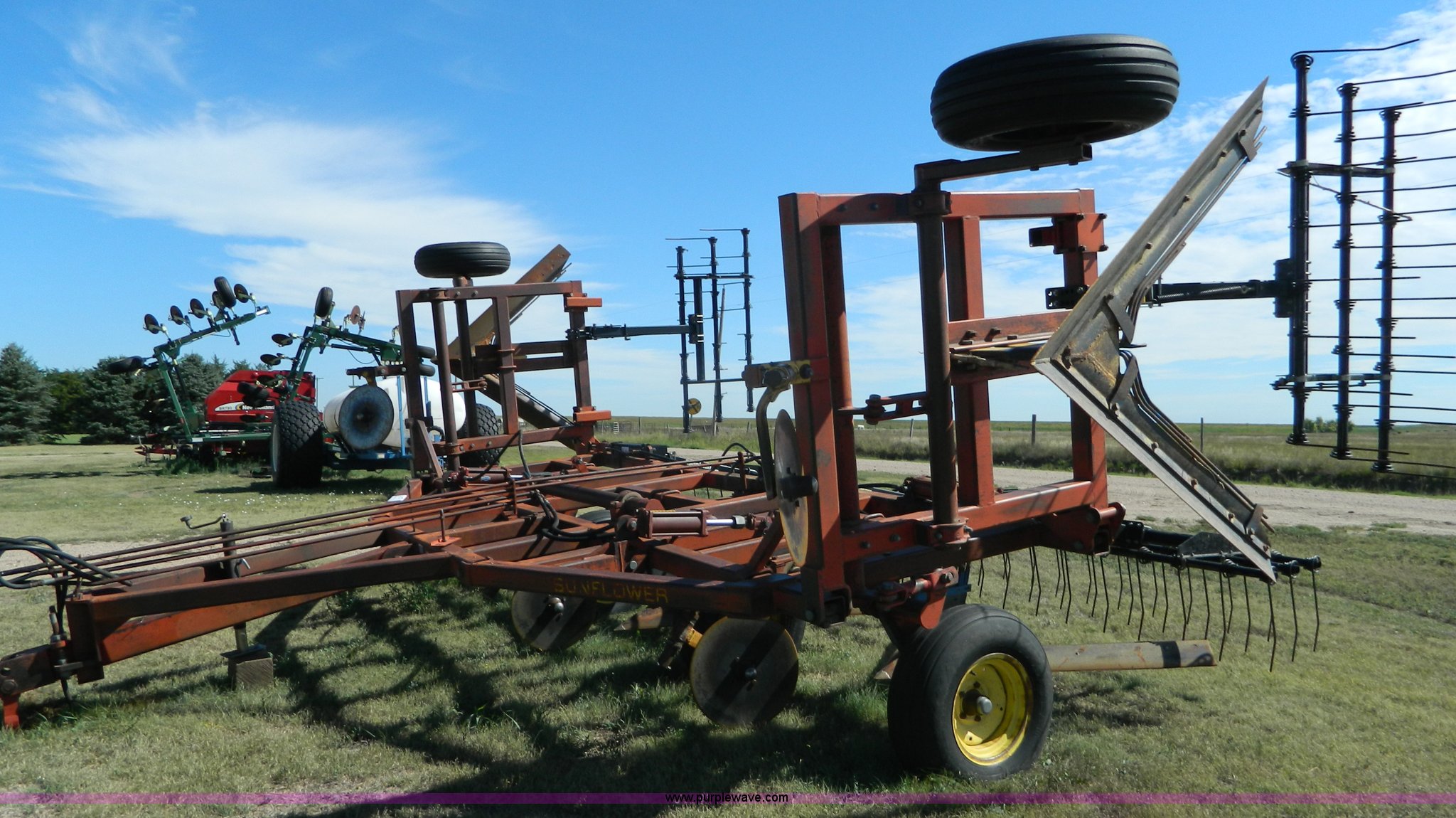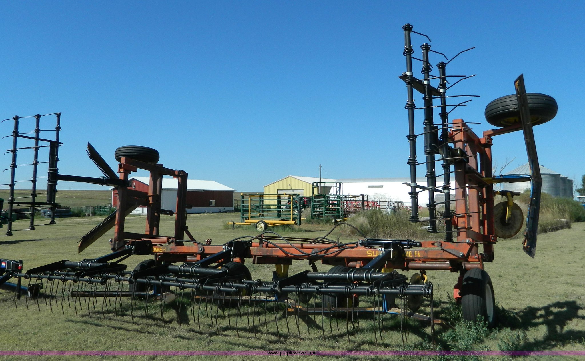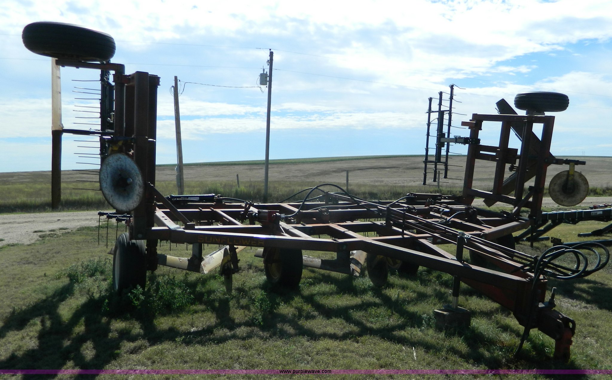 Purple Wave is selling a used Field Cultivator or Sweep Plow in Kansas. This item is a Sunflower sweep plow with the following: 30'W, (5) 6' blades, Dangelman three bar tine harrow, Hydraulic lift and fold, Pin/clevis hitch, 9.5L-15 transport tires