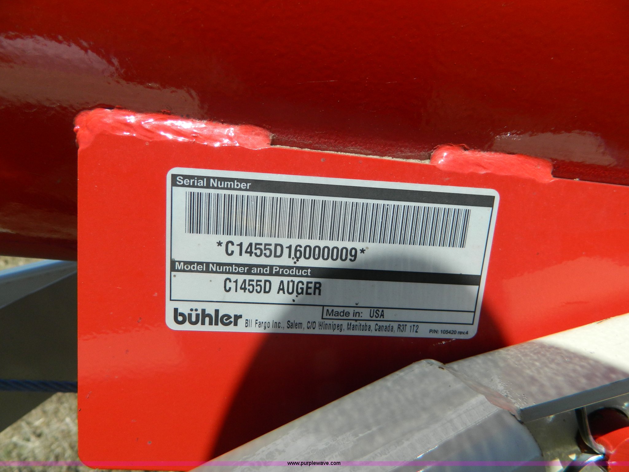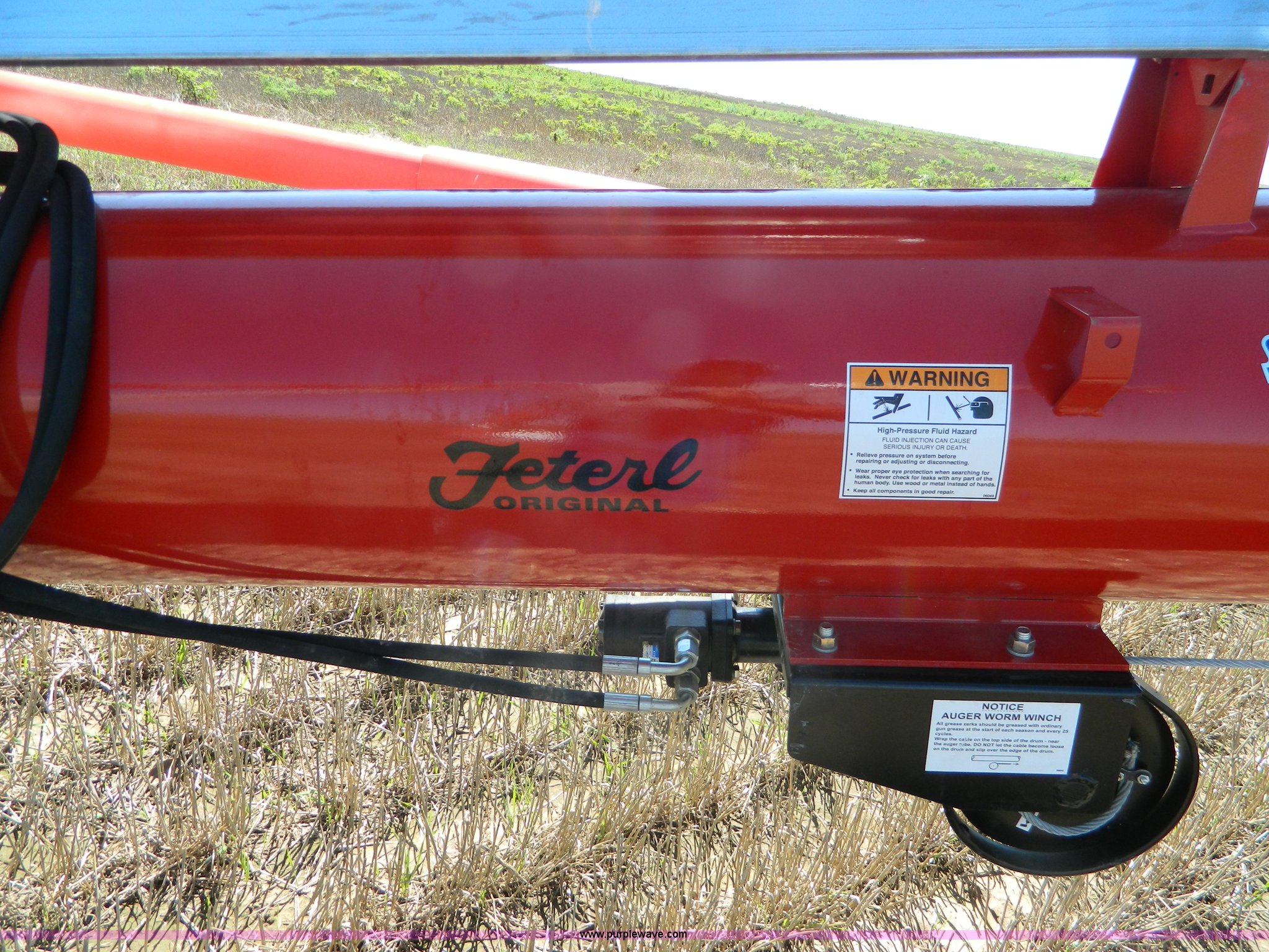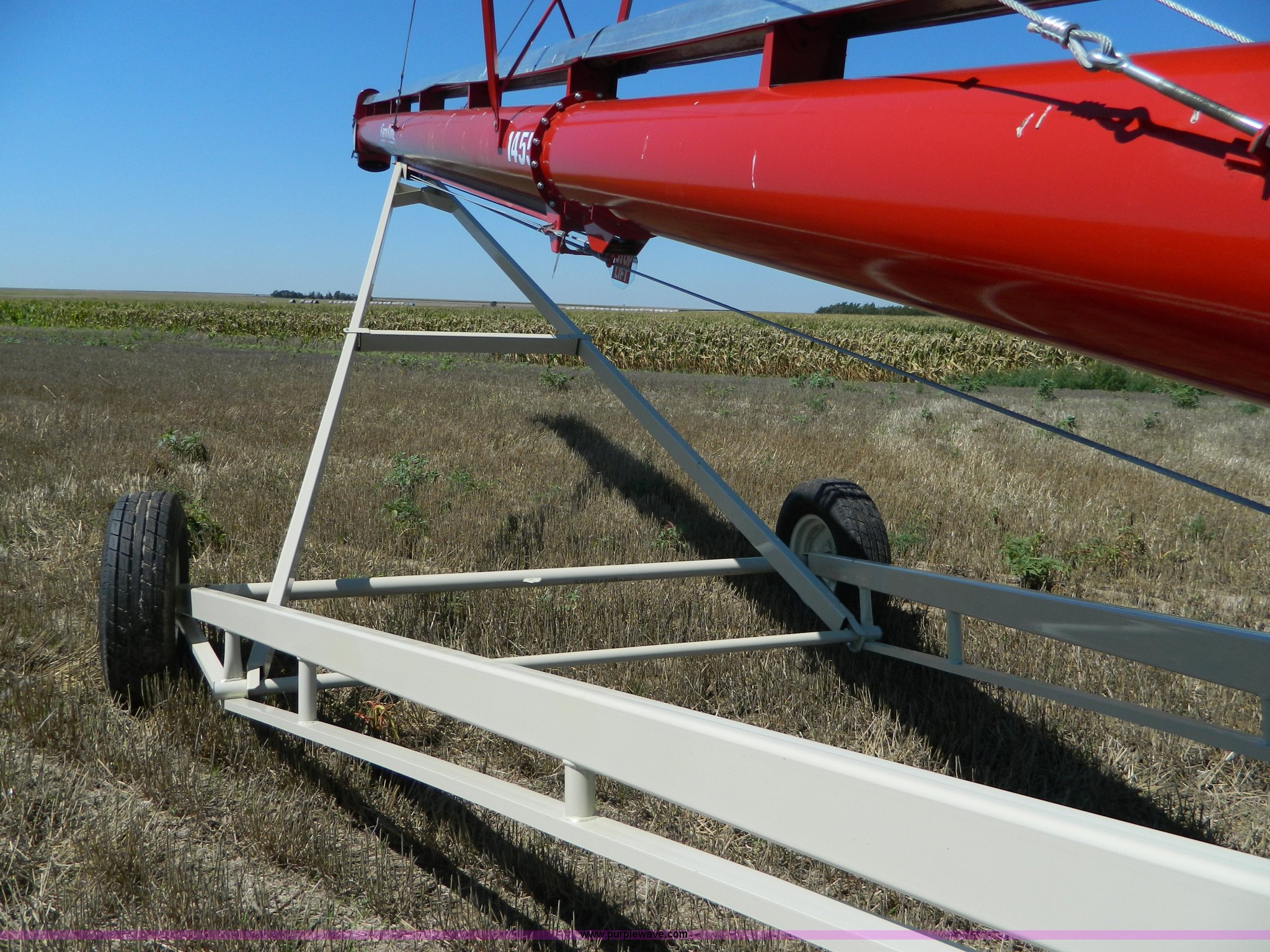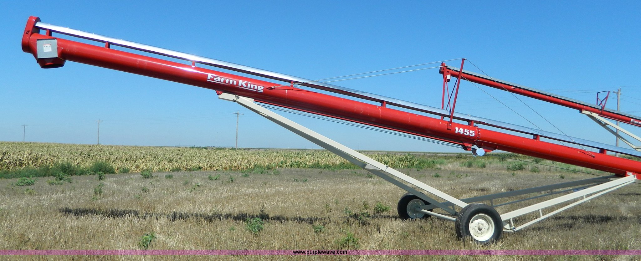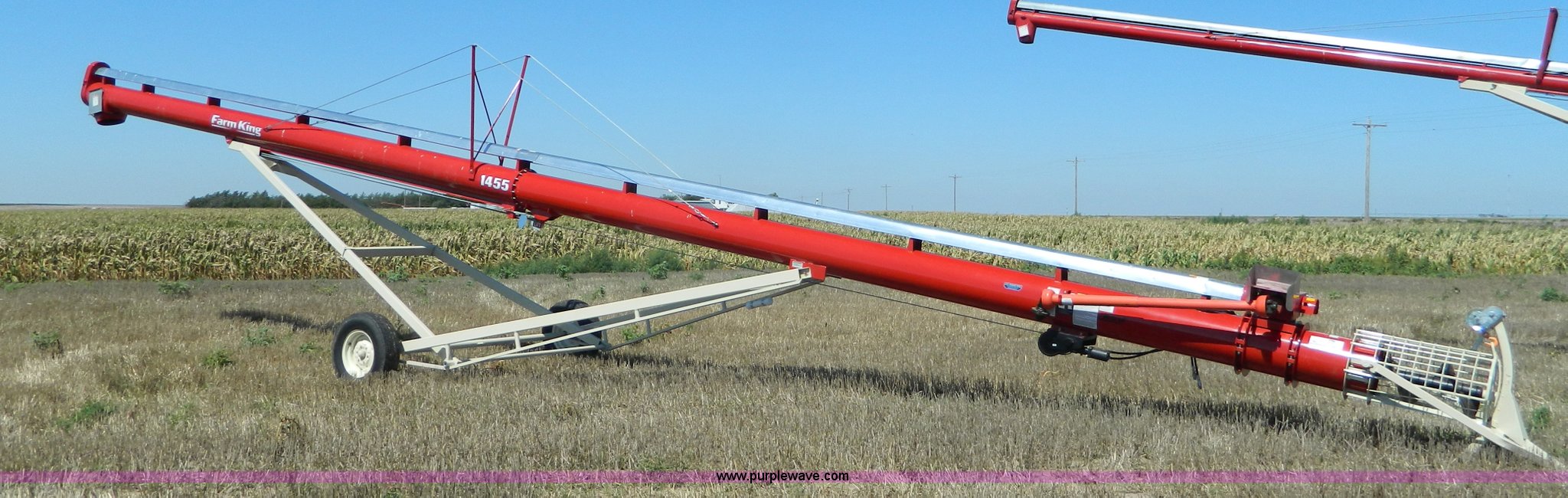 Purple Wave is selling a used Auger or Conveyor in Kansas. This item is a Farm King Feterl C1455D auger with the following: 55'L x 14" diameter, 1,000 PTO drive, Electric drive available, Double edge flighting, Reversible gear box, Discharge spout relief door, Approximately 3,140 lbs, Unused, Serial C1455D16000009
