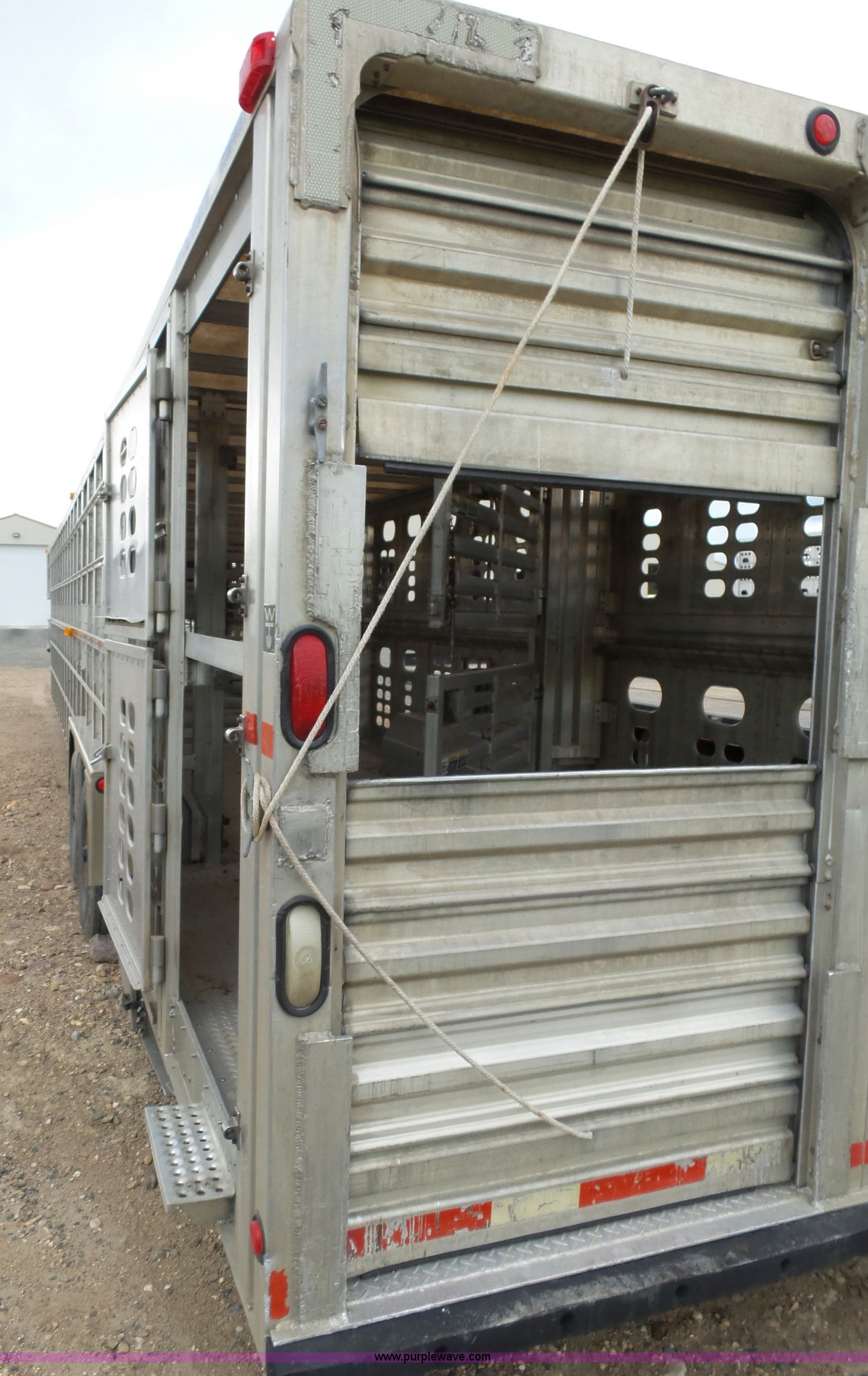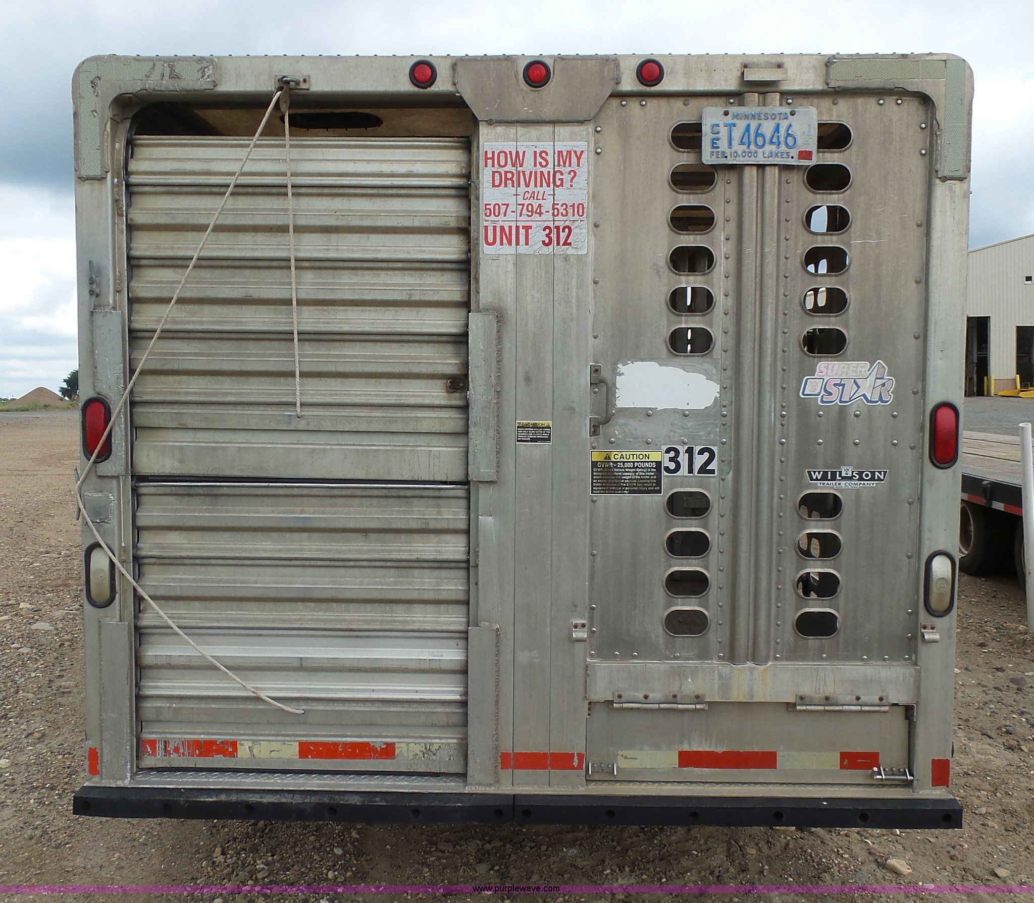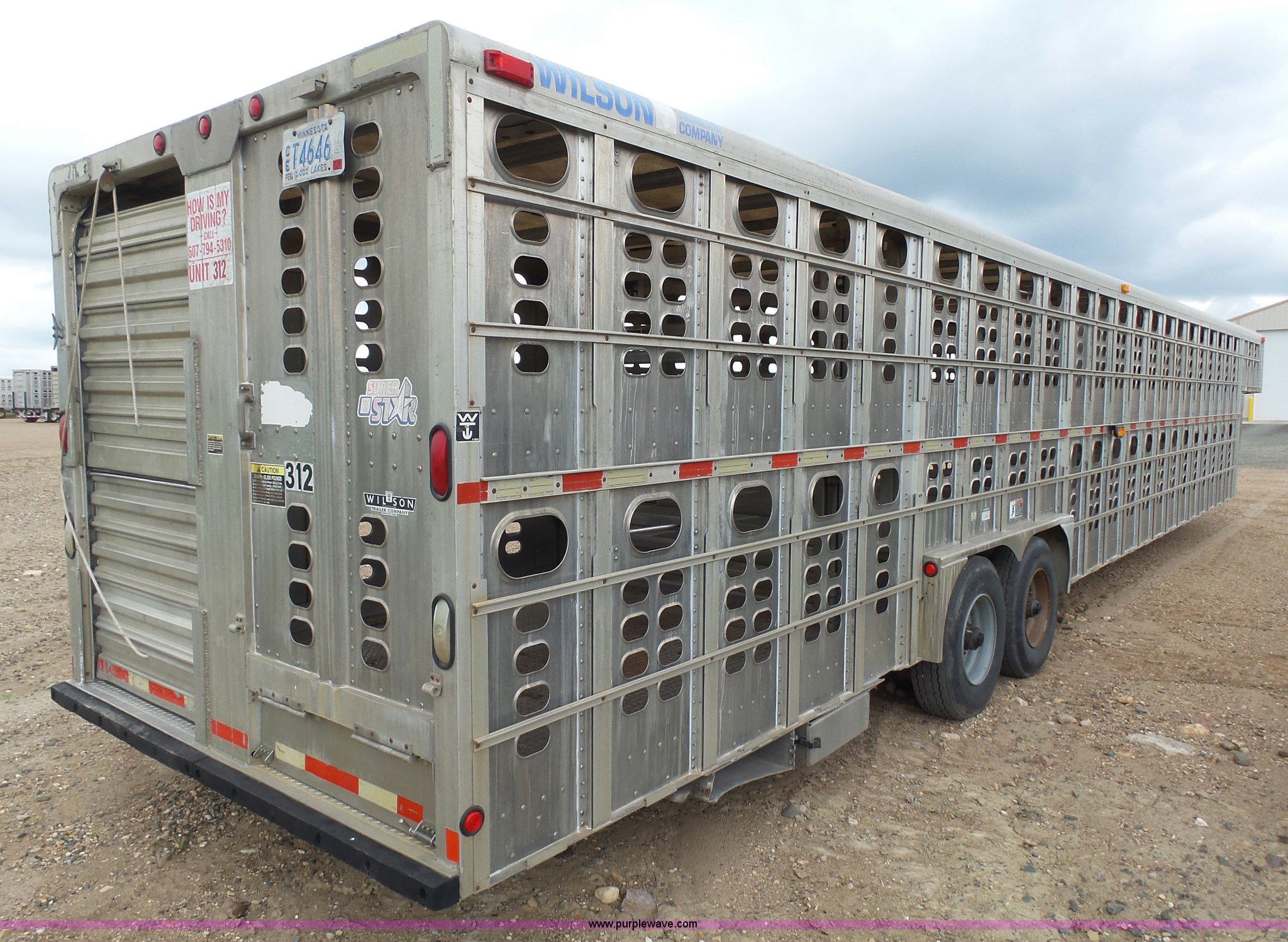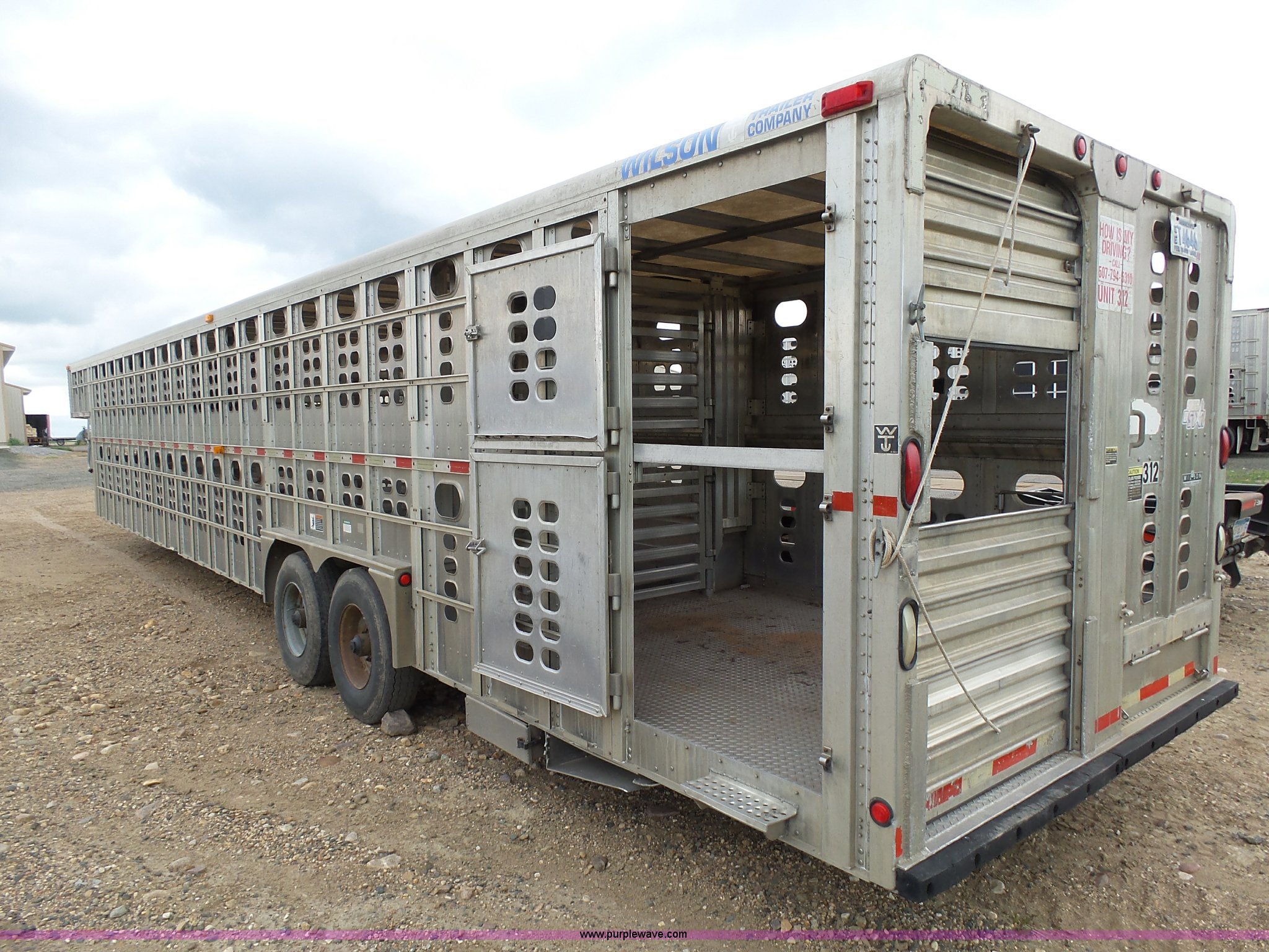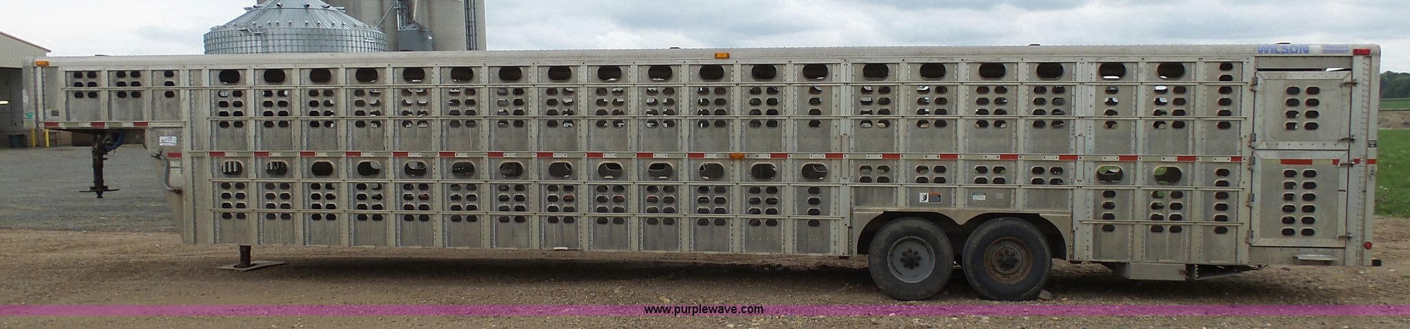Purple Wave is selling a used Livestock Equip. in Minnesota. This item is a 2004 Wilson TRL livestock trailer with the following: 42'L x 94"W, 6' side height, (2) center divider gates, Side door, Rear roll up gate, Side load gate, Ground load, Dock bumper, Aluminum construction, Fifth wheel plate, Single leg landing gear, Spring suspension, Electric brakes, Steel wheels, 10R17.5 tires, GVWR 25,000 lbs, GAWR 9,350 lbs