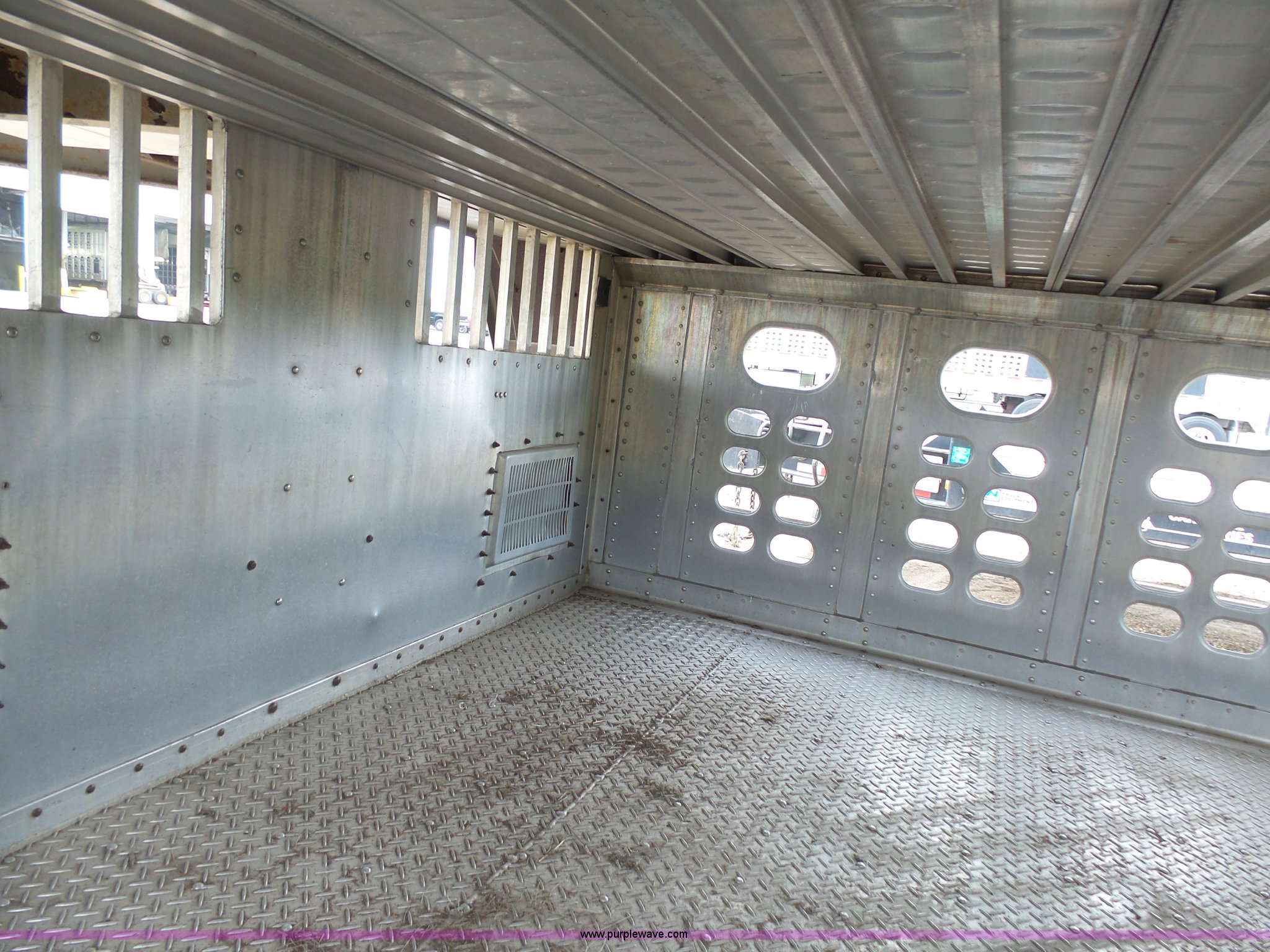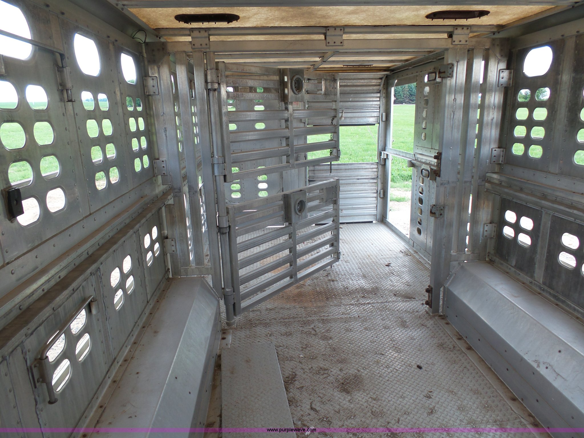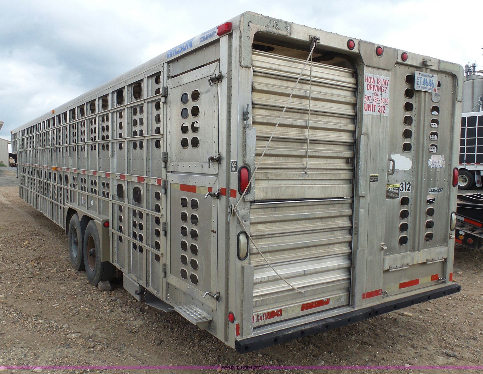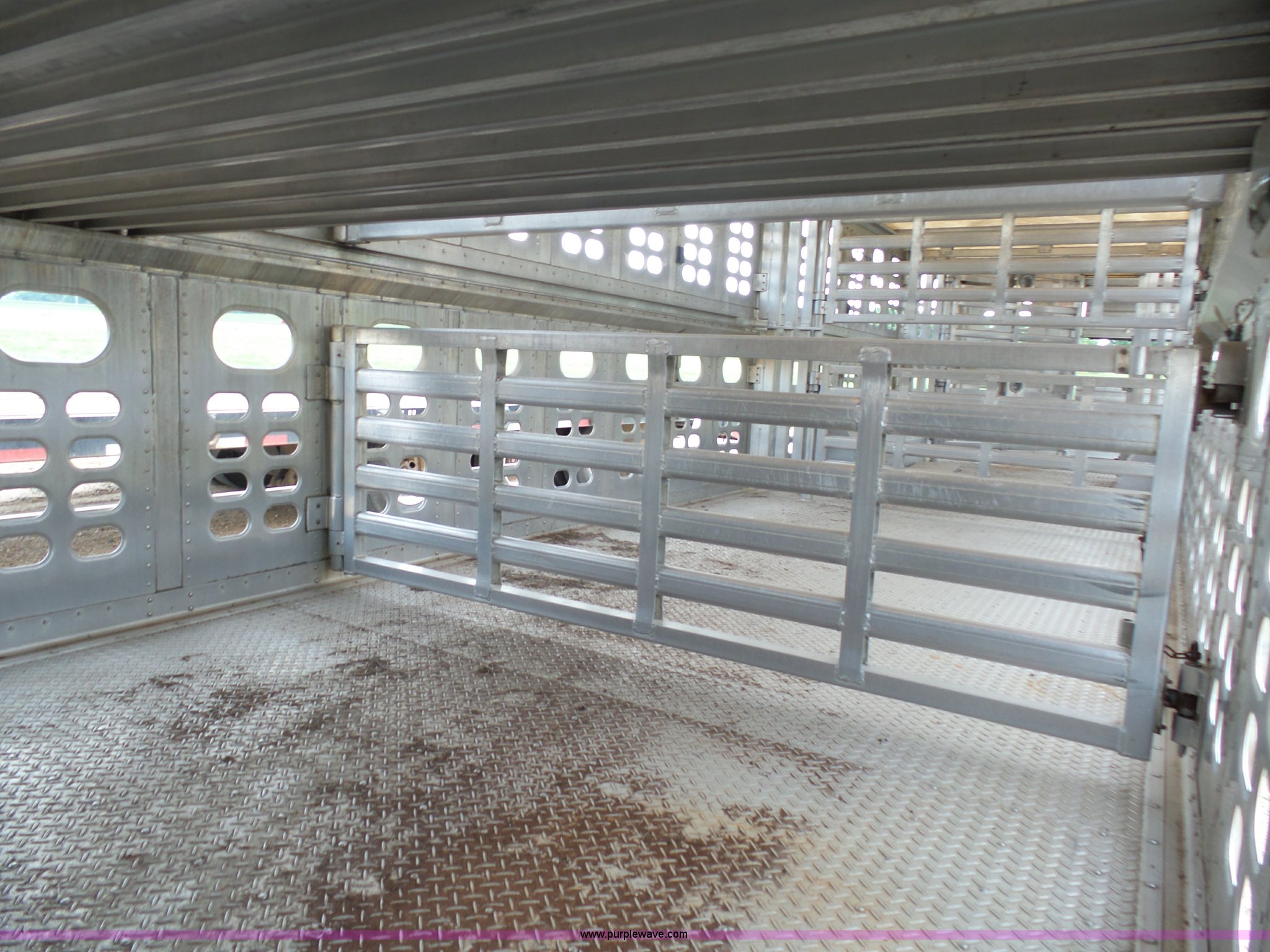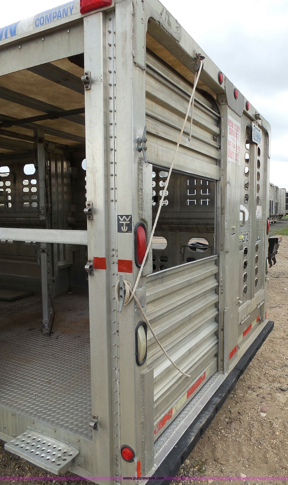 Purple Wave is selling a used Livestock Equip. in Minnesota. This item is a 2004 Wilson TRL livestock trailer with the following: 42'L x 94"W, 6' side height, (2) center divider gates, Side door, Rear roll up gate, Side load gate, Ground load, Dock bumper, Aluminum construction, Fifth wheel plate, Single leg landing gear, Spring suspension, Electric brakes, Steel wheels, 10R17.5 tires, GVWR 25,000 lbs, GAWR 9,350 lbs