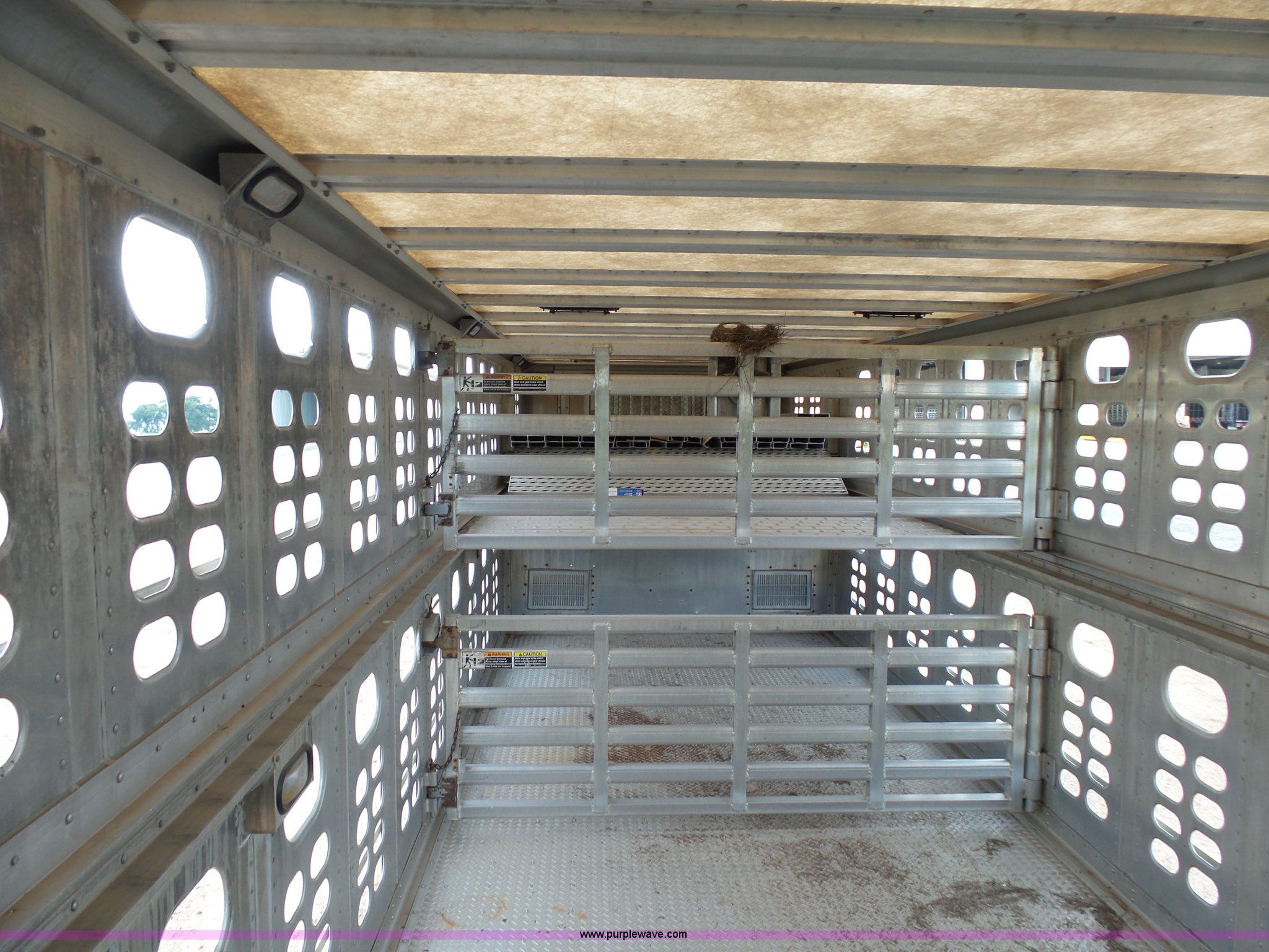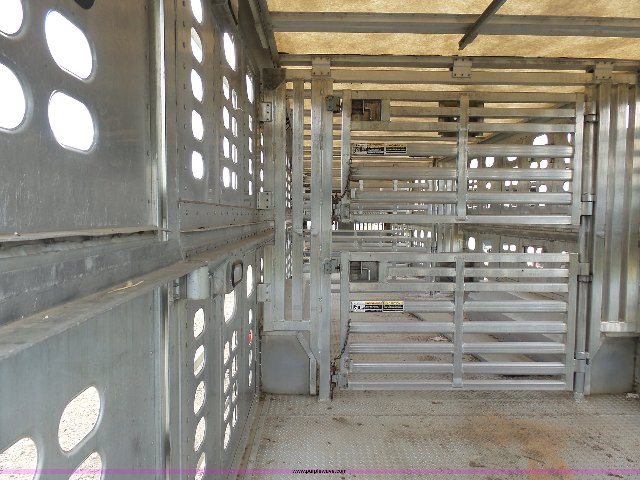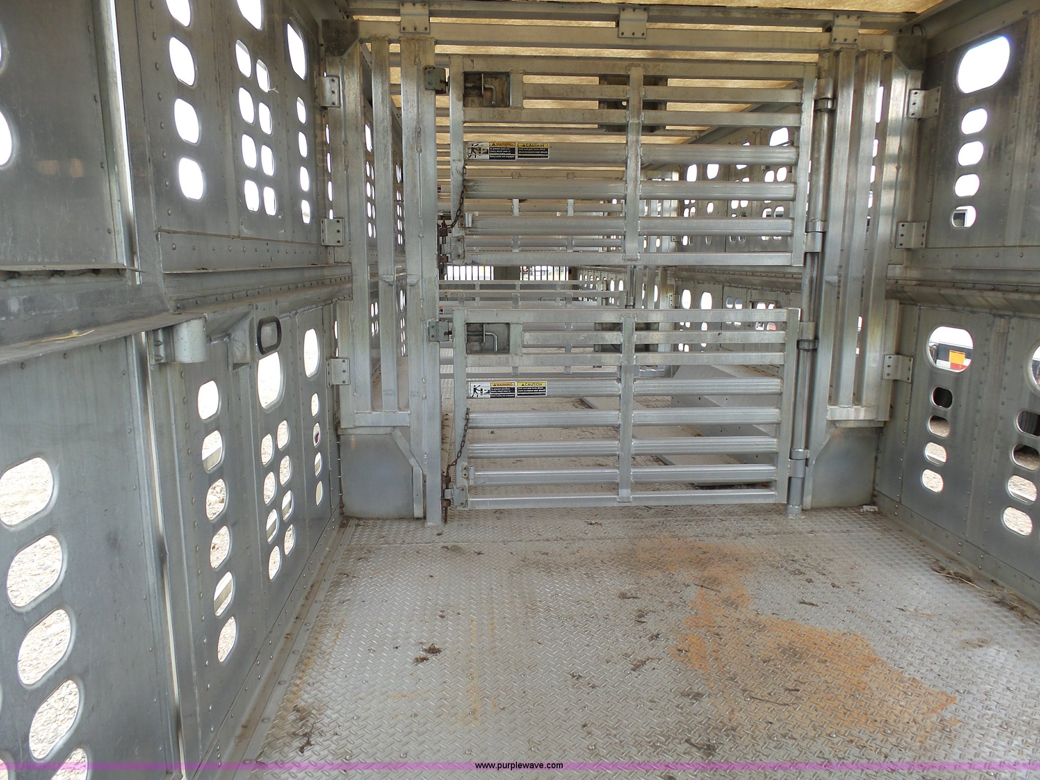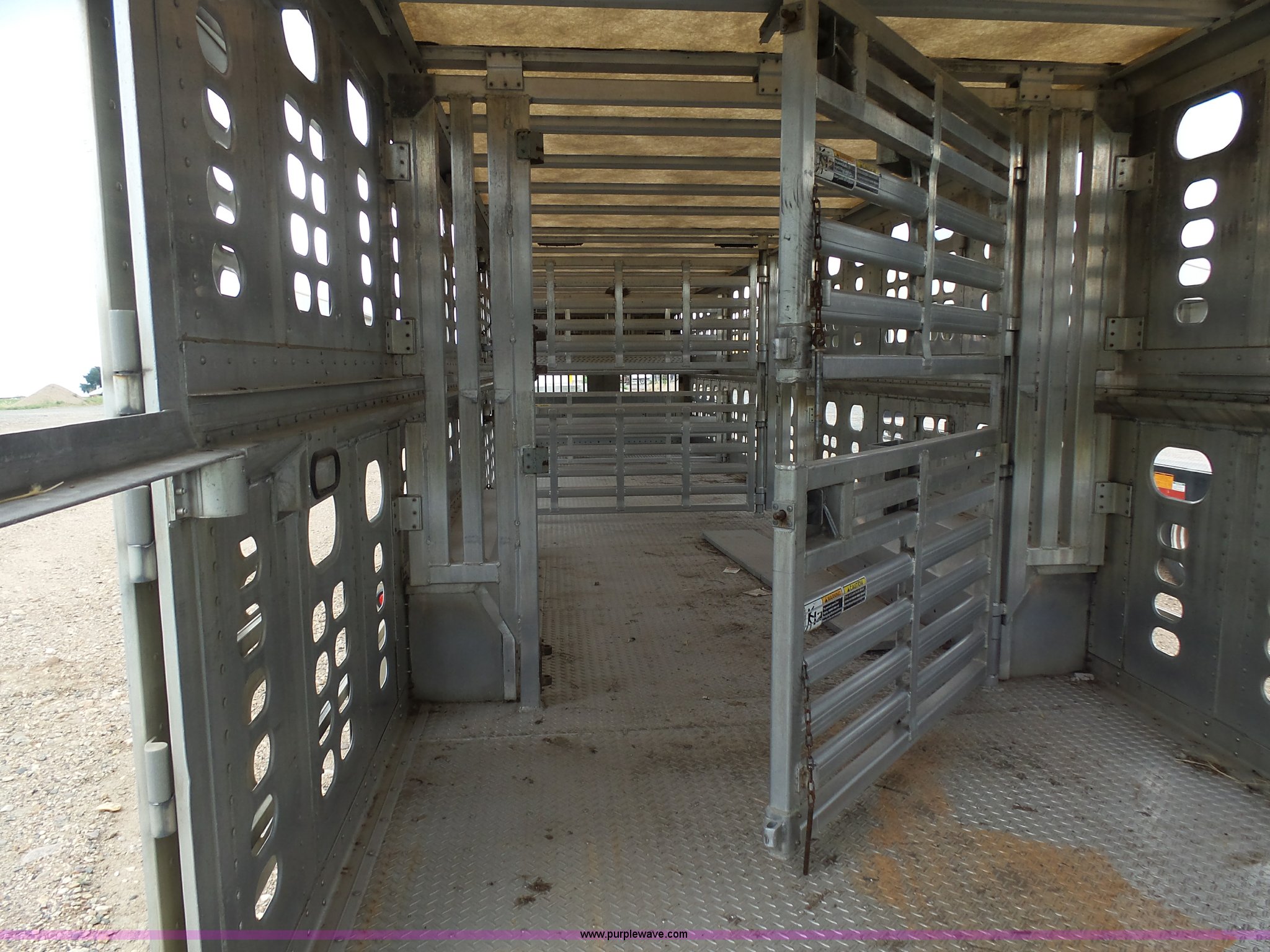Purple Wave is selling a used Livestock Equip. in Minnesota. This item is a 2004 Wilson TRL livestock trailer with the following: 42'L x 94"W, 6' side height, (2) center divider gates, Side door, Rear roll up gate, Side load gate, Ground load, Dock bumper, Aluminum construction, Fifth wheel plate, Single leg landing gear, Spring suspension, Electric brakes, Steel wheels, 10R17.5 tires, GVWR 25,000 lbs, GAWR 9,350 lbs