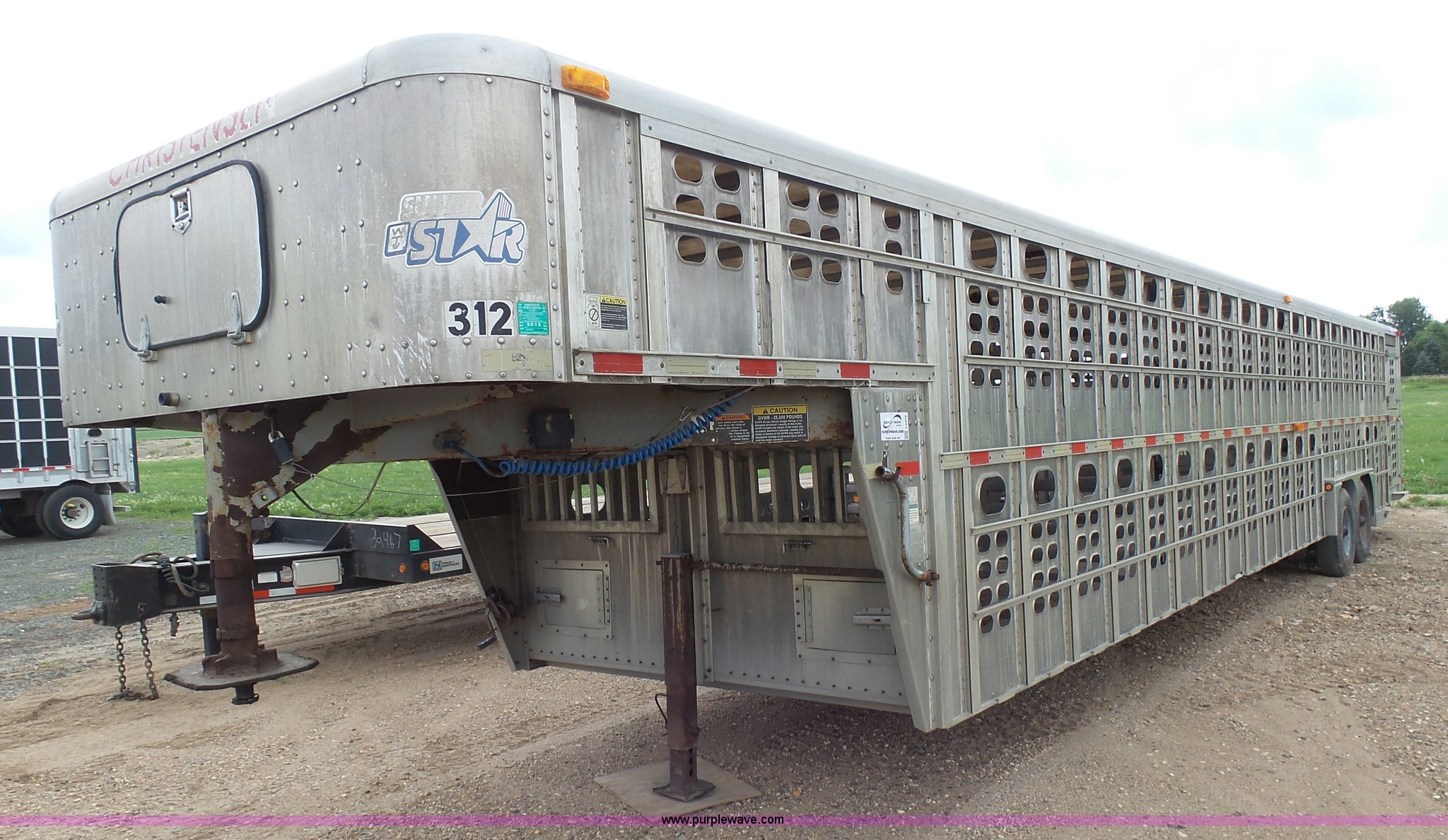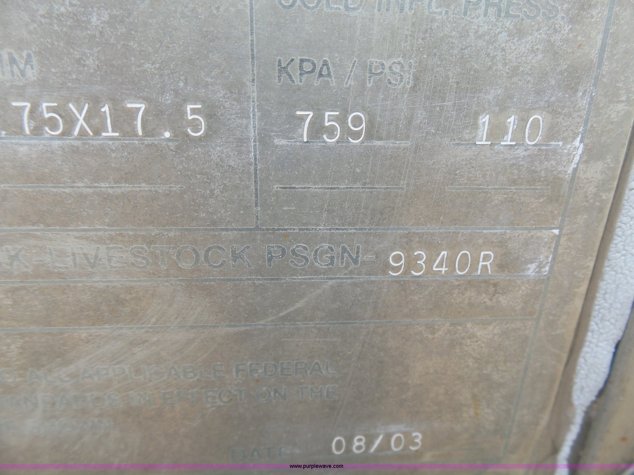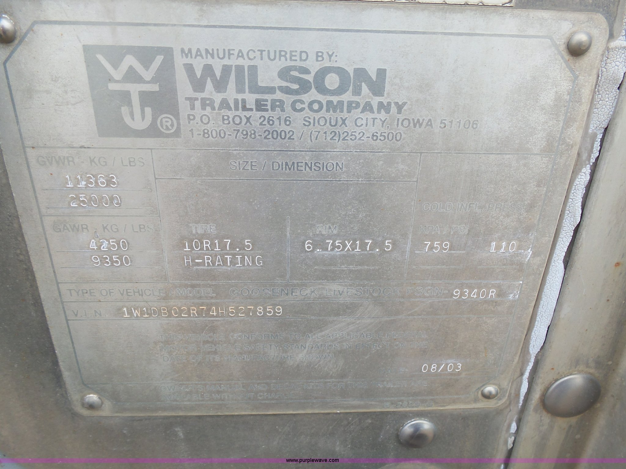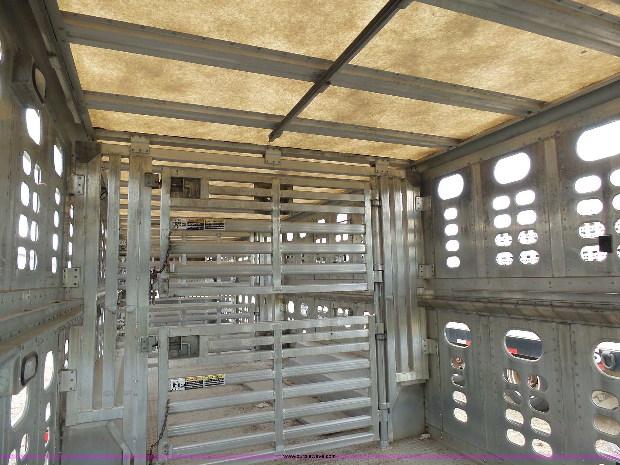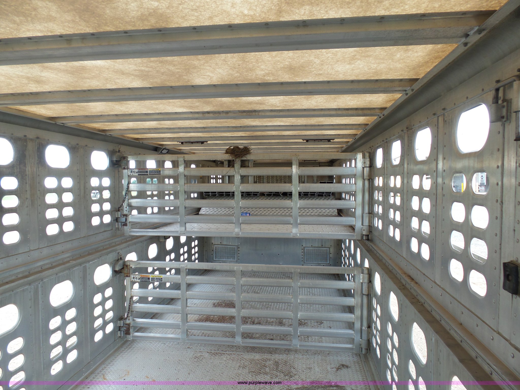 Purple Wave is selling a used Livestock Equip. in Minnesota. This item is a 2004 Wilson TRL livestock trailer with the following: 42'L x 94"W, 6' side height, (2) center divider gates, Side door, Rear roll up gate, Side load gate, Ground load, Dock bumper, Aluminum construction, Fifth wheel plate, Single leg landing gear, Spring suspension, Electric brakes, Steel wheels, 10R17.5 tires, GVWR 25,000 lbs, GAWR 9,350 lbs