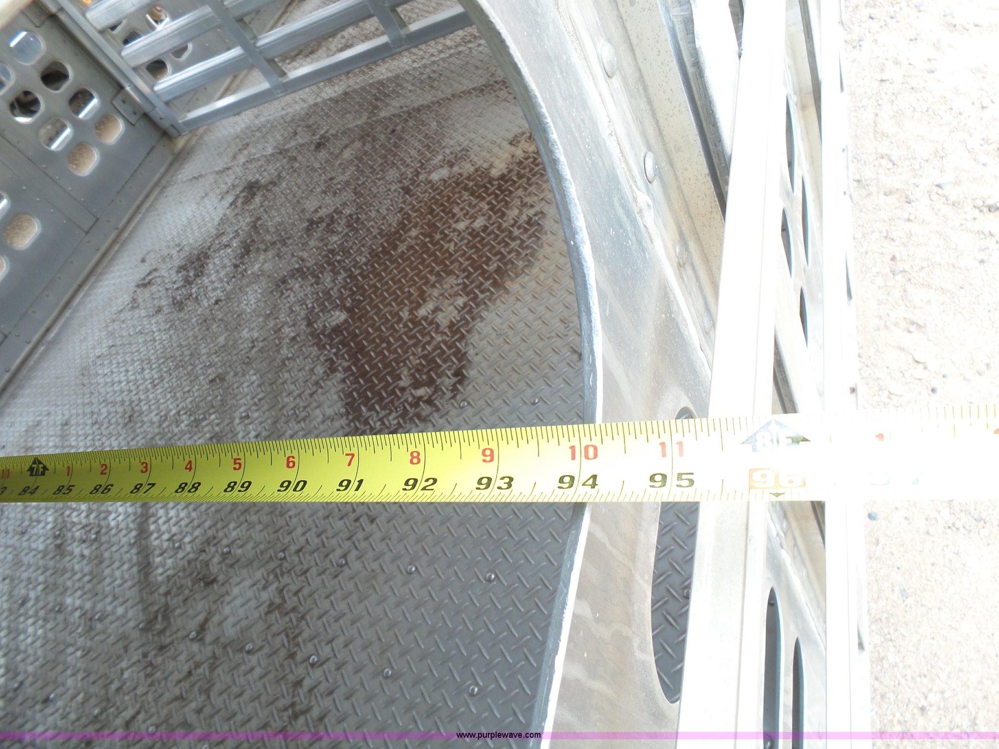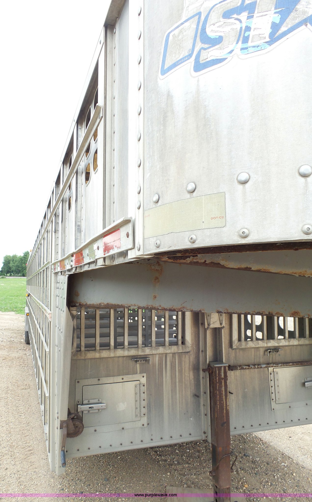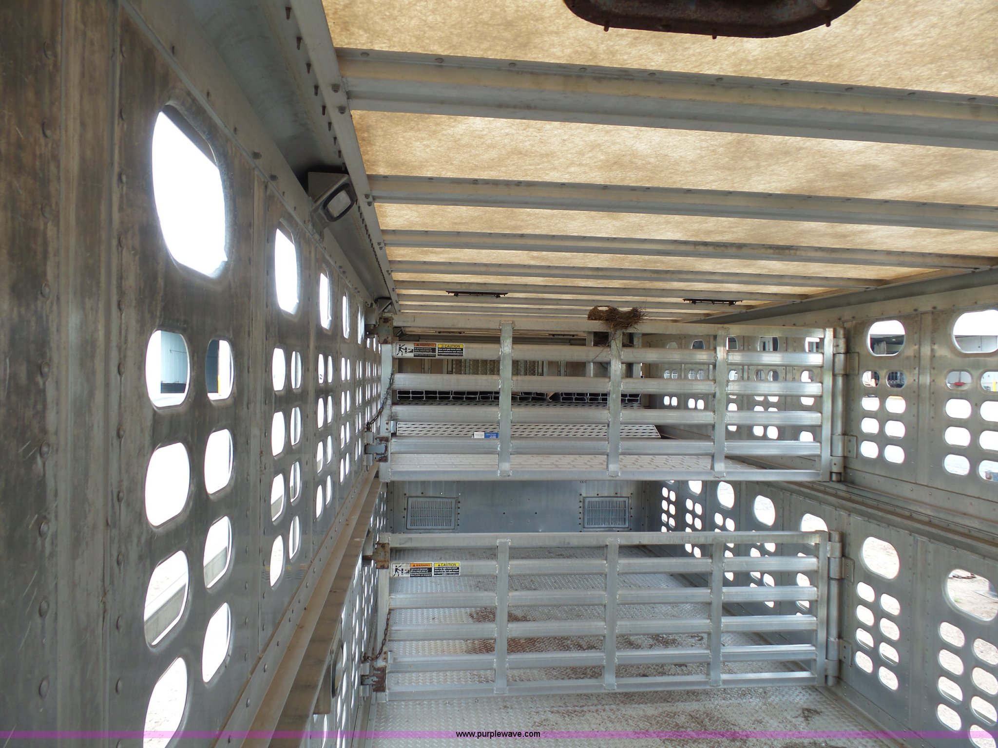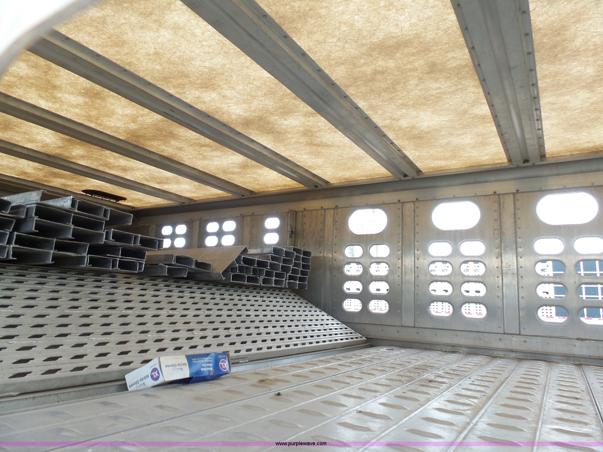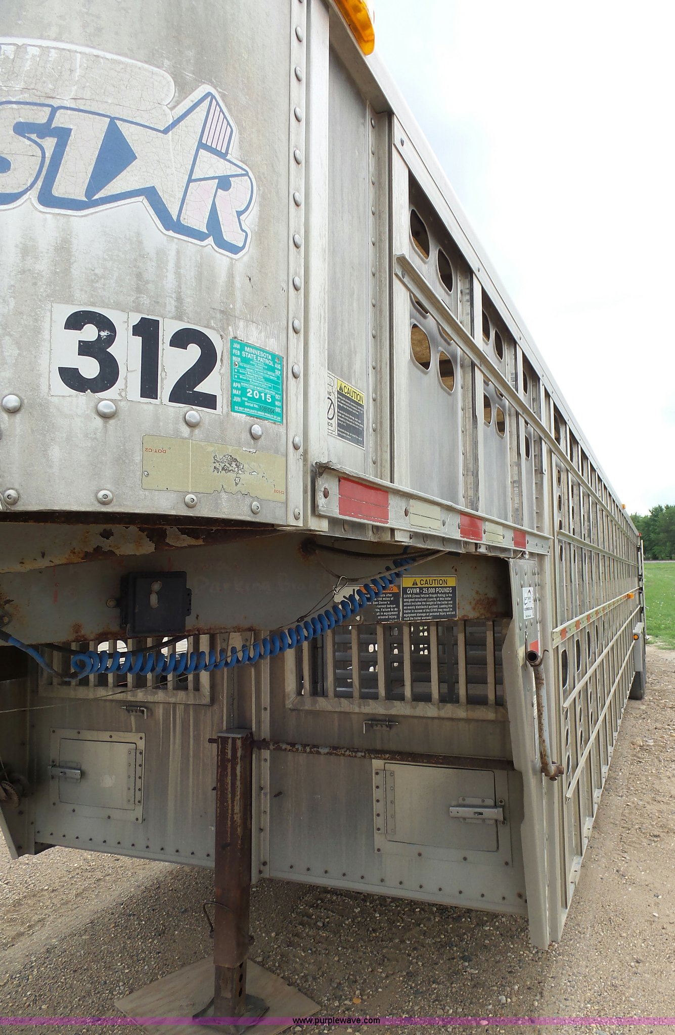 Purple Wave is selling a used Livestock Equip. in Minnesota. This item is a 2004 Wilson TRL livestock trailer with the following: 42'L x 94"W, 6' side height, (2) center divider gates, Side door, Rear roll up gate, Side load gate, Ground load, Dock bumper, Aluminum construction, Fifth wheel plate, Single leg landing gear, Spring suspension, Electric brakes, Steel wheels, 10R17.5 tires, GVWR 25,000 lbs, GAWR 9,350 lbs