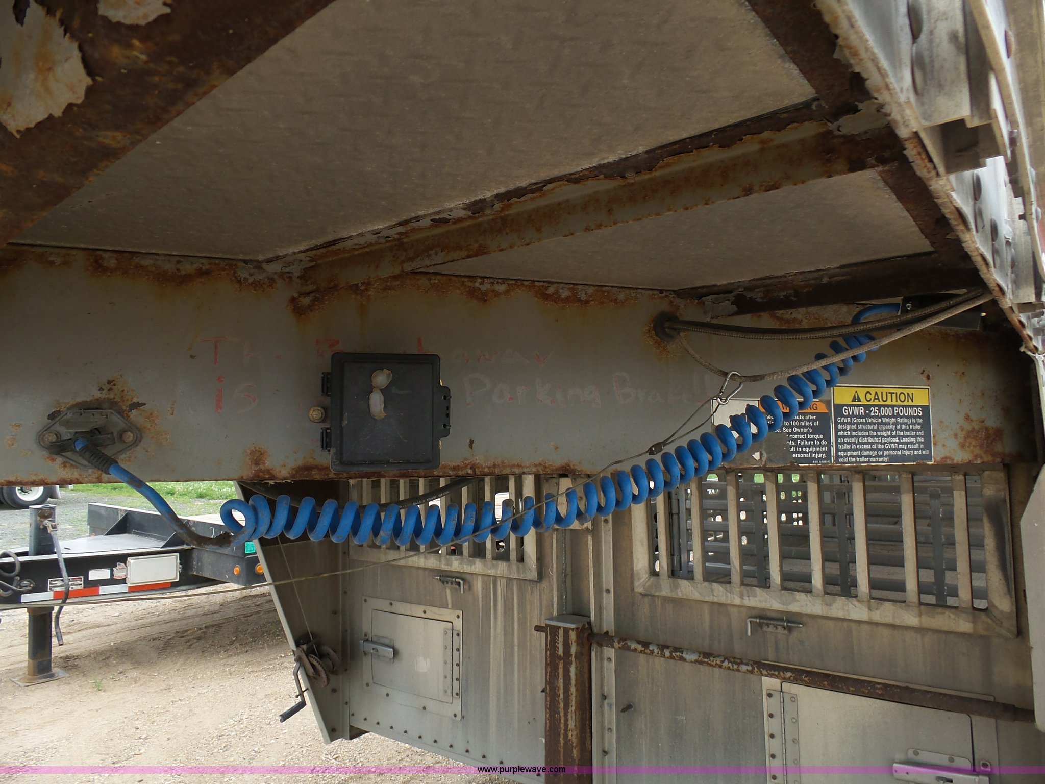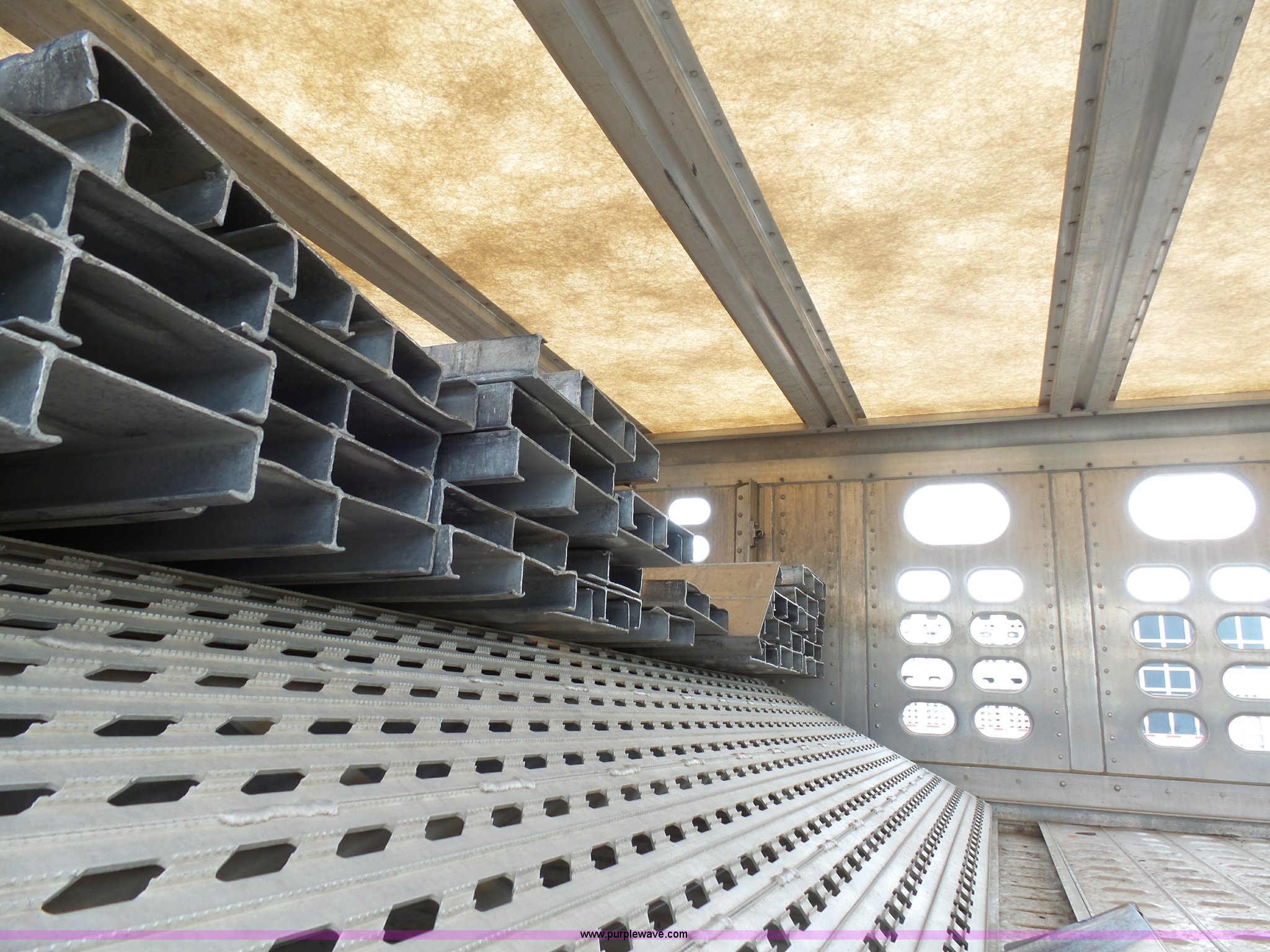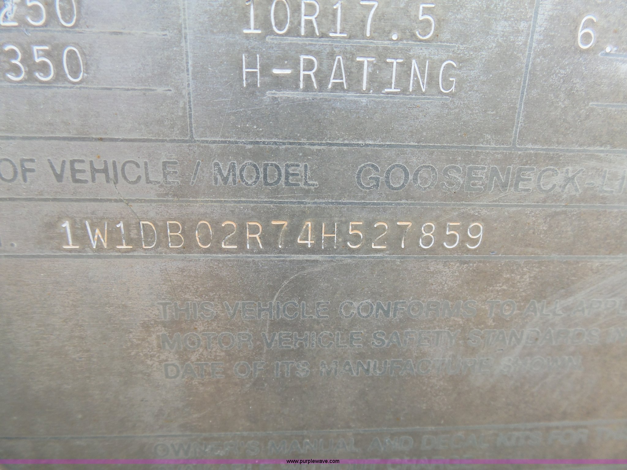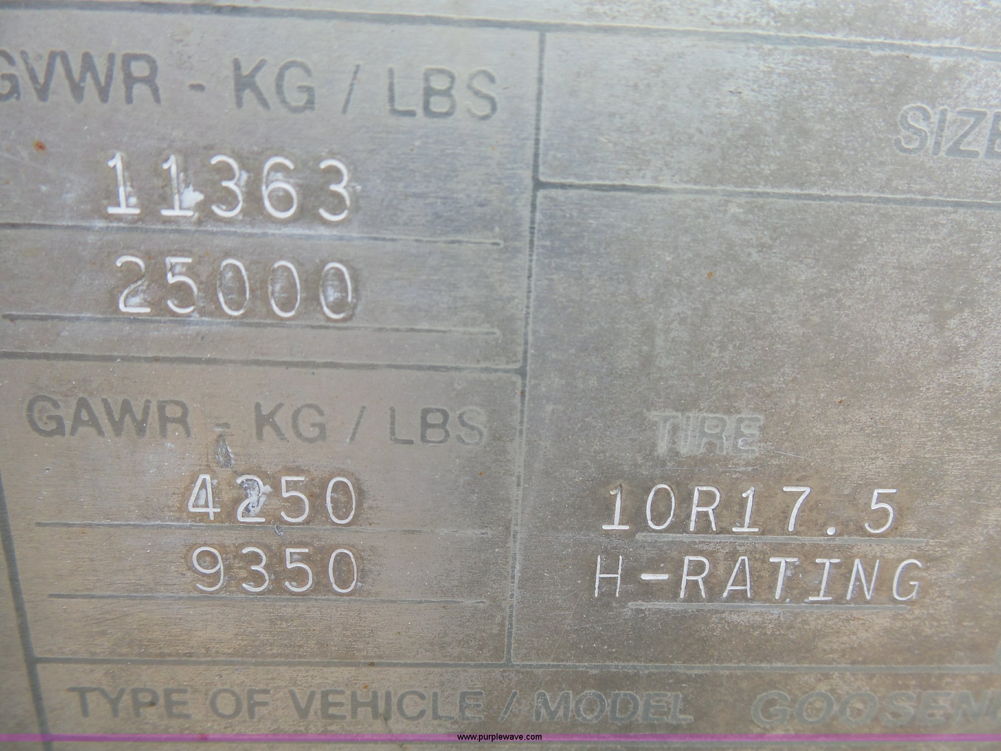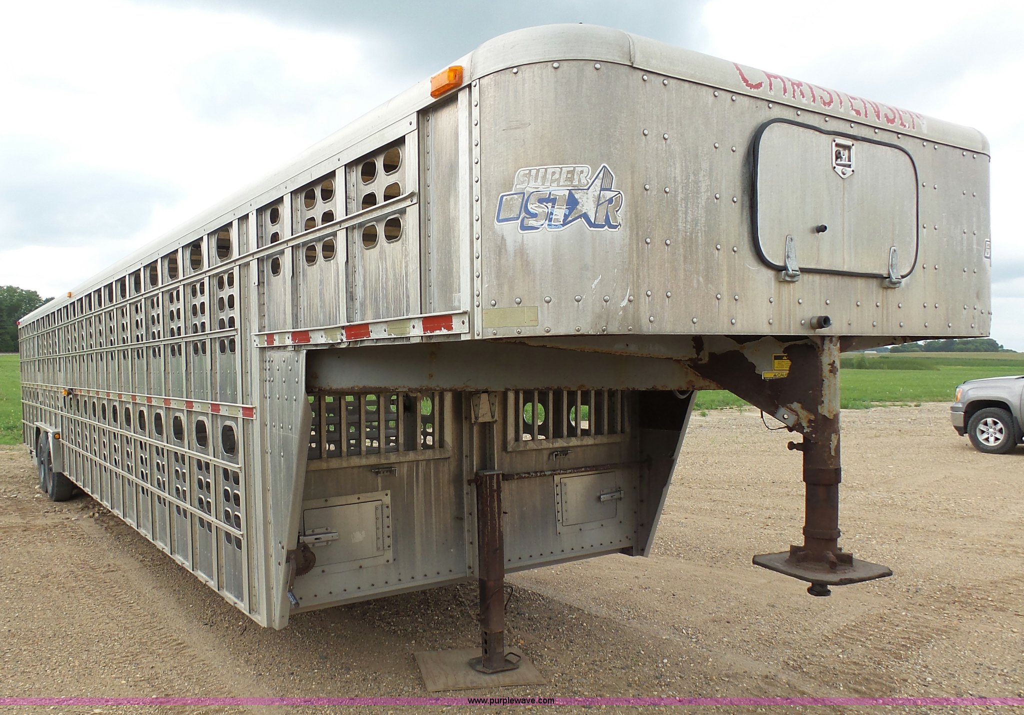 Purple Wave is selling a used Livestock Equip. in Minnesota. This item is a 2004 Wilson TRL livestock trailer with the following: 42'L x 94"W, 6' side height, (2) center divider gates, Side door, Rear roll up gate, Side load gate, Ground load, Dock bumper, Aluminum construction, Fifth wheel plate, Single leg landing gear, Spring suspension, Electric brakes, Steel wheels, 10R17.5 tires, GVWR 25,000 lbs, GAWR 9,350 lbs