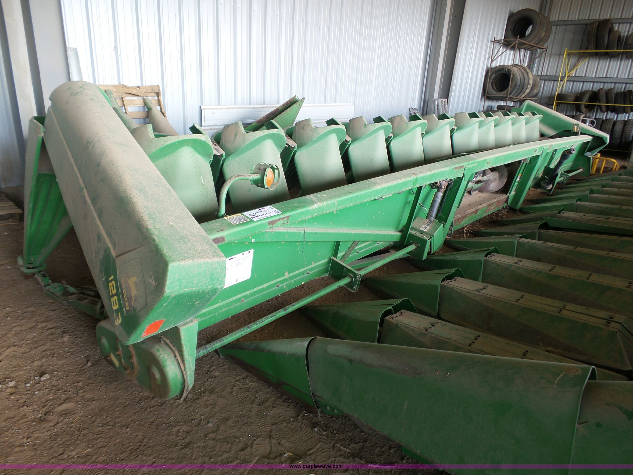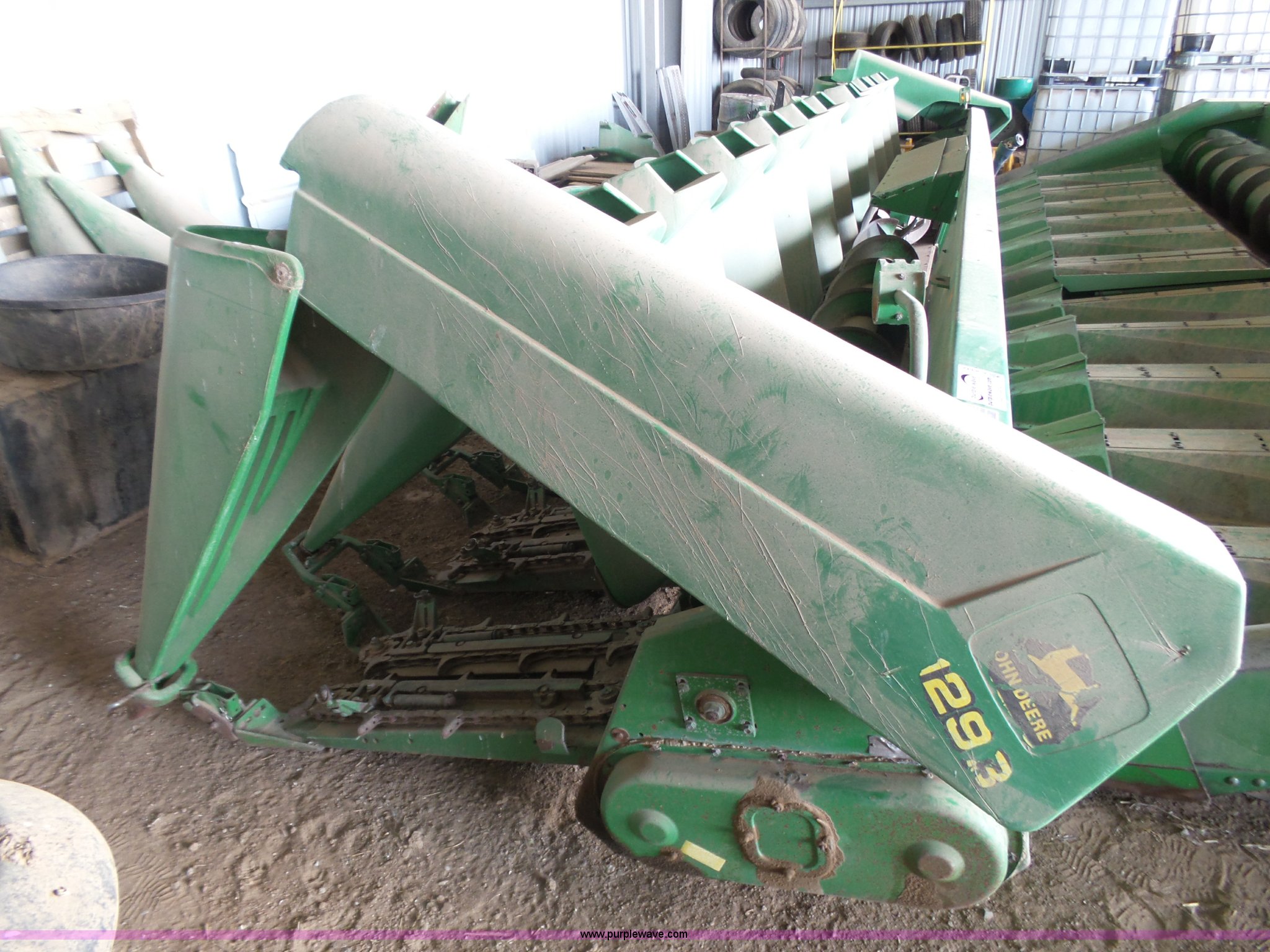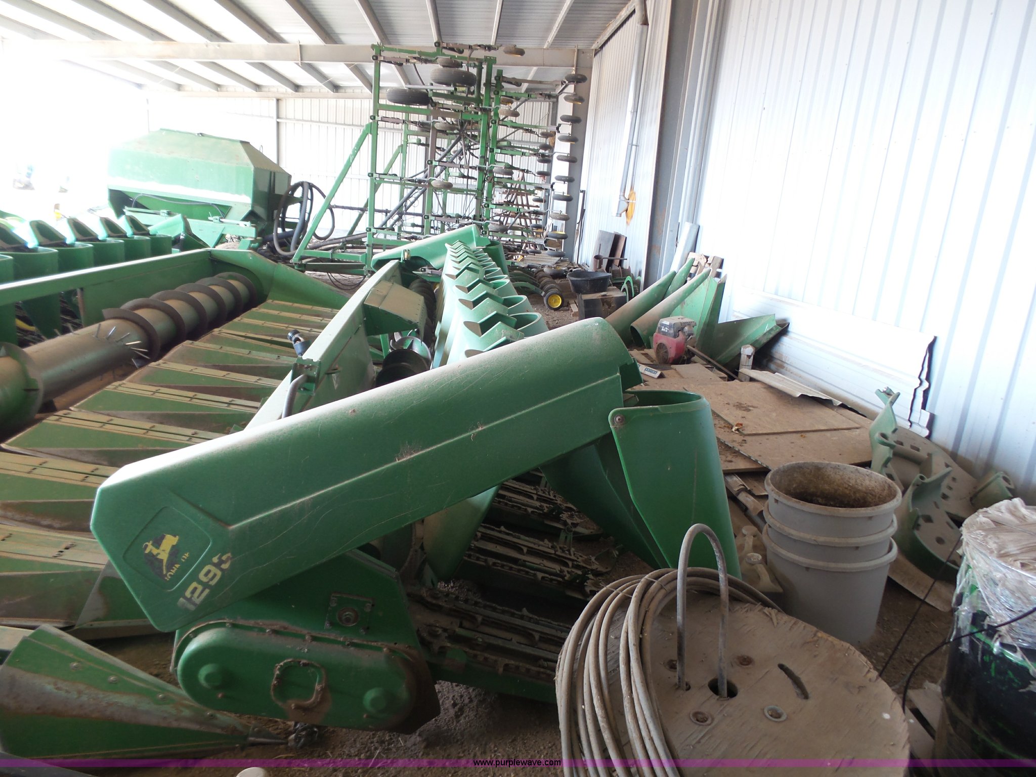 Purple Wave is selling a used Corn or Row Head in Kansas. This item is a John Deere 1293 corn head with the following: 12 rows, 30" row spacing, Dual drive lines, Serial H01293670820
