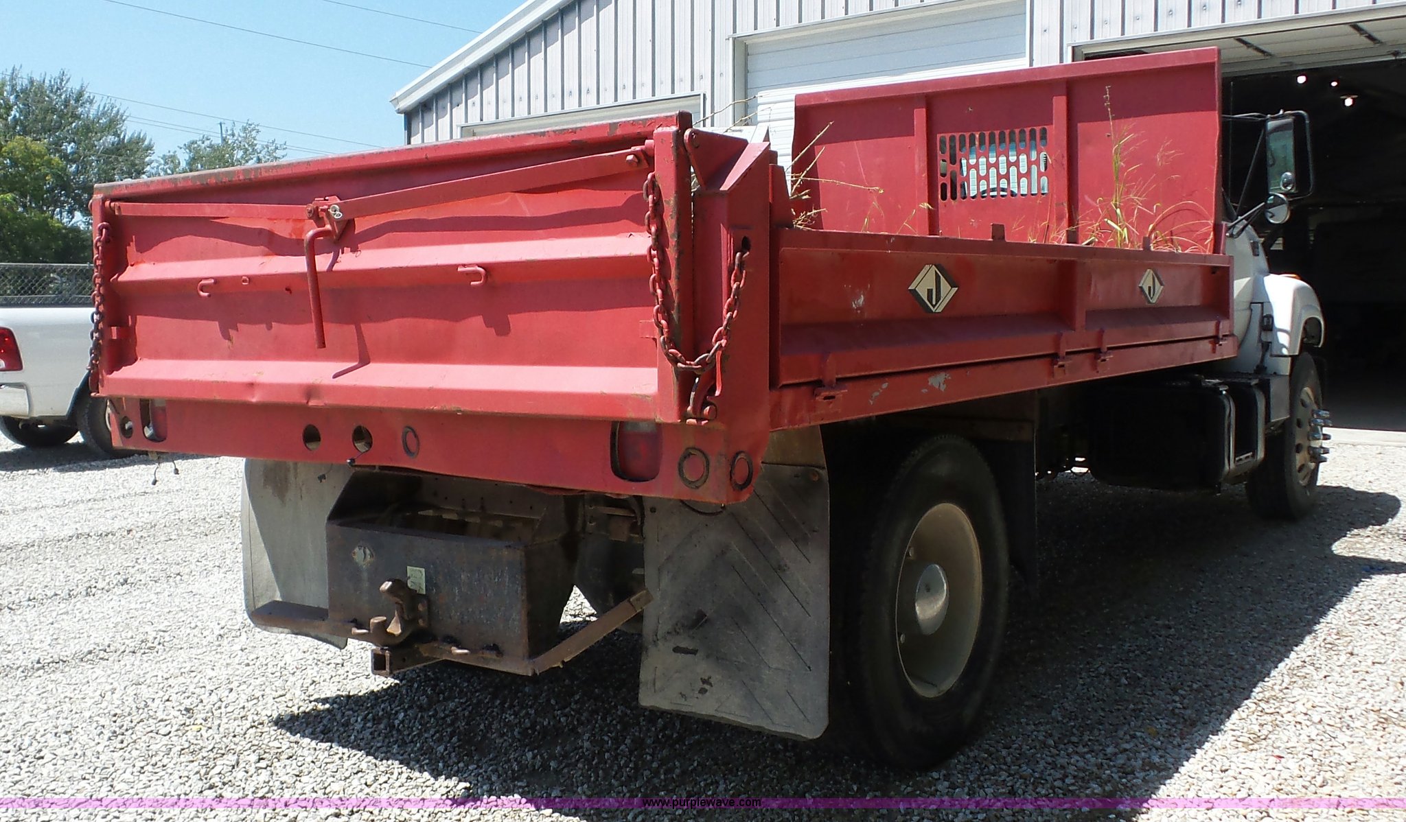 1999 Chevrolet C7500 dump truck. 112,085 miles on odometer, Caterpillar C7 7.2L L6 turbo diesel engine, Five speed manual transmission, Two sped rear end, Single axle, AC and heat, AM/FM, Spring suspension seat, Block heater, PTO, J Craft 455-55R22.5 steel dump bed 14'L x 100"W, 15" side height, Single ram hoist, Manual operated two-way end gate, Dual fuel tanks, Pintle hitch, Receiver hitch, Trailer wiring, Spring suspension, Hydraulic brakes, 11R22.5 tires, GVWR 30,000 lbs, FAWR 11,000 lbs, RAWR 19,000 lbs. Kansas title. 1GBL7H1C4XJ106685. Buman Plumbing. 914 N. Washington. Chanute, KS 66720