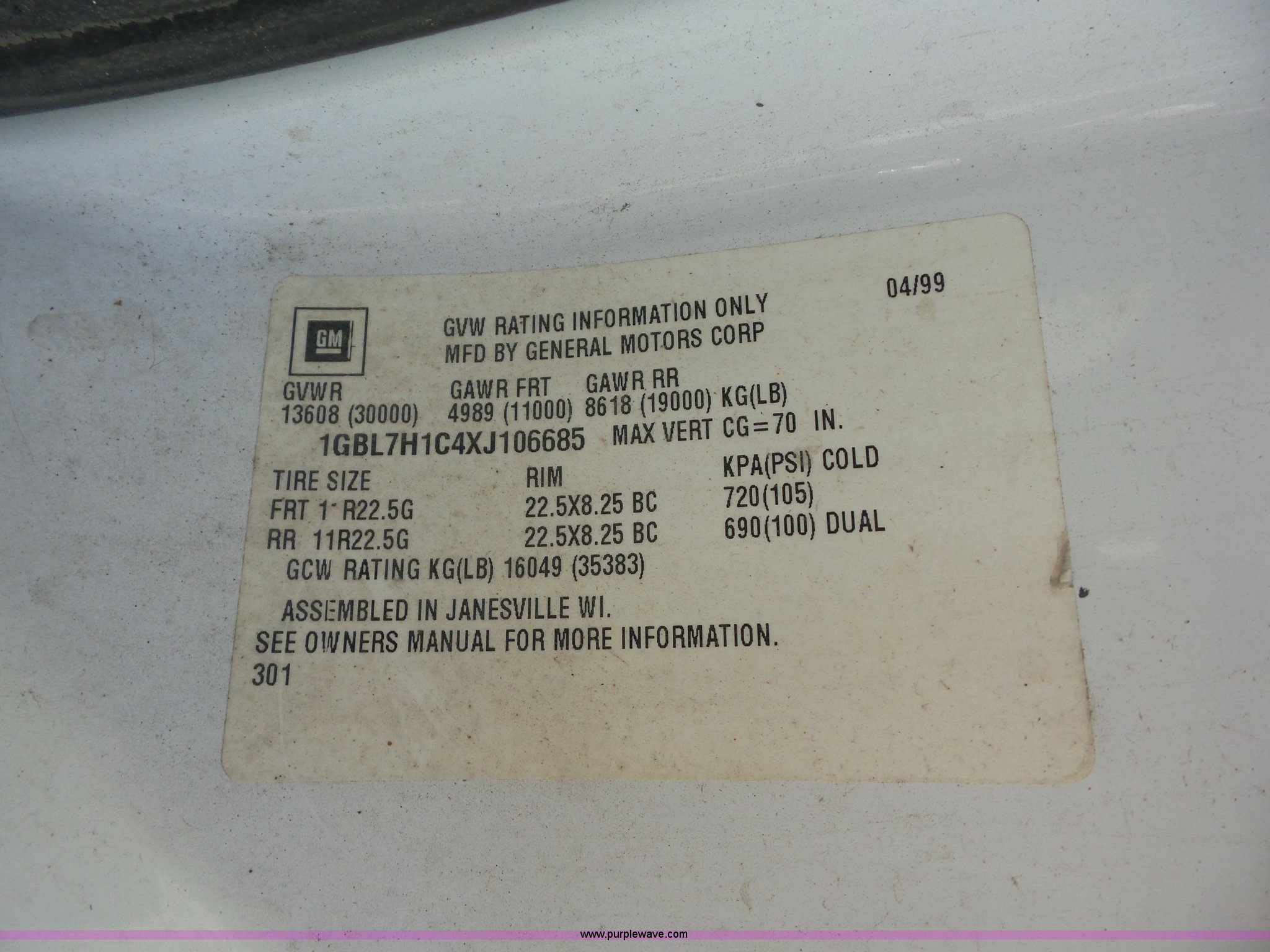 Purple Wave is selling a used Construction Dump Truck in Kansas. This item is a 1999 Chevrolet C7500 dump truck with the following: 112,085 miles on odometer, Caterpillar C7 7.2L L6 turbo diesel engine, Five speed manual transmission, Two sped rear end, Single axle, AC and heat, AM/FM, Spring suspension seat, Block heater, PTO, J Craft 455-55R22.5 steel dump bed, 14'L x 100"W, 15" side height, Single ram hoist, Manual operated two-way end gate, Dual fuel tanks, Pintle hitch, Receiver hitch, Trailer wiring, Spring suspension, Hydraulic brakes, 11R22.5 tires, GVWR 30,000 lbs, FAWR 11,000 lbs, RAWR 19,000 lbs