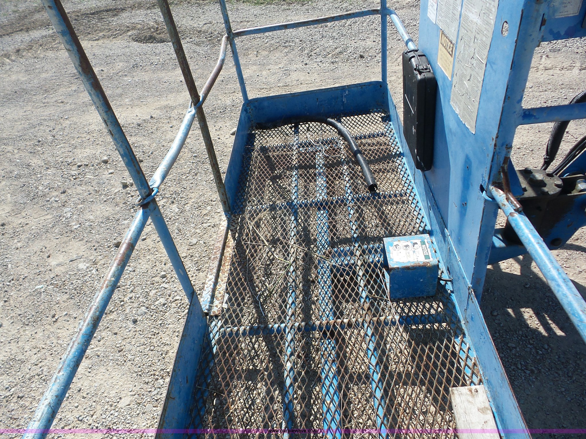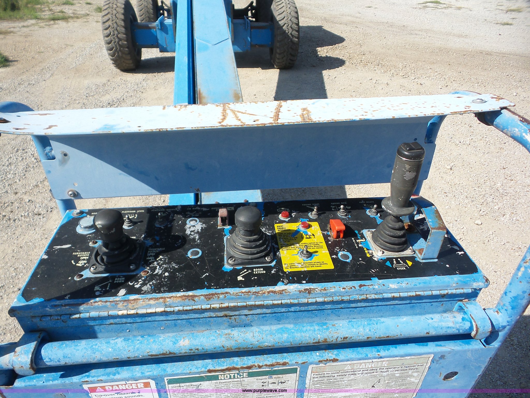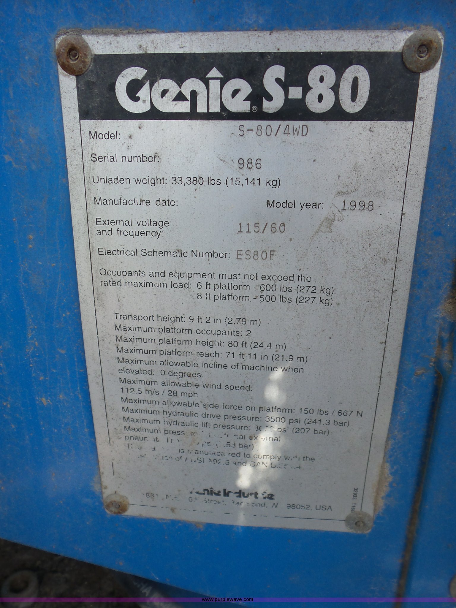 Purple Wave is selling a used Boom Lift in Kansas. This item is a 1998 Genie S80 boom lift with the following: 4,957 hours on meter, Ford four cylinder dual fuel engine, Gas and propane, Four wheel drive, 500 lbs maximum lift capacity, 80' maximum lift height, 93"L x 33"W platform, AC power outlet, Platform and ground controls, Hydraulic platform rotation, 150 lbs side force, Hydrauic extendable axles, 15-22.5 tires, Serial 986