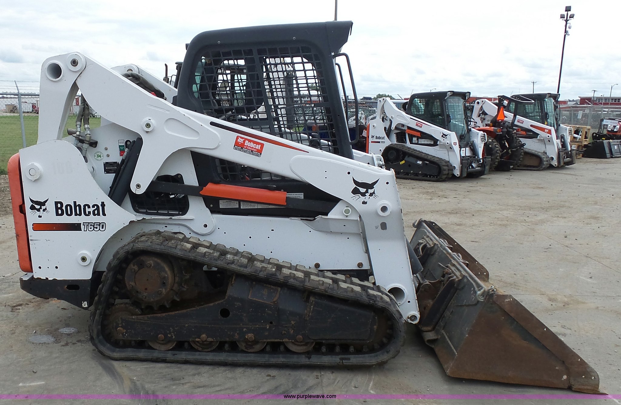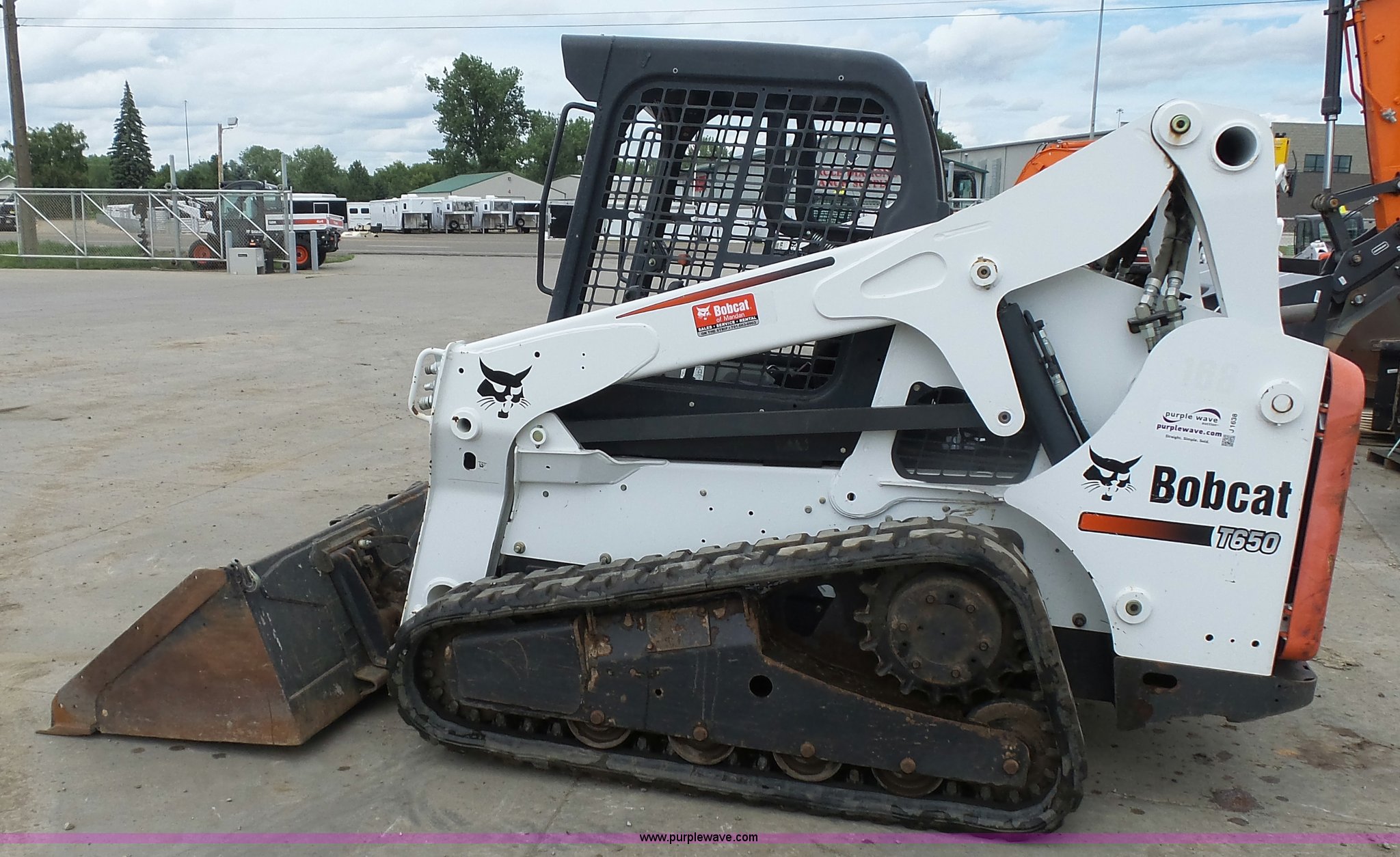 Purple Wave is selling a used Tracked Skid Steer Loader in North Dakota. This item is a 2011 Bobcat T650 skid steer with the following: 785 hours on meter, Kubota V3307-D1-T-EV3 four cylinder turbo diesel engine, Family 8KBXL03.3CAD, Hydrostatic transmission, OROPS, Hand and foot controls, EMS panel, Suspension seat, Keyless ignition, Front work lights, Auxiliary hydraulics, Auxiliary electrical outlet, Manual quick coupler, 80"W low profile bucket, Bolt-on cutting edge, Tracks, 9,440 lbs. base operating weight, Serial A3P012983