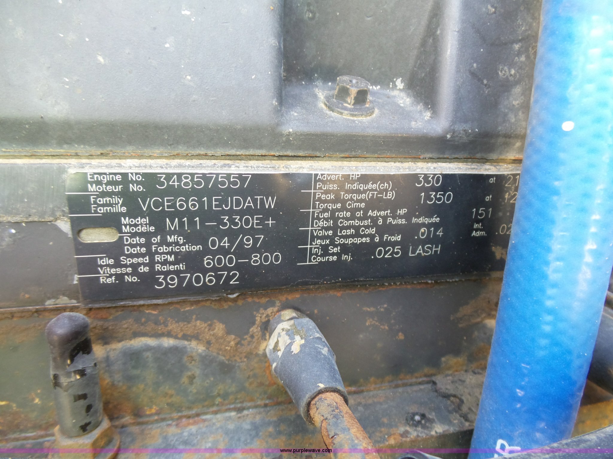Purple Wave is selling a used Construction Dump Truck in North Dakota. This item is a 1997 Volvo WG dump truck with the following: 407,531 miles on odometer, 8,812 hours on meter, Cummins M11 10.8L L6 turbo diesel engine, Automatic transmission, Tandem axle, AC and heat, Cruise, AM/FM/CD, Air suspension seat, Exterior visor, Crysteel steel dump bed, Air operated end gate, Single fuel tank, Trailer wirning, Pintle hitch, Spring over walking beam suspension, Air brakes, Engine brake, 215" wheelbase, 425/65R22.5 front tires, 11R22.5 rear tires, FAWR 18,000 lbs