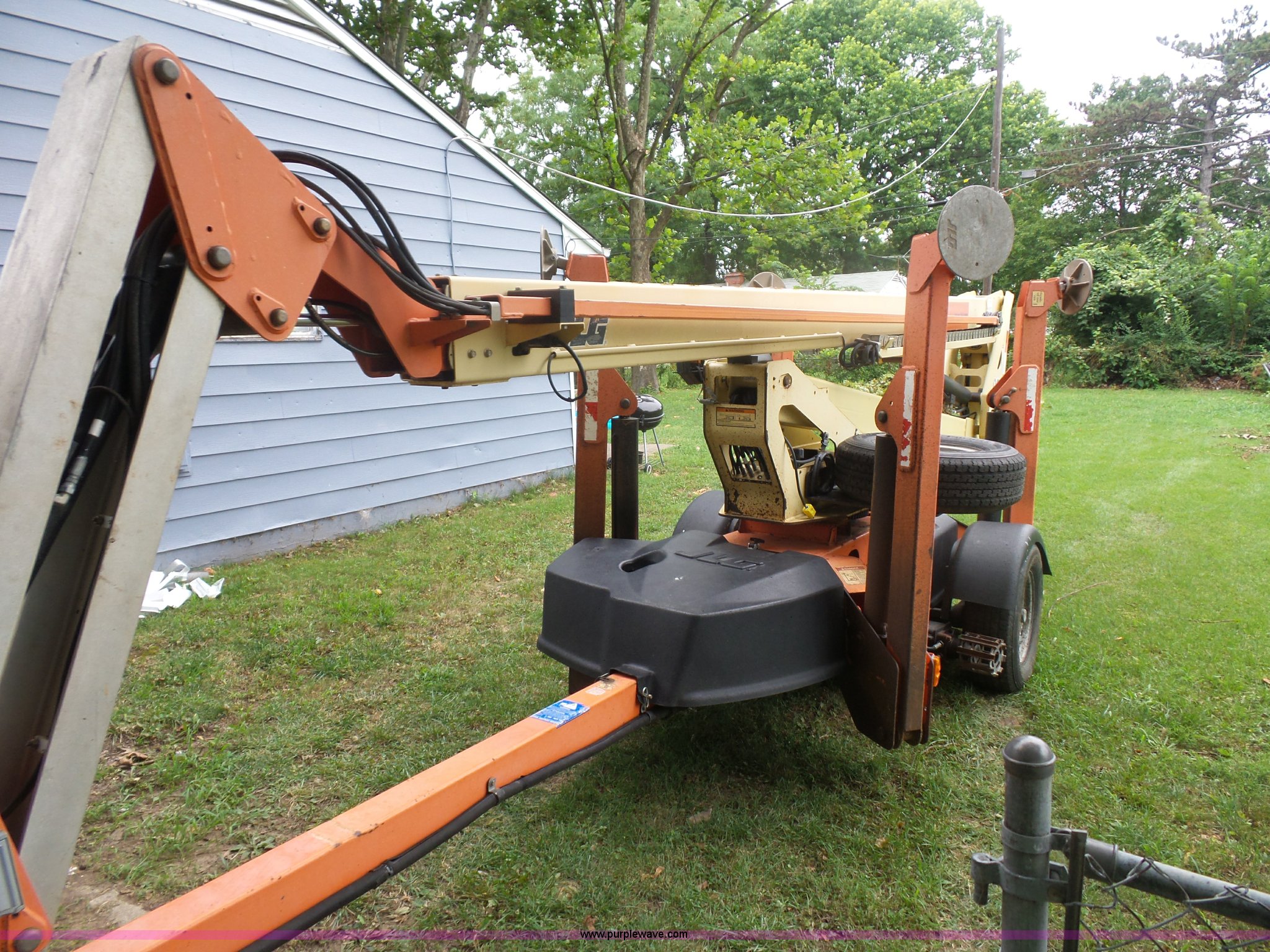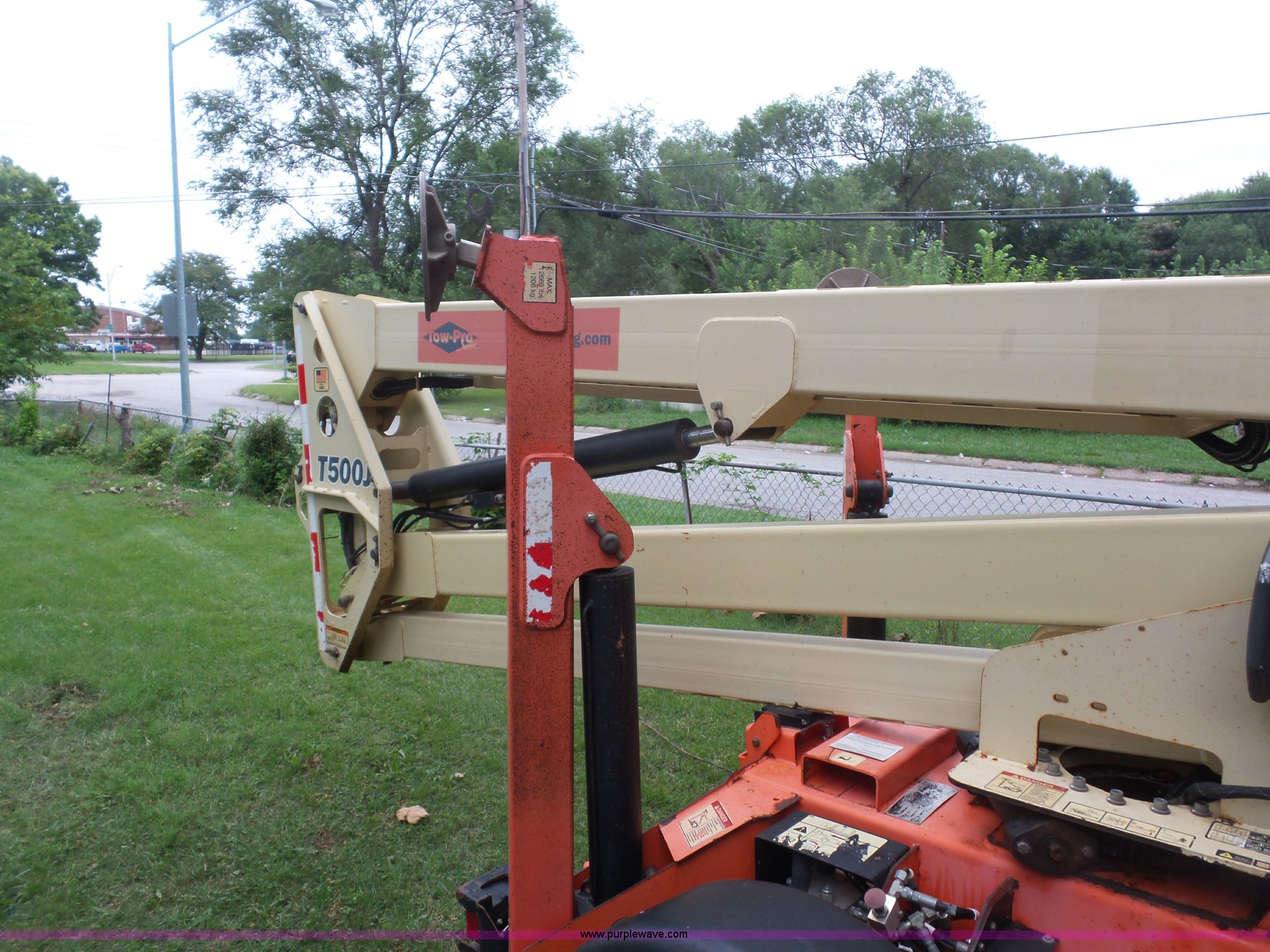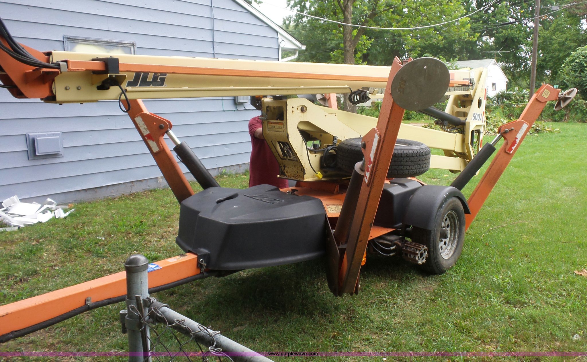 Purple Wave is selling a used Boom Lift in Missouri. This item is a 2007 JLG T500J twoable boom lift with the following: 1,345 hours on meter, Honda gas engine, 500 lbs maximum lift capacity, 47" x 28" basket, Hydraulic outriggers, Manual jack, 2" ball hitch, 225/75R15 tires, Serial 003002495