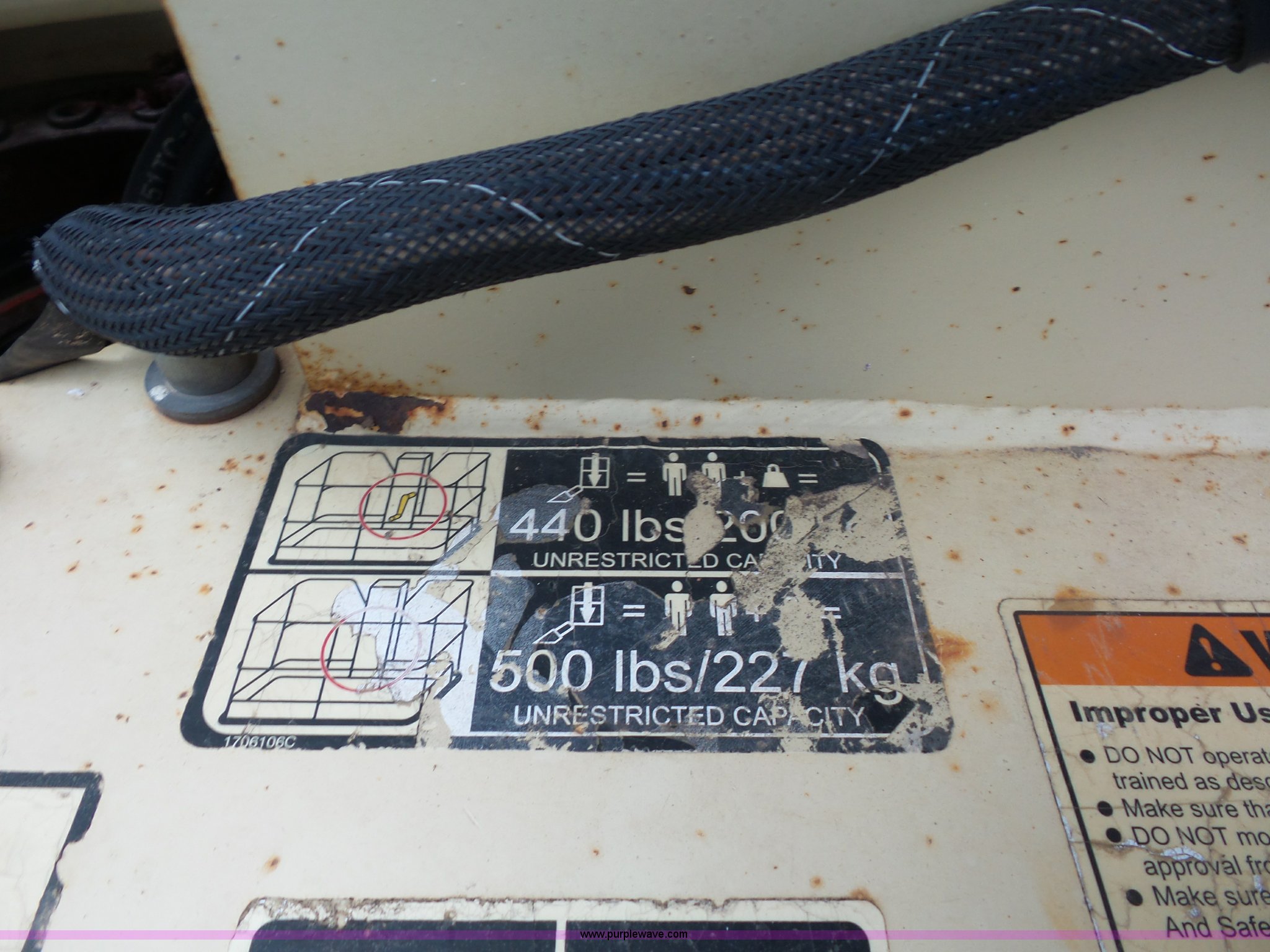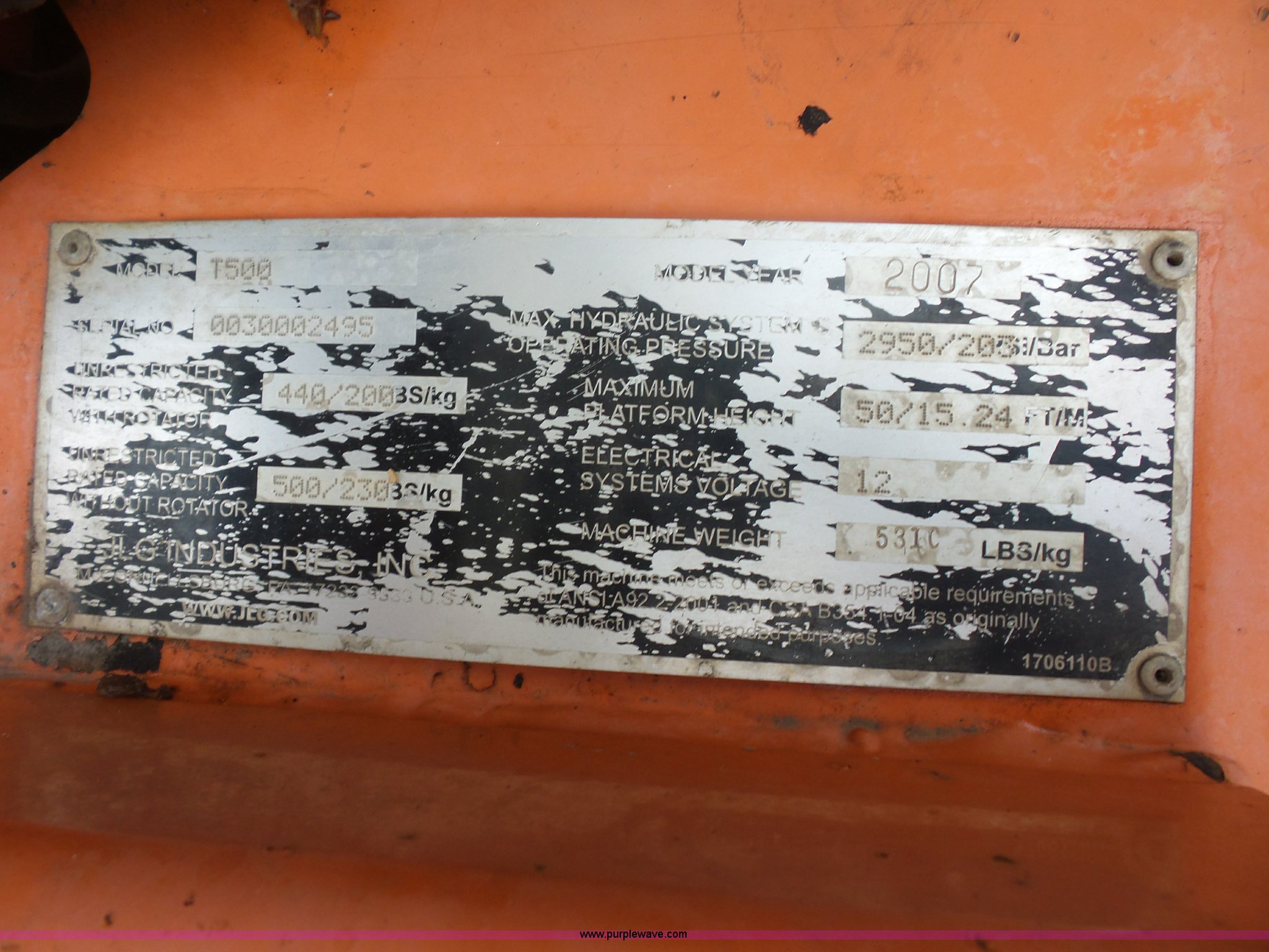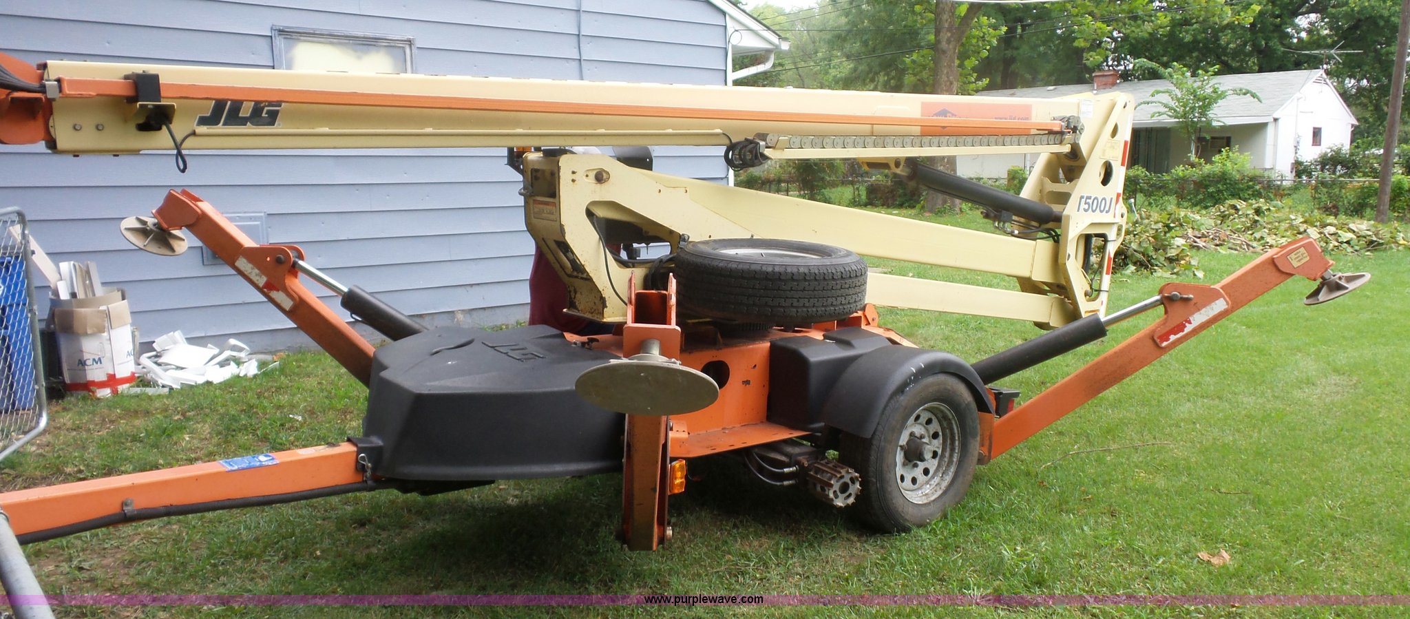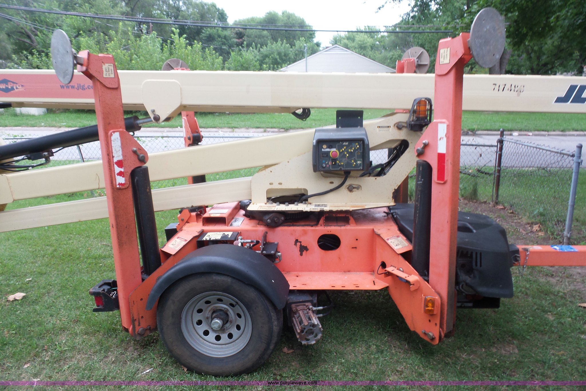 Purple Wave is selling a used Boom Lift in Missouri. This item is a 2007 JLG T500J twoable boom lift with the following: 1,345 hours on meter, Honda gas engine, 500 lbs maximum lift capacity, 47" x 28" basket, Hydraulic outriggers, Manual jack, 2" ball hitch, 225/75R15 tires, Serial 003002495