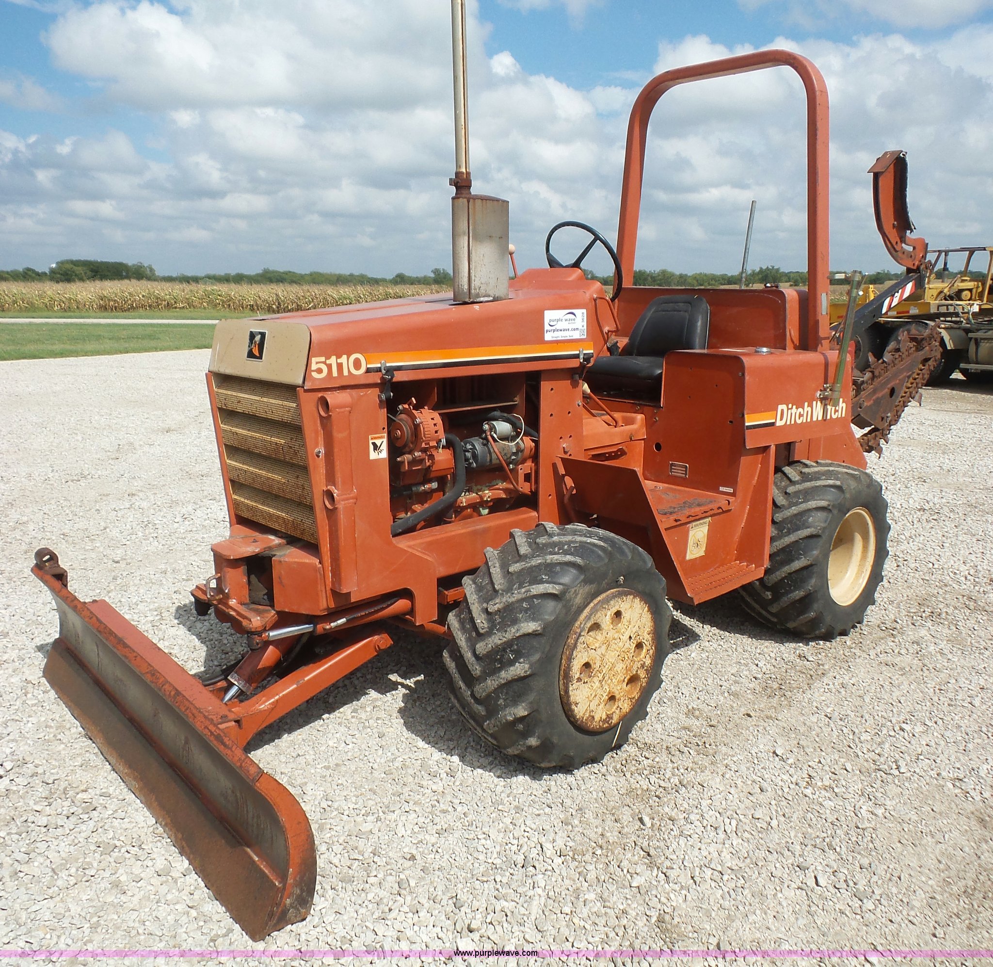 1992 Ditch Witch 5110 trencher. 2,102 hours on meter, Deutz F3L912 three cylinder diesel engine, 4F gears, Four wheel drive, OROPS, 72"W six way back fill blade, A411 trencher Serial 2J0571, 6' digging depth, 8" cutting width, Crumber shoe, 31 x 15.50-15 tires, Serial 5J0178. Carbondale, KS 66414